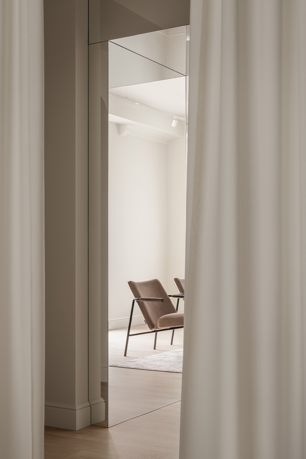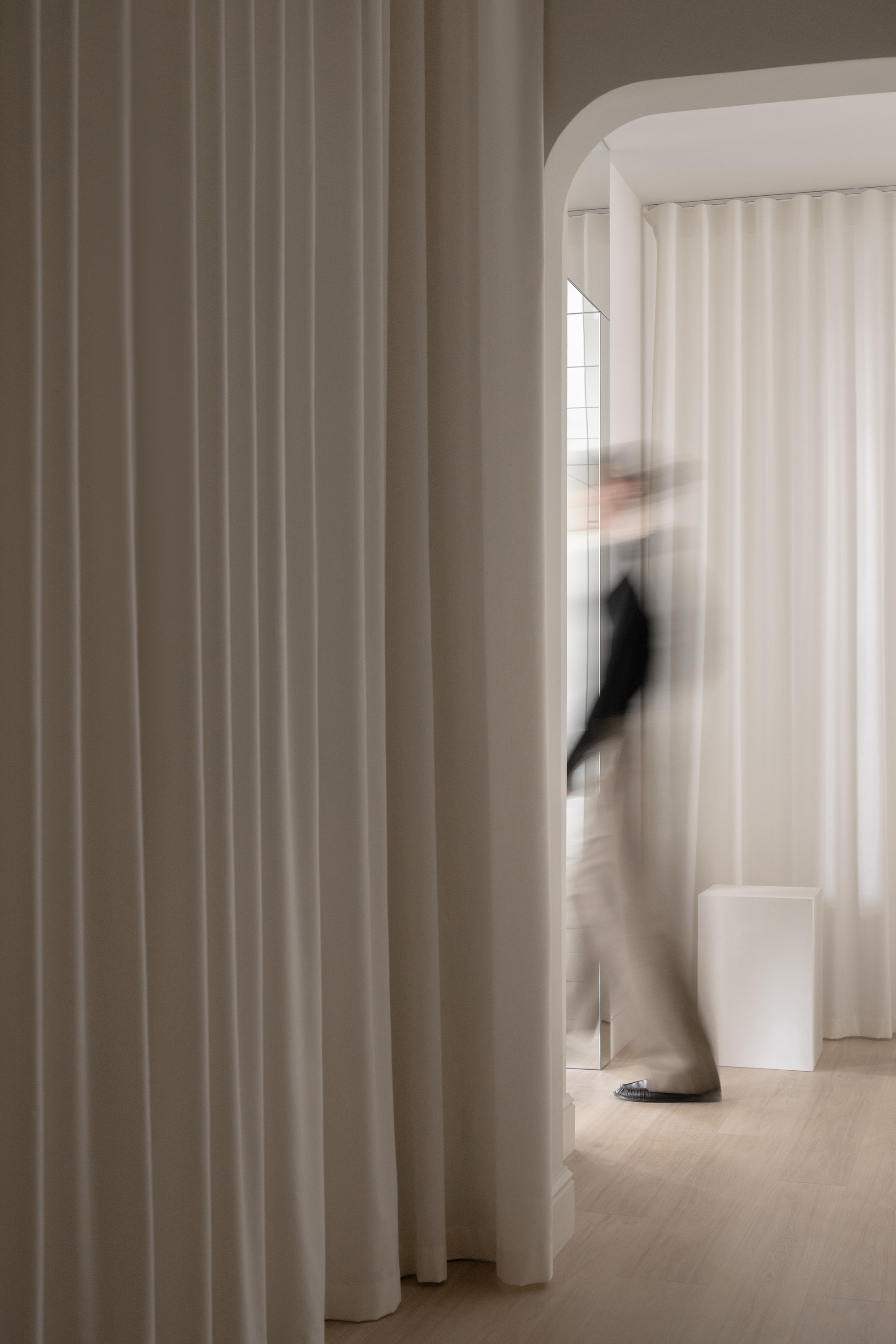 The original layout — a long corridor of offices and storage leading to the main hall — became an asset rather than a limitation. Conceived as a journey, this transitional zone was reimagined with theatrical light filtering through layers of curtains, transforming technical areas into a sequence of sensory encounters. A transparent office space that can be opened entirely underlines the brand’s openness, while the path culminates in a mirrored portal that expands the space and symbolically immerses the visitor in the main hall.