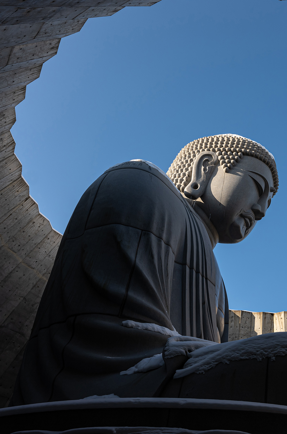The Head Great Buddha (Daibutsu) is located within Makomanai Takino Cemetery in Sapporo. It is a 13.5-meter tall, 1,500-ton stone statue. The Buddha hall was designed by the famous architect Tadao Ando. Its unique feature is that only the Buddha's head is exposed above ground, while the body is surrounded by a circular hill covered in lavender. Ando intended for the Buddha to harmoniously integrate with nature, expressing the idea of "the Buddha coexisting with nature." Visitors enter the main space housing the Buddha through a long tunnel, as if undergoing a spiritual cleansing.