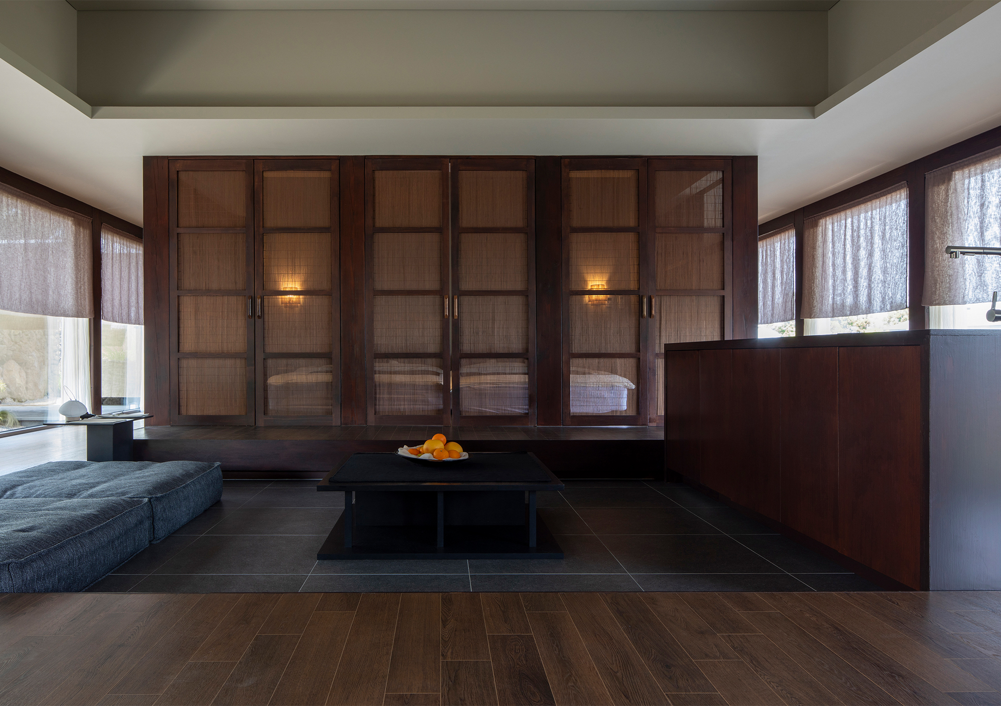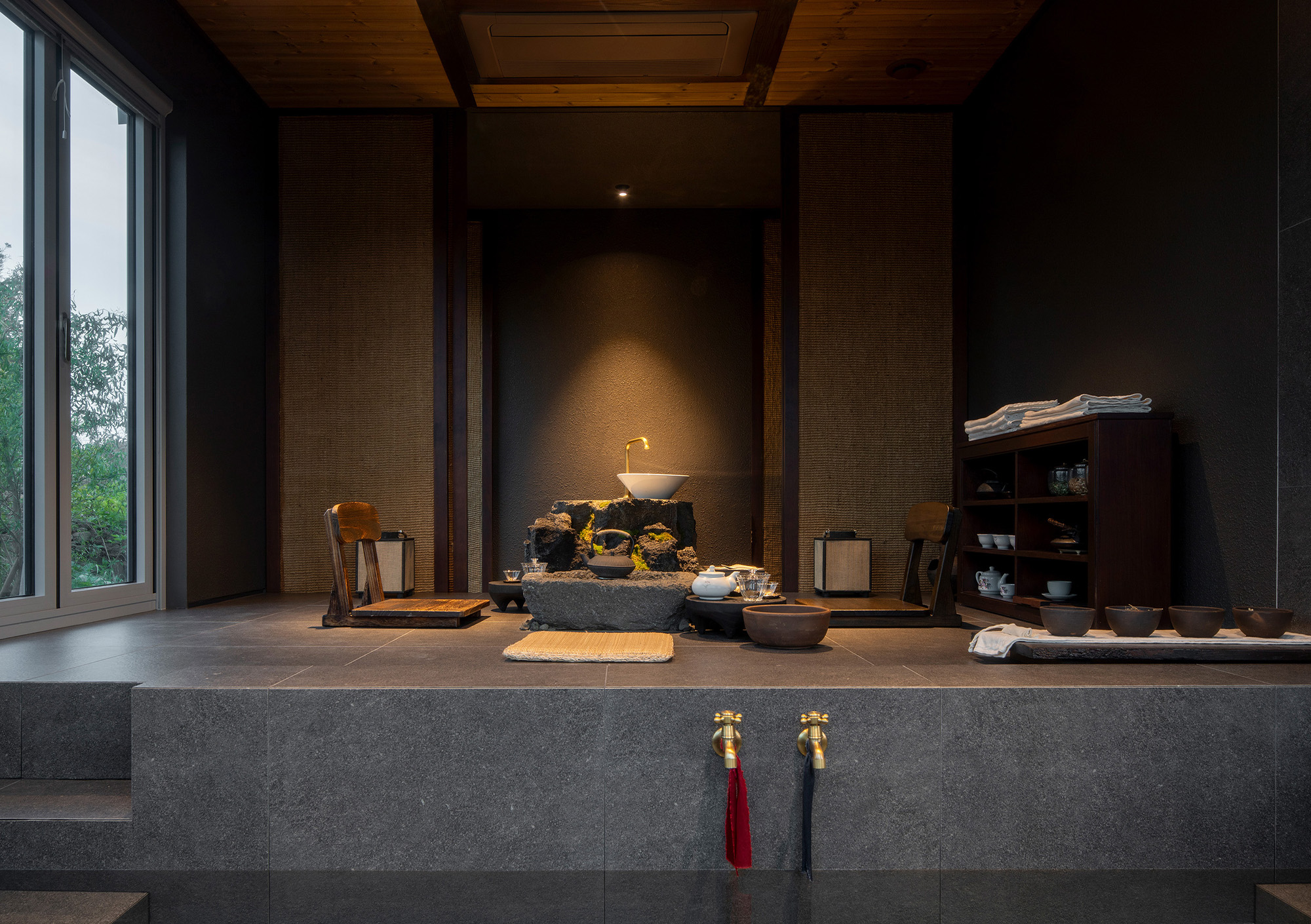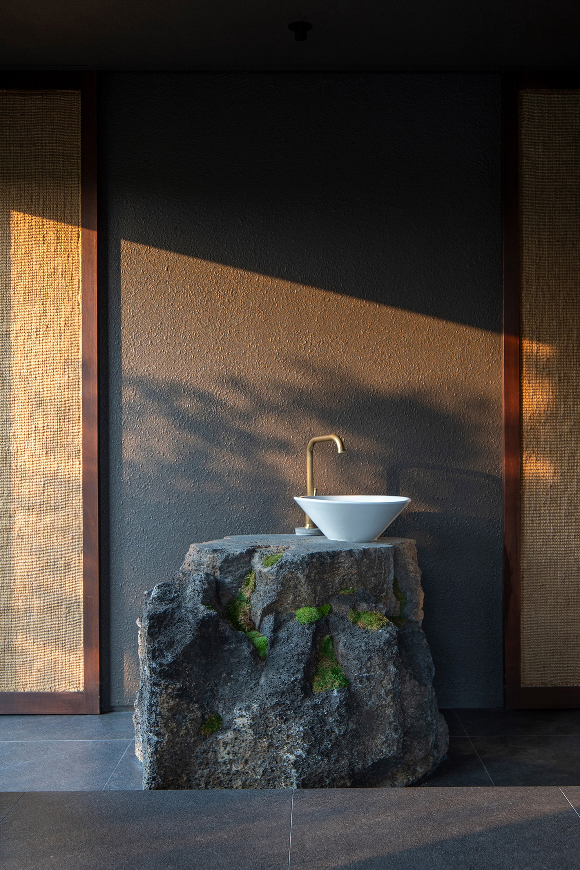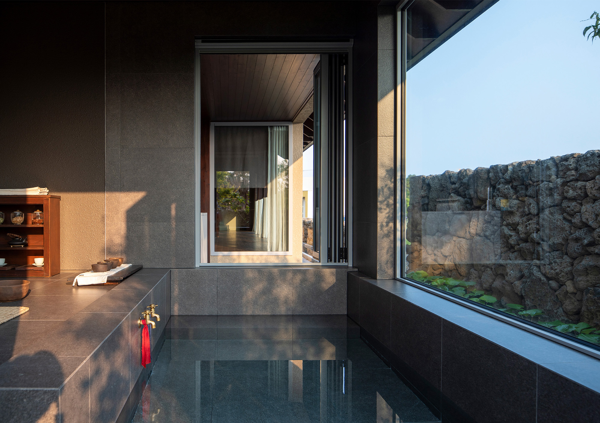 At the far end of the space lies a bathing room, conceived in the spirit of Mok-yok Jae-gye* (沐浴齋戒)—a ritual of purifying both body and mind—becoming a place for Seong-ui Jeong-sim* (誠意正心), where one refines the heart with sincerity and integrity. This was born from the owner’s approach to the space: a cultivated mindset of sincerity and moral clarity formed the foundation of the architecture, later extending into the way guests are welcomed and materializing in the spatial form of ritual cleansing. This bath, therefore, is not merely a space for hygiene but a place where the owner’s ethos is translated into physical form—a space of courtesy where guests may restore themselves to a state of clarity and tranquility.