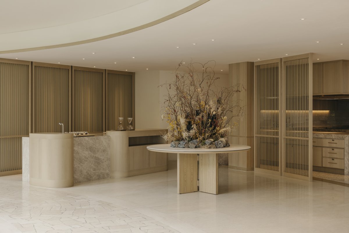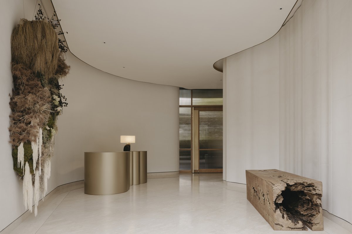 The lush green cover melts away as guests arrives at the porte cochere to be welcomed with a composed maître d lobby that frames the inner court, whilst an elegant dried installation punctuates the arrival to compliment the iconic reception with flanking elevations of soft curves.