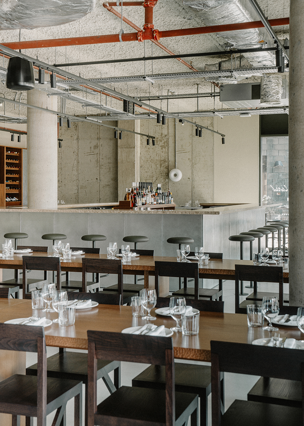 The 280 sqm restaurant operated by HAM Restaurants, the team behind Crispin and Bistro Freddie, sits at the heart of a wider mixed-use development that includes accommodation, wellness spaces, cultural venues and creative workspace. Known for their immersive, highly crafted concepts, A-nrd led the interior concept and design direction in close collaboration with Dominic Hamdy of HAM, working alongside Mason & Fifth, Interior Address and others to shape the layout, atmosphere, and bespoke elements throughout. Designed to feel timeless, tactile and quietly social, Canal is a space where crafted elements and raw finishes coexist.