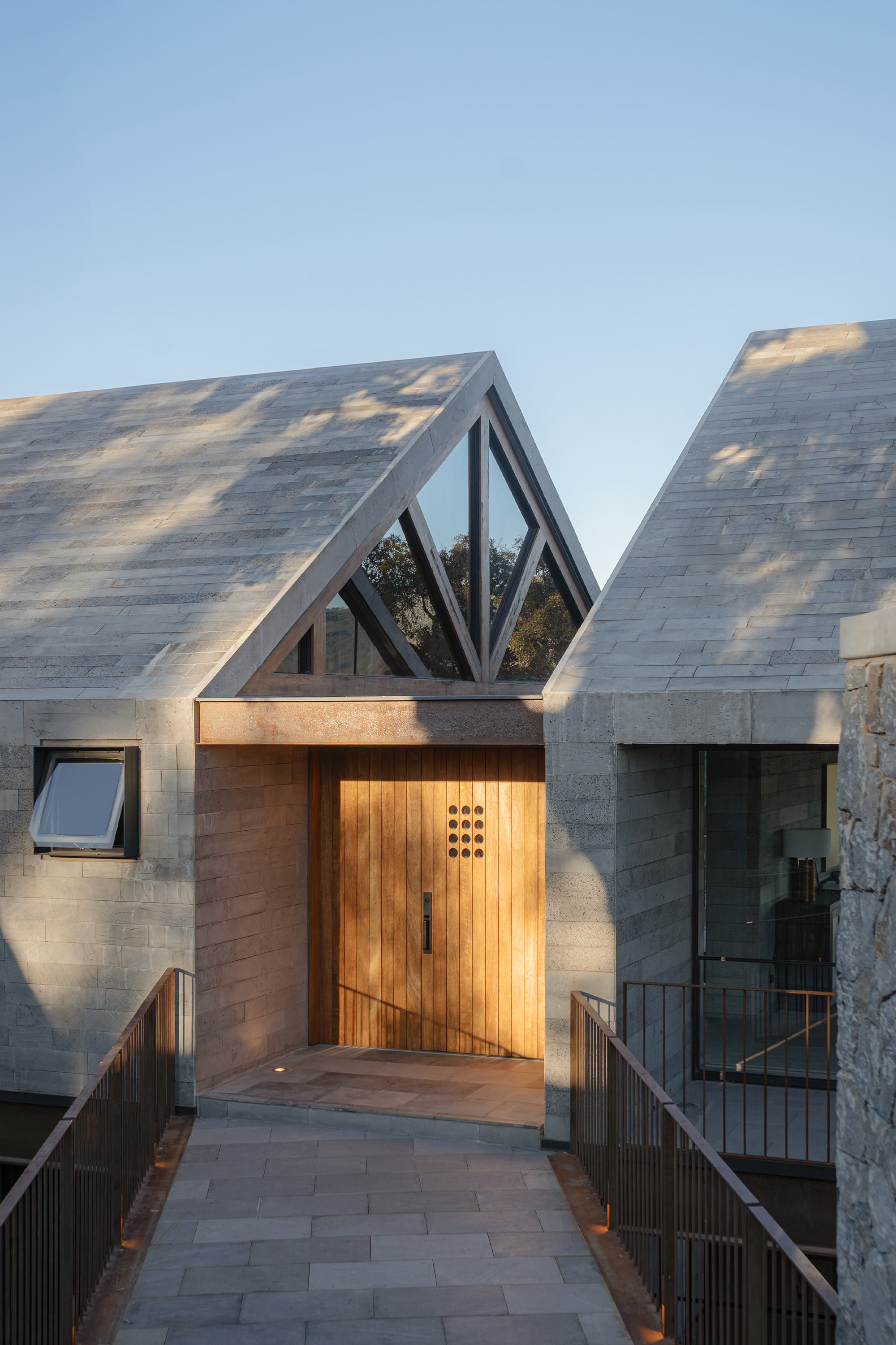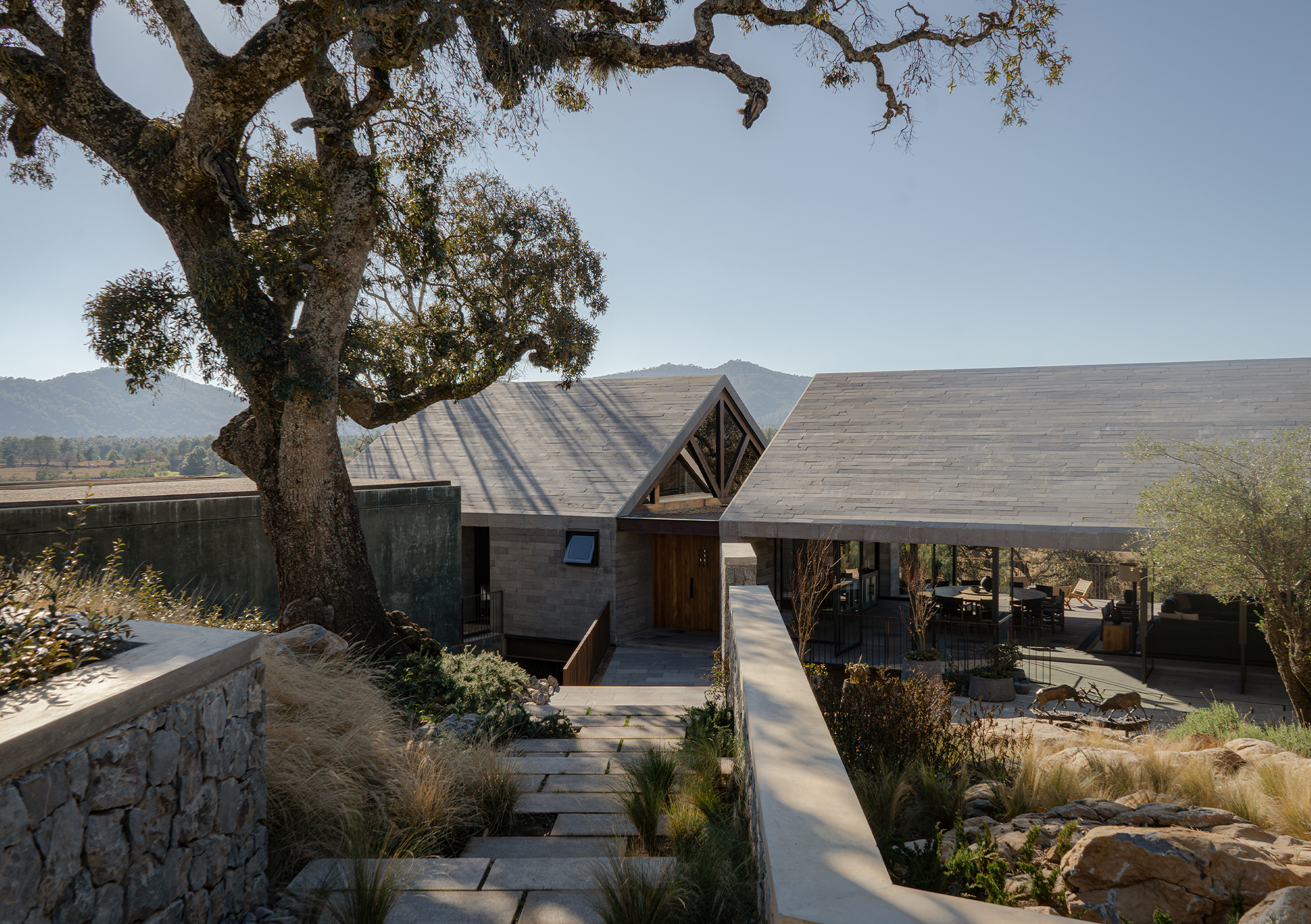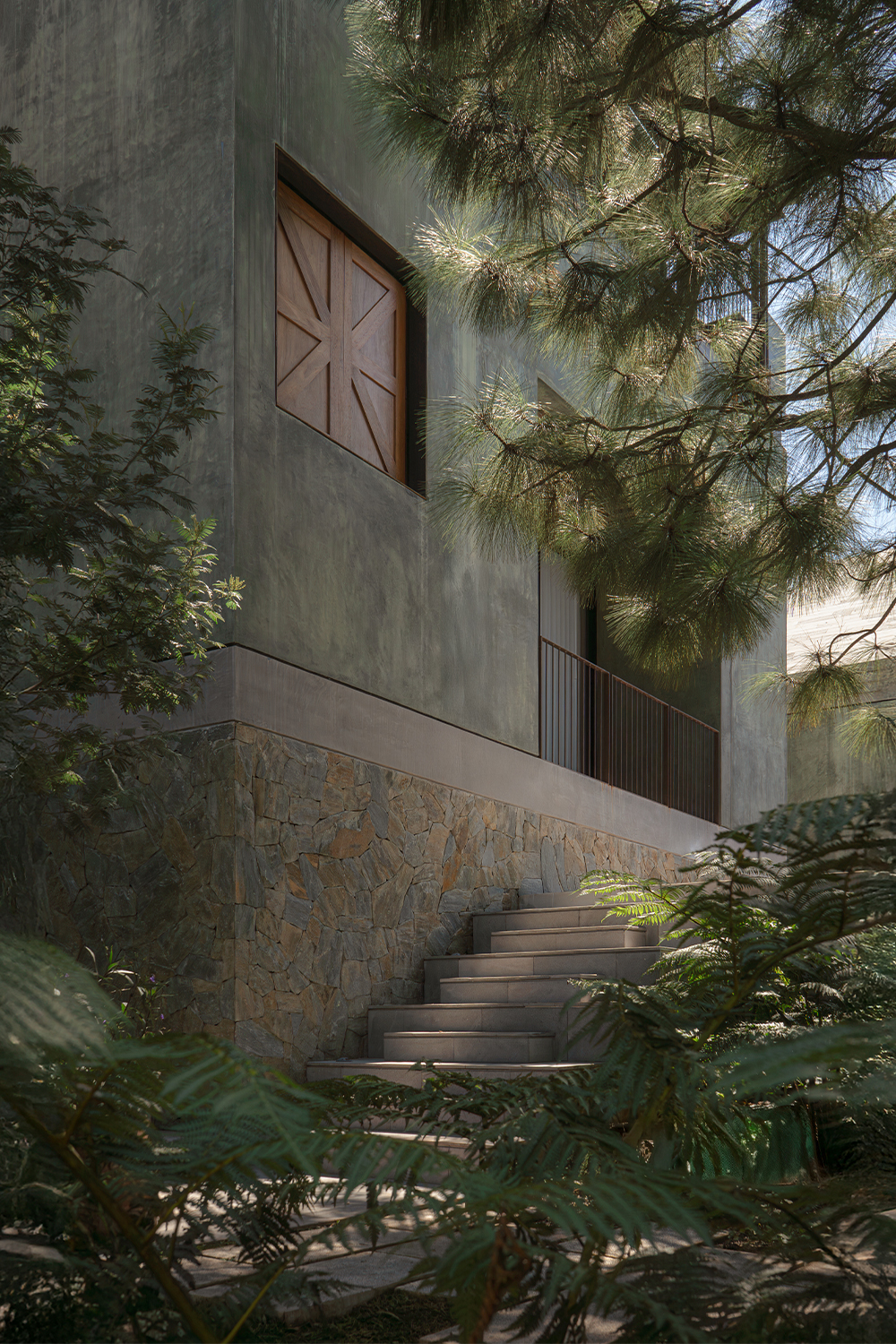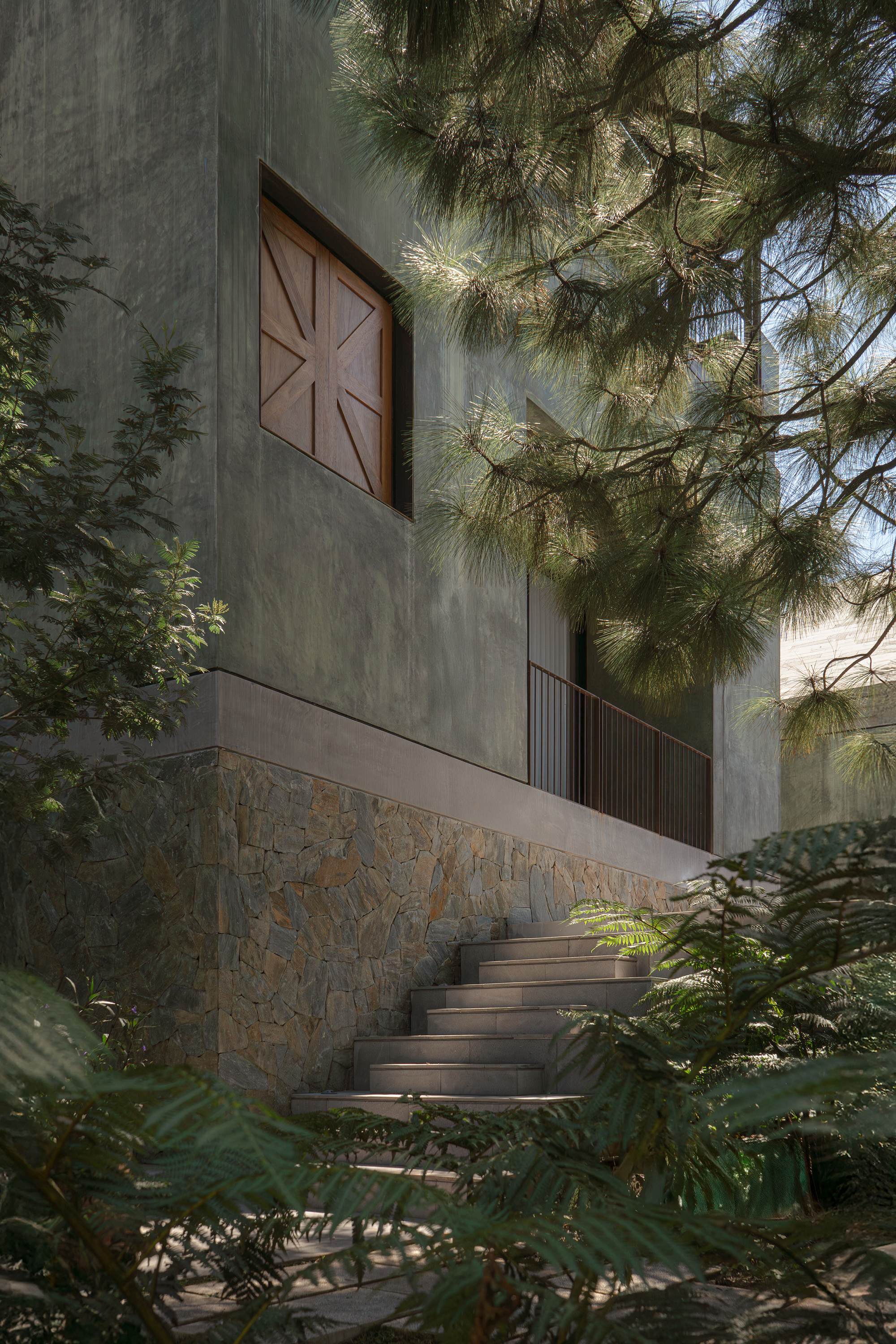 From the main entrance, the interior invites a contemplative transition marked by a courtyard with a century-old tree, whose presence is reflected in the selection of materials and interior colors. The use of green chukum—a handcrafted Yucatecan material with natural pigmentation—adds freshness and a chromatic connection to the surrounding vegetation, creating a warm and distinctive ambiance that coexists harmoniously with the stone walls and the solidity of the architecture.
