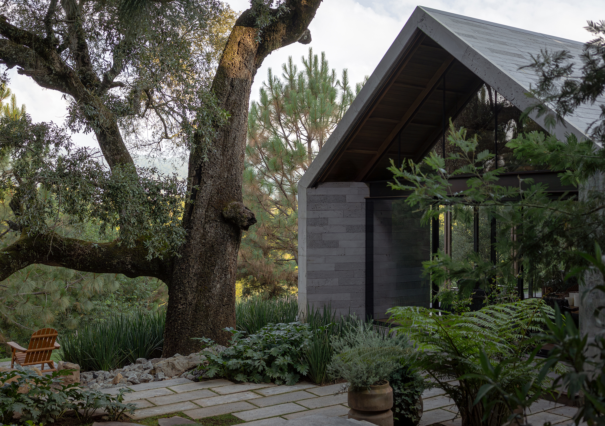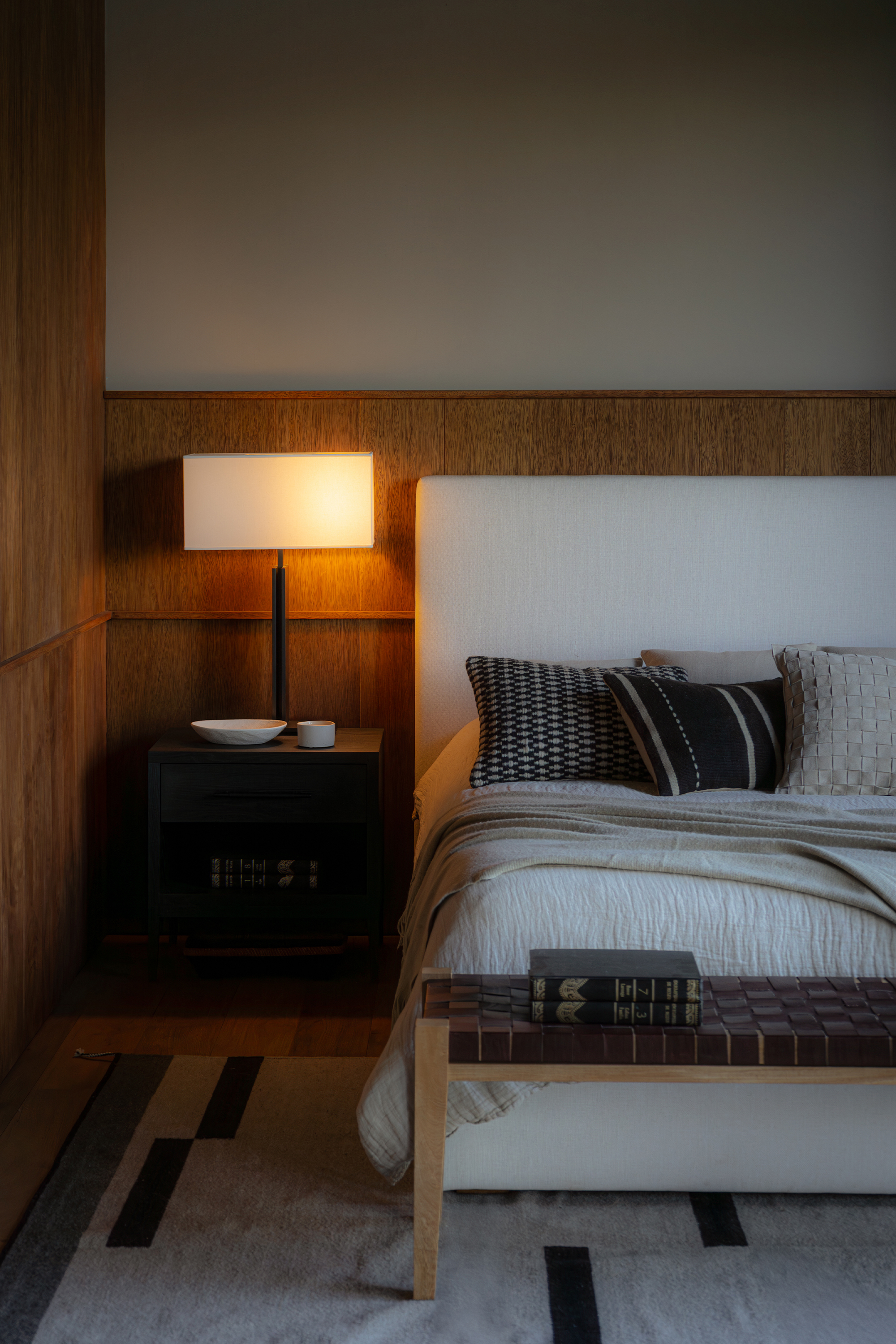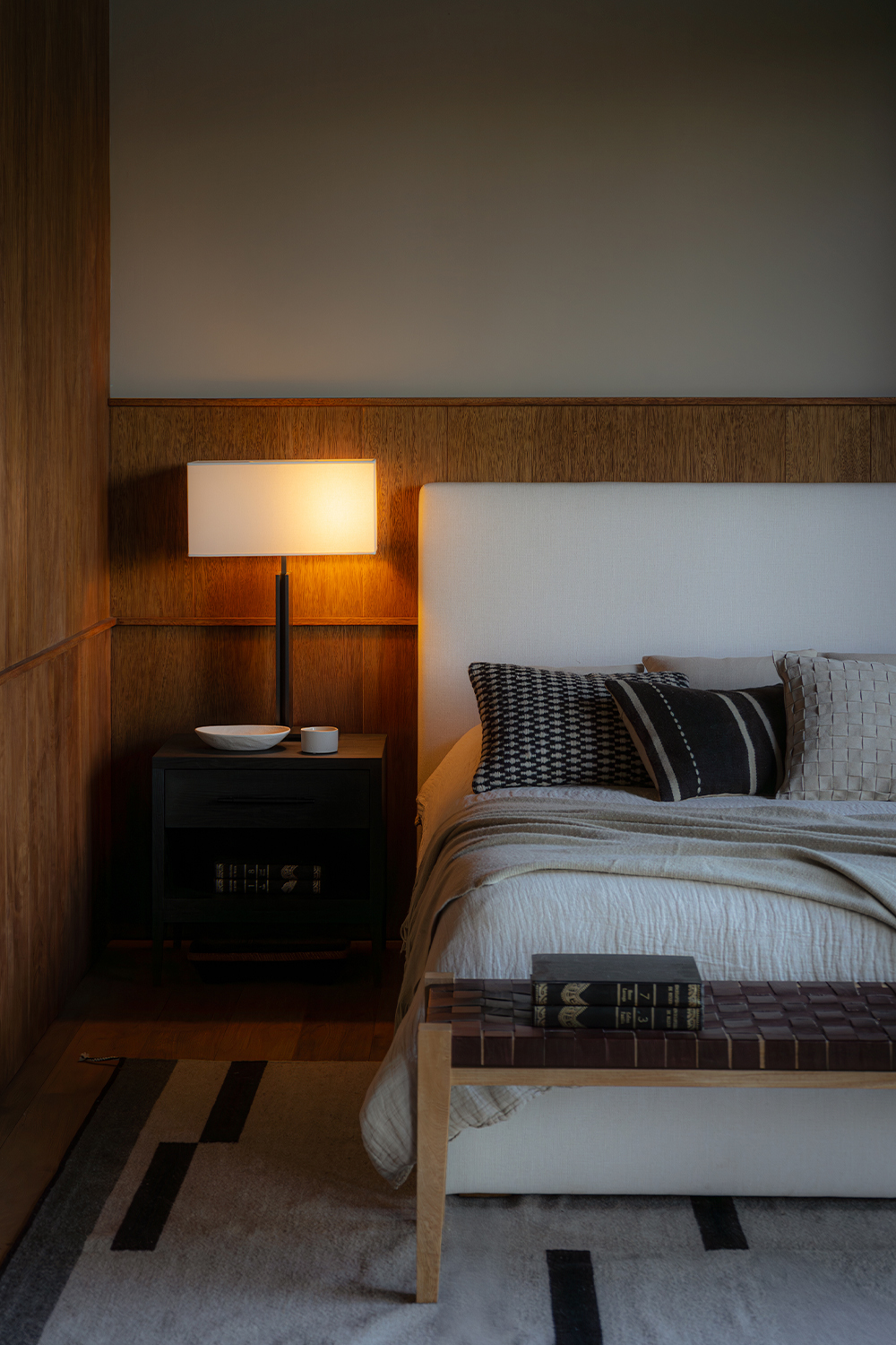 A defining element of the interior design is the integration of custom-made furniture created in collaboration with local workshops. These pieces balance functionality with the understated warmth that defines the project’s aesthetic. Handcrafted textiles and carefully selected objects—such as a wool rug woven in Oaxaca and vintage encyclopedias for the bookshelves—add authenticity and depth to the environment.