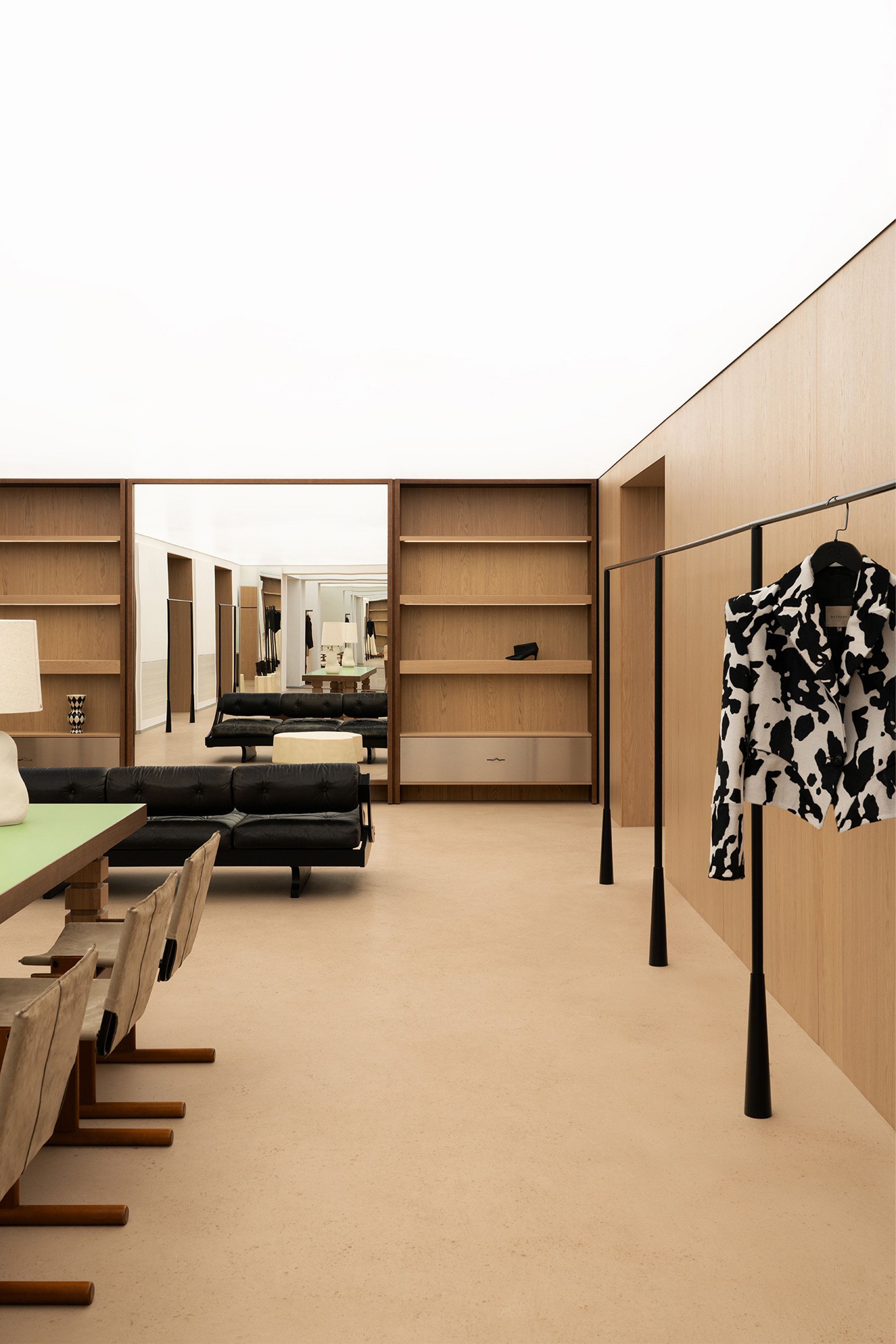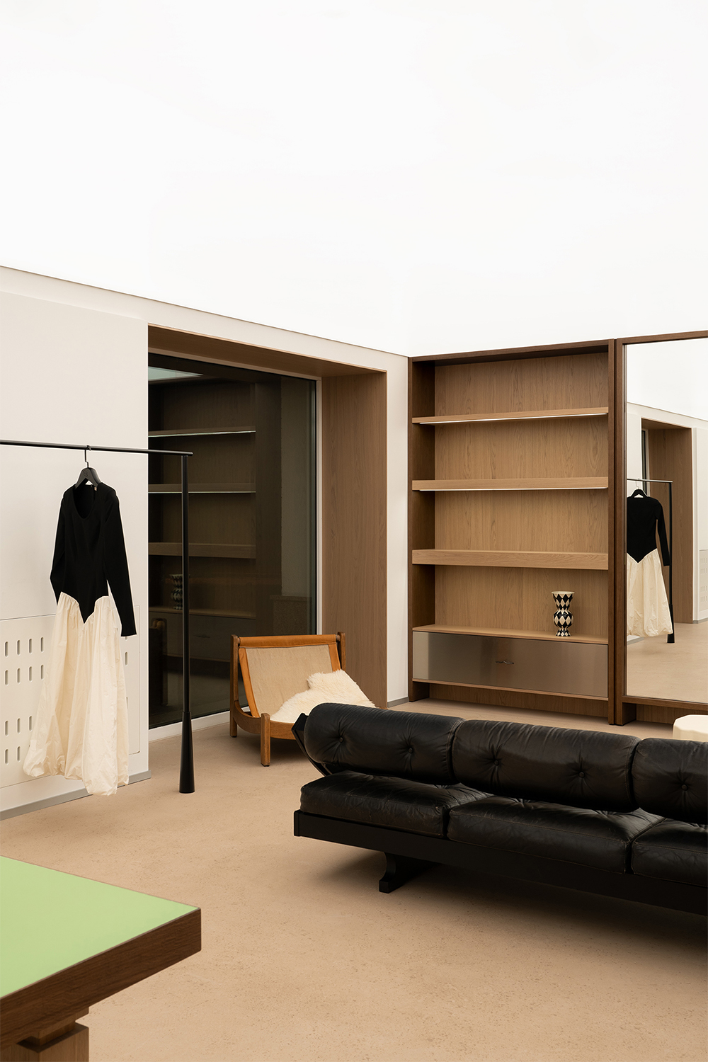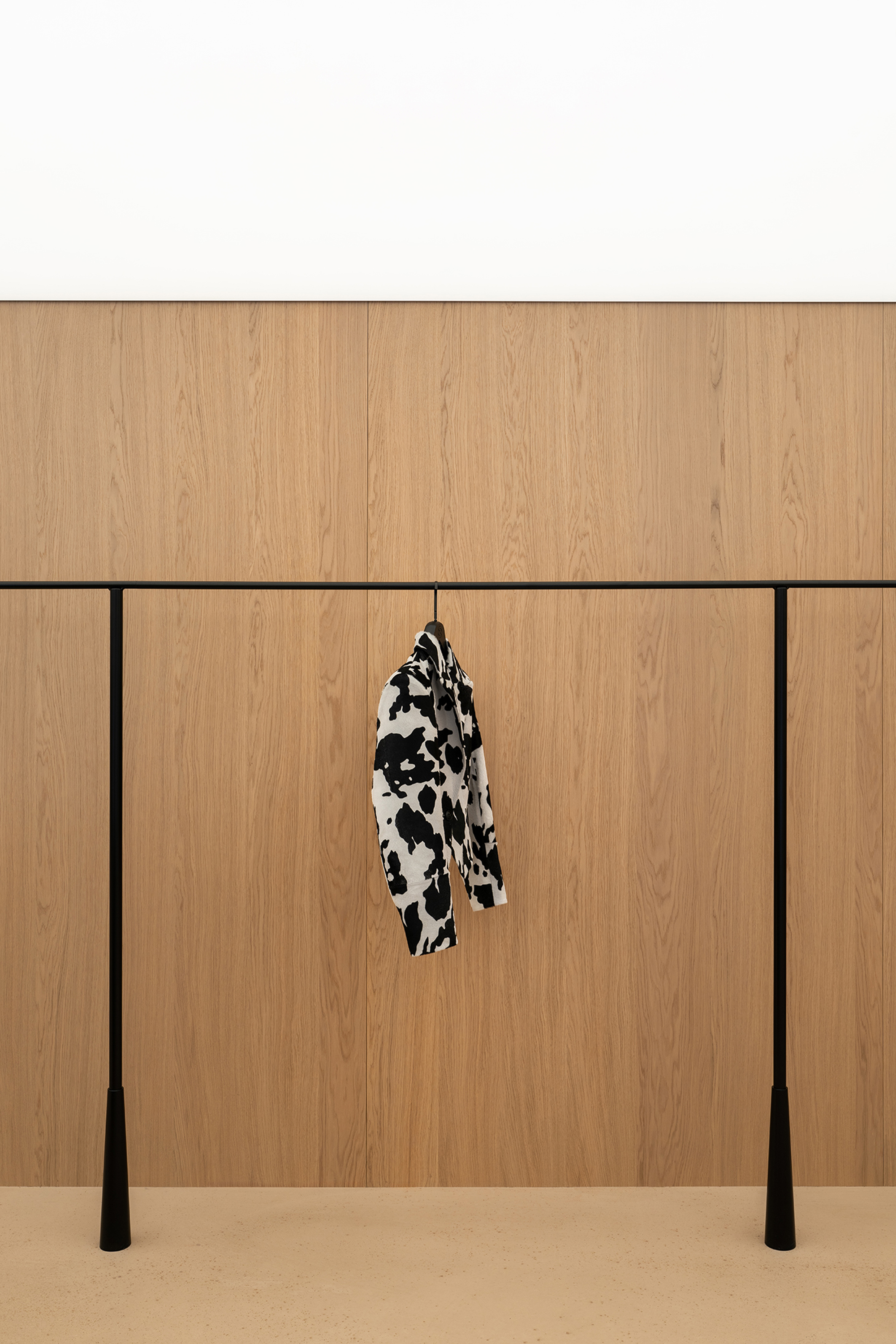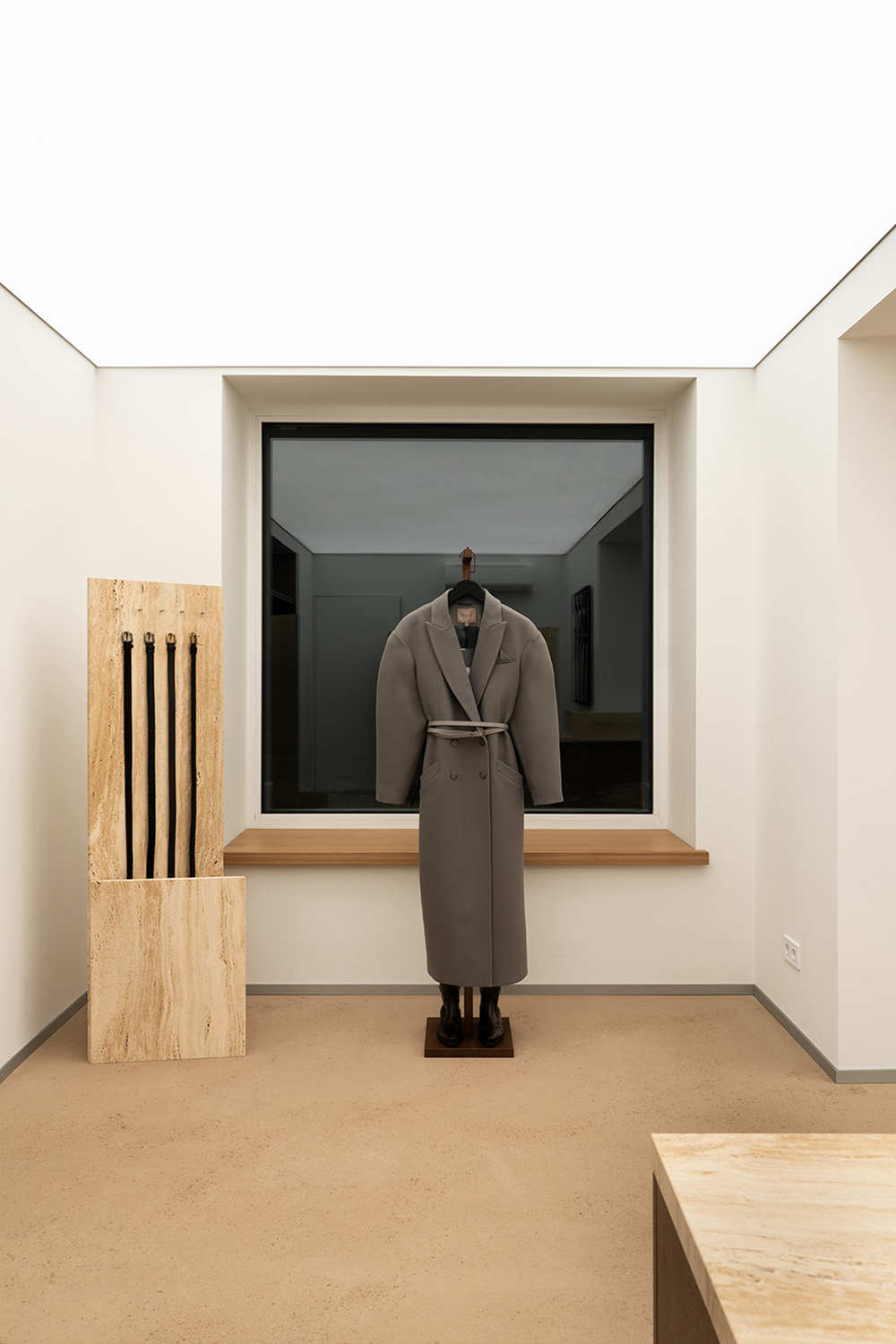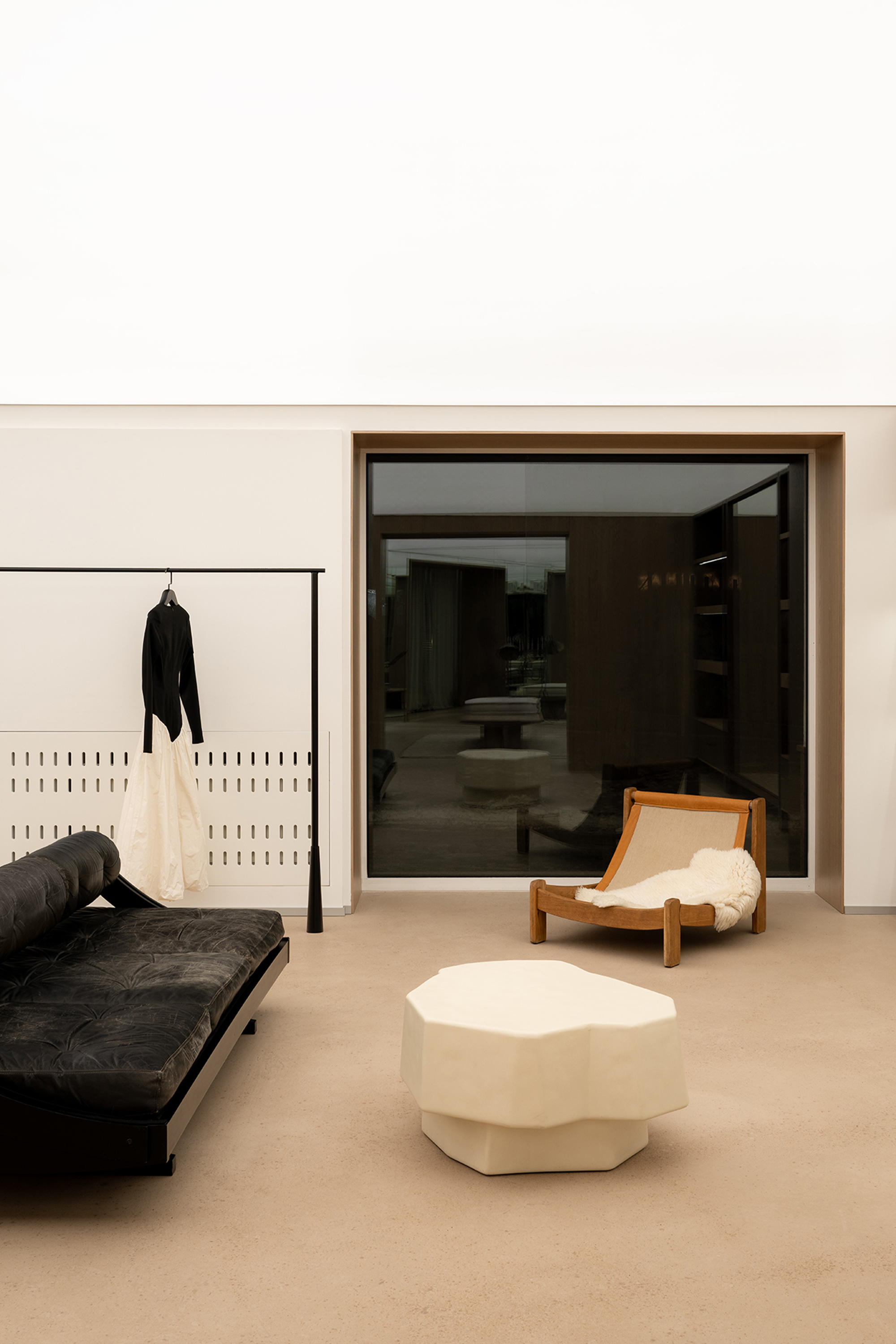 The room has an elongated shape and is divided into two zones relative to the entrance. The first visual accent is the reception desk, made of wood and travertine. Its elongated horizontal line forms the direction of movement inside the space. To the left of the reception desk is the main hall with rails for clothes and a waiting area. The latter is decorated with a black leather sofa by Gianni Songia, tables made of fiberglass concrete by ferm living and a low vintage armchair.