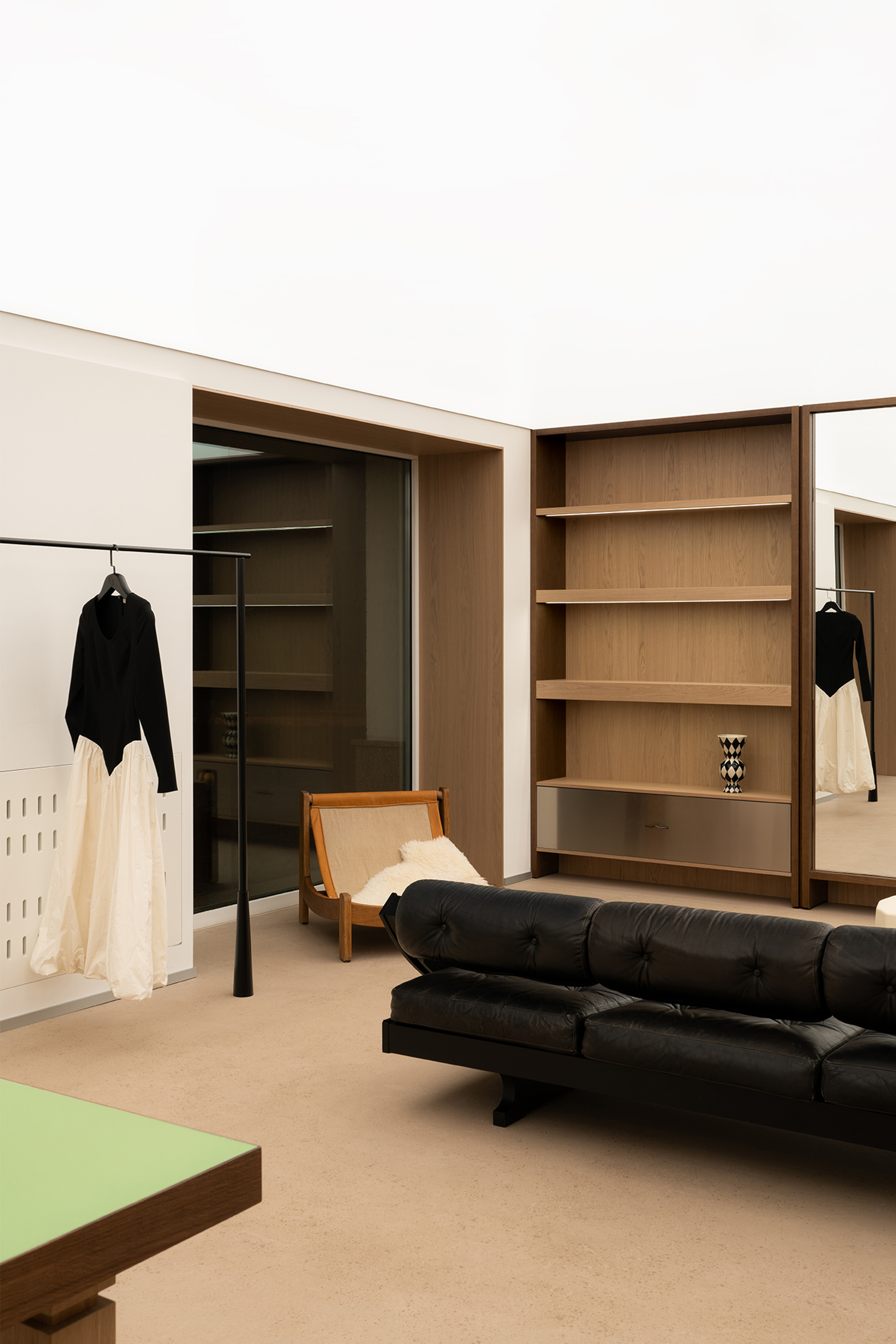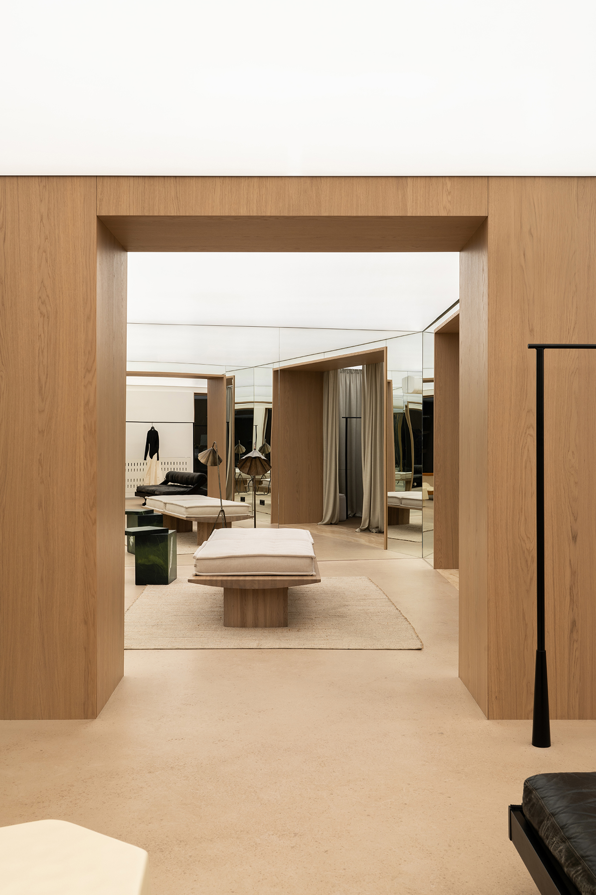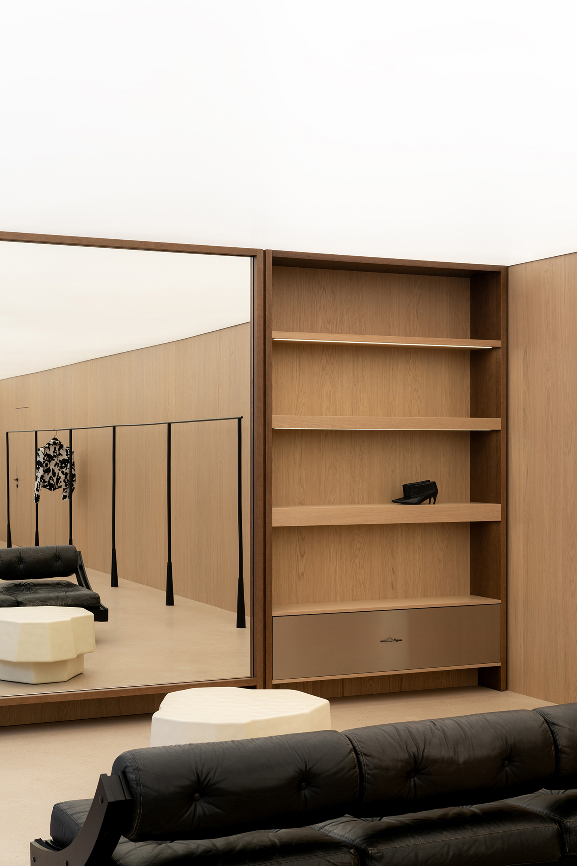 The rest of the room is finished in white - as a visual counterpoint to the warm wooden surfaces. Here is an artistic accent: a graphic painting by Ukrainian artist Dmytro Kozynets and a table lamp with a folded textile surface from the Ukrainian studio Cegla. Next are open shelves made of green avocatus quartzite and a VIP fitting room block hidden behind a mirrored volume with its own waiting area.