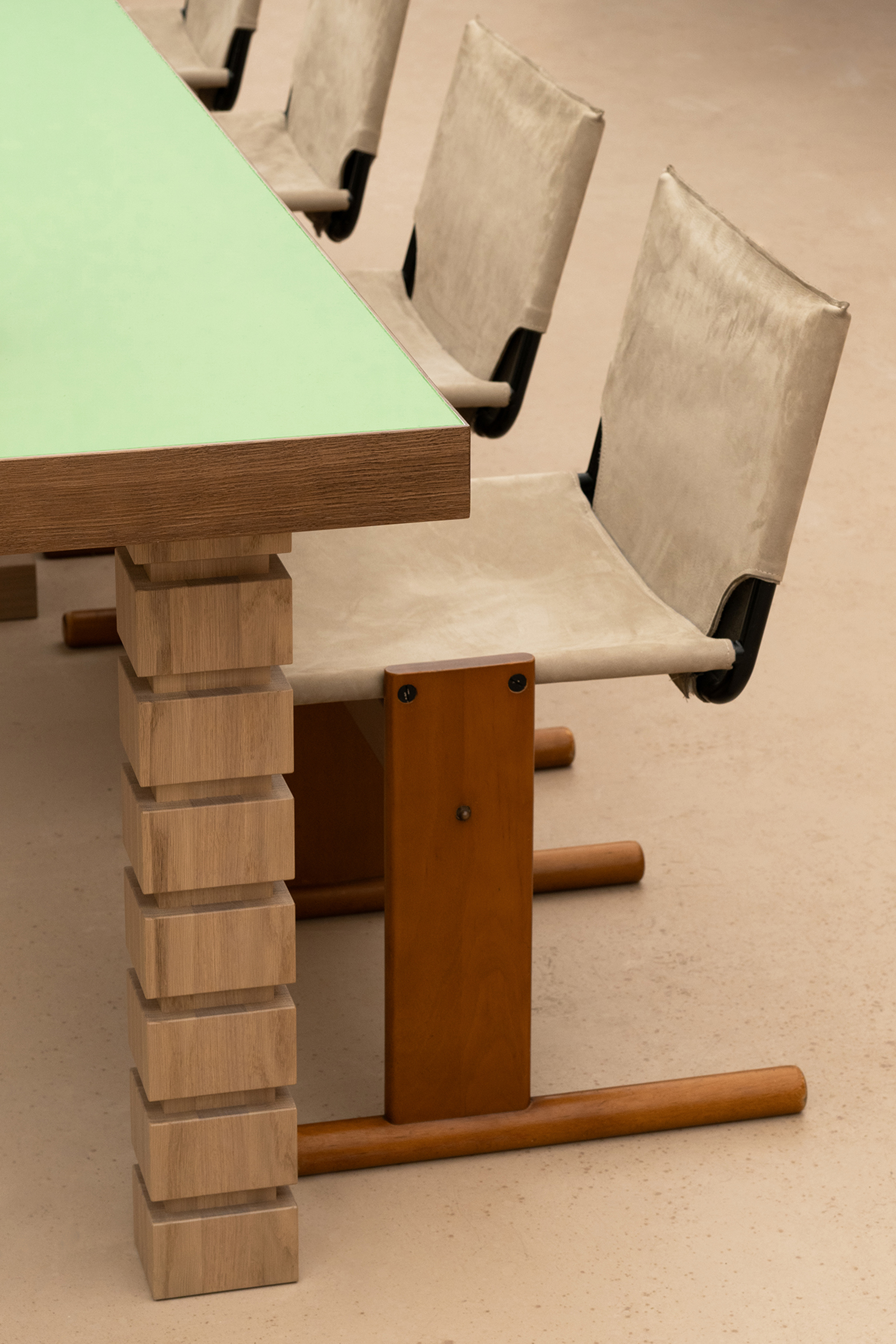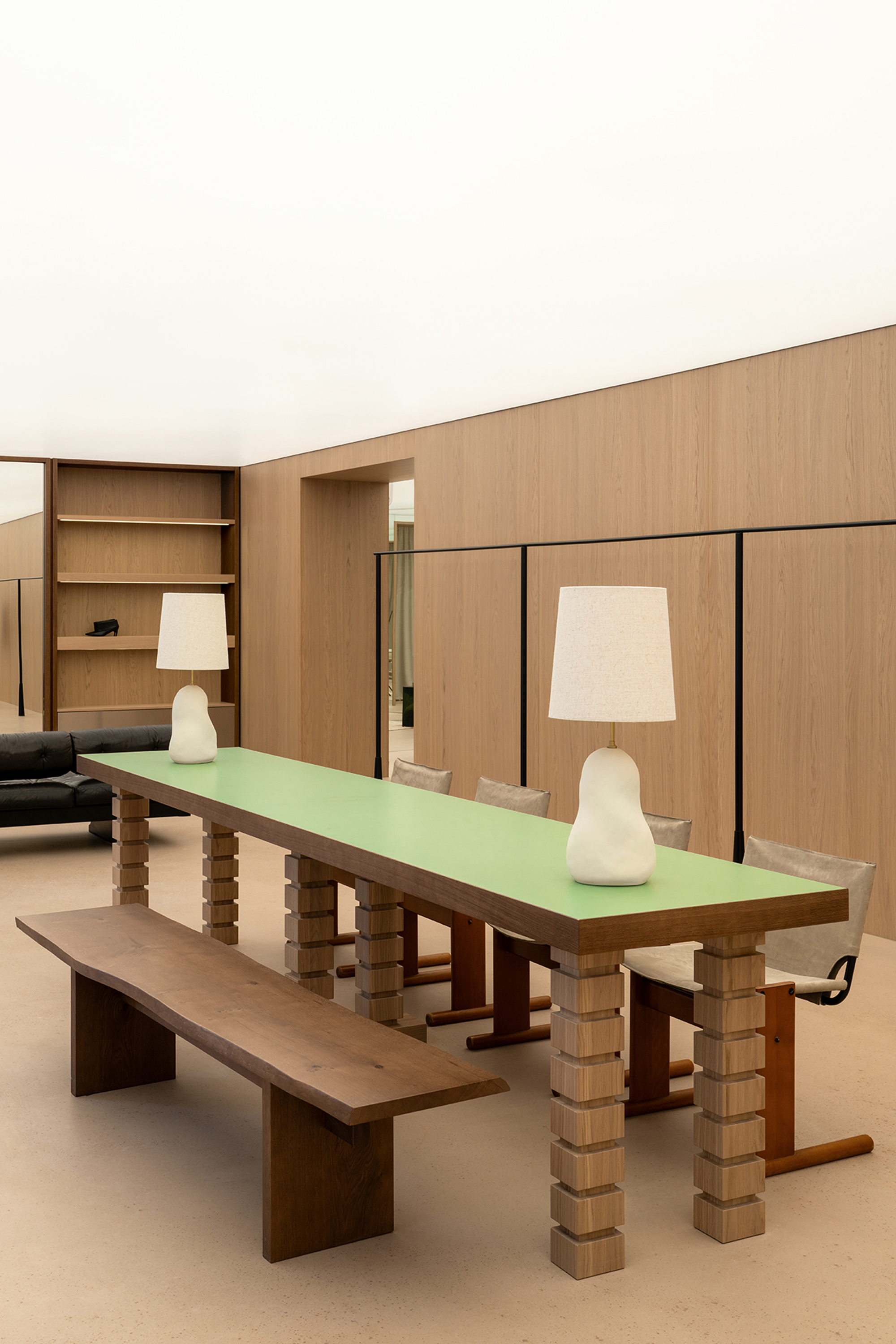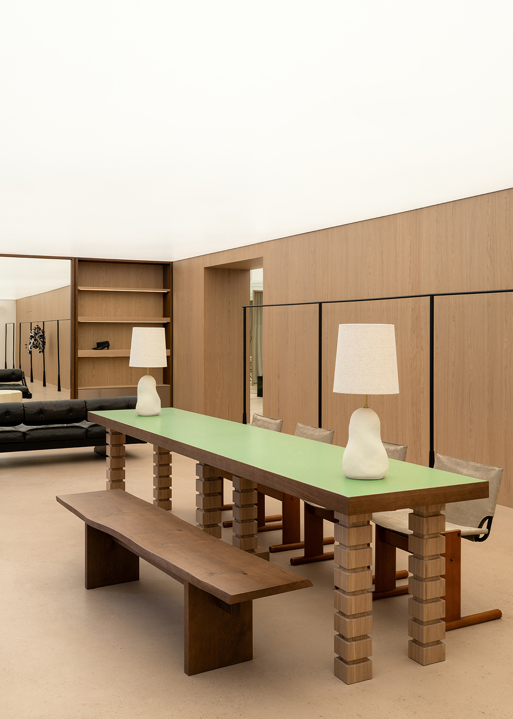 In the center is an individually designed table with a massive wooden structure and a deep green tabletop. It acts as an architectural axis - the logic of movement and zoning is organized around it. The table is multifunctional: it serves as a place for display, interaction with clients and events. The composition is complemented by vintage Poliform chairs from the 1970s and a bench made of solid wood.