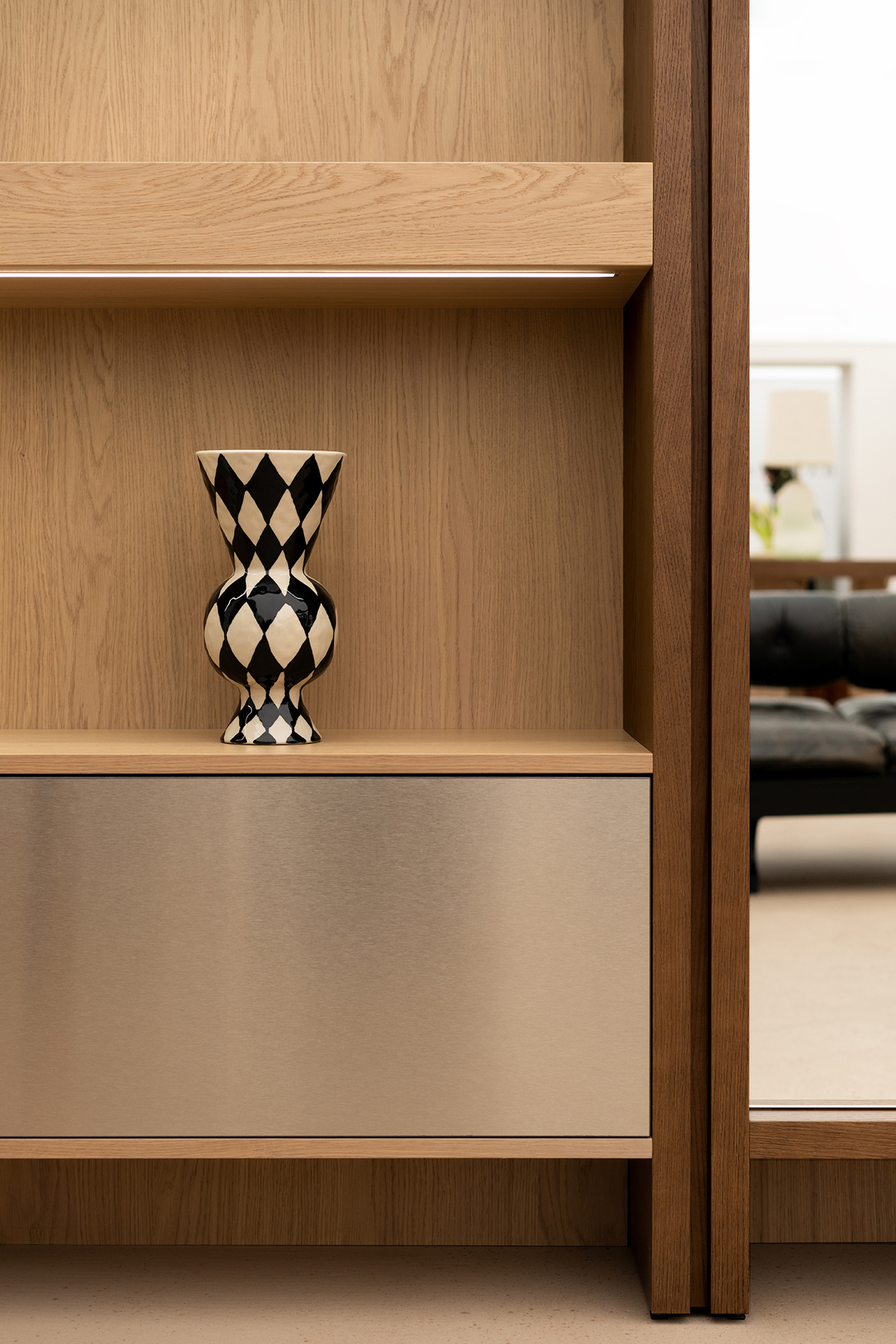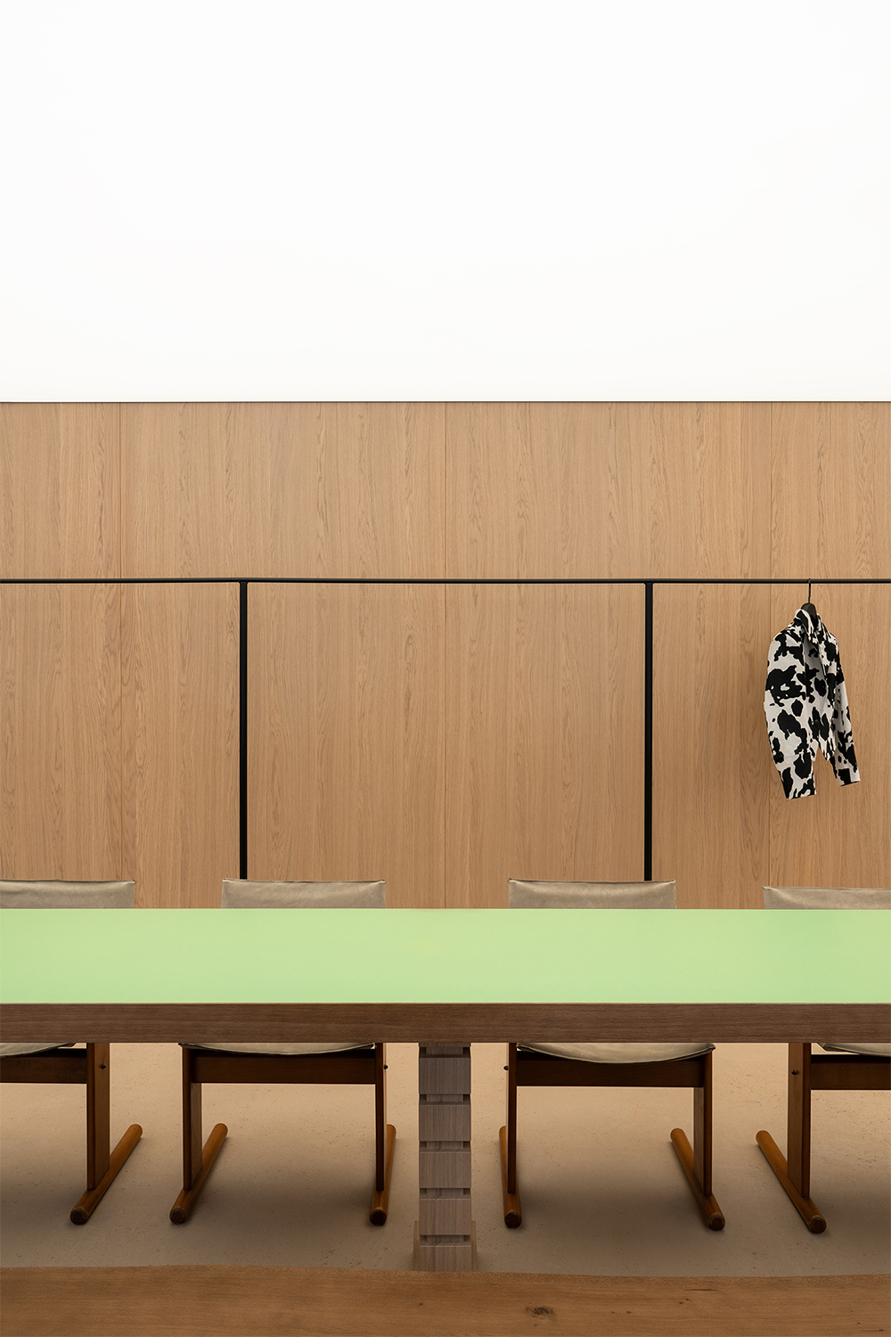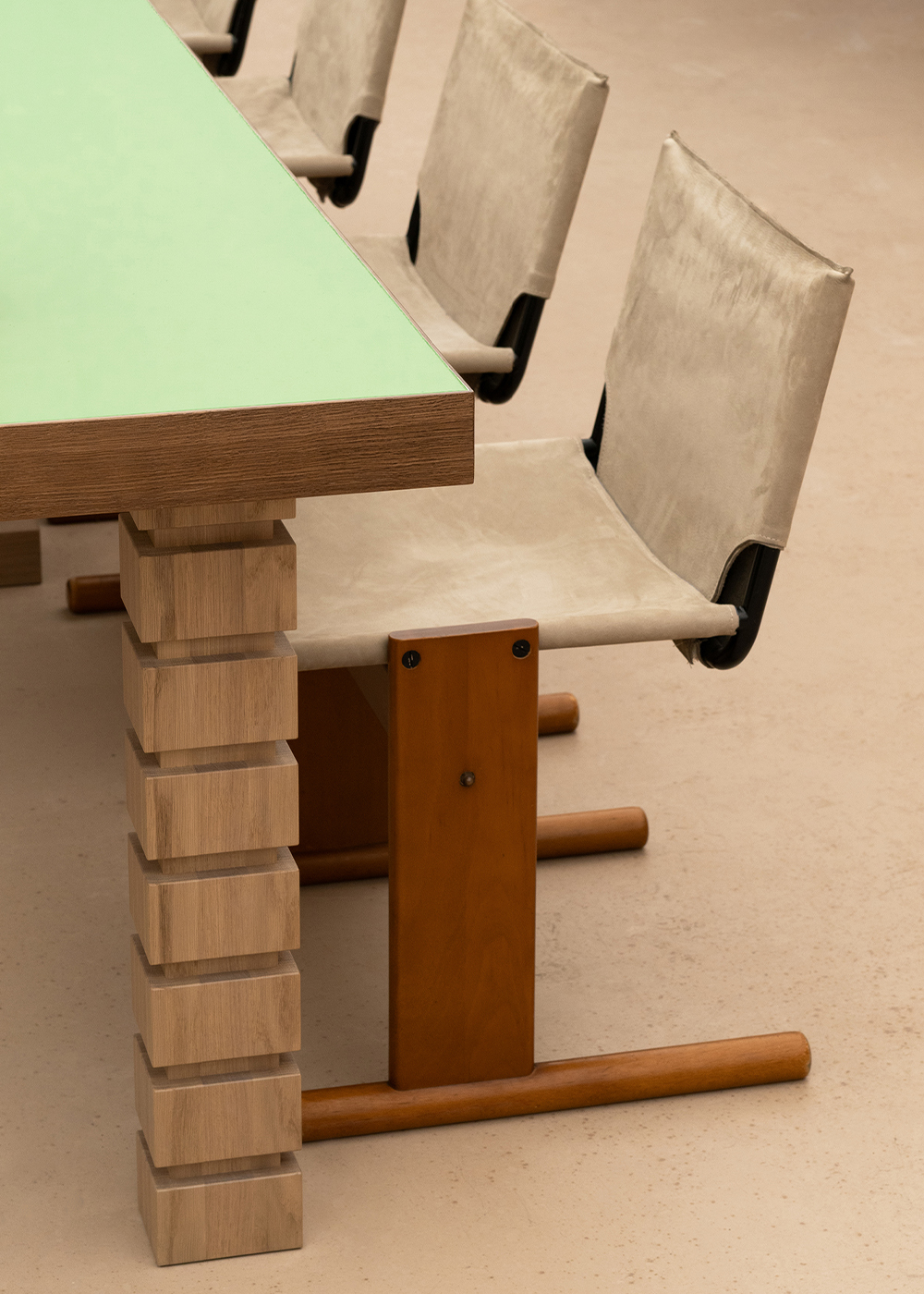 In the center is an individually designed table with a massive wooden structure and a deep green tabletop. It acts as an architectural axis - the logic of movement and zoning is organized around it. The table is multifunctional: it serves as a place for display, interaction with clients and events. The composition is complemented by vintage Poliform chairs from the 1970s and a bench made of solid wood.