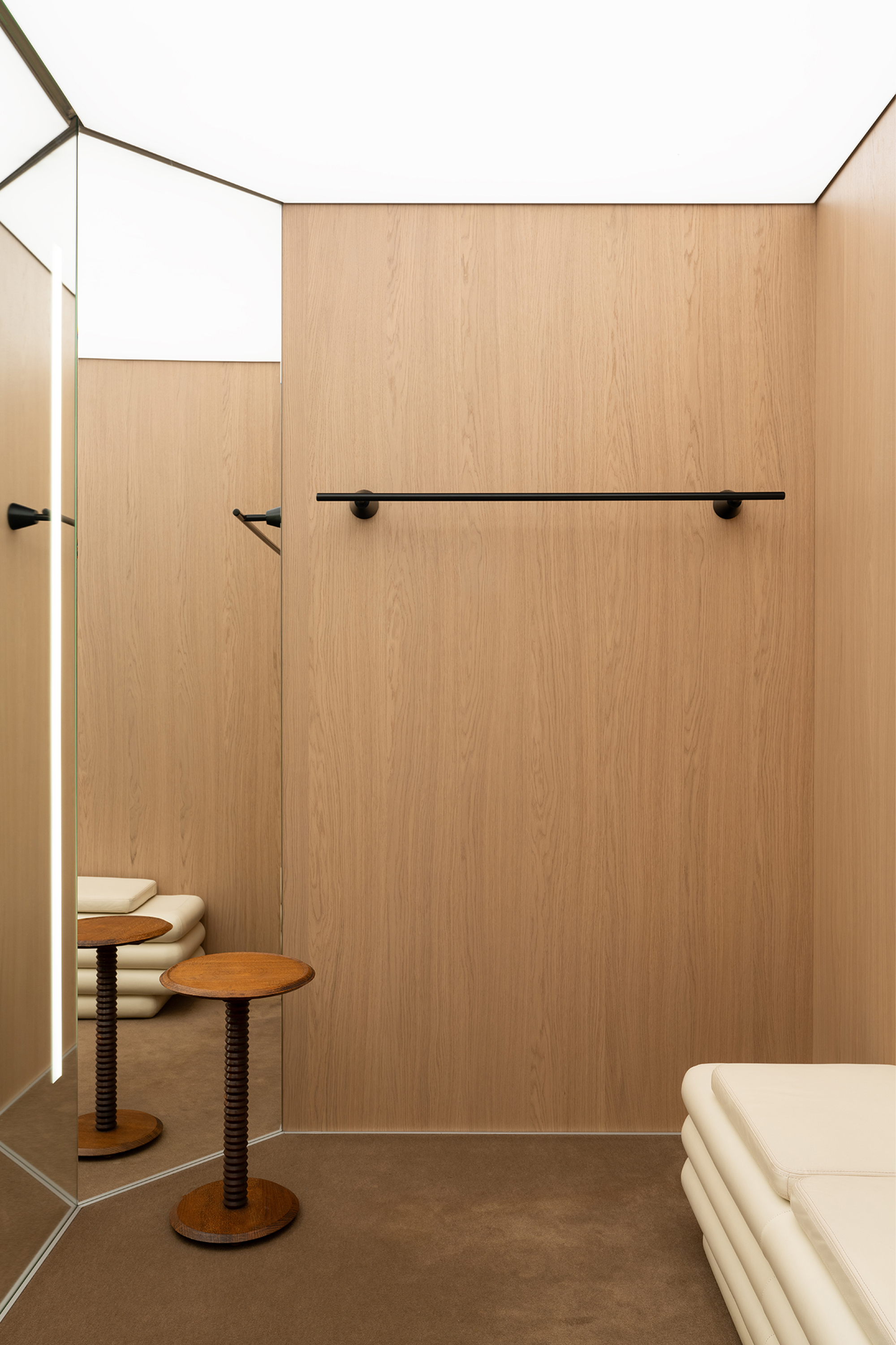 The walls in the hall are finished with veneered oak panels that merge into a block with a shelf and a large mirror located opposite the waiting area. From this point - through a wooden portal - the transition leads to the fitting room area. The fitting room block consists of two parts. The open part includes mirror surfaces and a soft bench; the closed part - three fitting rooms, separated by linen beige curtains. Inside - oval mirrors in wooden frames and carpeting.