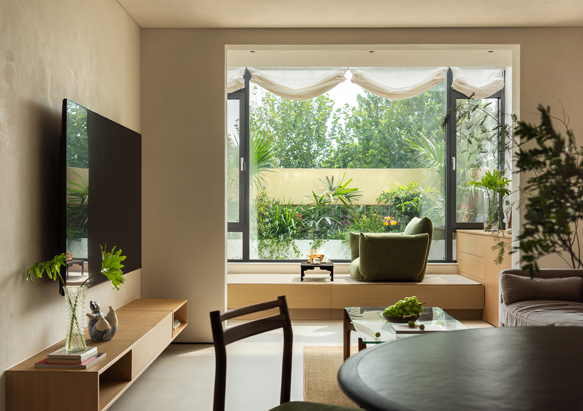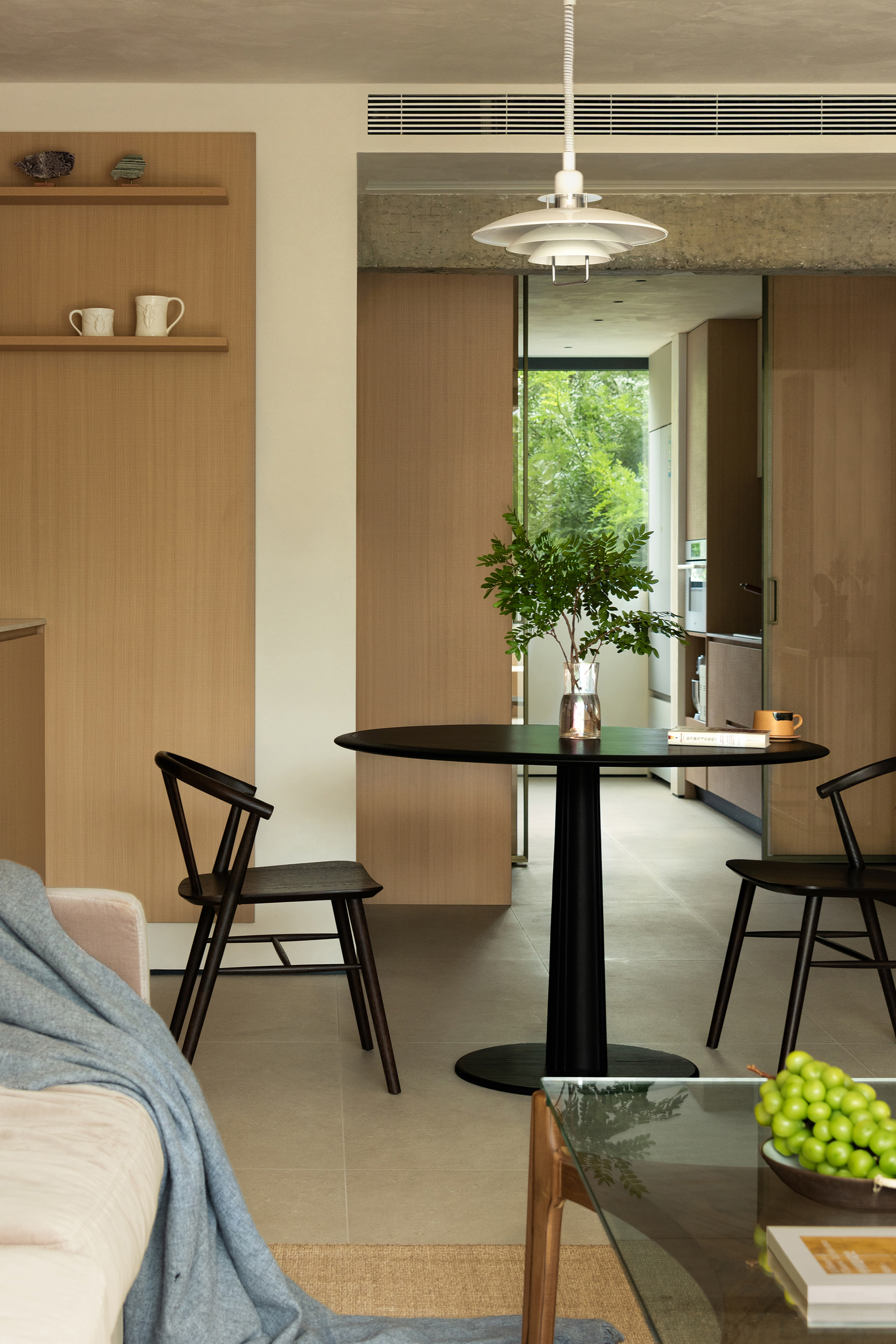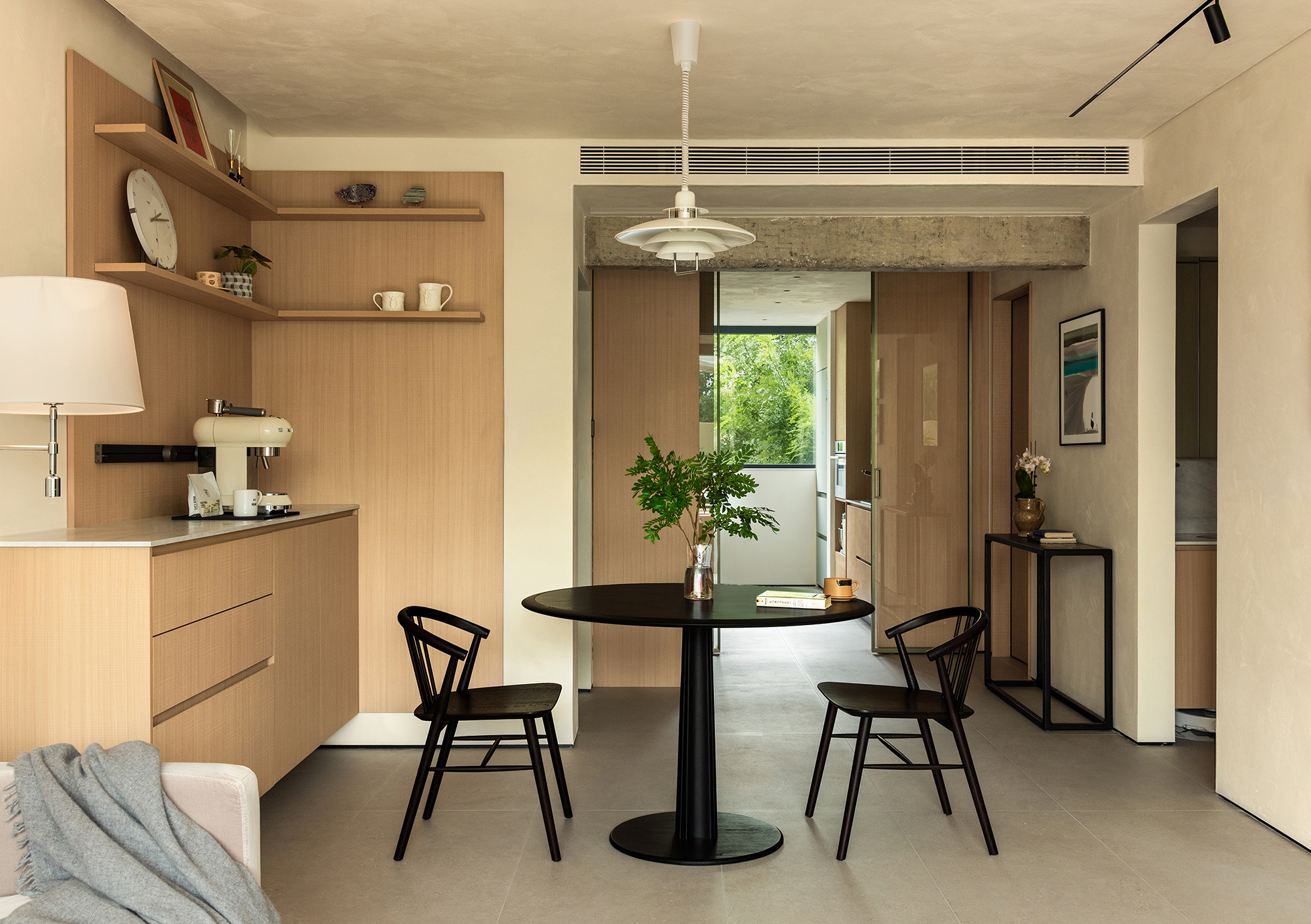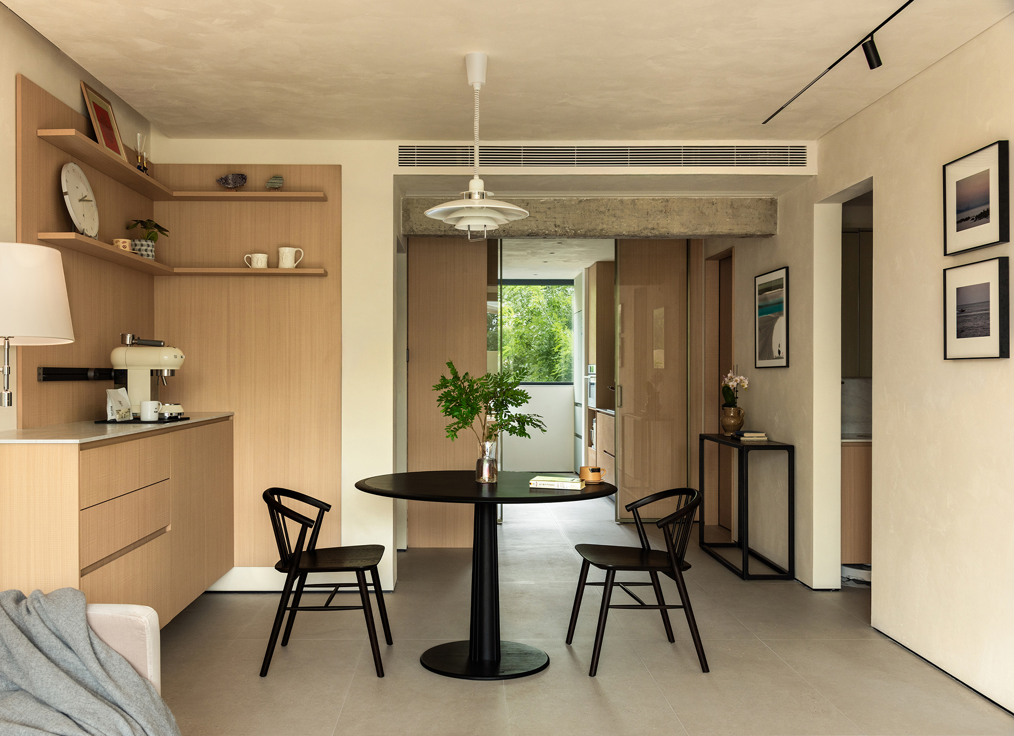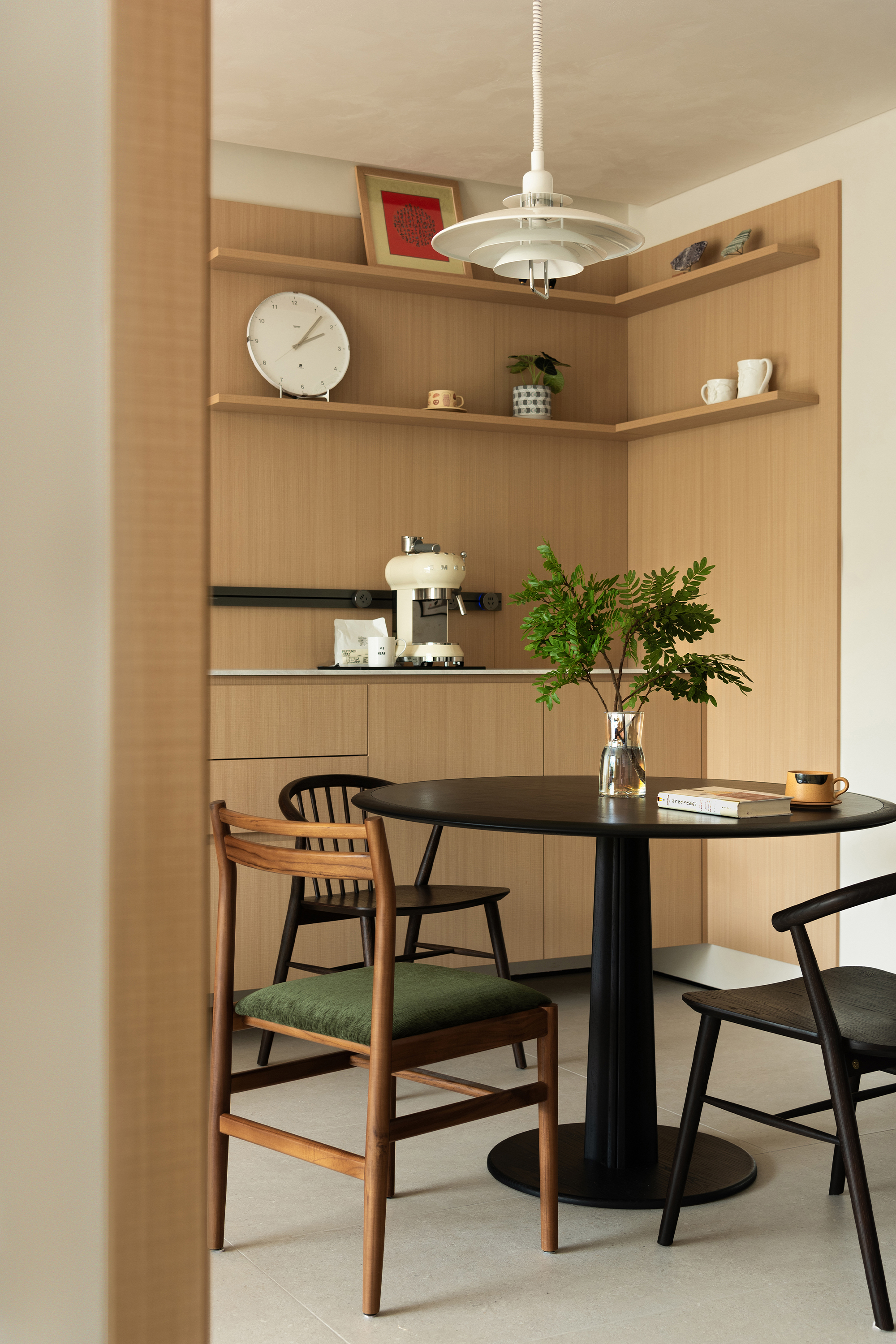 The living and dining zones are integrated into a seamless layout. Grey terrazzo tiles establish a calm foundation, while a raised platform extends the balcony into the interior, creating a threshold that is both seat and edge. Greenery from the planter softens the boundary, merging indoor and outdoor. A round dining table fosters intimacy, paired with a timber sideboard for storage and backdrop. An adjustable pendant light reflects the flexibility of daily life. A sintered stone countertop wraps upward to form a continuous surface, reinforcing the minimalist tone. The entry sequence is organized through a raised stone base and concealed cabinetry, encouraging a natural order of “shoes off—temporary pause—return to place.” Visual continuity is created between the blackwood dining table and the entrance console, ensuring a fluid spatial transition.