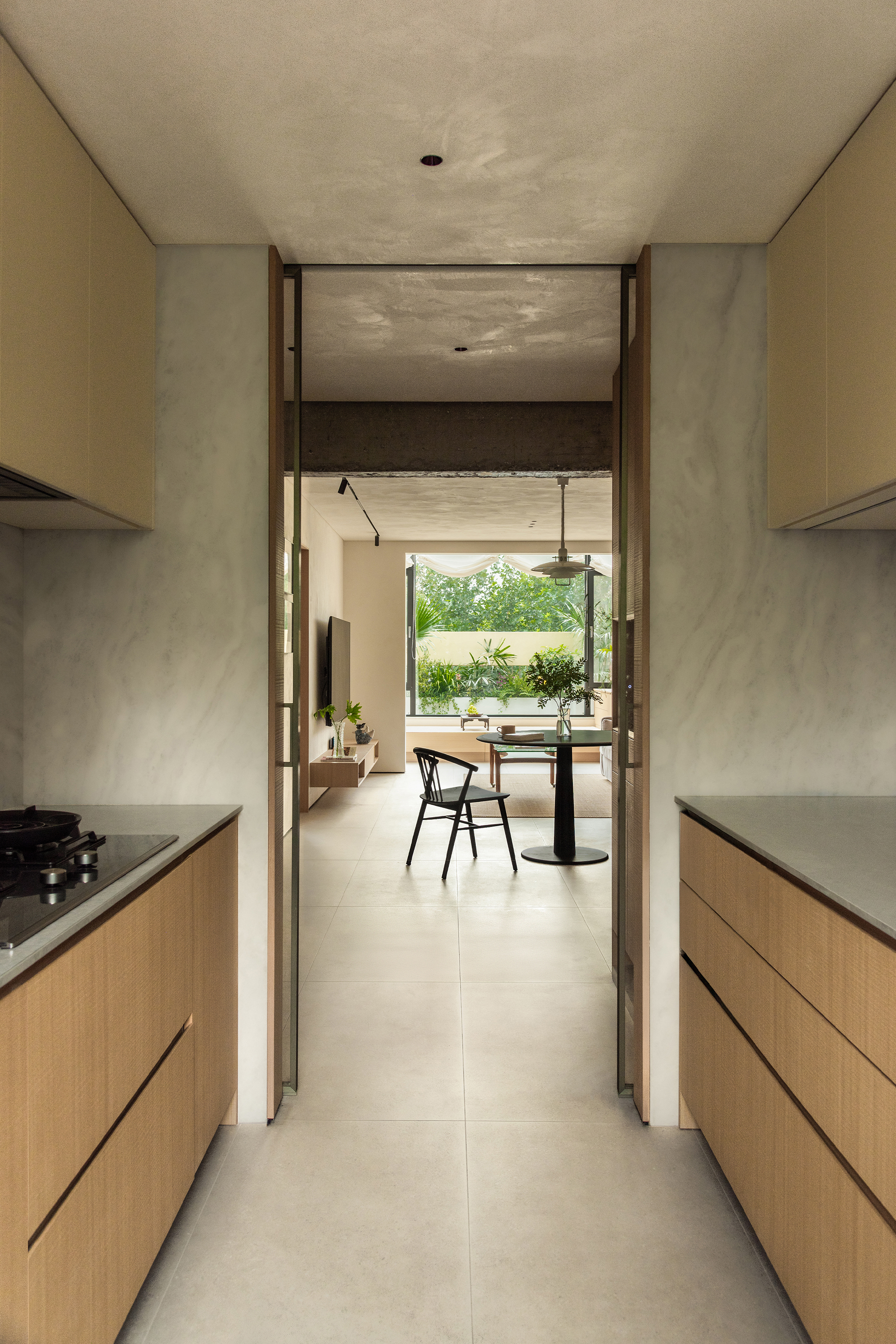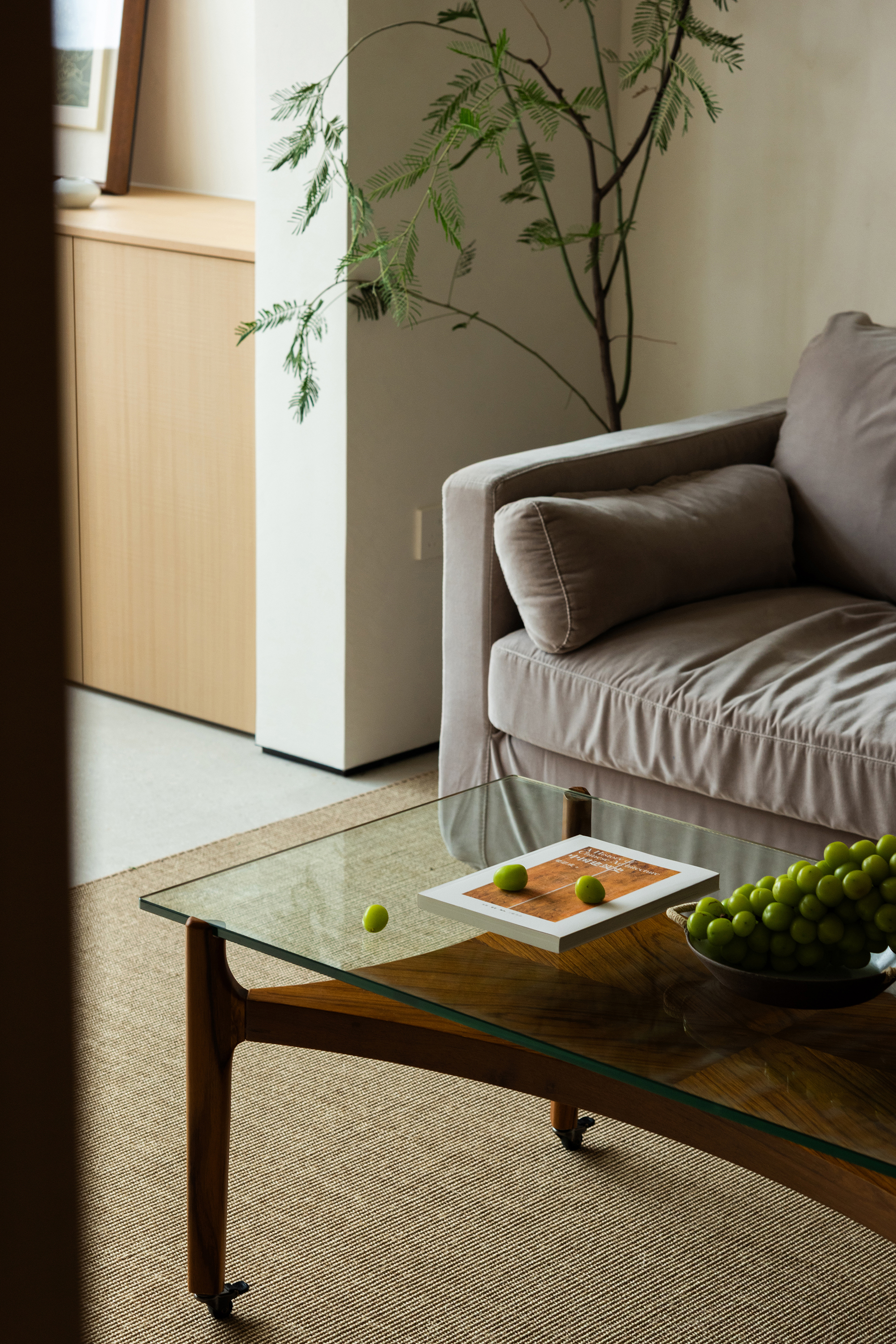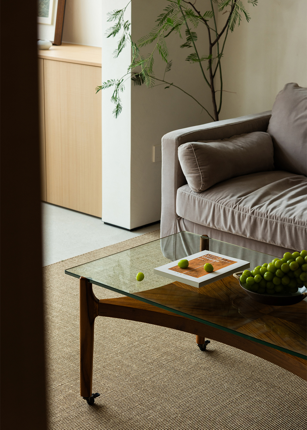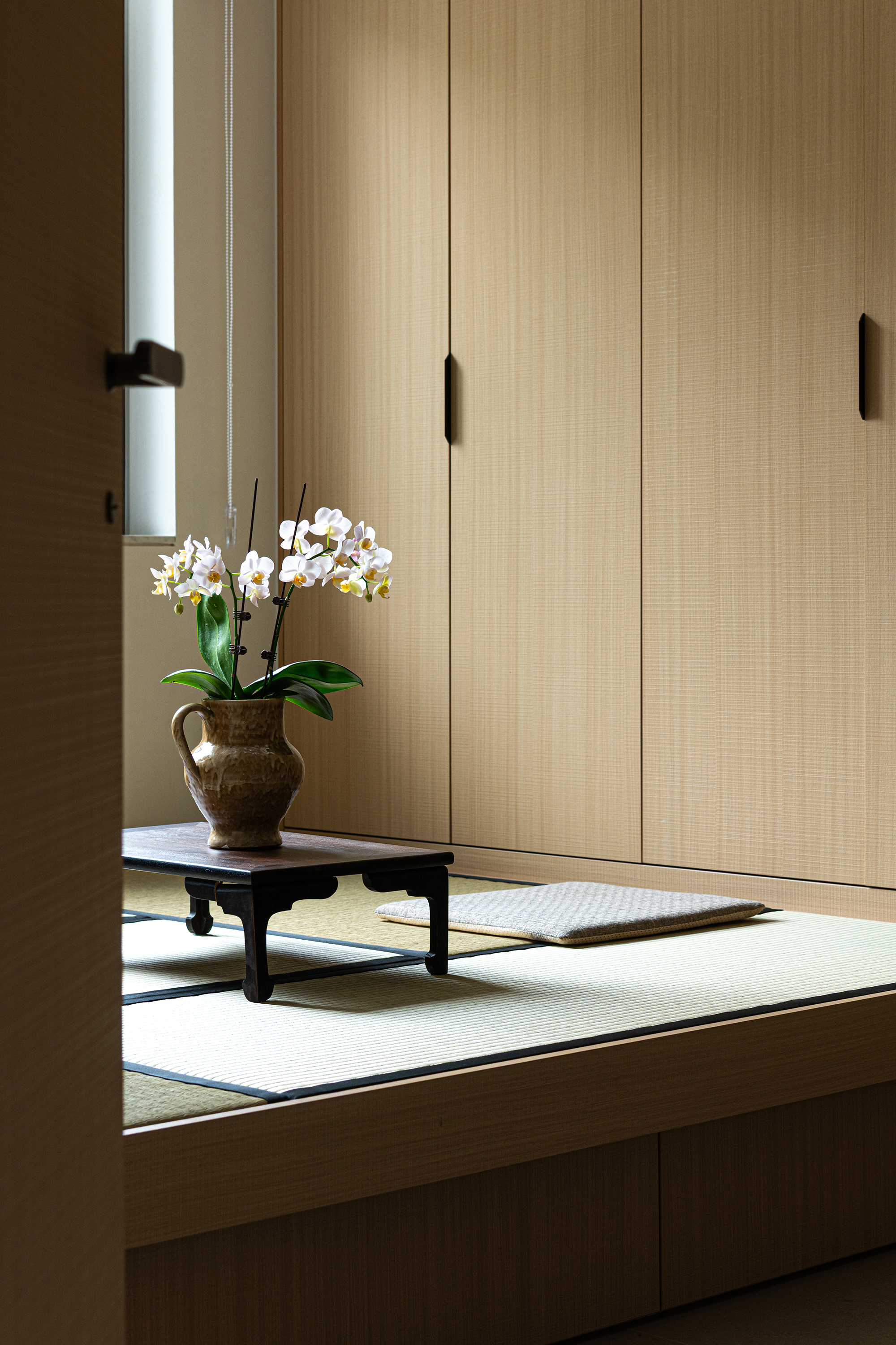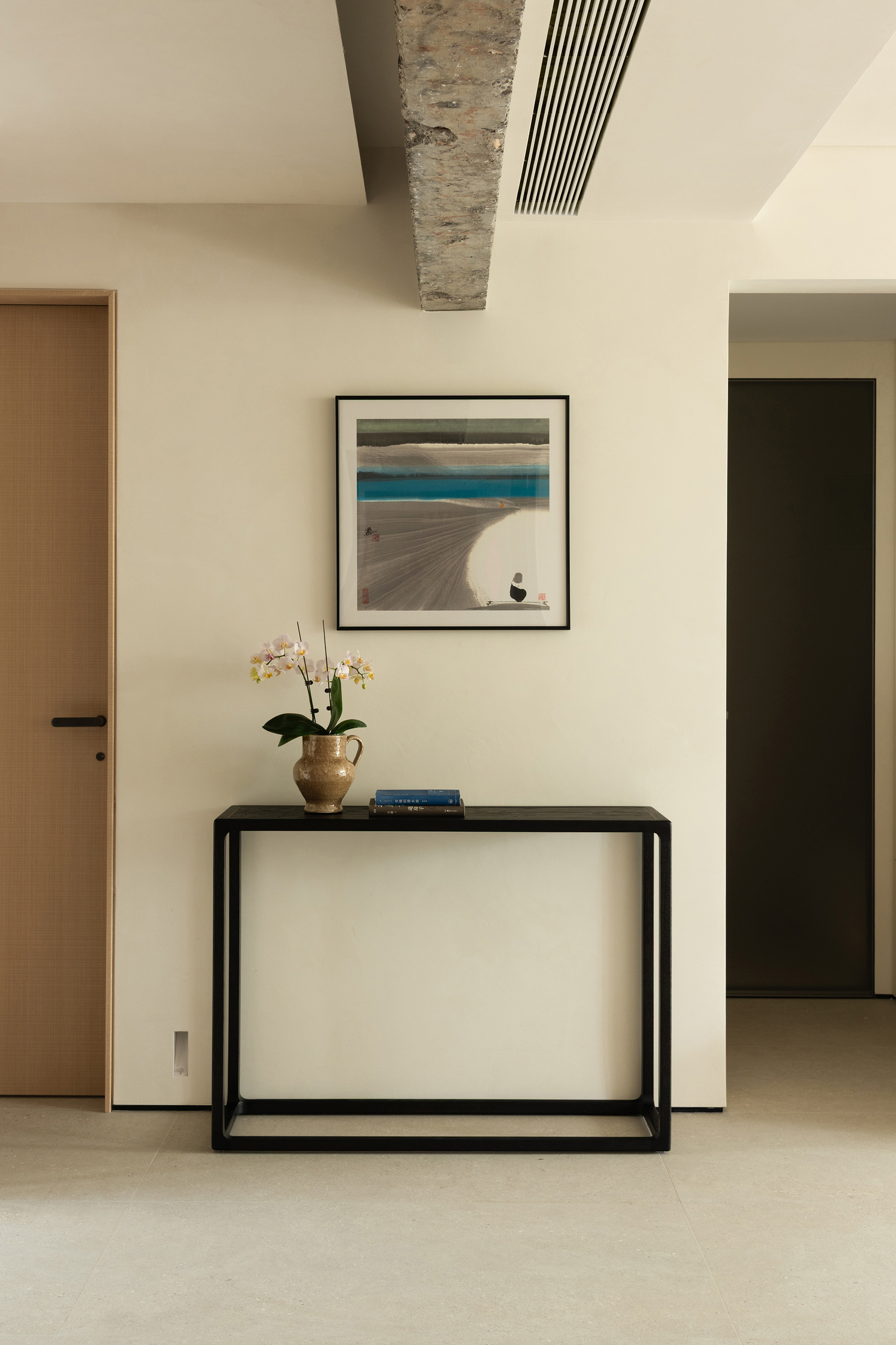 The living and dining zones are integrated into a seamless layout. Grey terrazzo tiles establish a calm foundation, while a raised platform extends the balcony into the interior, creating a threshold that is both seat and edge. Greenery from the planter softens the boundary, merging indoor and outdoor. A round dining table fosters intimacy, paired with a timber sideboard for storage and backdrop. An adjustable pendant light reflects the flexibility of daily life. A sintered stone countertop wraps upward to form a continuous surface, reinforcing the minimalist tone. The entry sequence is organized through a raised stone base and concealed cabinetry, encouraging a natural order of “shoes off—temporary pause—return to place.” Visual continuity is created between the blackwood dining table and the entrance console, ensuring a fluid spatial transition.