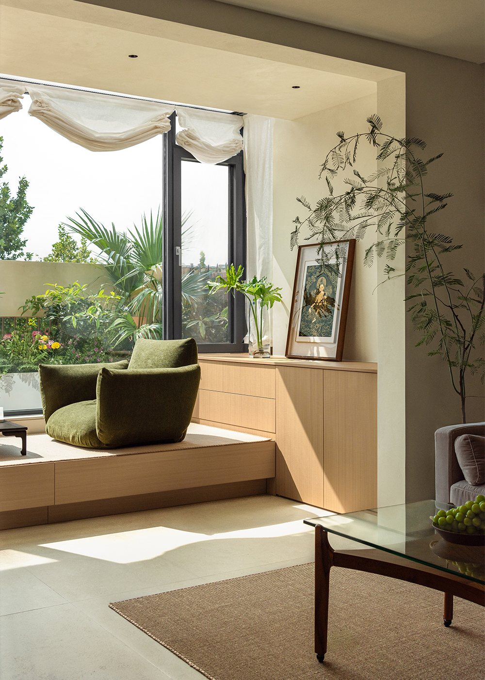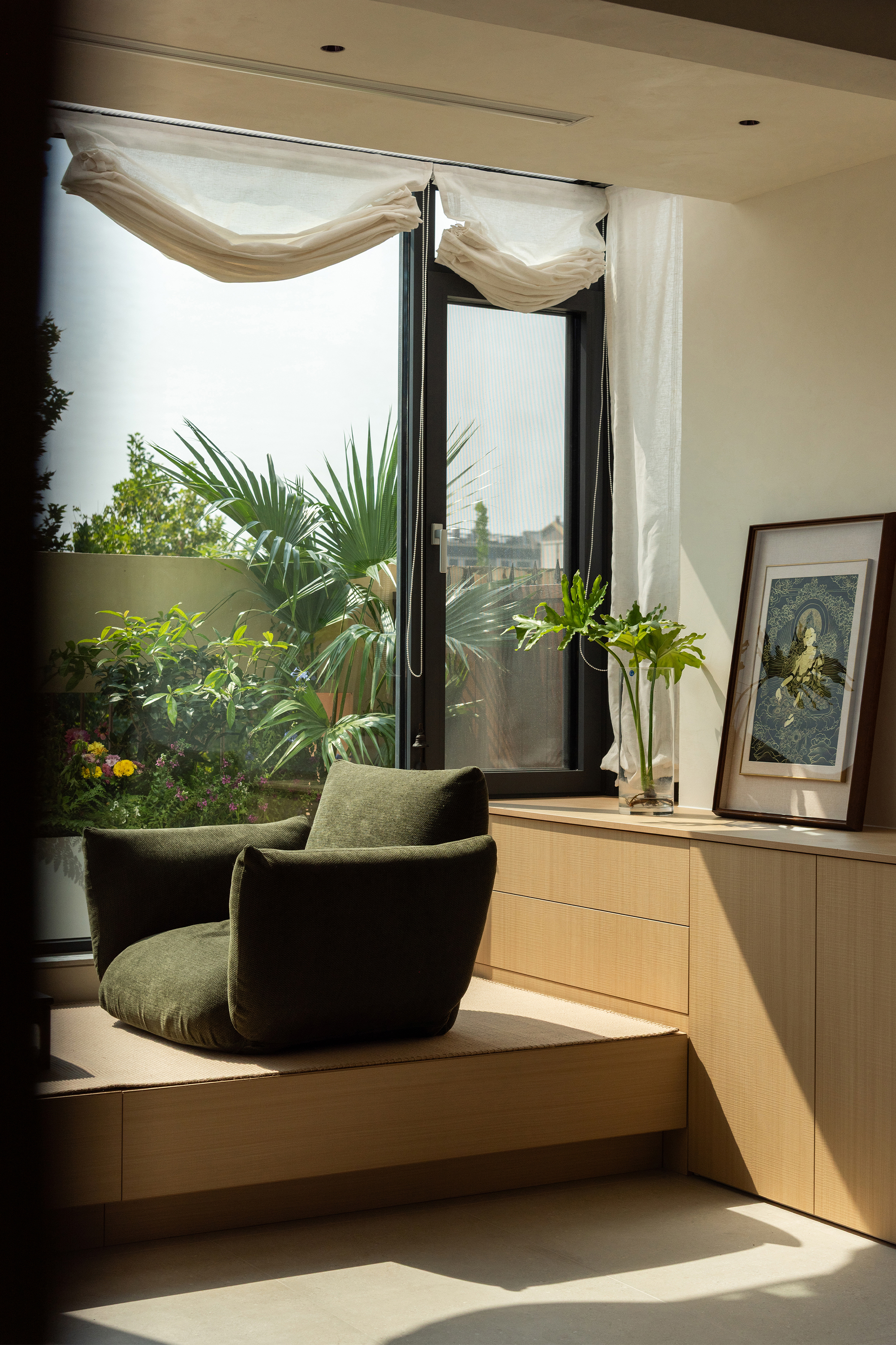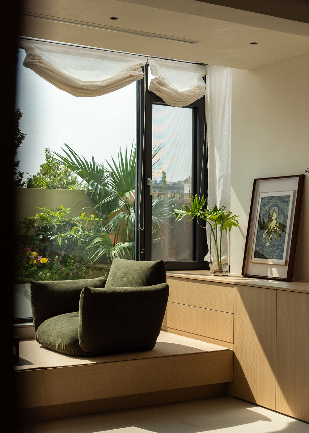 The terrace is not merely a place for rest, but an ecological extension of the home. Plants grow and change with the seasons, embedding time into architecture.From both the living room and bedroom, views extend toward the terrace, forming a dialogue of “a home within the landscape, and a landscape within the home.”