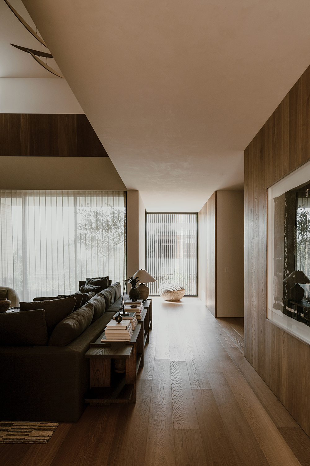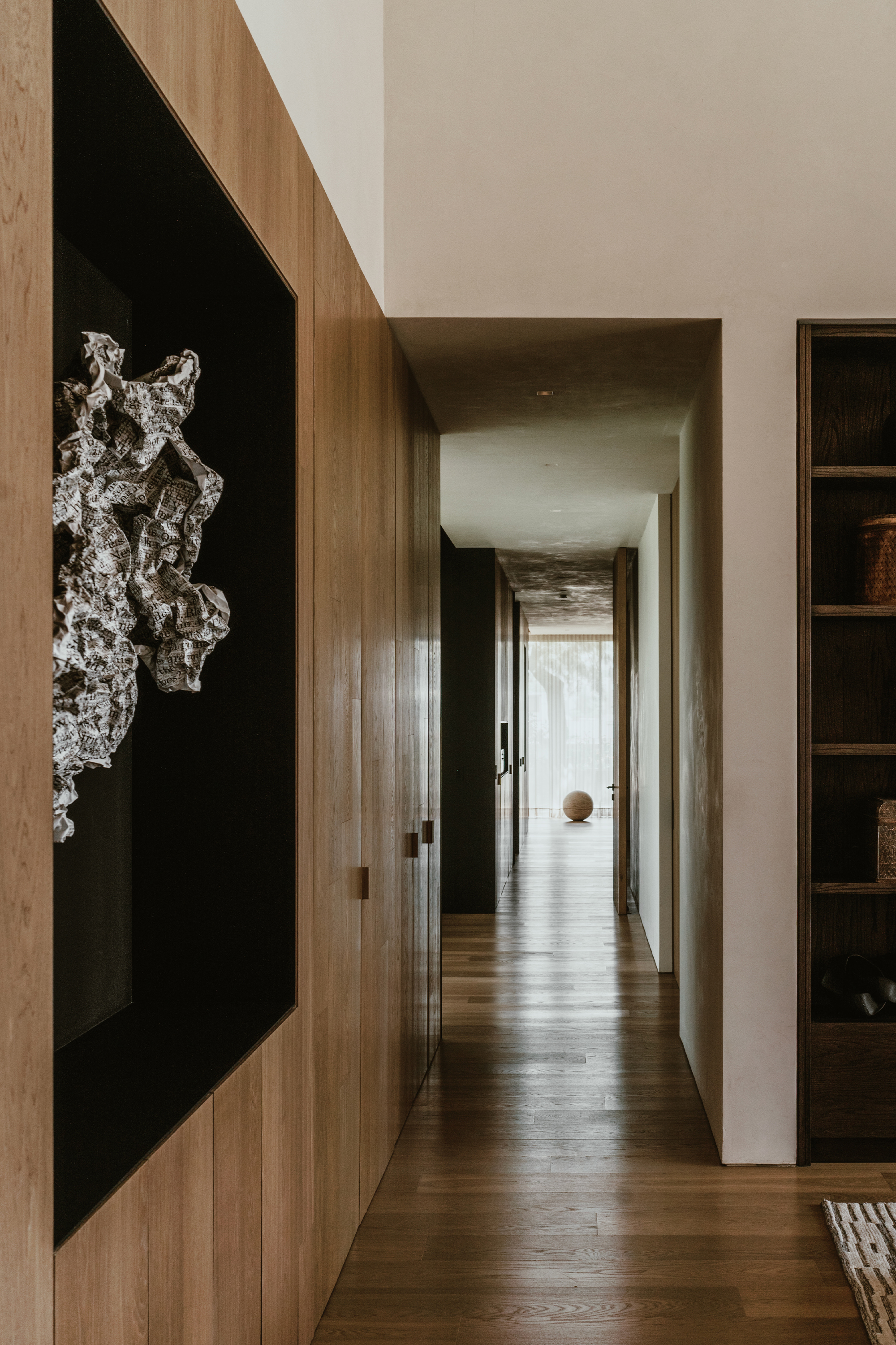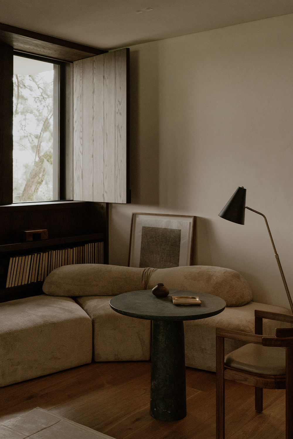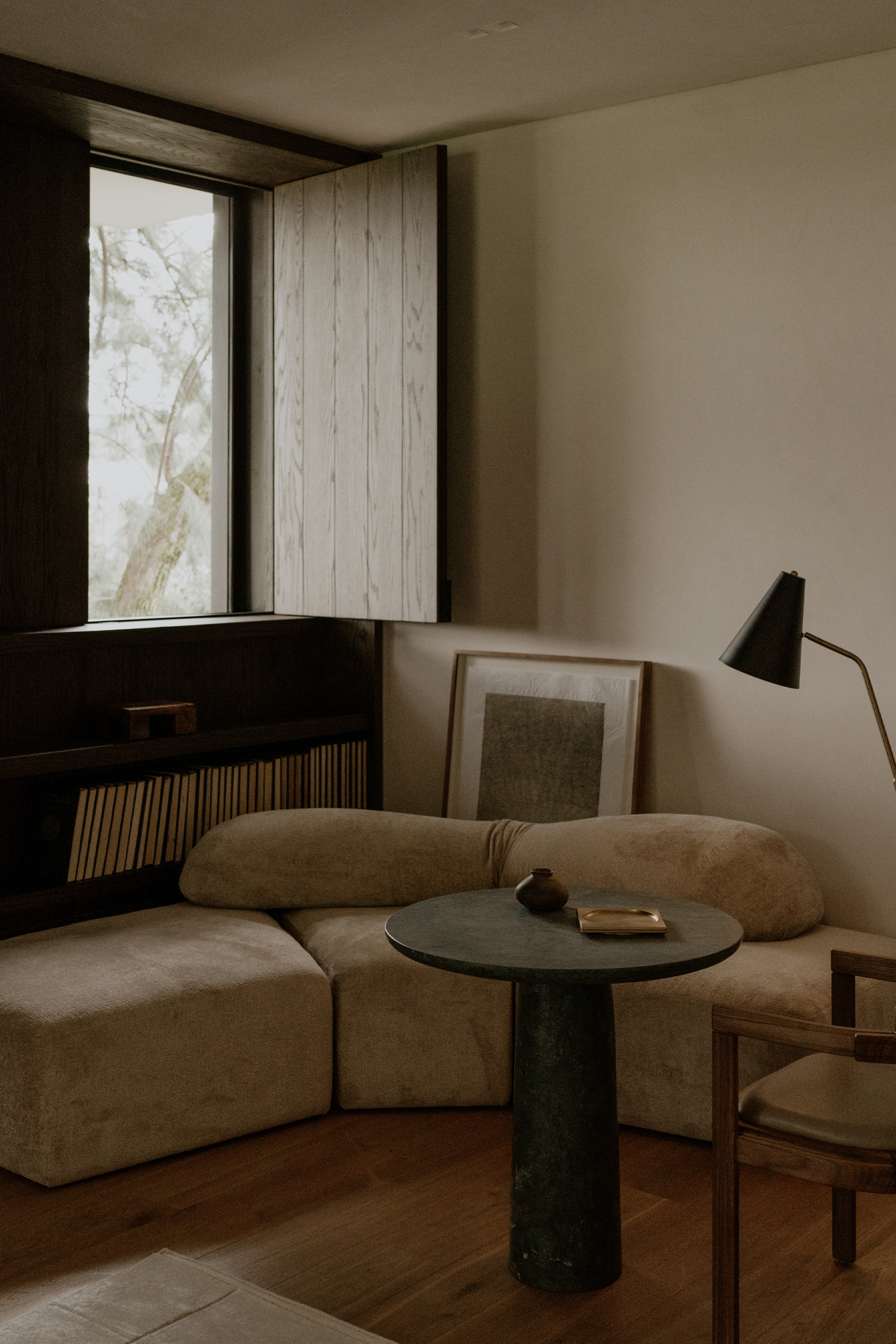 When asked about their favorite moment in Casa CO, the designers always think of dawn. The first light slips gently into the garden, and the house quietly absorbs it into its travertine surfaces. Moving through the vegetation in silence, each step feels like an invitation to live in natural harmony. As time unfolds, sunlight travels along the terrace, blurring the boundary between inside and outside, while dark shou sugi ban contrasts subtly with the warmth of noble woods. By afternoon, the light softens, enveloping the family spaces in tranquility and contemplation. Bedrooms become intimate sanctuaries, where the setting sun filters through curtains, casting gentle shadows. In this space, light not only shapes atmosphere, but also allows materiality to speak softly of time, land, and memory.