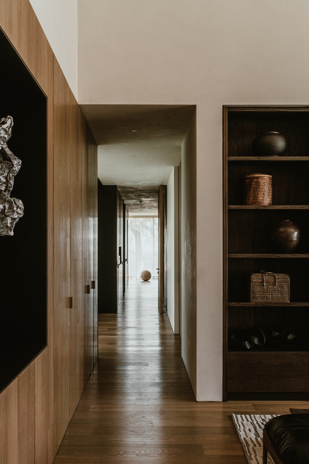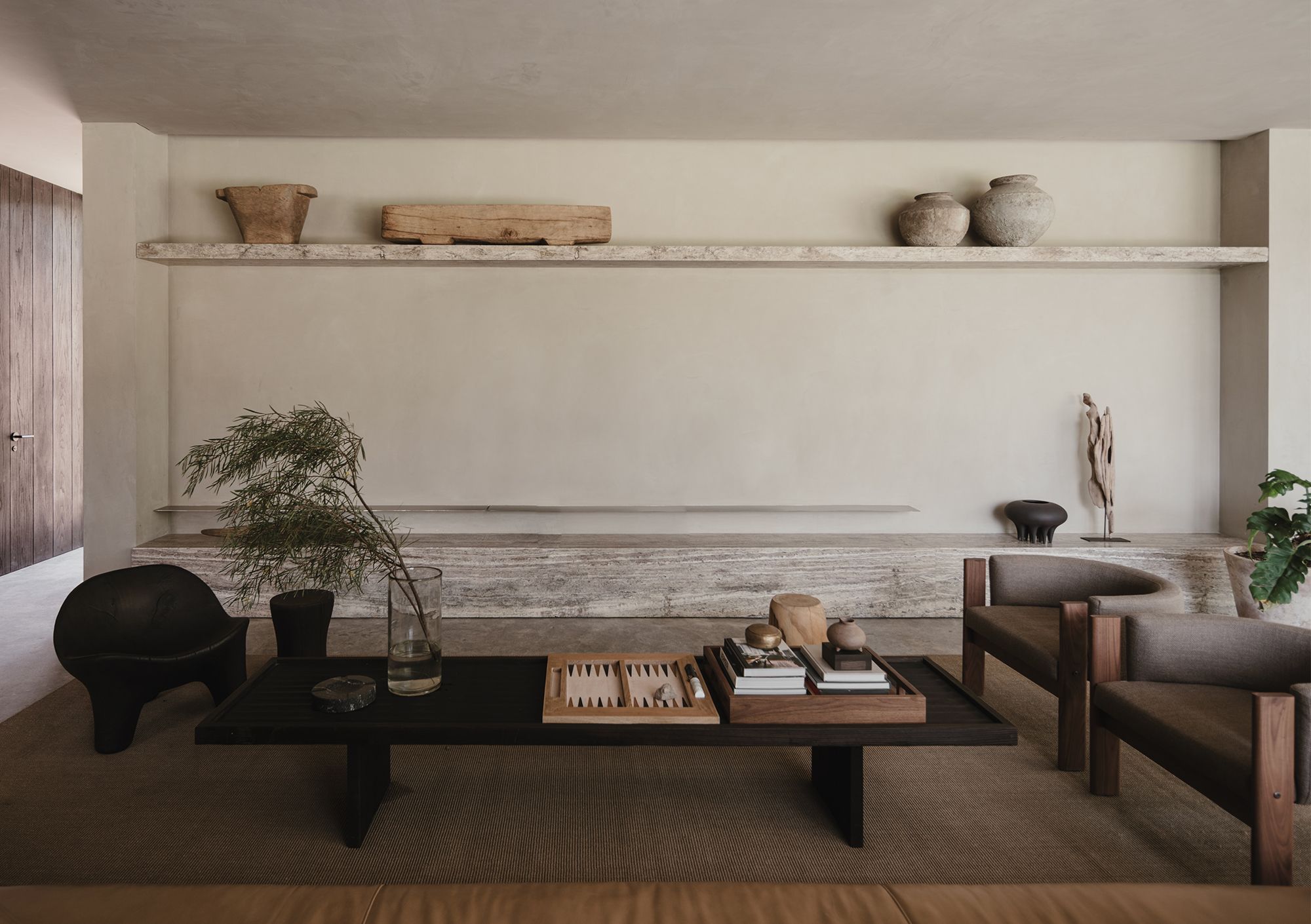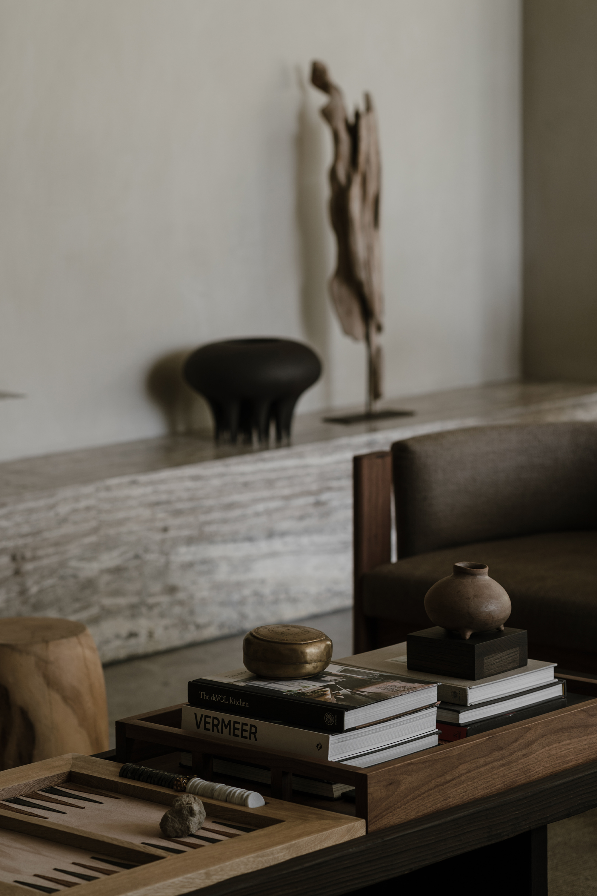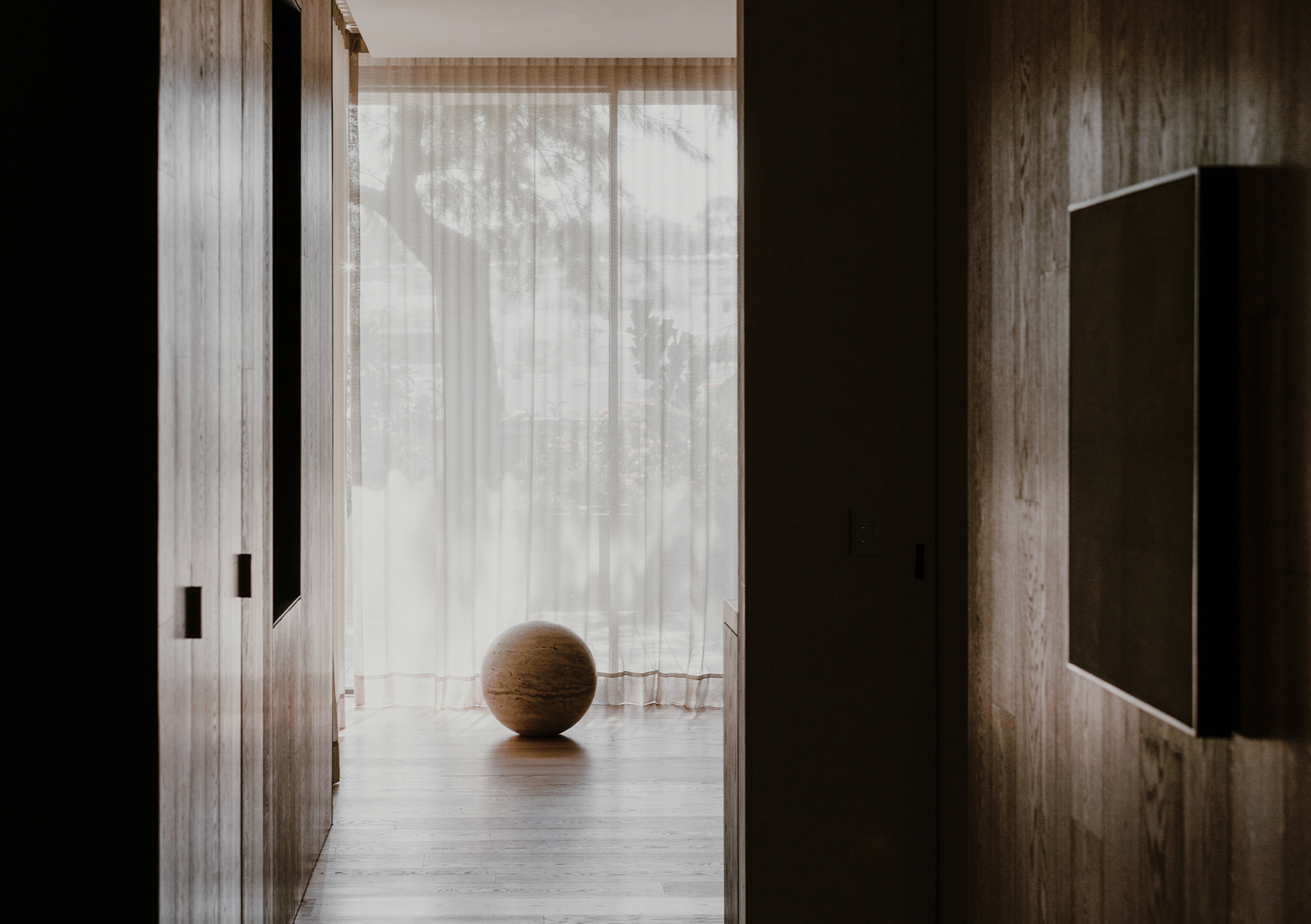 When asked about their favorite moment in Casa CO, the designers always think of dawn. The first light slips gently into the garden, and the house quietly absorbs it into its travertine surfaces. Moving through the vegetation in silence, each step feels like an invitation to live in natural harmony. As time unfolds, sunlight travels along the terrace, blurring the boundary between inside and outside, while dark shou sugi ban contrasts subtly with the warmth of noble woods. By afternoon, the light softens, enveloping the family spaces in tranquility and contemplation. Bedrooms become intimate sanctuaries, where the setting sun filters through curtains, casting gentle shadows. In this space, light not only shapes atmosphere, but also allows materiality to speak softly of time, land, and memory.