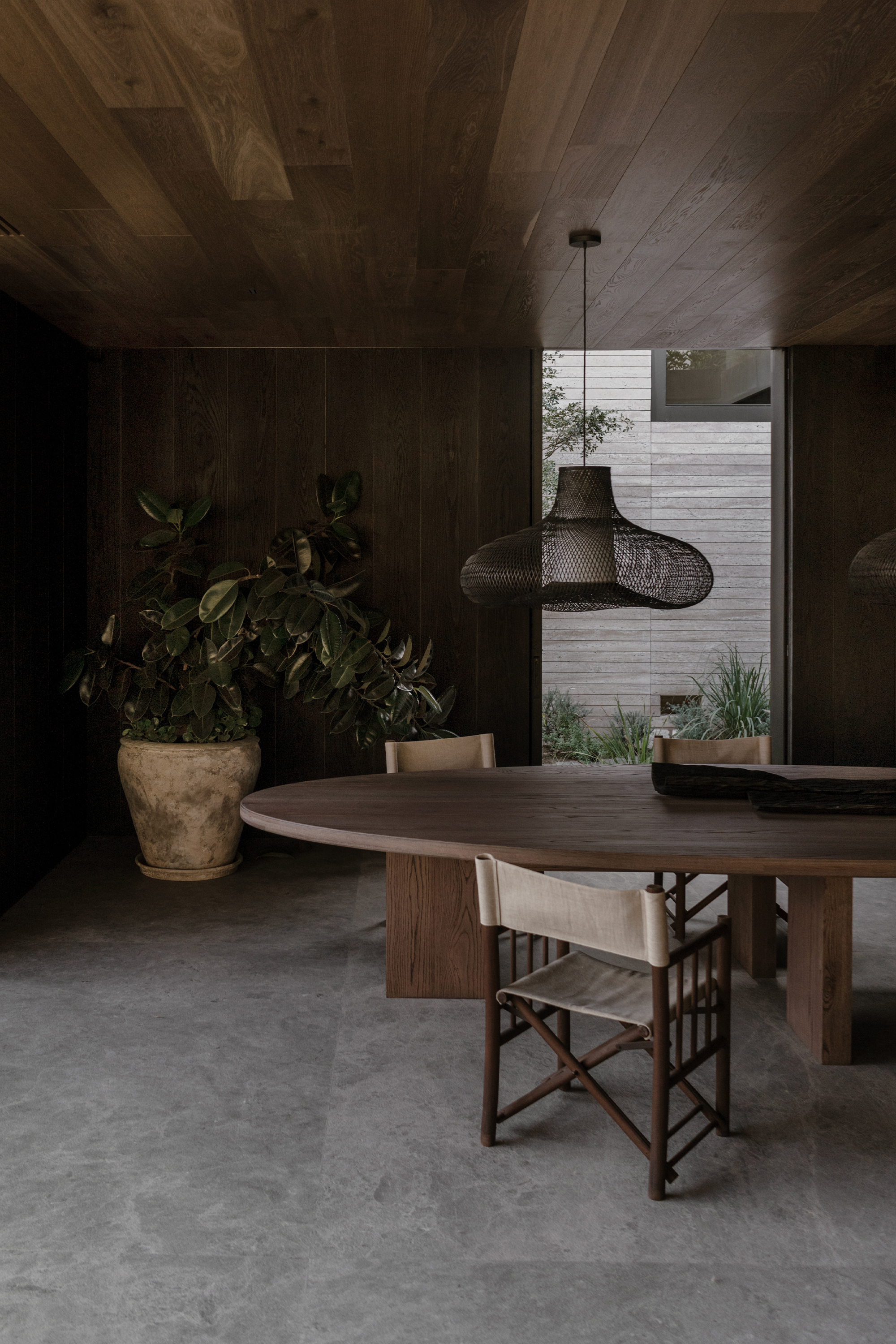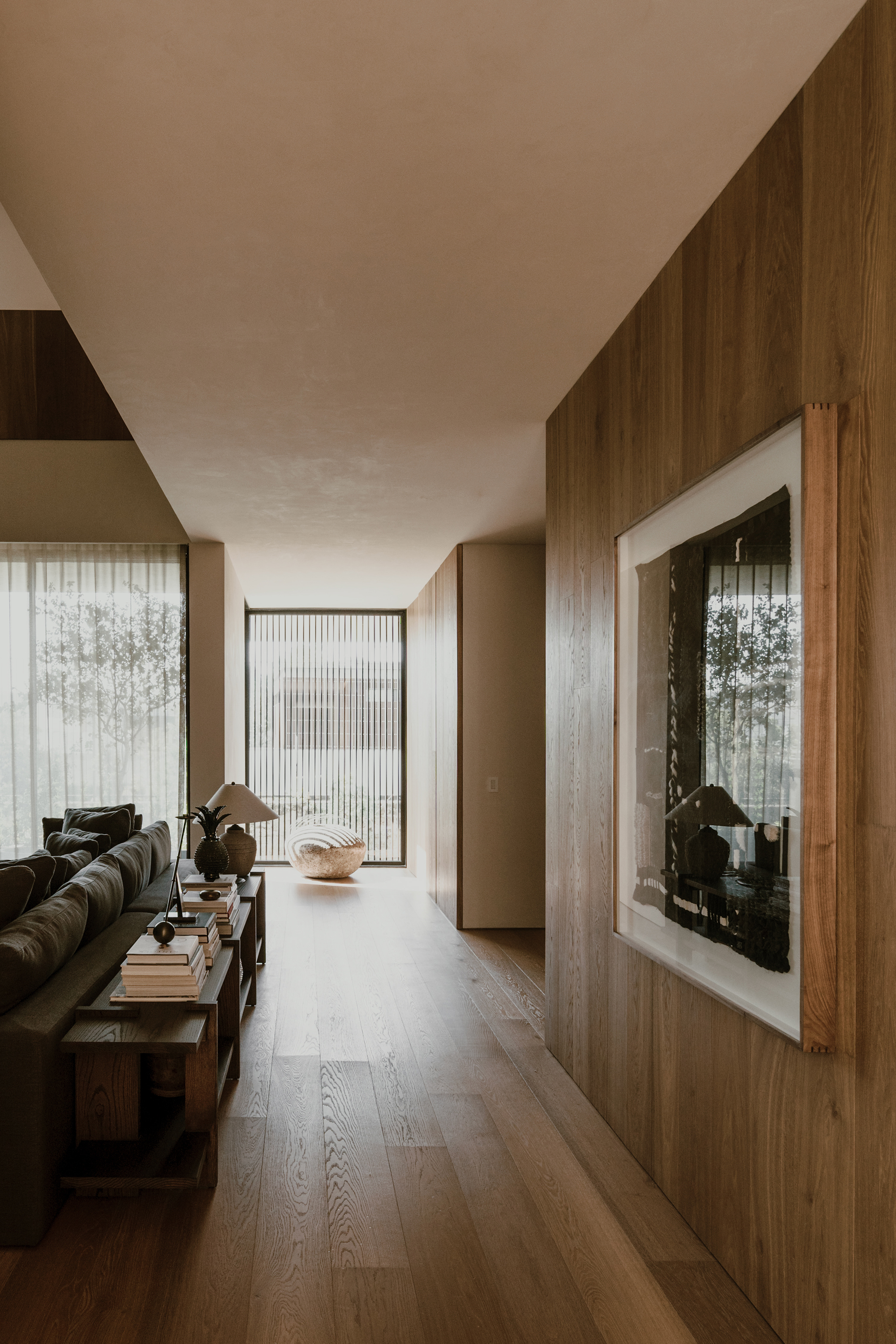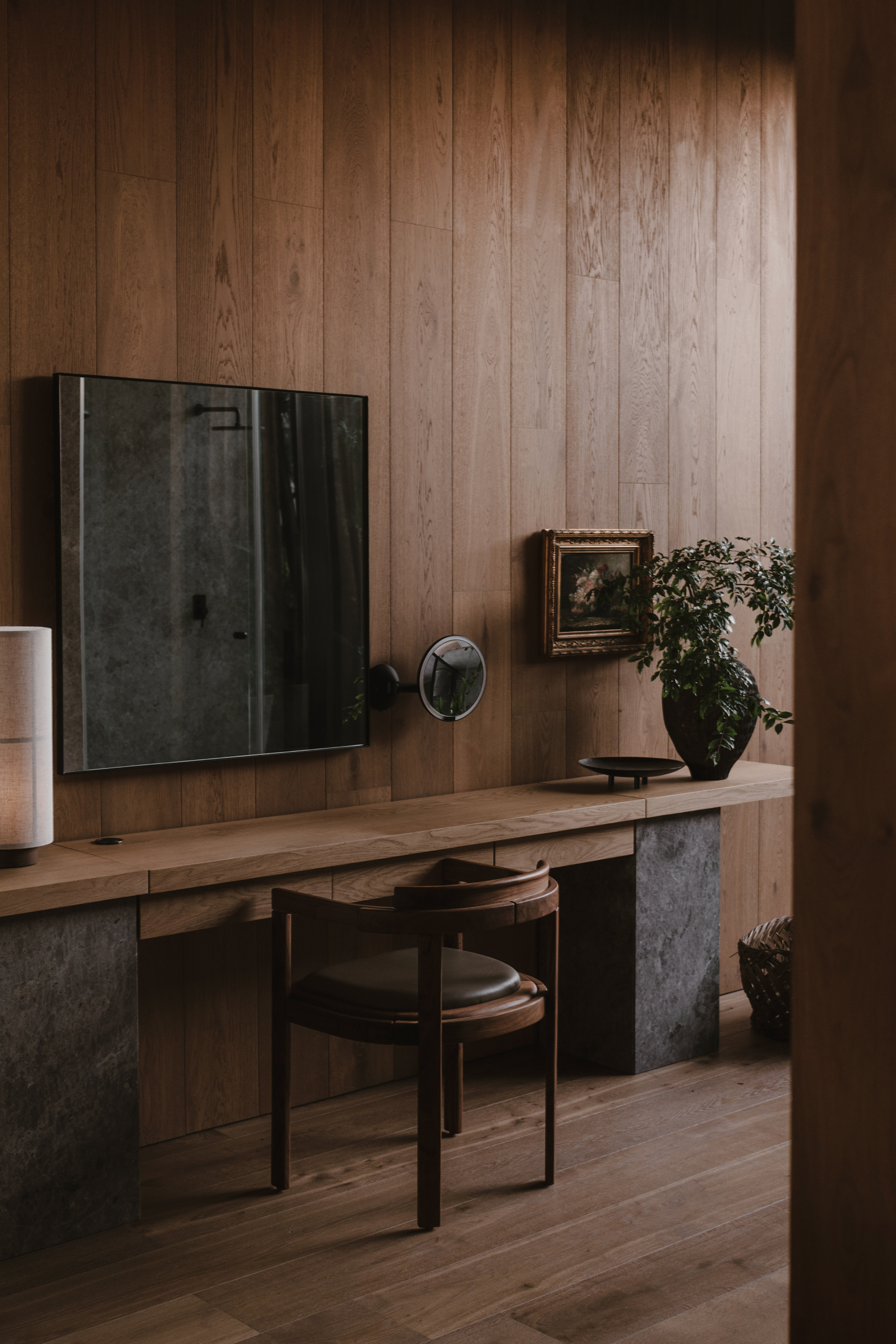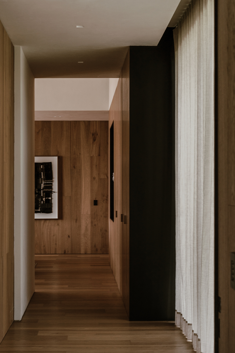 When asked about their favorite moment in Casa CO, the designers always think of dawn. The first light slips gently into the garden, and the house quietly absorbs it into its travertine surfaces. Moving through the vegetation in silence, each step feels like an invitation to live in natural harmony. As time unfolds, sunlight travels along the terrace, blurring the boundary between inside and outside, while dark shou sugi ban contrasts subtly with the warmth of noble woods. By afternoon, the light softens, enveloping the family spaces in tranquility and contemplation. Bedrooms become intimate sanctuaries, where the setting sun filters through curtains, casting gentle shadows. In this space, light not only shapes atmosphere, but also allows materiality to speak softly of time, land, and memory.