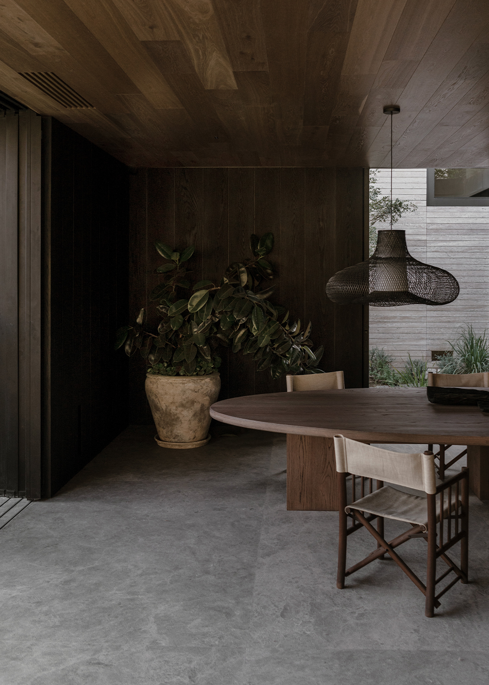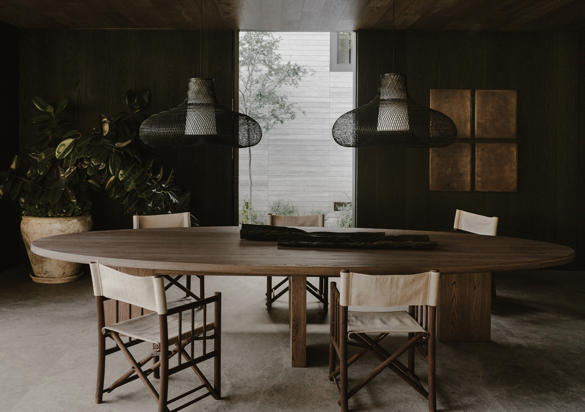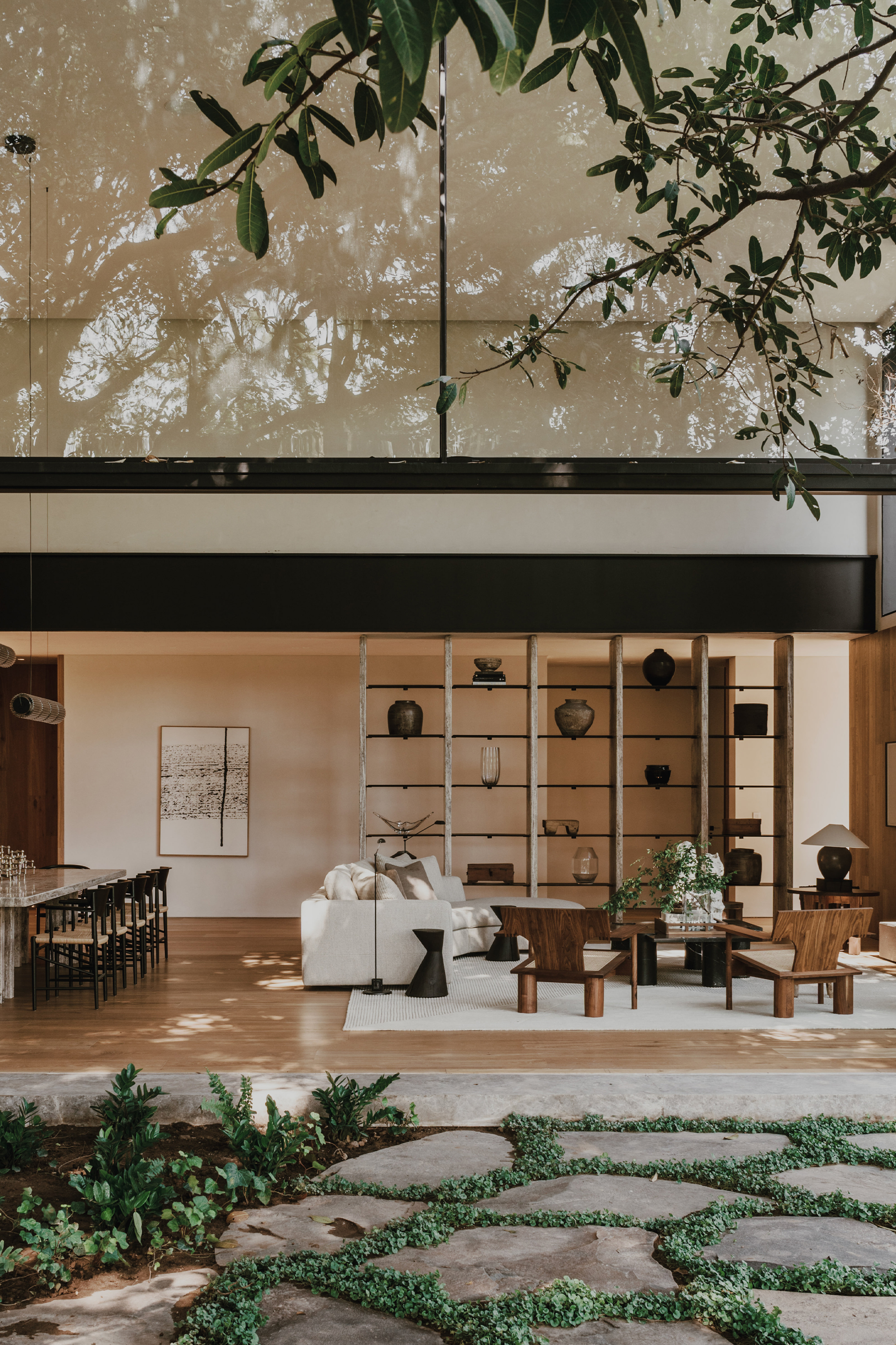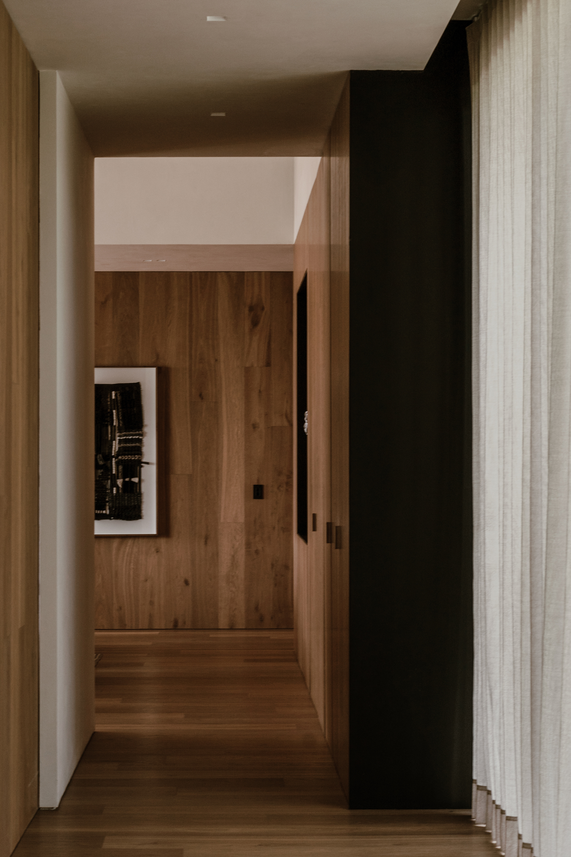 When asked about their favorite moment in Casa CO, the designers always think of dawn. The first light slips gently into the garden, and the house quietly absorbs it into its travertine surfaces. Moving through the vegetation in silence, each step feels like an invitation to live in natural harmony. As time unfolds, sunlight travels along the terrace, blurring the boundary between inside and outside, while dark shou sugi ban contrasts subtly with the warmth of noble woods. By afternoon, the light softens, enveloping the family spaces in tranquility and contemplation. Bedrooms become intimate sanctuaries, where the setting sun filters through curtains, casting gentle shadows. In this space, light not only shapes atmosphere, but also allows materiality to speak softly of time, land, and memory.