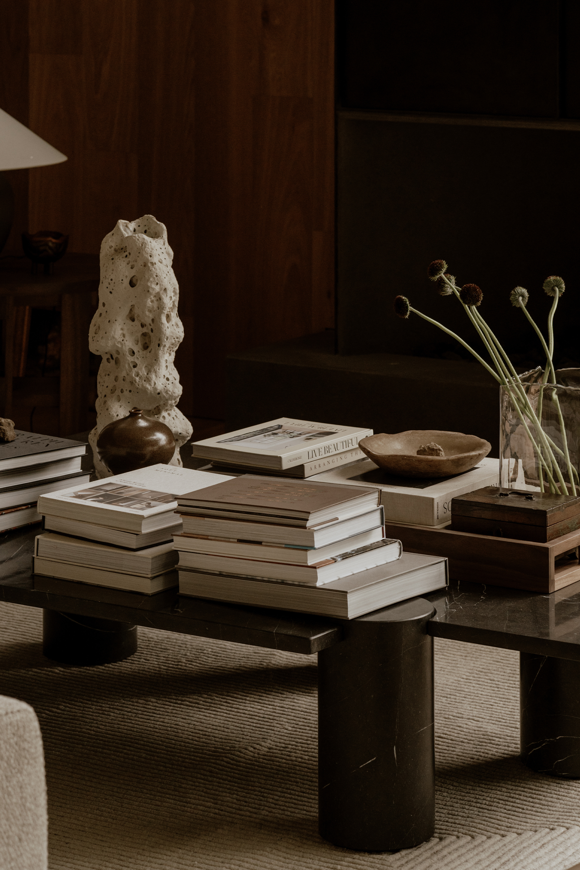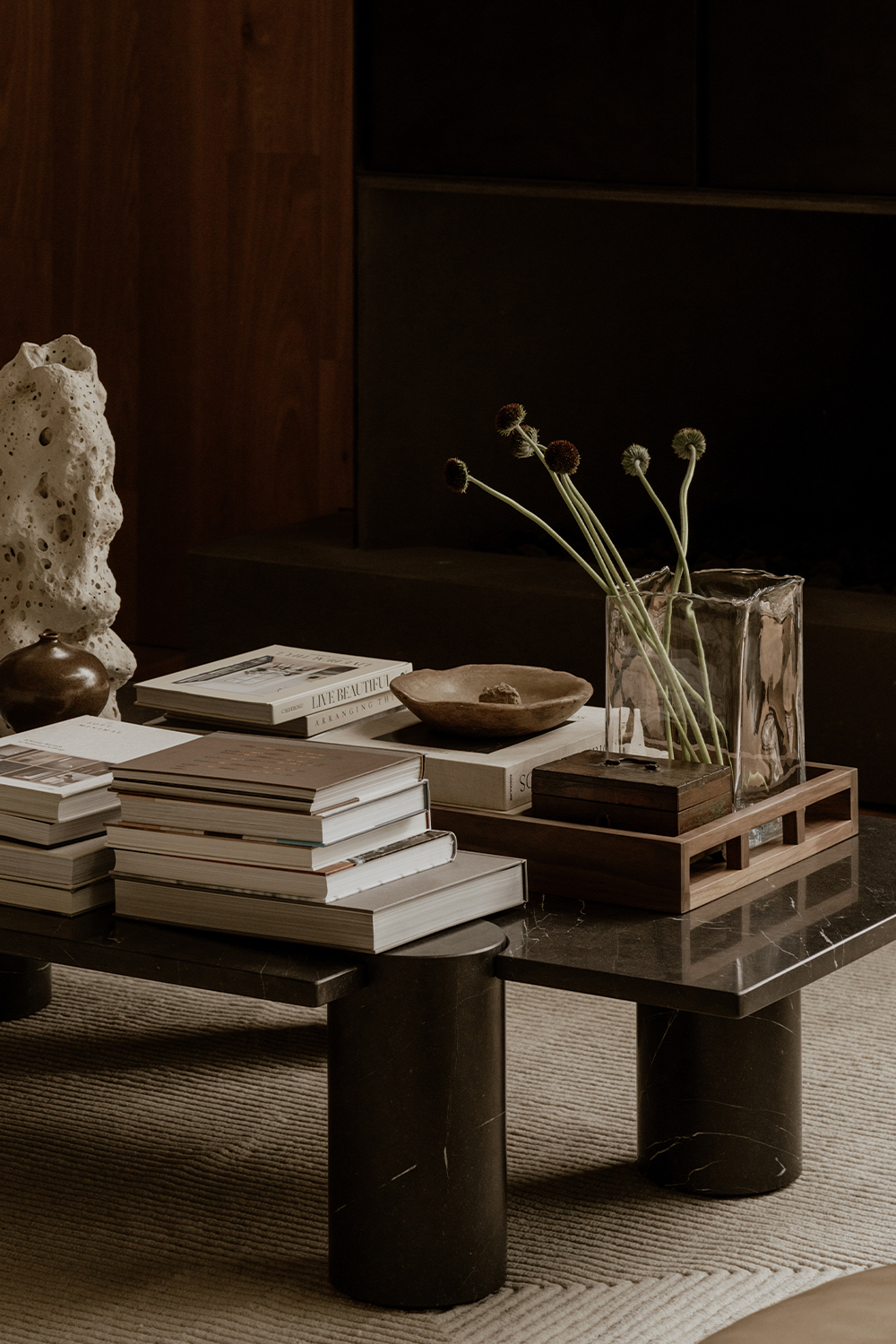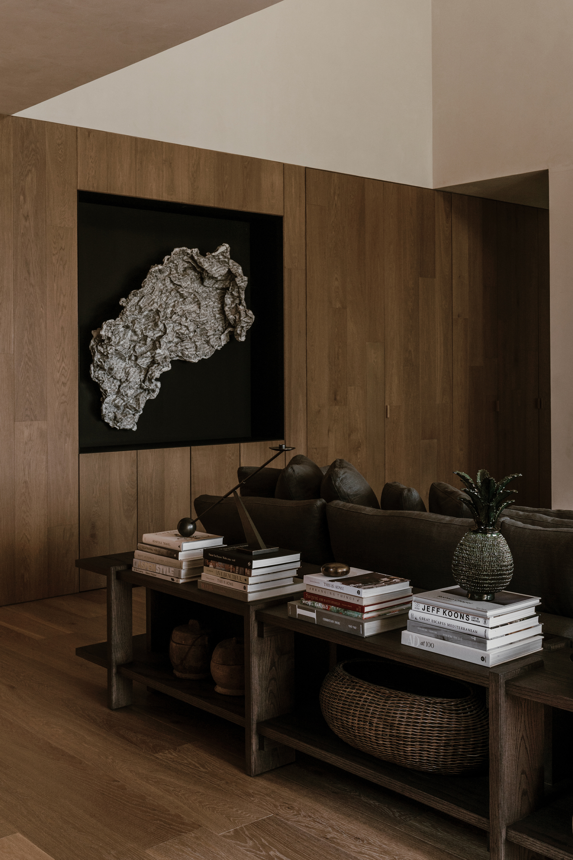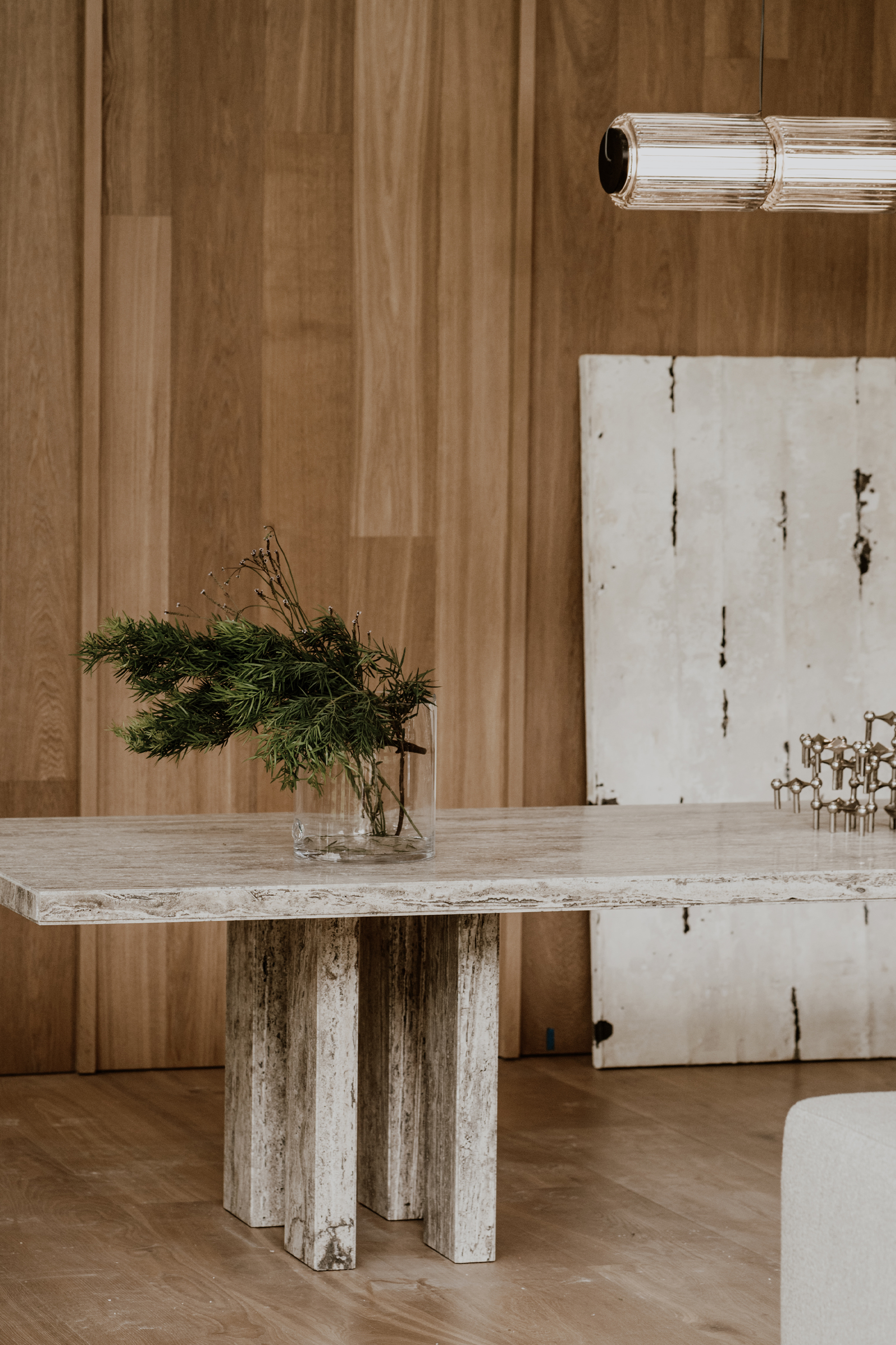 The house also features a number of custom-designed elements: a bookshelf, a six-meter-high steel fireplace, a travertine dining table for twelve people, and a work by a local artist positioned as a centerpiece upon entering the home. Rather than viewing these elements as individual objects, the studio understands them as part of a broader setting—one in which all custom-designed components resonate with one another, collectively telling the story of Casa CO.