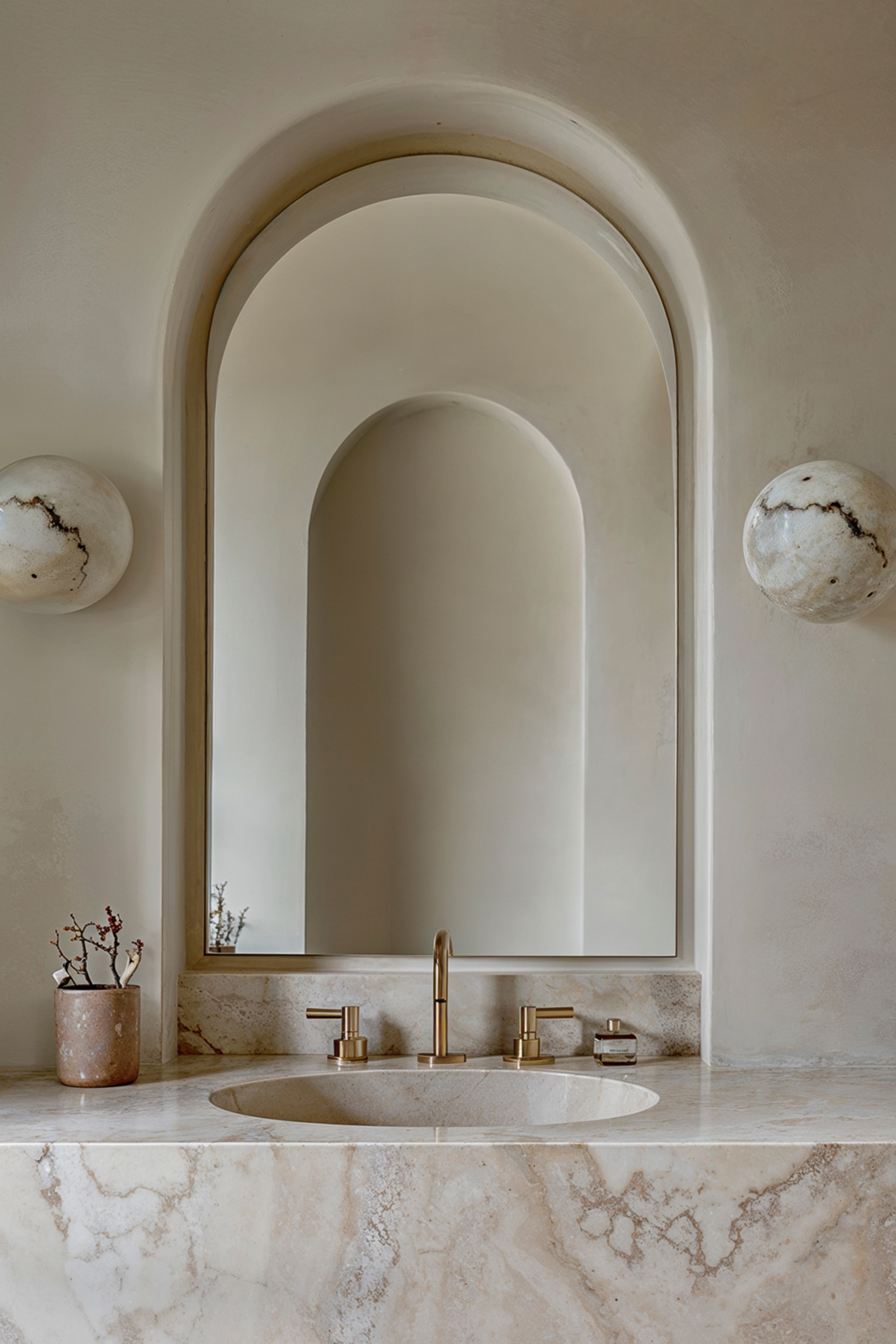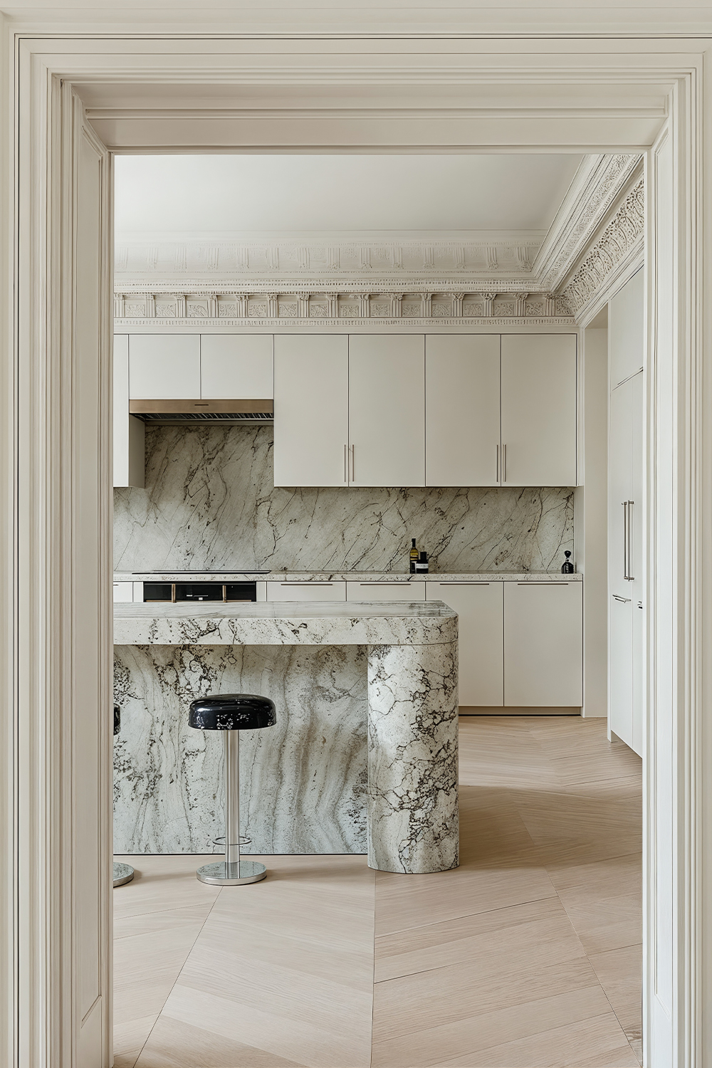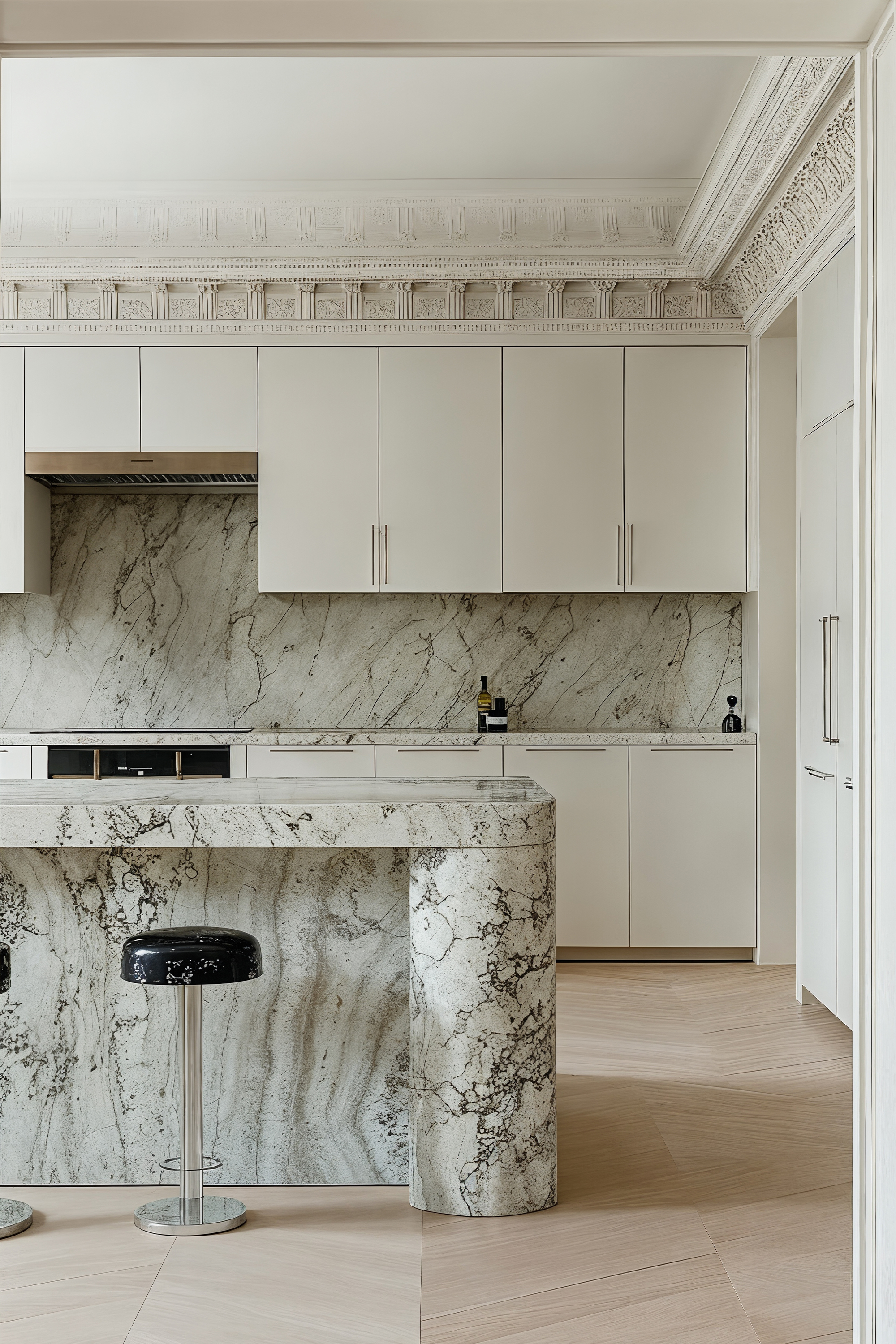 The kitchen is the first true moment of surprise. A veined stone island, rounded and monumental, acts as a sculptural anchor. Soft cabinetry hovers above, allowing the marble to take center stage. The effect is clean, calm, and quietly luxurious.