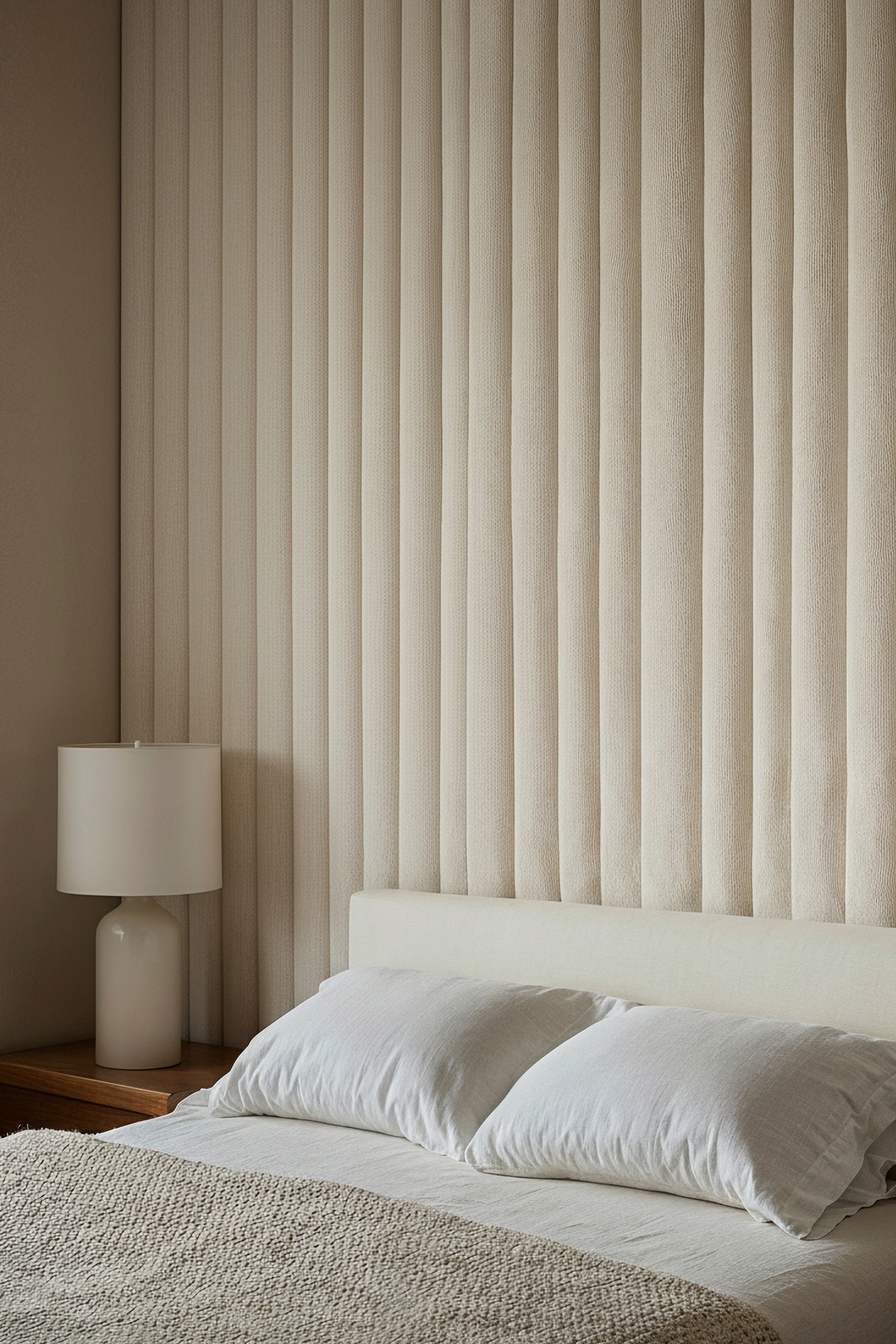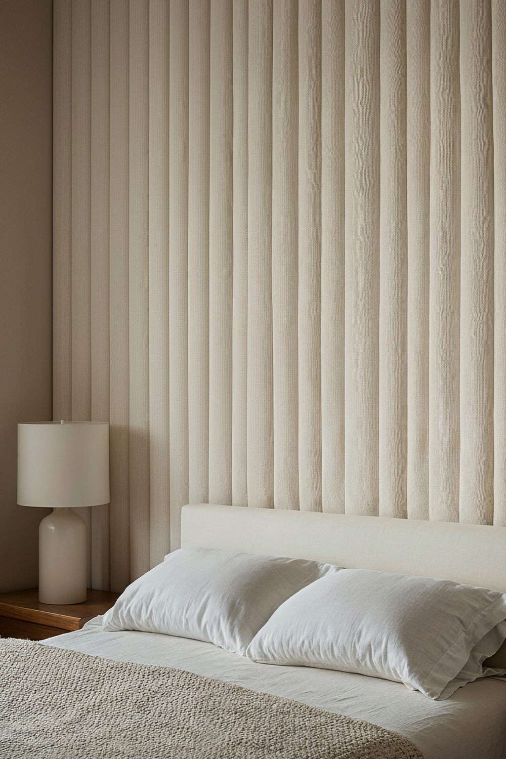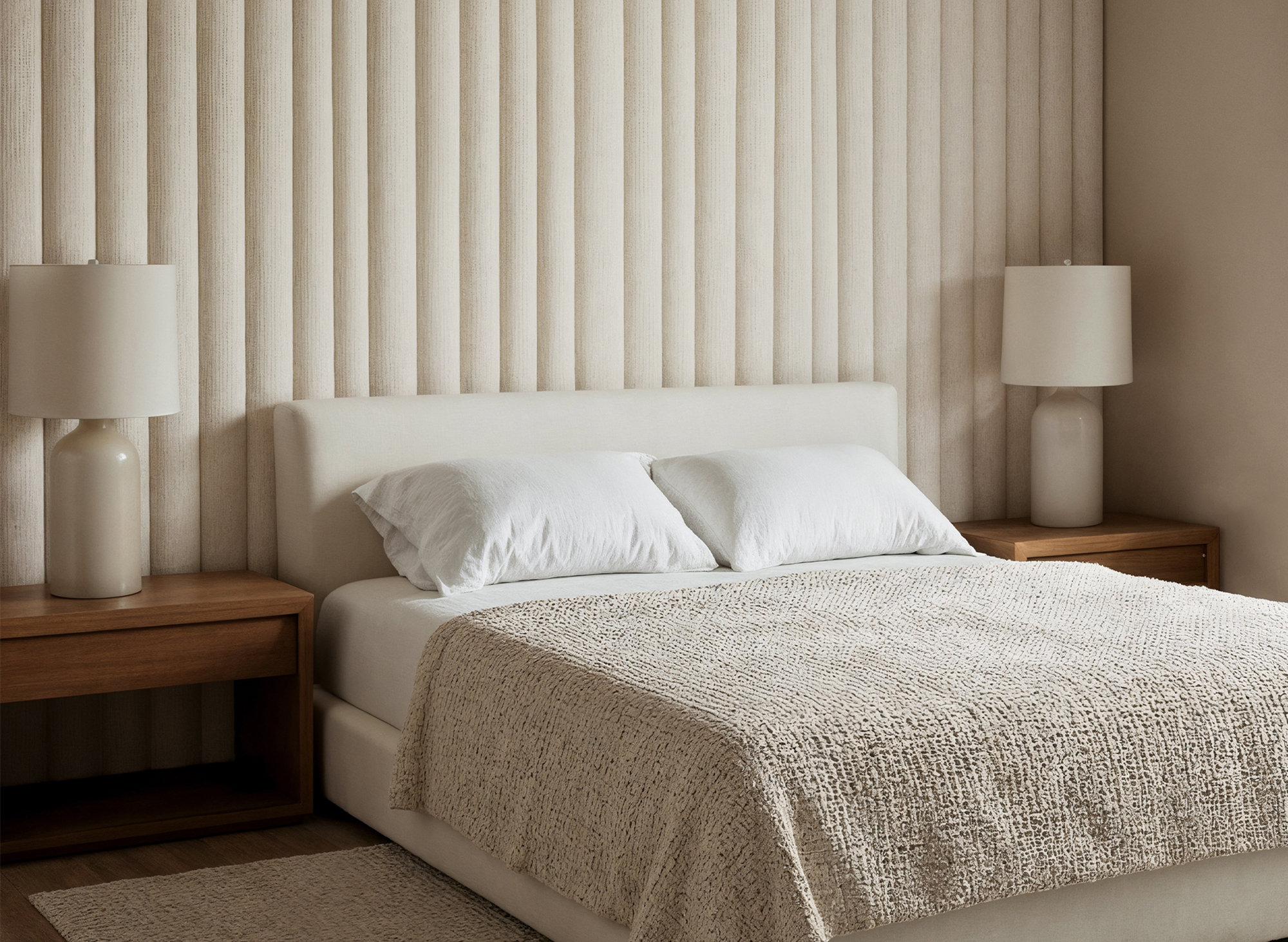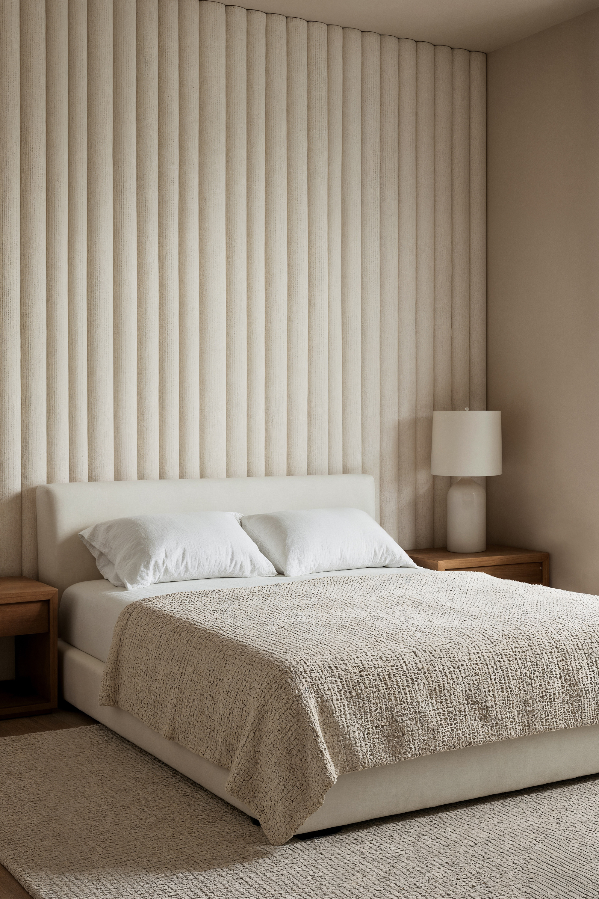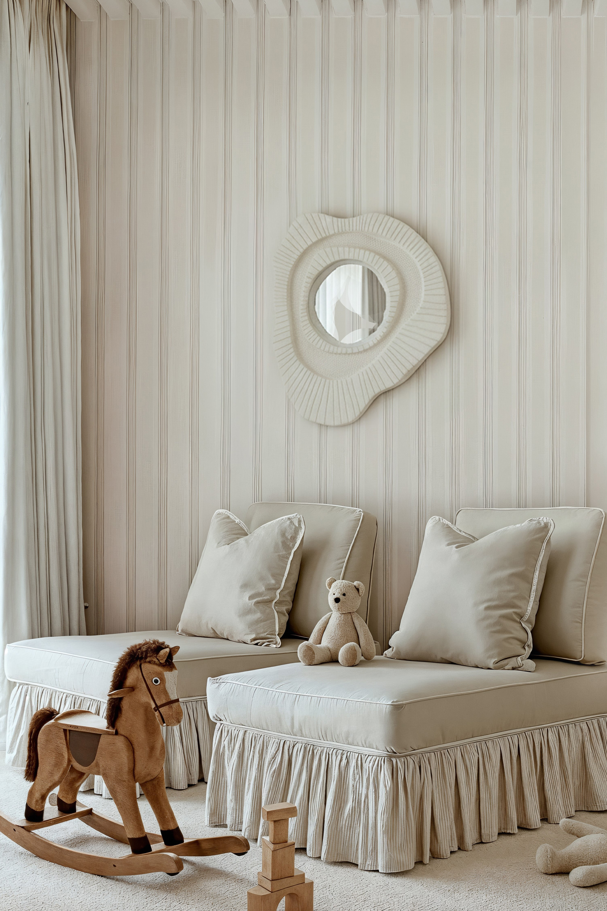 The primary bedroom introduces vertical fluted fabric, creating a gentle rhythm along the wall. Layered neutrals, stone lamps, and tactile textiles give the space a cocoon-like stillness. Curved stone vanities, alabaster sconces, slipcovered chairs in the children’s room, and a beautifully restored staircase add character without disturbing the calm. Each detail feels purposeful, reinforcing the home’s palette and timeless sensibility.