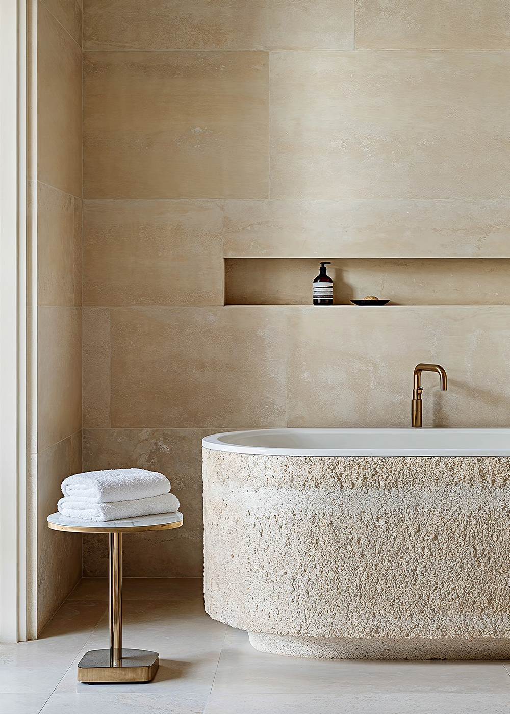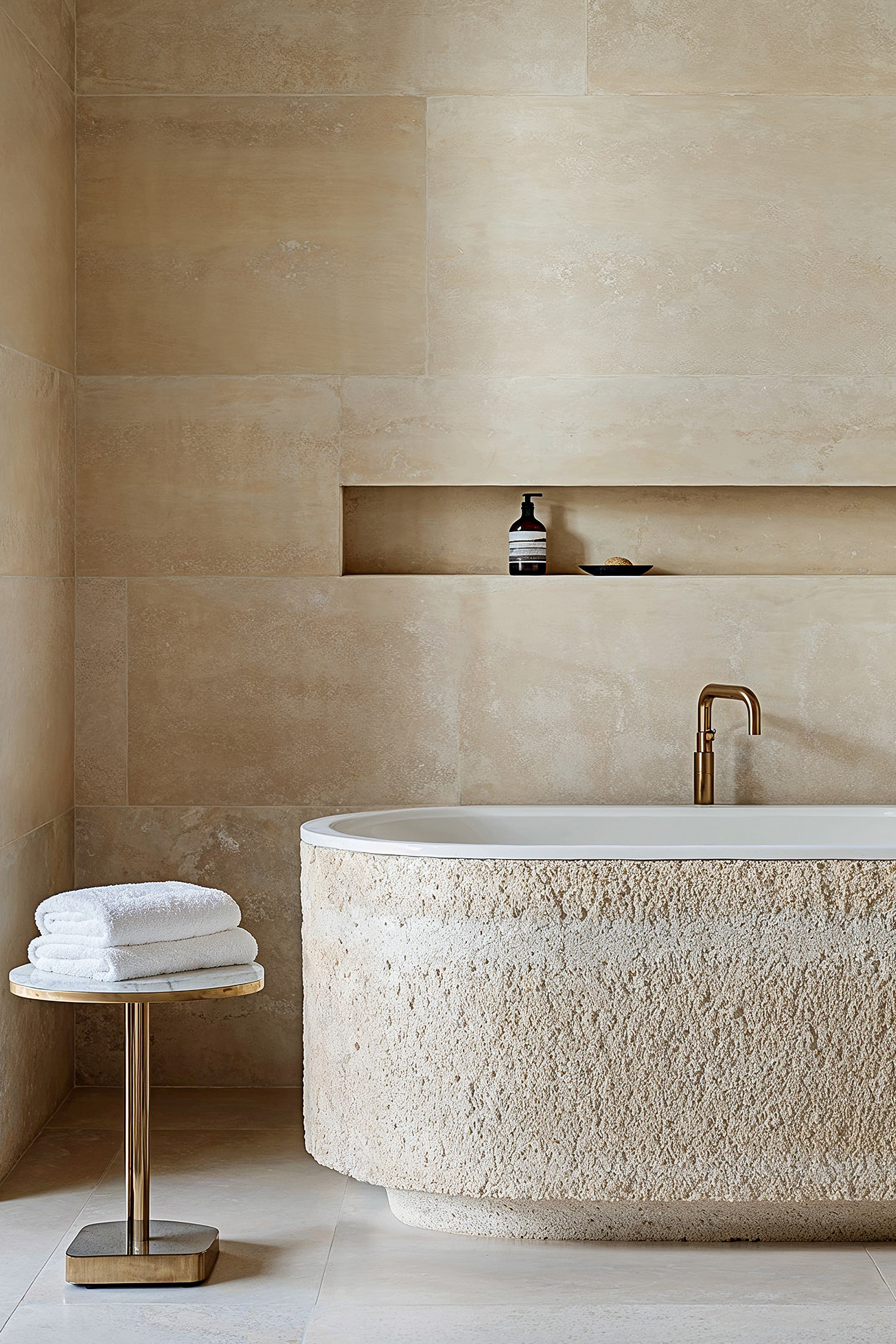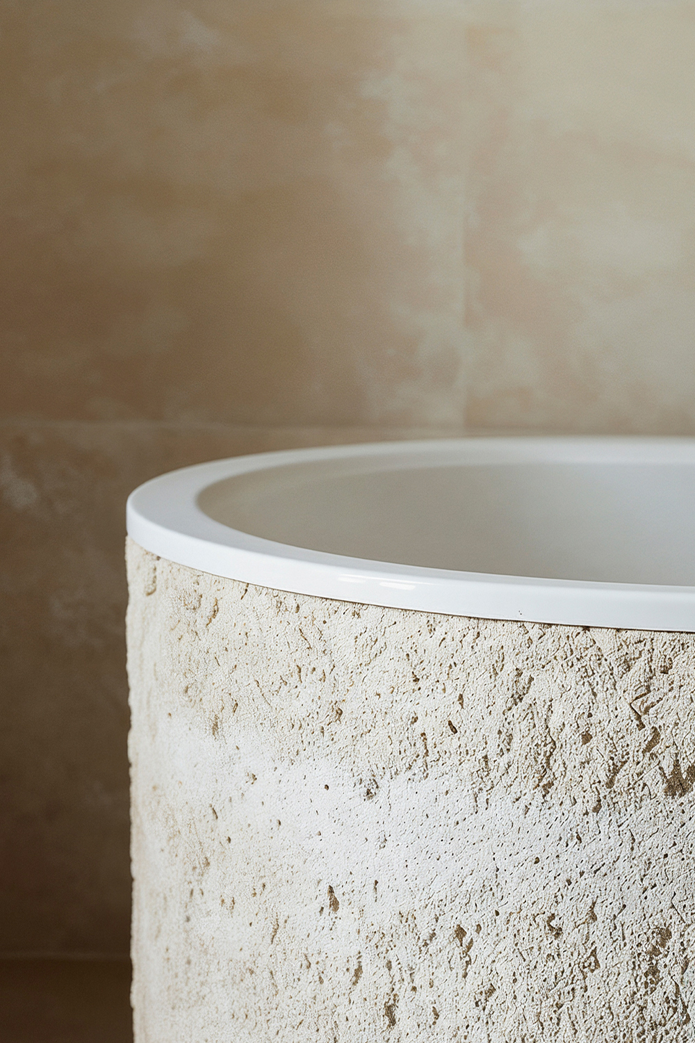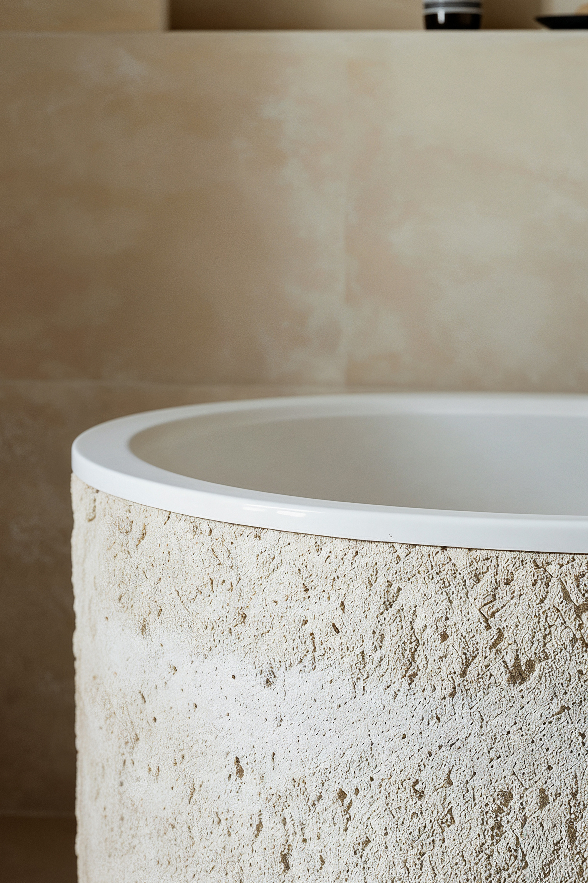 The primary bathroom continues this language of texture and calm. A freestanding tub with a rough stone exterior sits in a room wrapped in warm, sandy tones. Natural light sets the surfaces aglow, revealing the subtle life within the materials.