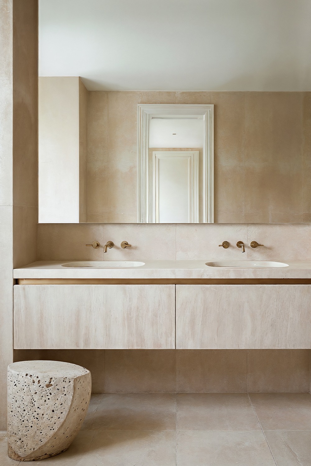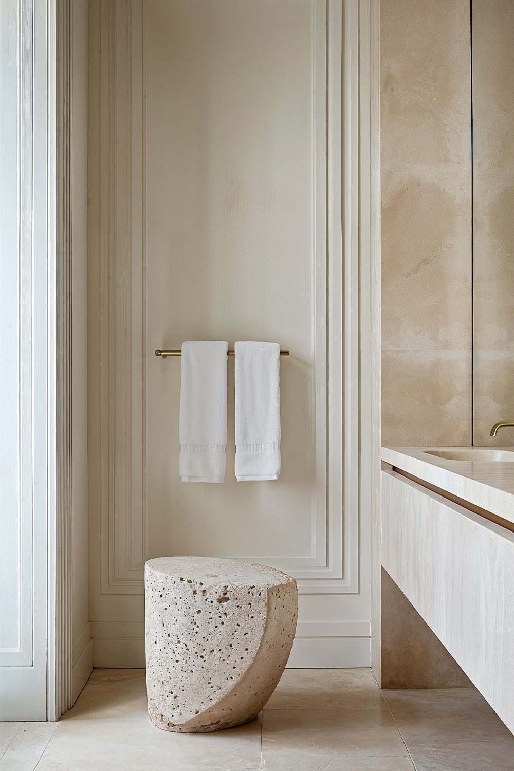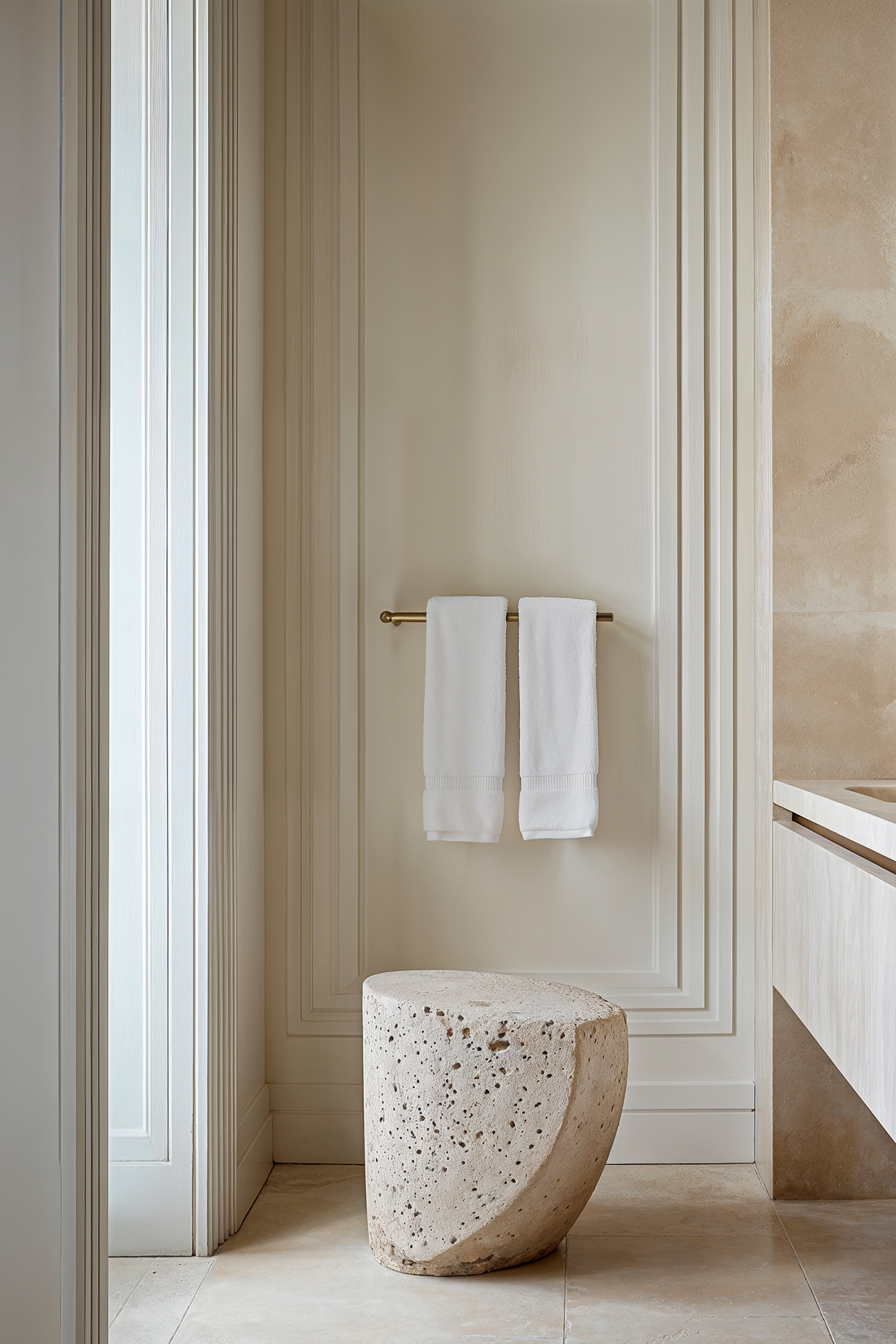 The primary bathroom continues this language of texture and calm. A freestanding tub with a rough stone exterior sits in a room wrapped in warm, sandy tones. Natural light sets the surfaces aglow, revealing the subtle life within the materials.