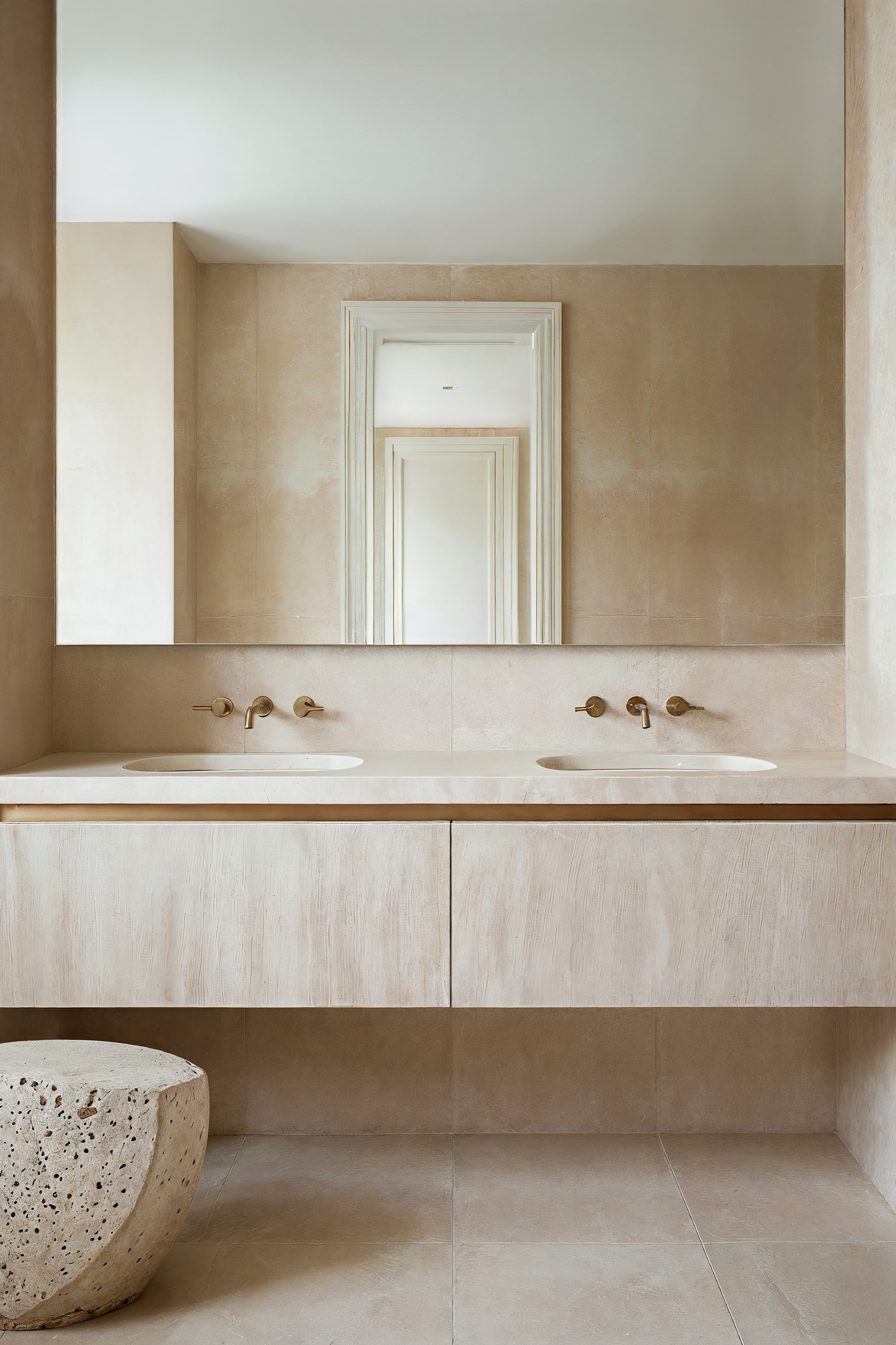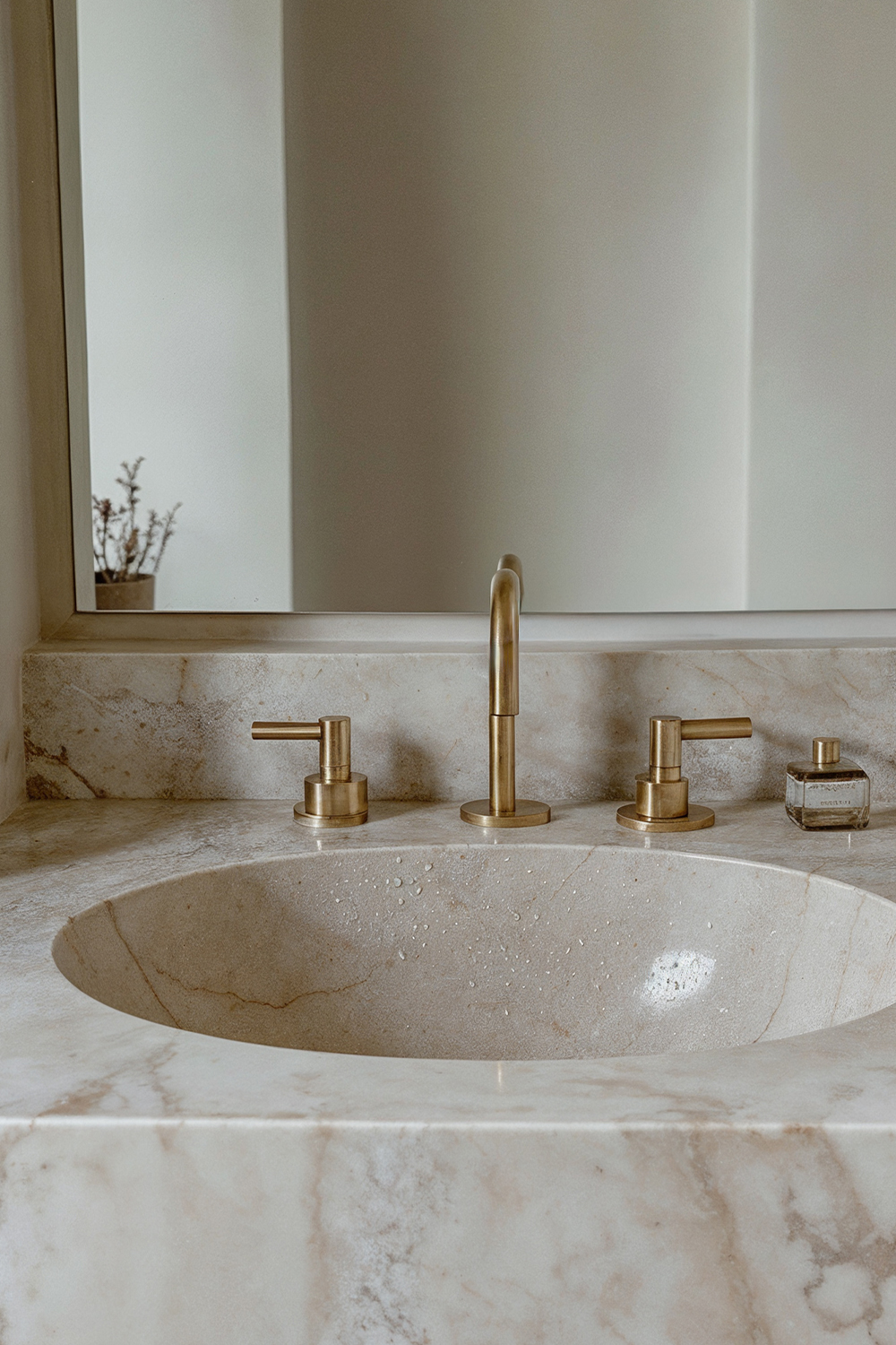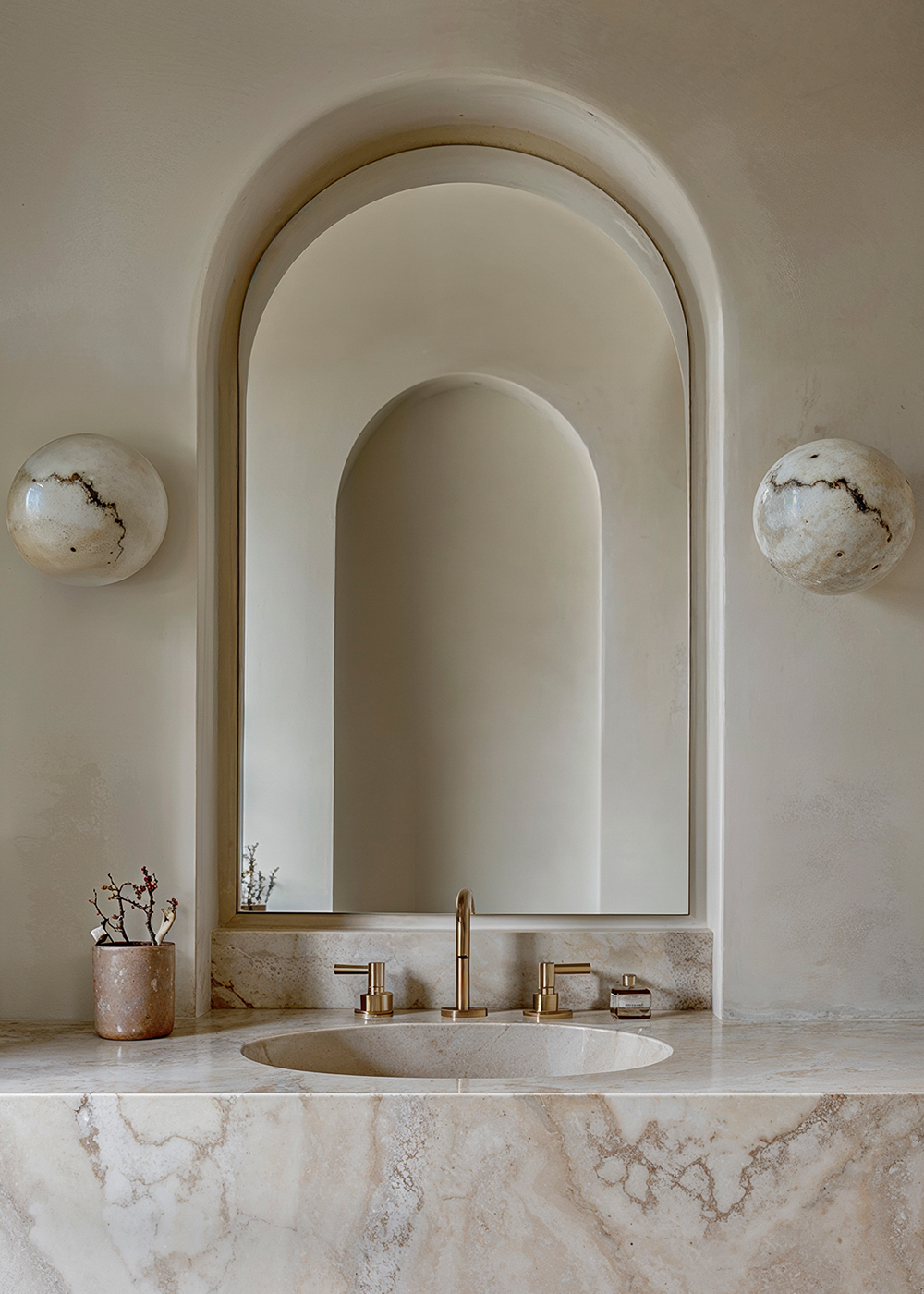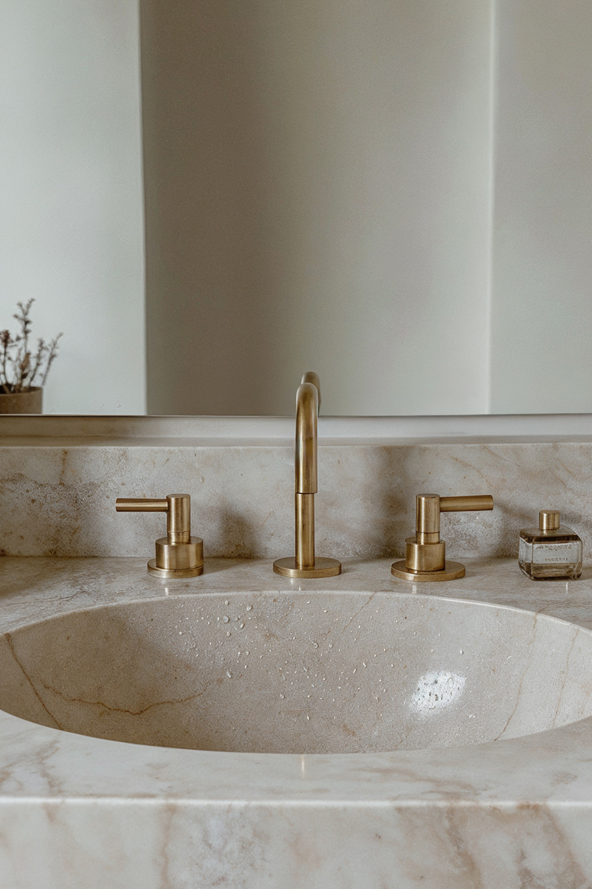 The primary bathroom continues this language of texture and calm. A freestanding tub with a rough stone exterior sits in a room wrapped in warm, sandy tones. Natural light sets the surfaces aglow, revealing the subtle life within the materials.