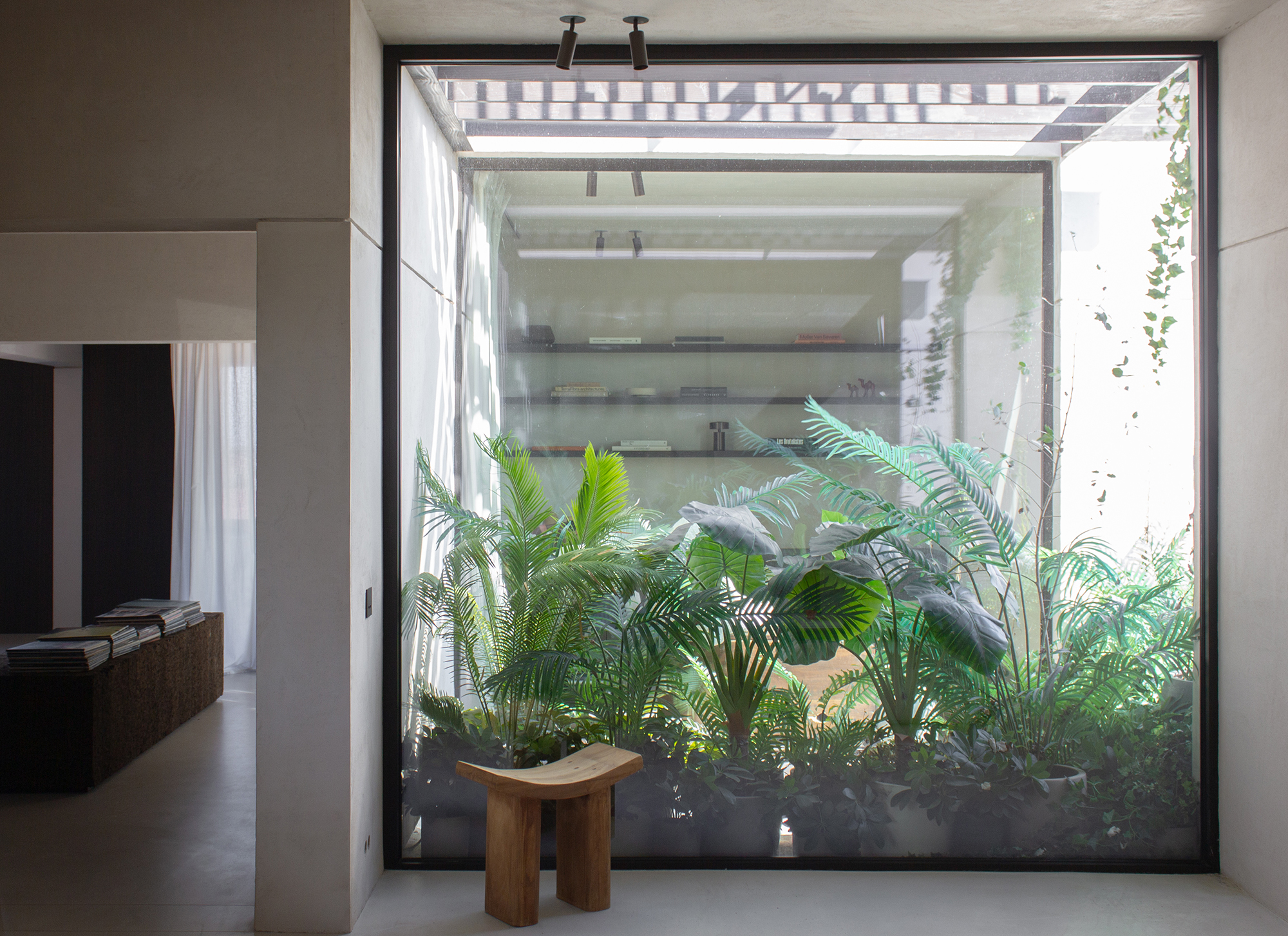 The second improvement , an old, narrow outdoor space,traditionally used to store rubbish,was transformed intoa green patio. Here, too, glass wallswere provided, maximizingnatural lightin the adjacent rooms. The patio was enriched with a variety of tall, wild plants, creating a lush, green oasis within the penthouse. This addition provides both tranquility and privacy while maintaining visual connectionbetween different spaces.