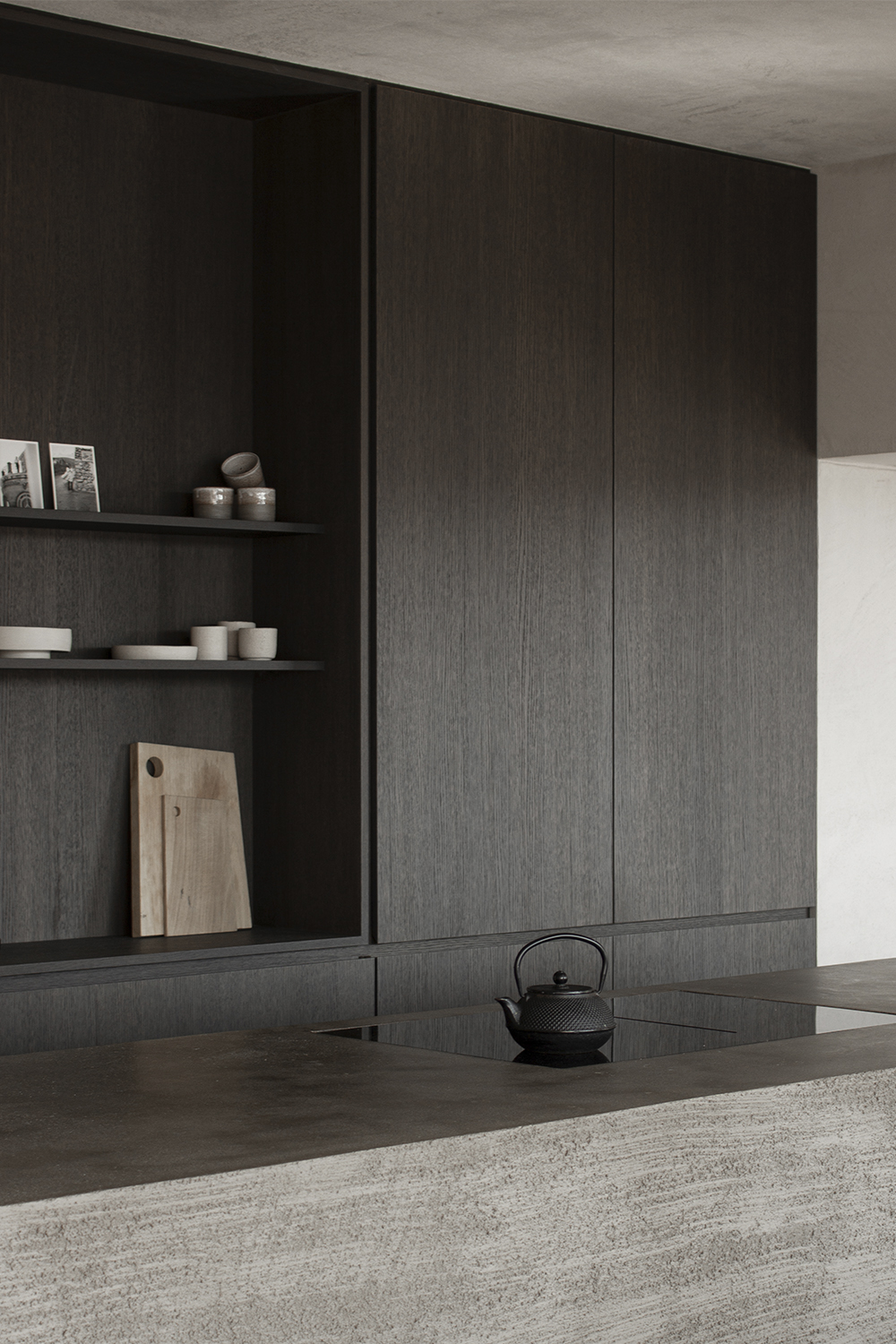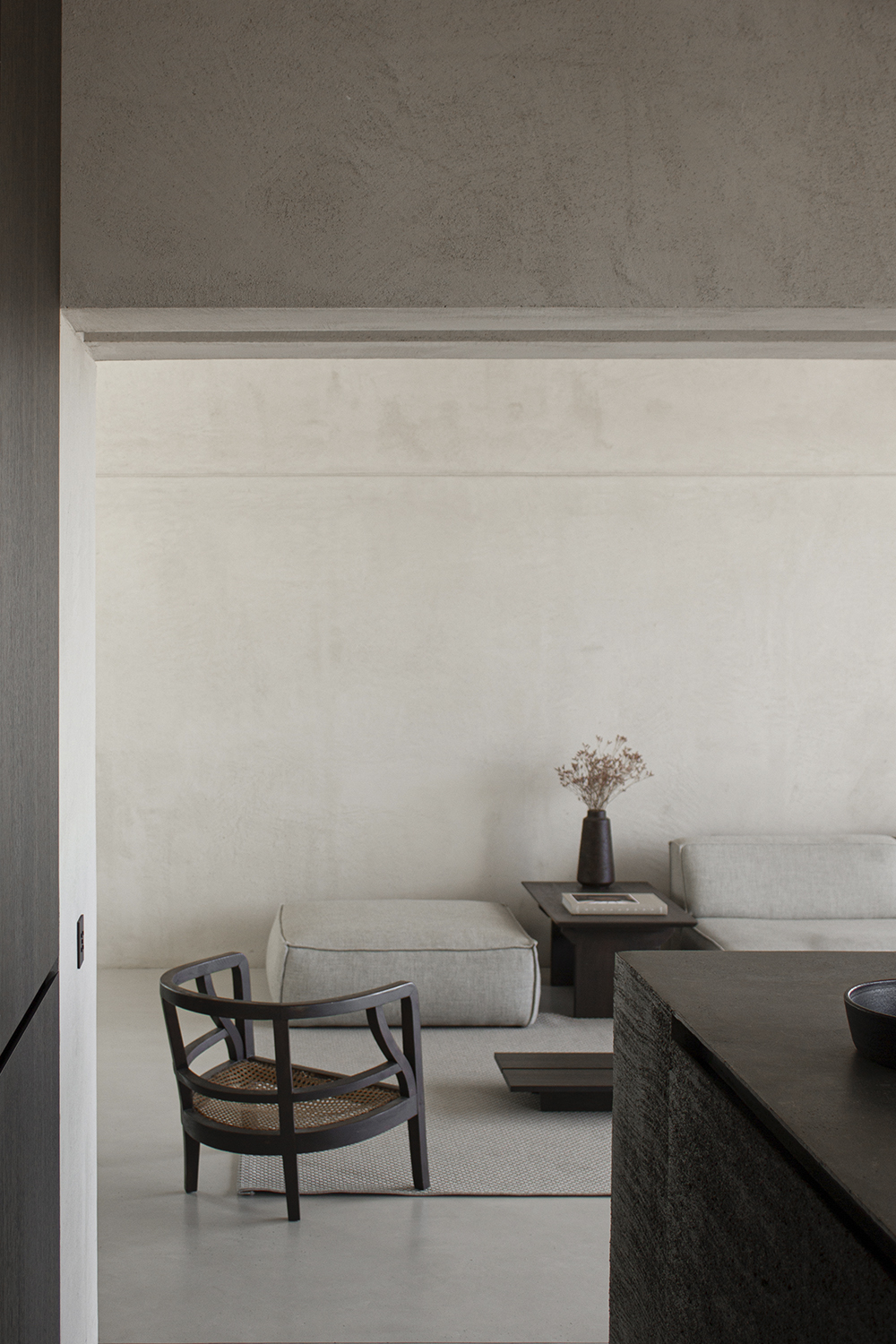 This approach seamlessly connected the interior designwith the architectural improvements. A mutedpalette of warm brown tones was chosento create a cohesive atmosphere.The structuralblocks and beams were all coated in light brownnatural lime, accentuating their raw character. Custom-designedcupboards and bespoke, freestandingfurniturewere crafted fromdark brown, brushed oak, adding depth and warmth. Additional design accents include seating elements in dark cork and a kitchen island and terrace finished in brown lime cement.