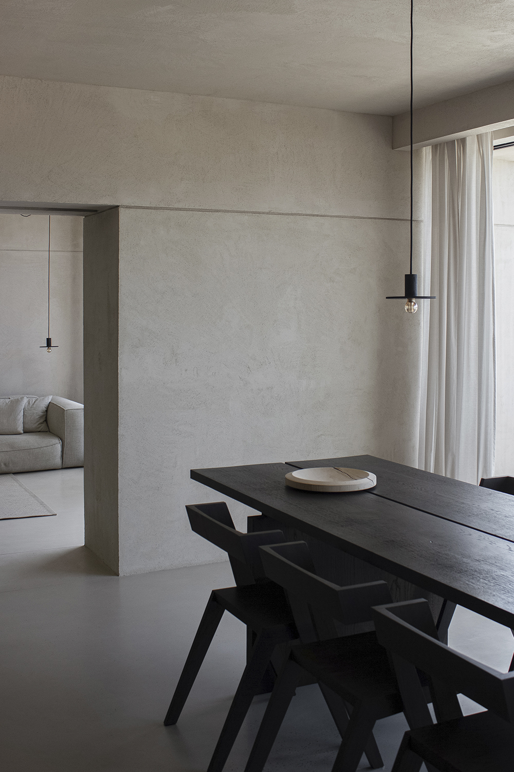 The third intervention followed directly from the client's wishfor an open loft-like space.By removing all, non-load-bearing walls, the brutal concrete structure emerged. The lower side of these beams wasdeliberately highlighted throughout the penthouse. Besides creating a harmonious whole, it also enhances the volumetric and architectural character by generating an interplay of blocks and beams.