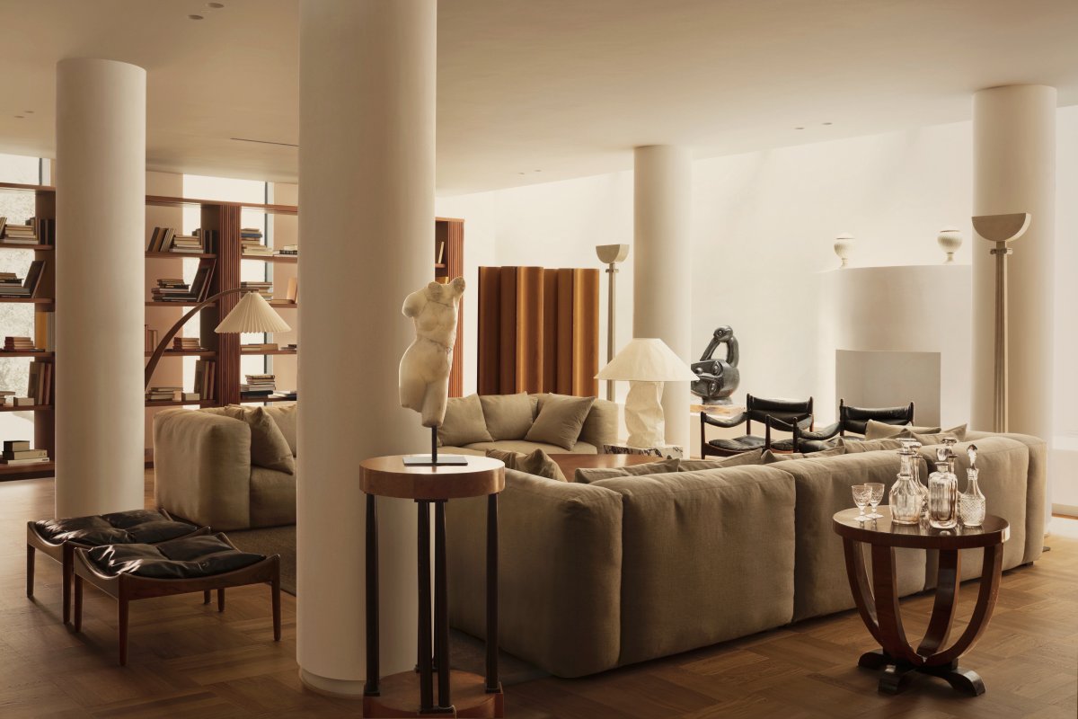 ‘The inspiration for this project came from Yves Saint Laurent’s Grand Salon at Rue de Babylone in Paris. We were interested in finding an authentic design language for this project, balancing the Art Deco references with the 1960s & 70s Modernism’- commented the designers Che Huang and Alexy Kos.‘The spacious Living Room is a social space where the guests can convene in a warm and relaxed environment. Here, we assembled a mix of collectable 20th-century furniture pieces, complemented by an eclectic collection of sculptures, heirlooms and art books, contributing to the effortless and lived-in atmosphere.’