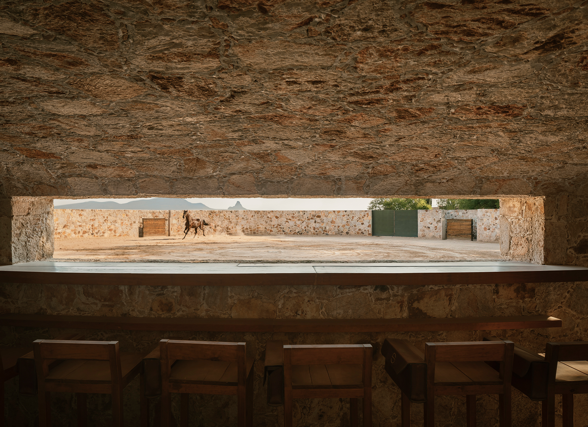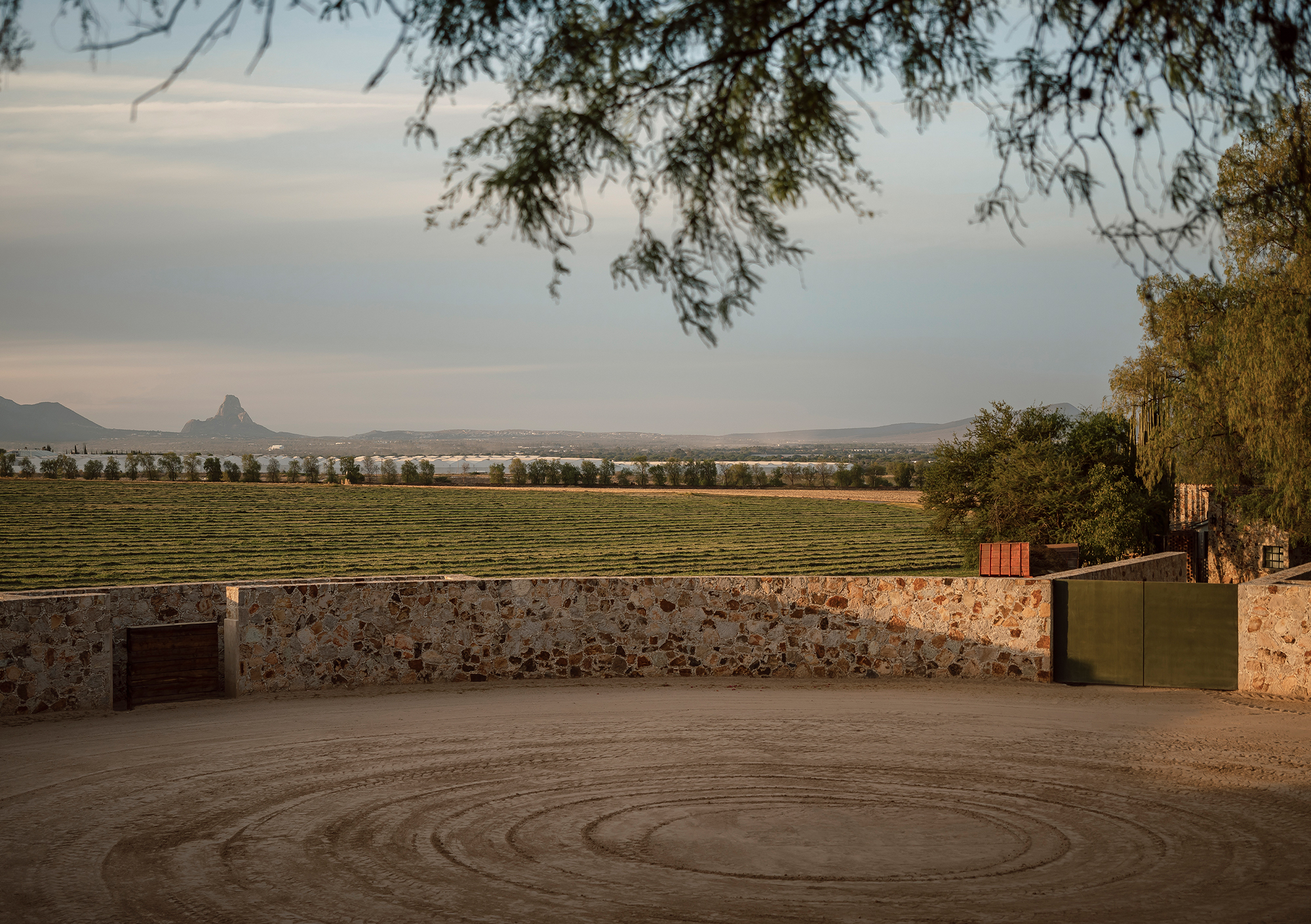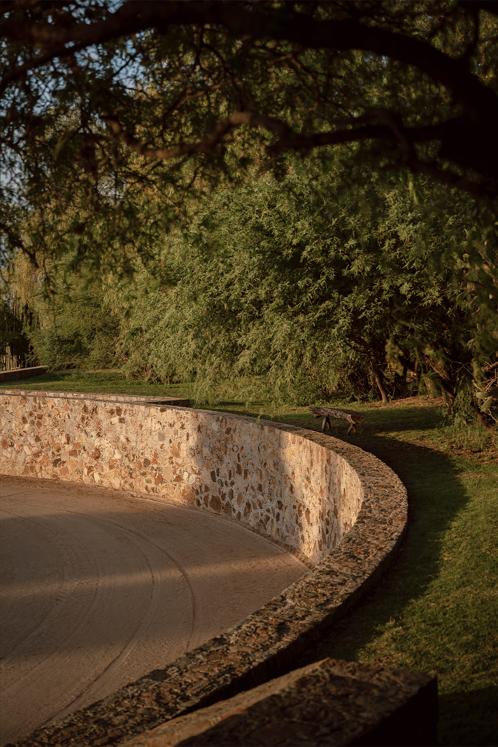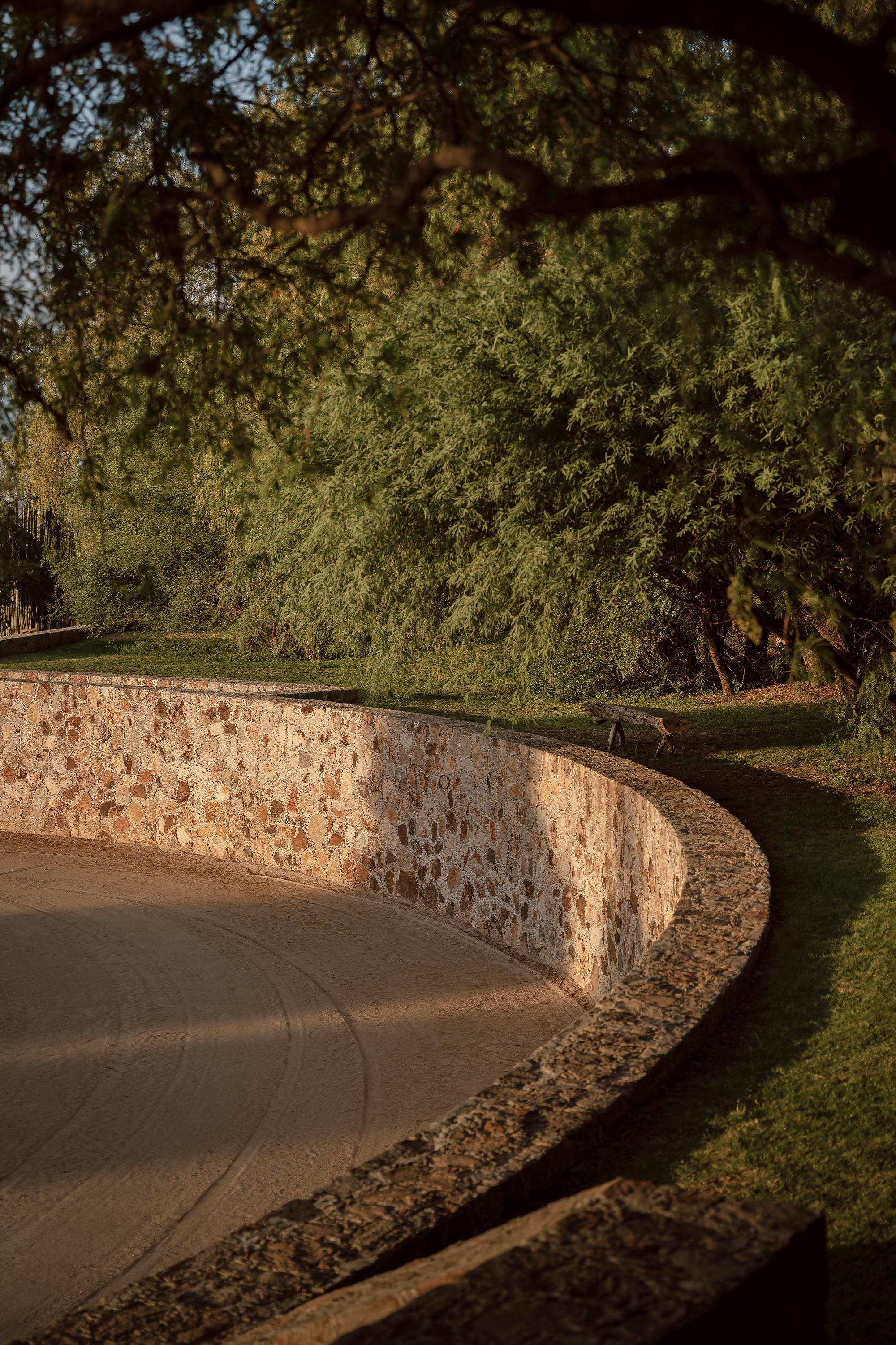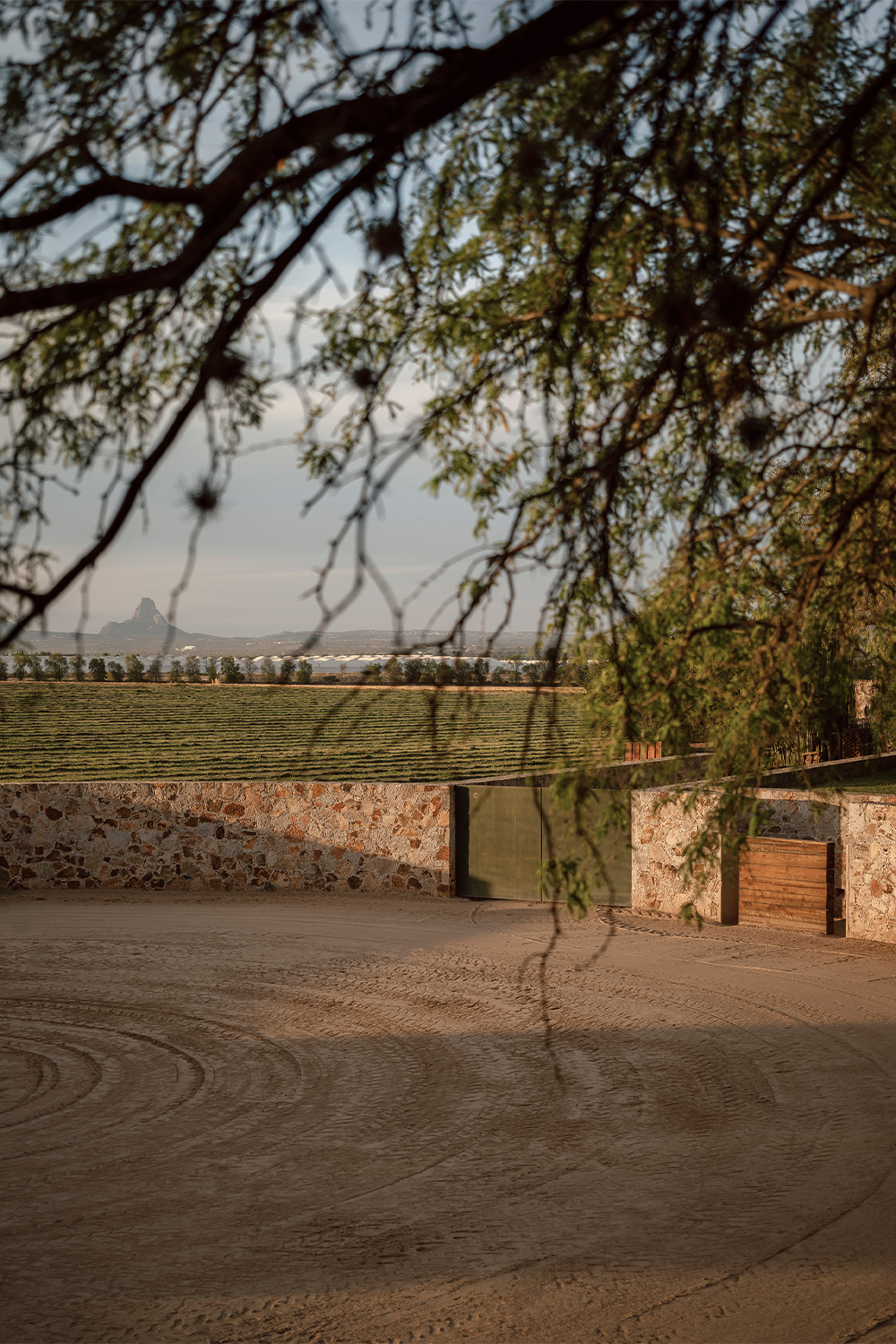 Access to the ring is via a staircase that descends following the curve of the arena. This path passes through a tunnel designed to protect two old mesquite trees and leads to a semi-sunken courtyard shaded by them, with a small fountain that provides freshness and a moment of pause. From there, one enters the breeders' box, where the tienta is directed. This space features a large window that frames the wall of the ring in the foreground and, in the background, the monumental silhouette of the Peña de Bernal. On one side, there is a discreet wine cellar, and on the other, access to the main burladero and the ring.