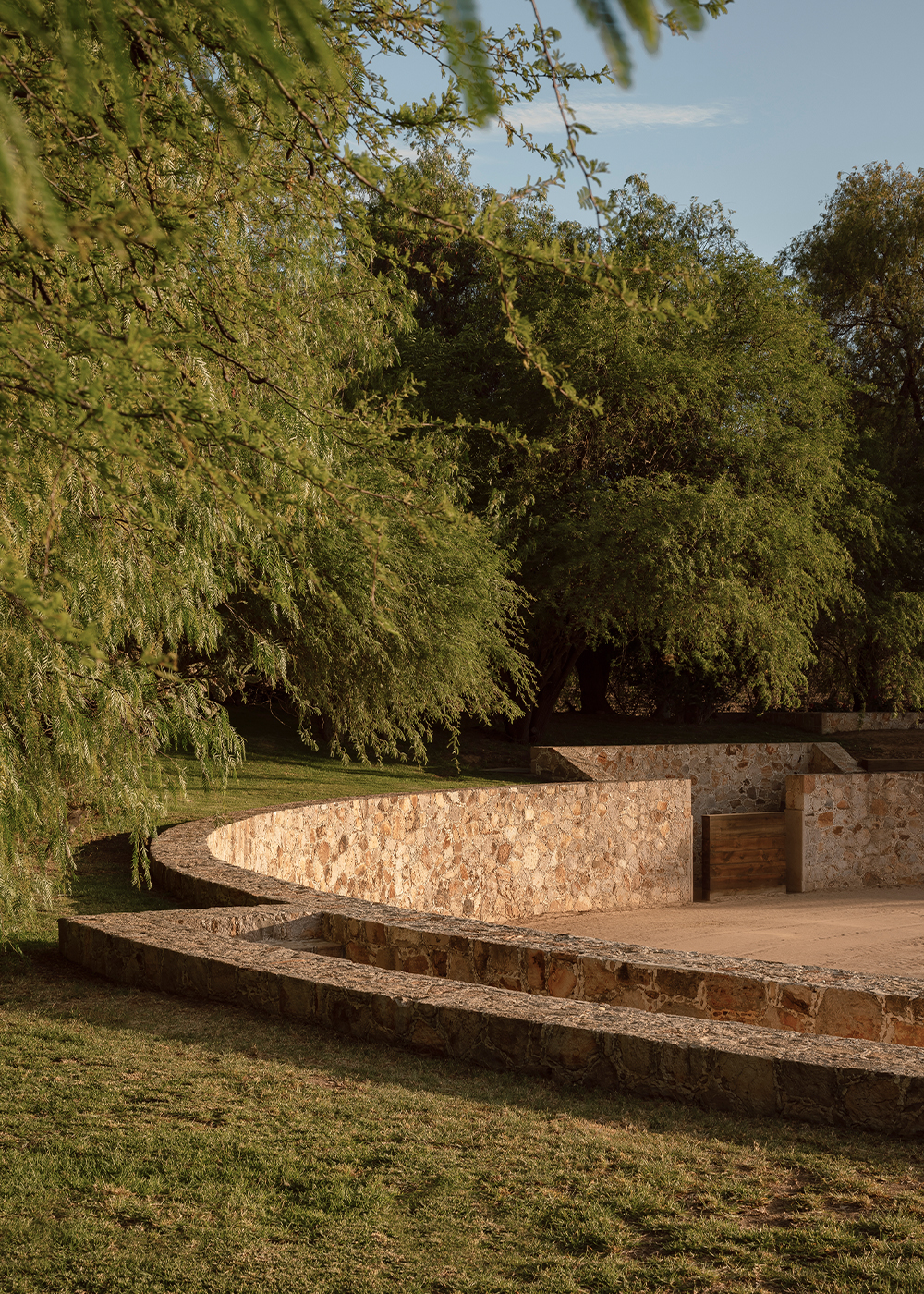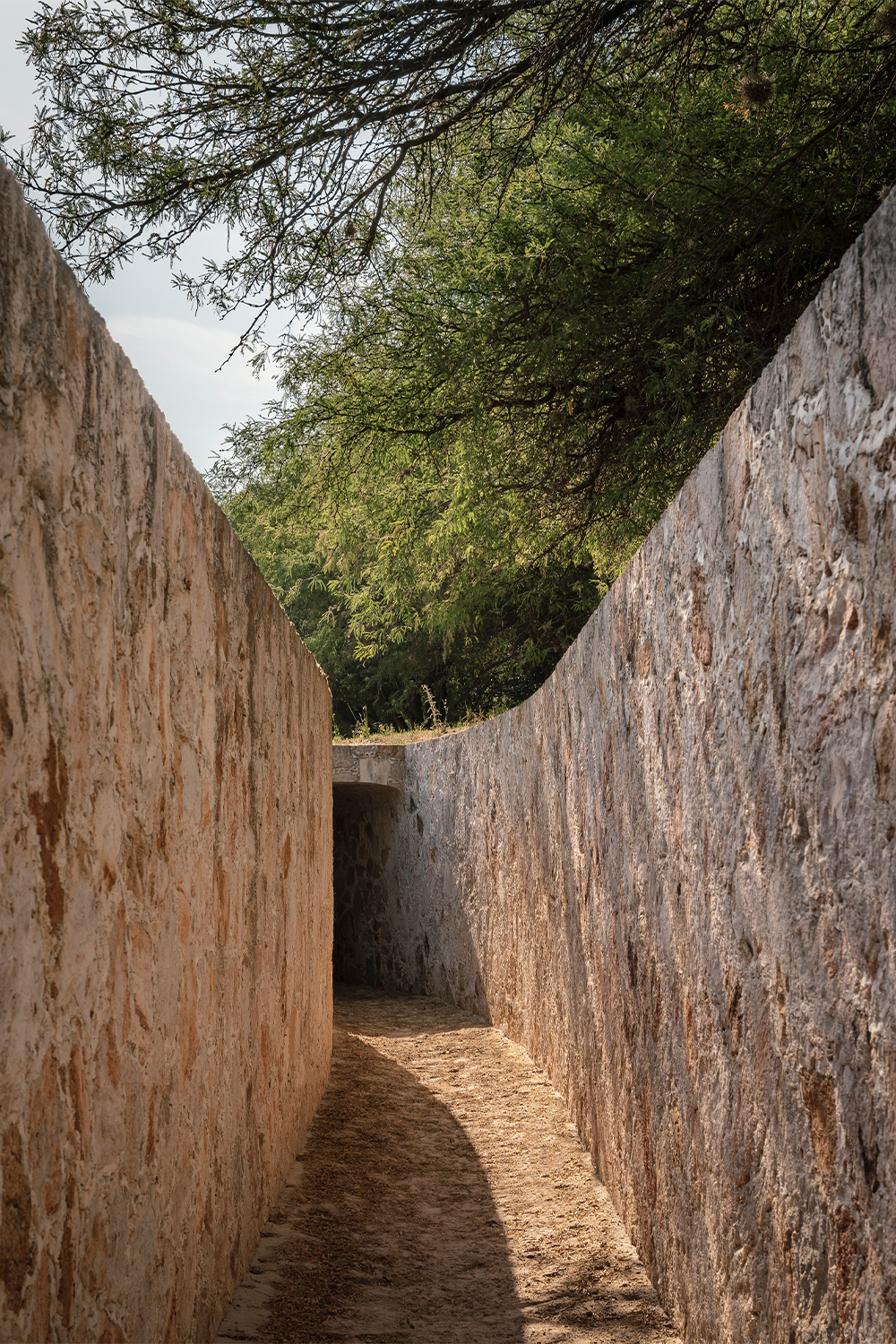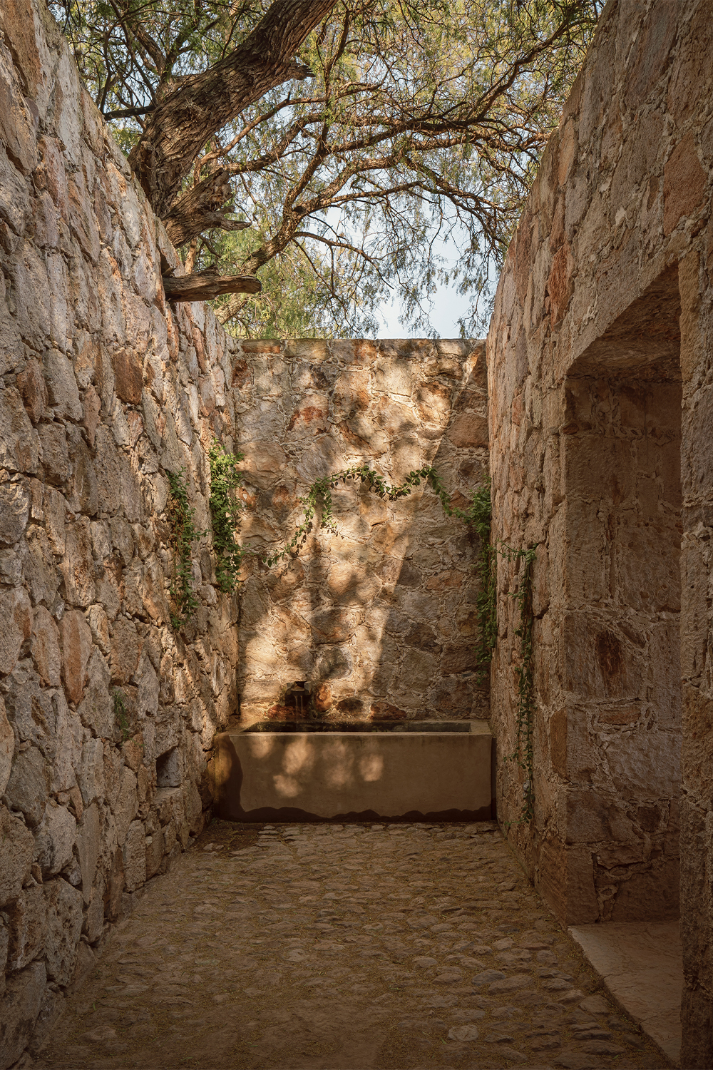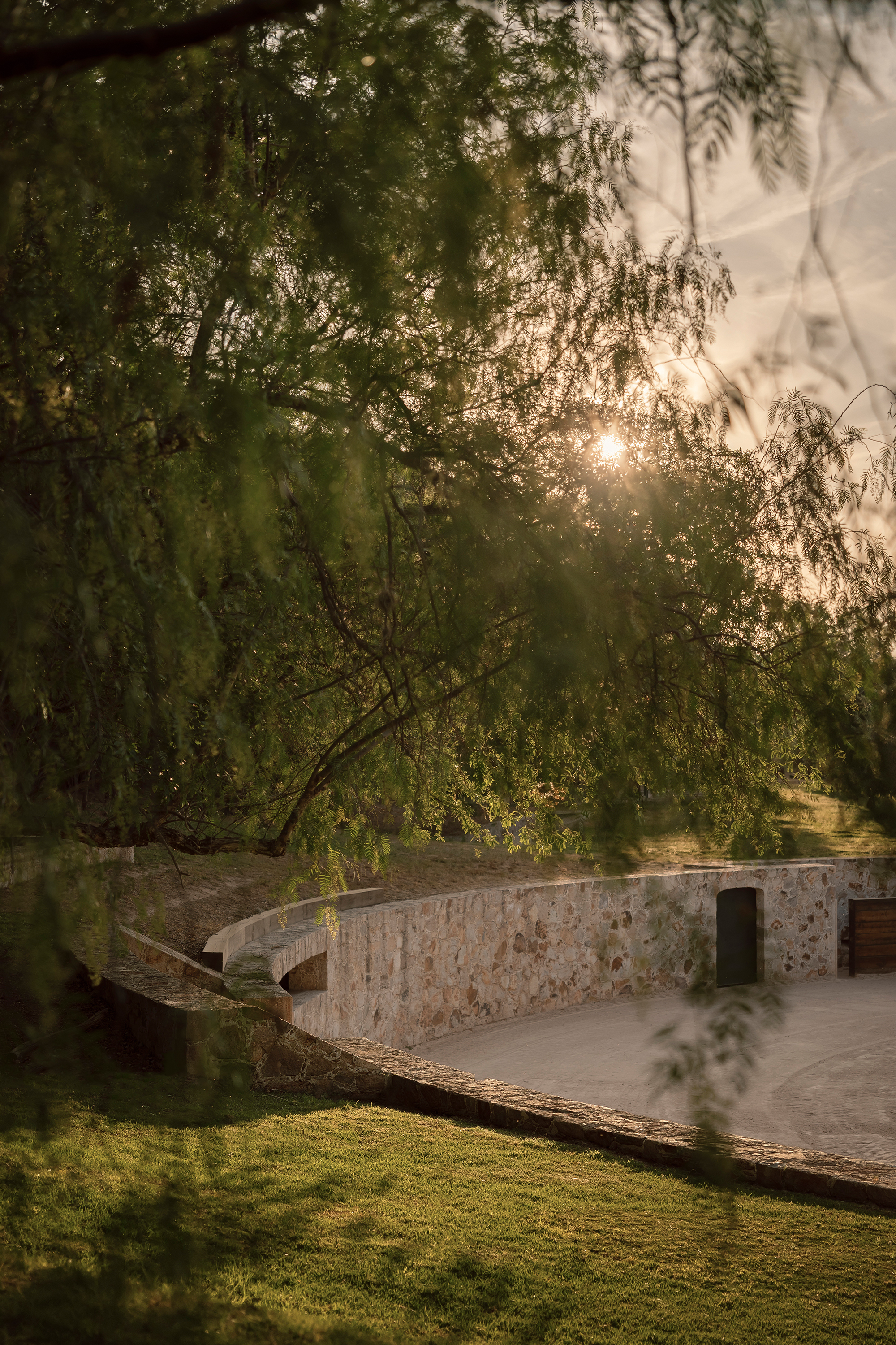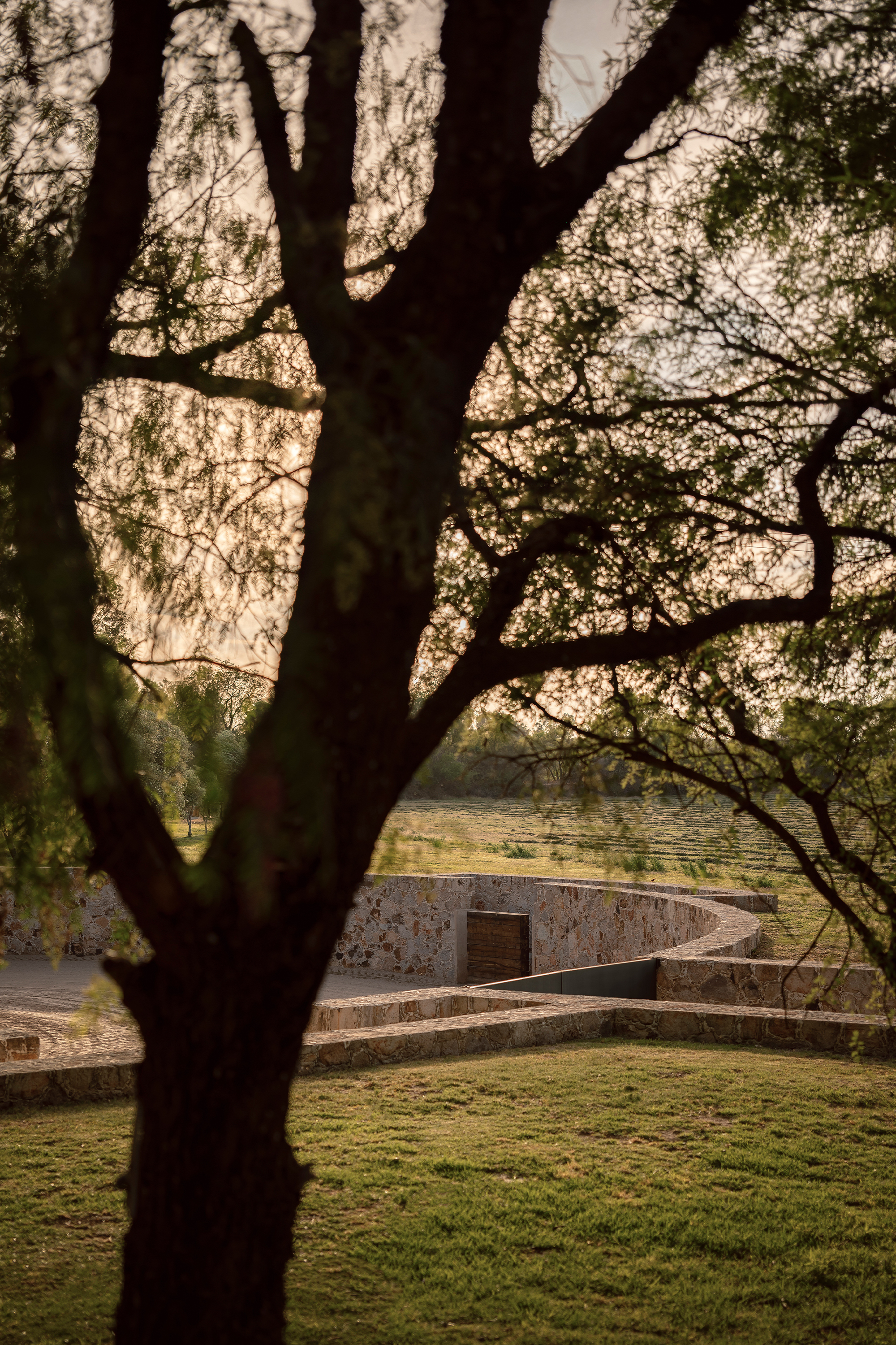 Access to the ring is via a staircase that descends following the curve of the arena. This path passes through a tunnel designed to protect two old mesquite trees and leads to a semi-sunken courtyard shaded by them, with a small fountain that provides freshness and a moment of pause. From there, one enters the breeders' box, where the tienta is directed. This space features a large window that frames the wall of the ring in the foreground and, in the background, the monumental silhouette of the Peña de Bernal. On one side, there is a discreet wine cellar, and on the other, access to the main burladero and the ring.