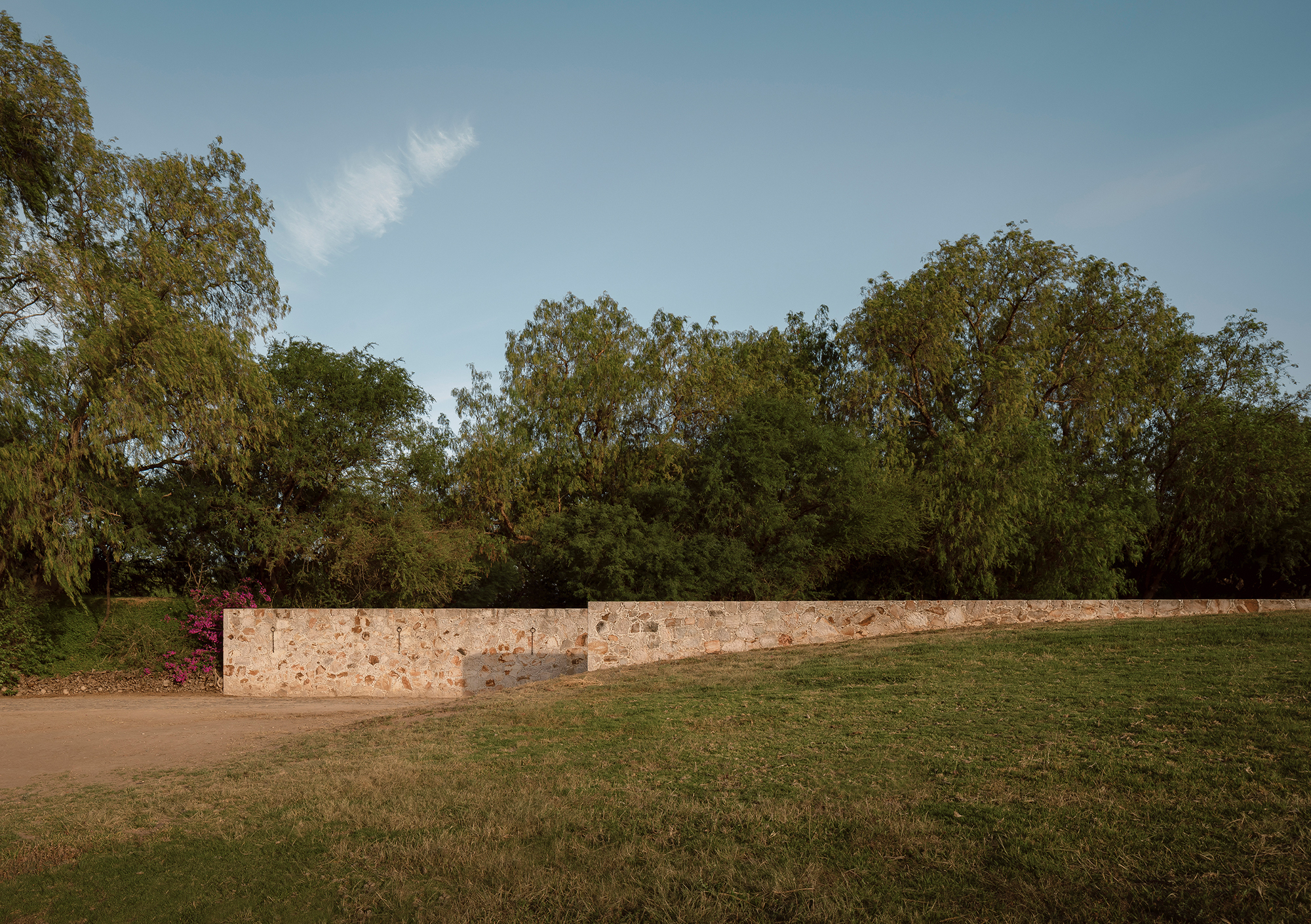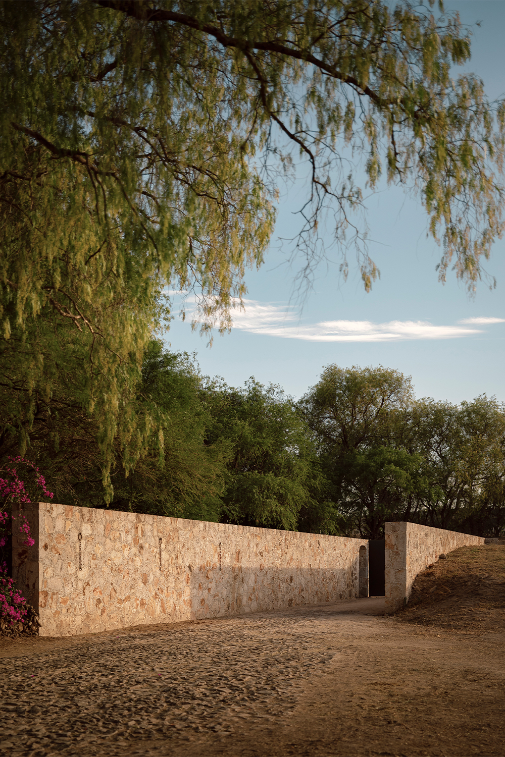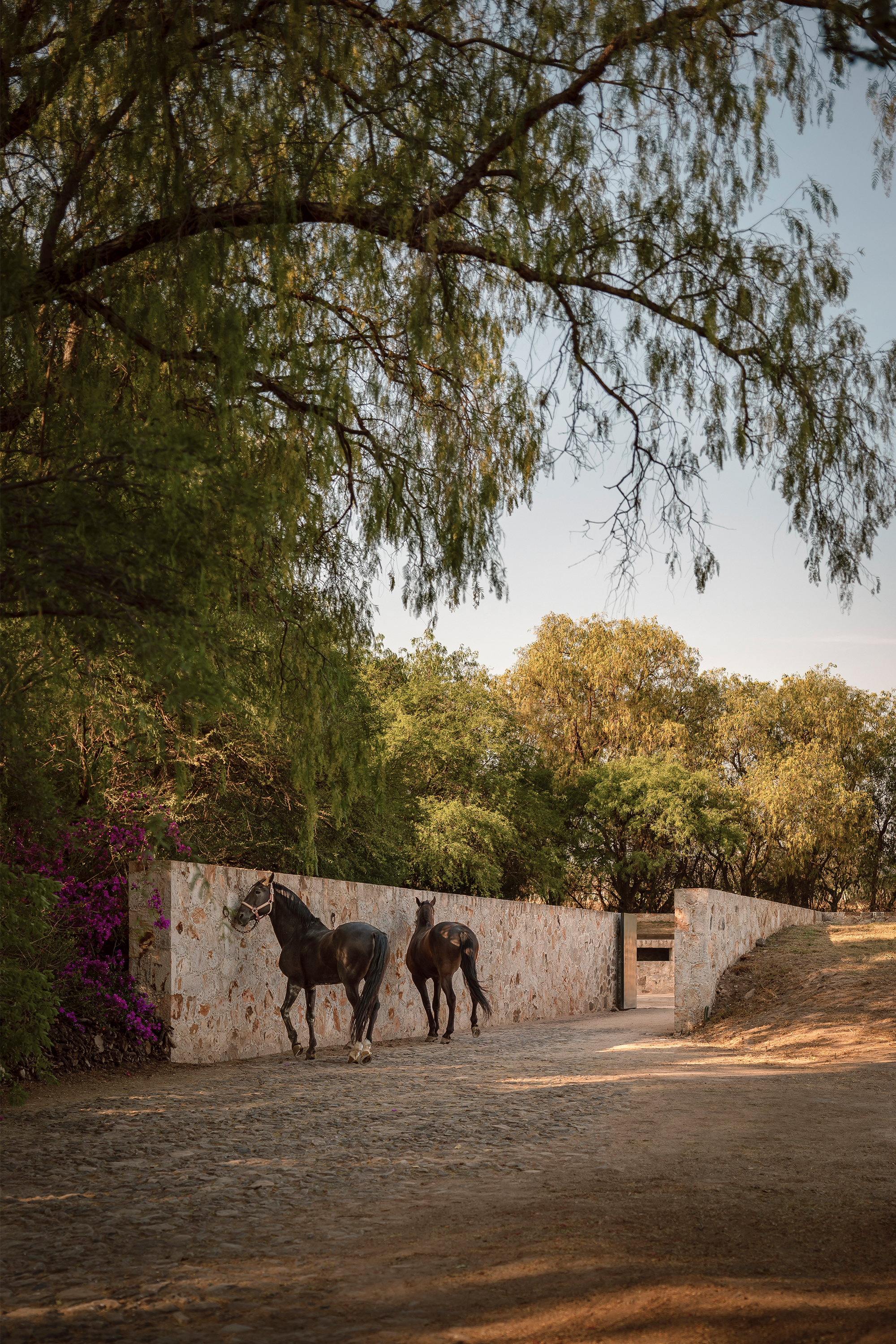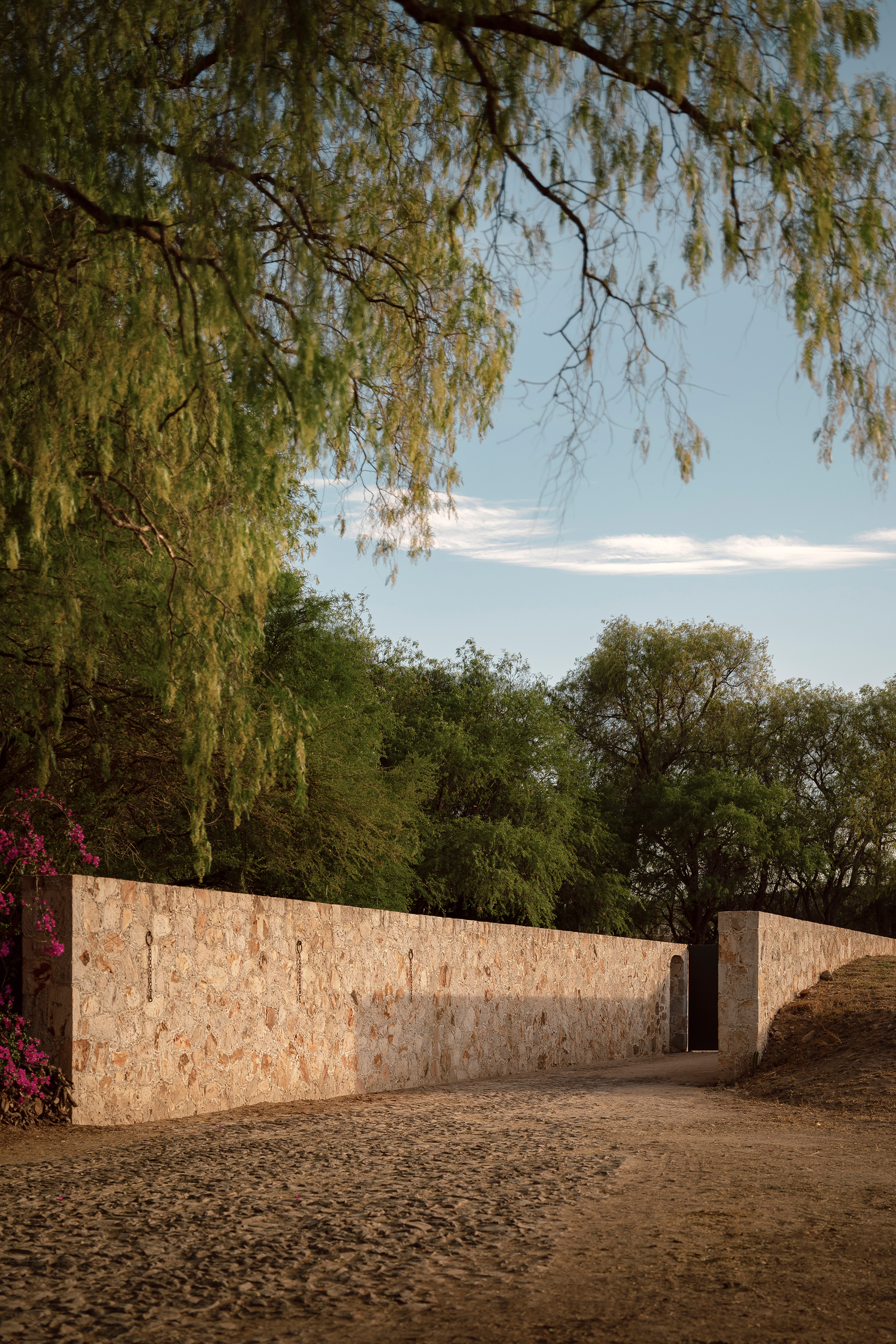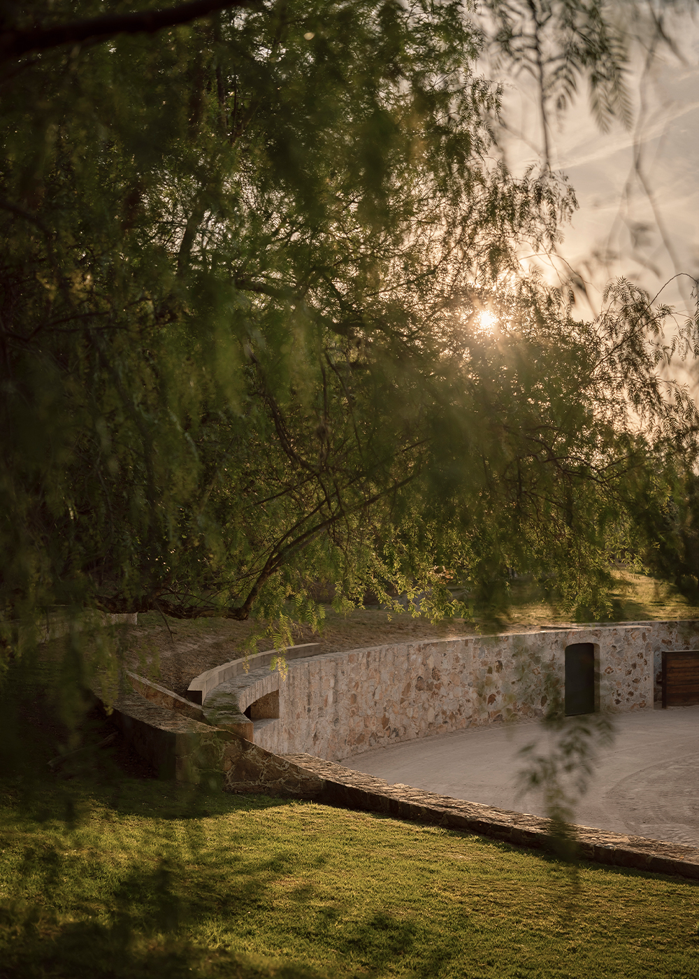 Access to the ring is via a staircase that descends following the curve of the arena. This path passes through a tunnel designed to protect two old mesquite trees and leads to a semi-sunken courtyard shaded by them, with a small fountain that provides freshness and a moment of pause. From there, one enters the breeders' box, where the tienta is directed. This space features a large window that frames the wall of the ring in the foreground and, in the background, the monumental silhouette of the Peña de Bernal. On one side, there is a discreet wine cellar, and on the other, access to the main burladero and the ring.