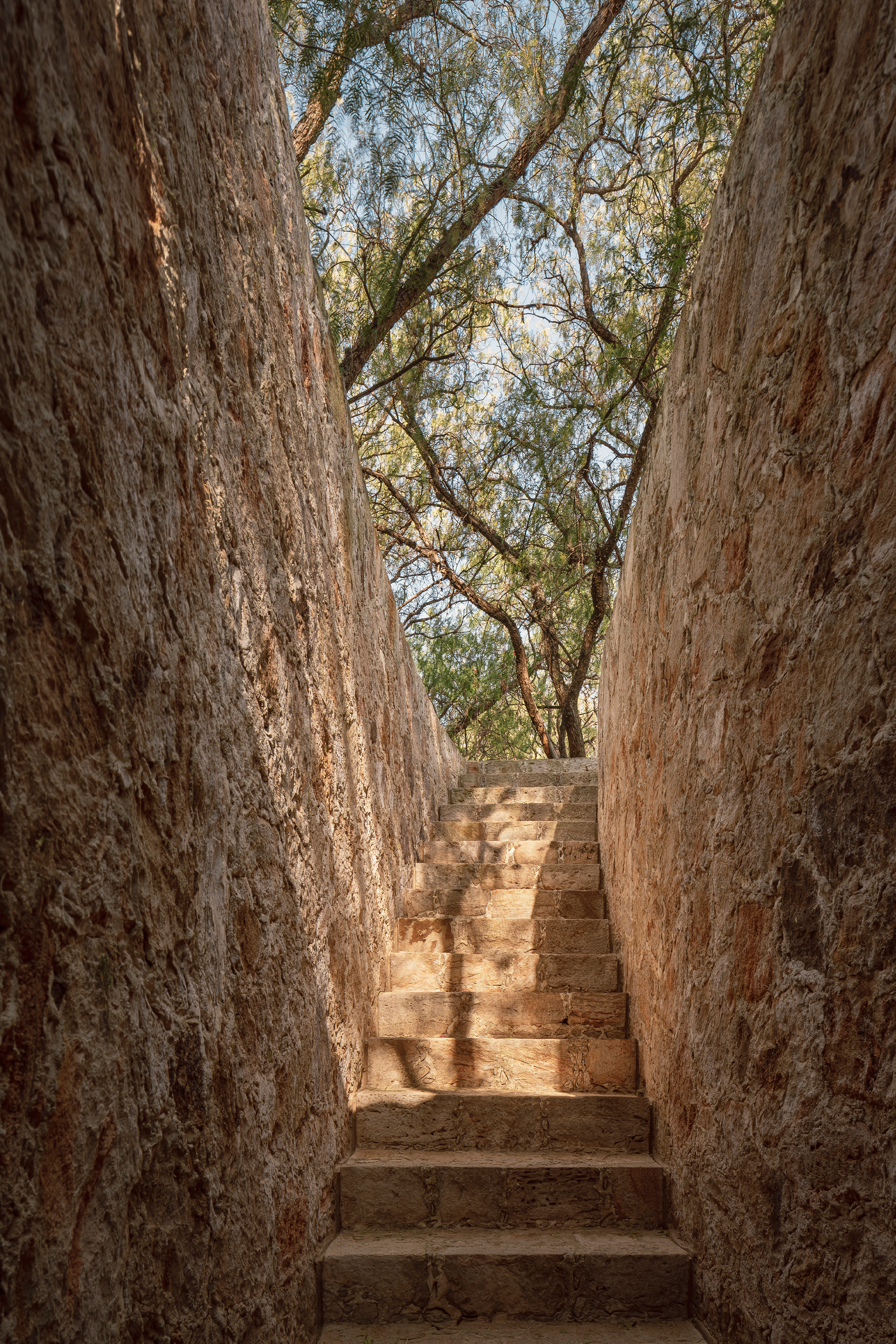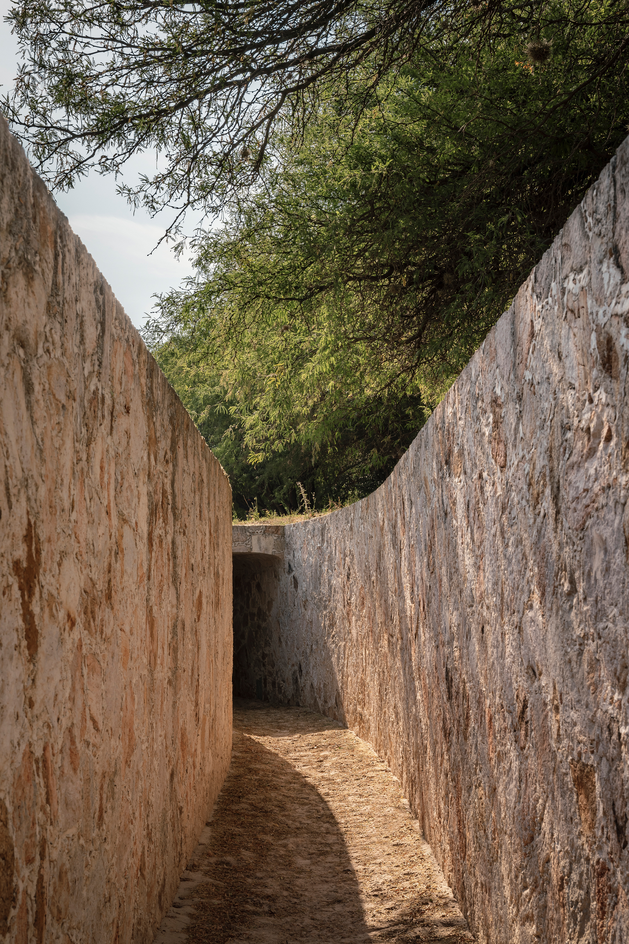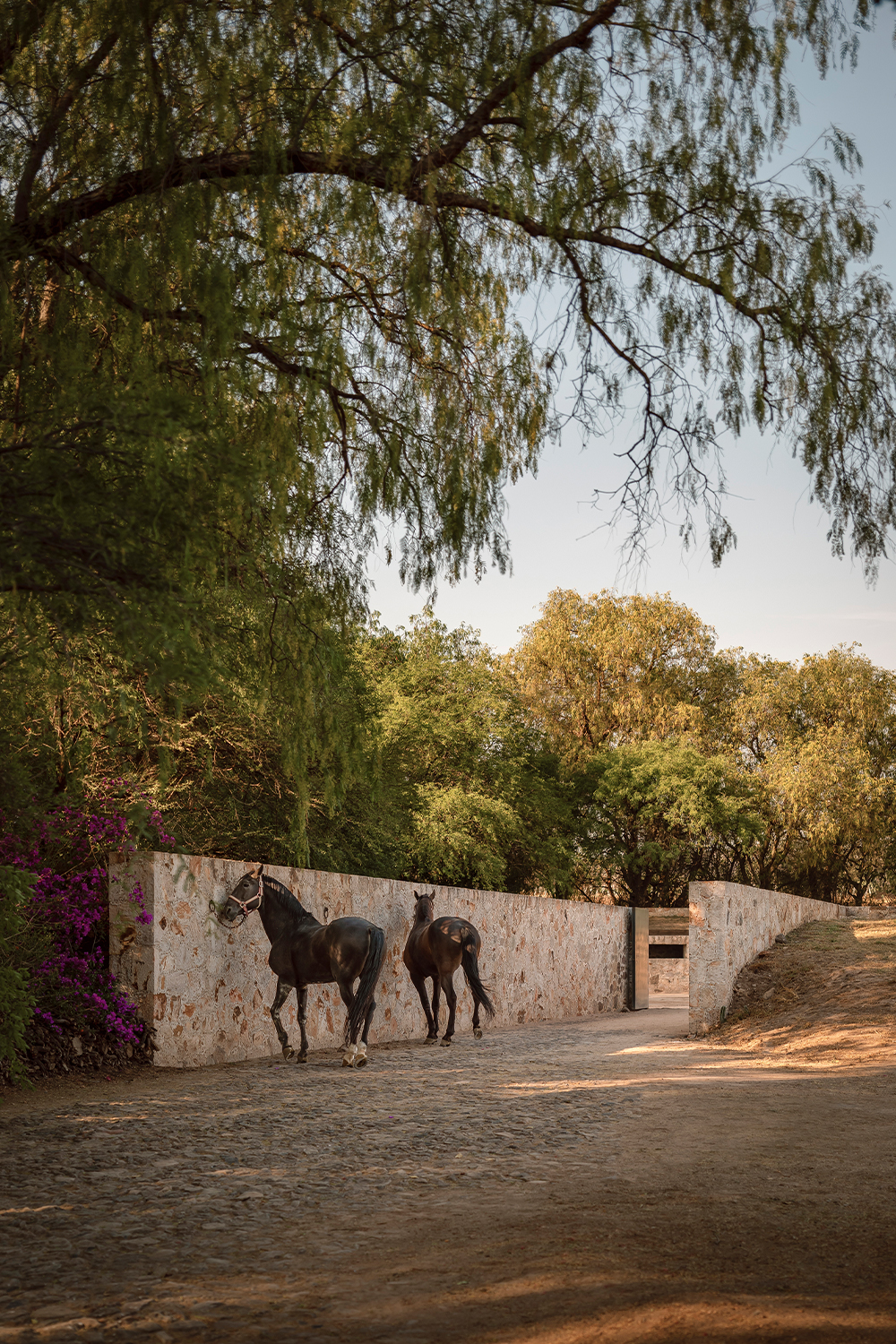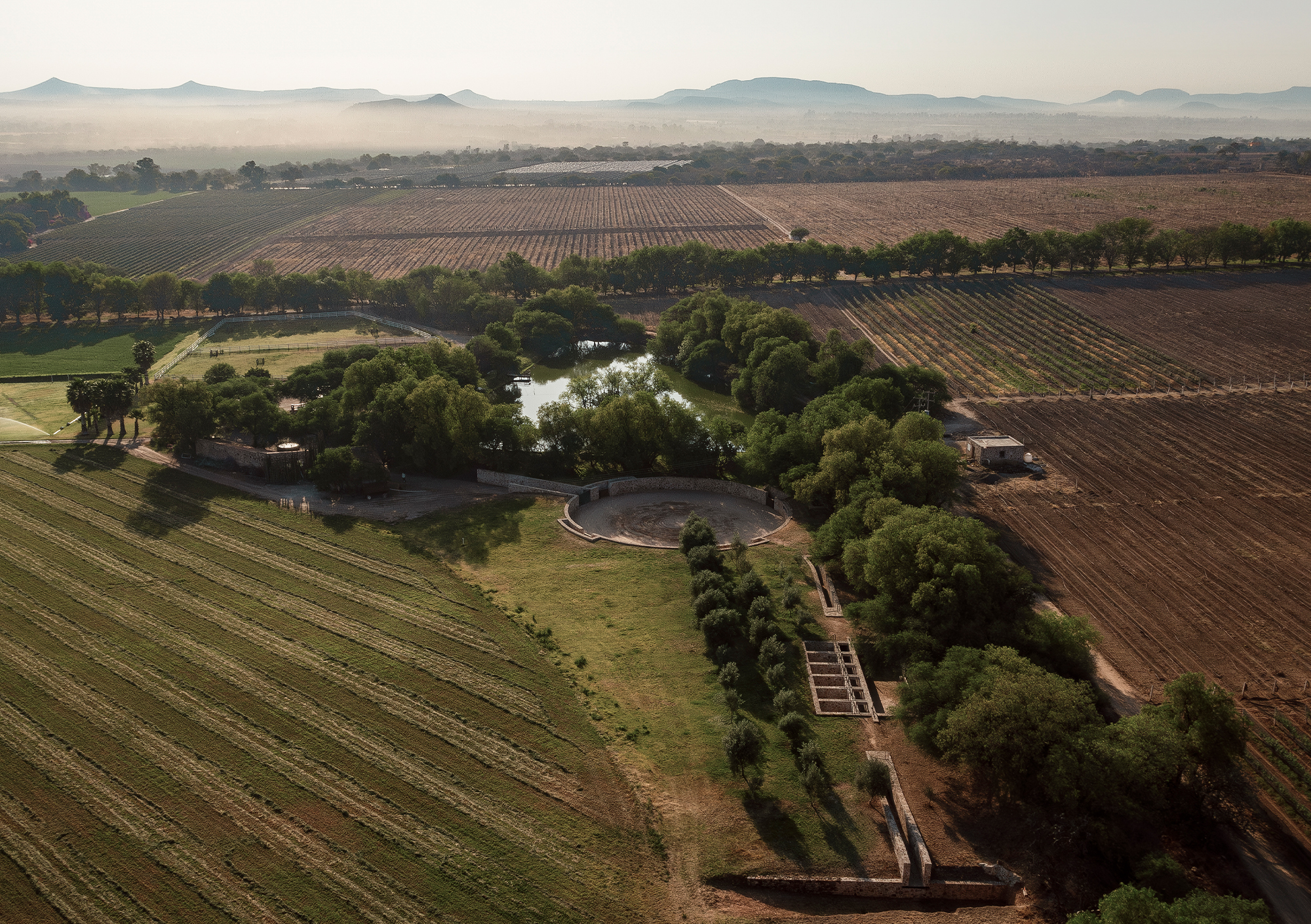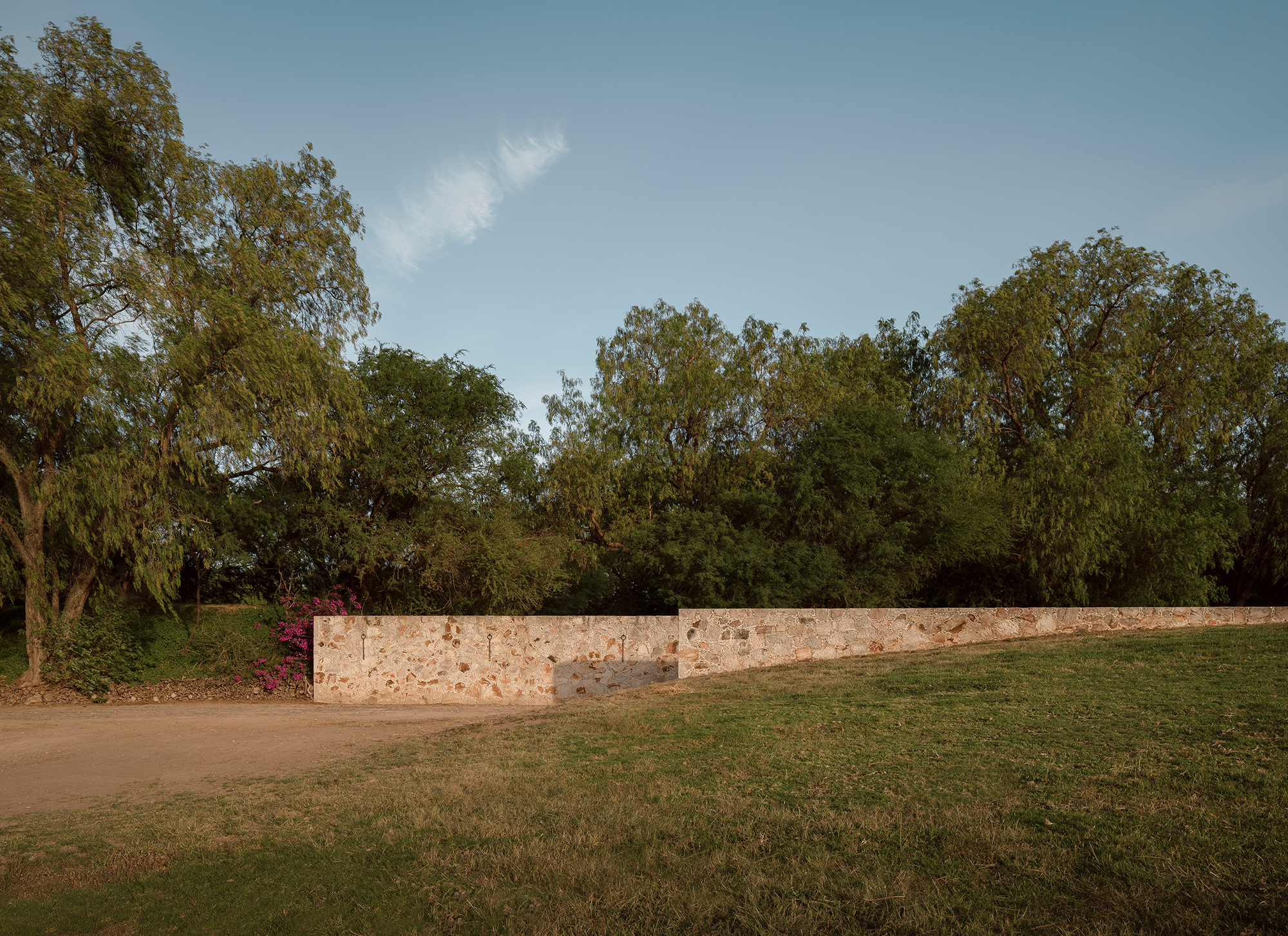 Access to the ring is via a staircase that descends following the curve of the arena. This path passes through a tunnel designed to protect two old mesquite trees and leads to a semi-sunken courtyard shaded by them, with a small fountain that provides freshness and a moment of pause. From there, one enters the breeders' box, where the tienta is directed. This space features a large window that frames the wall of the ring in the foreground and, in the background, the monumental silhouette of the Peña de Bernal. On one side, there is a discreet wine cellar, and on the other, access to the main burladero and the ring.