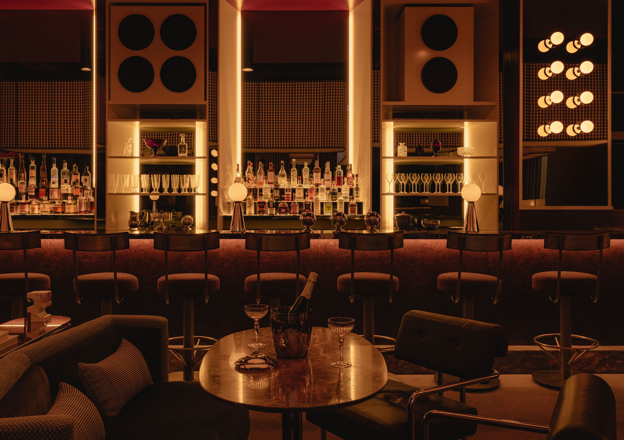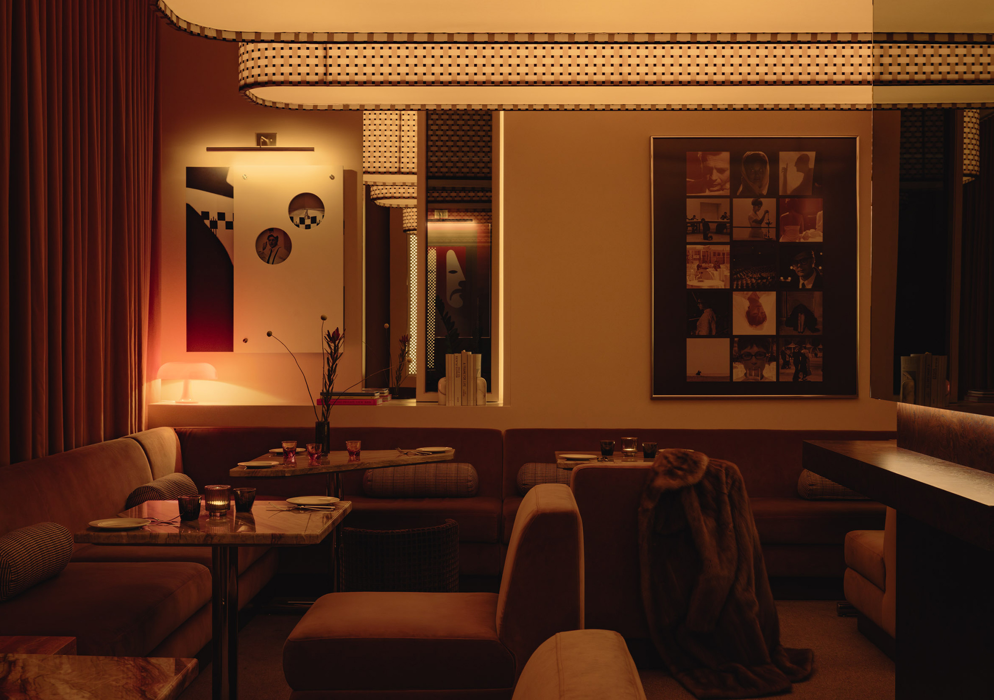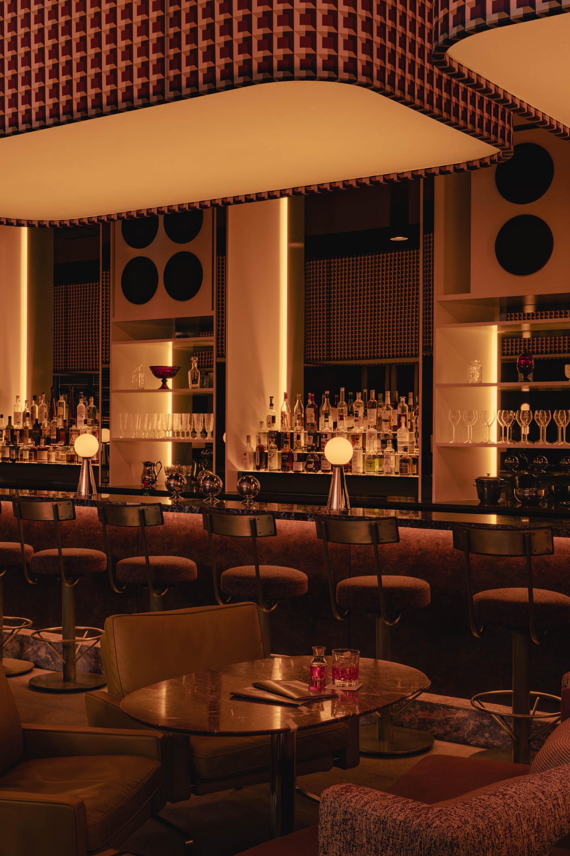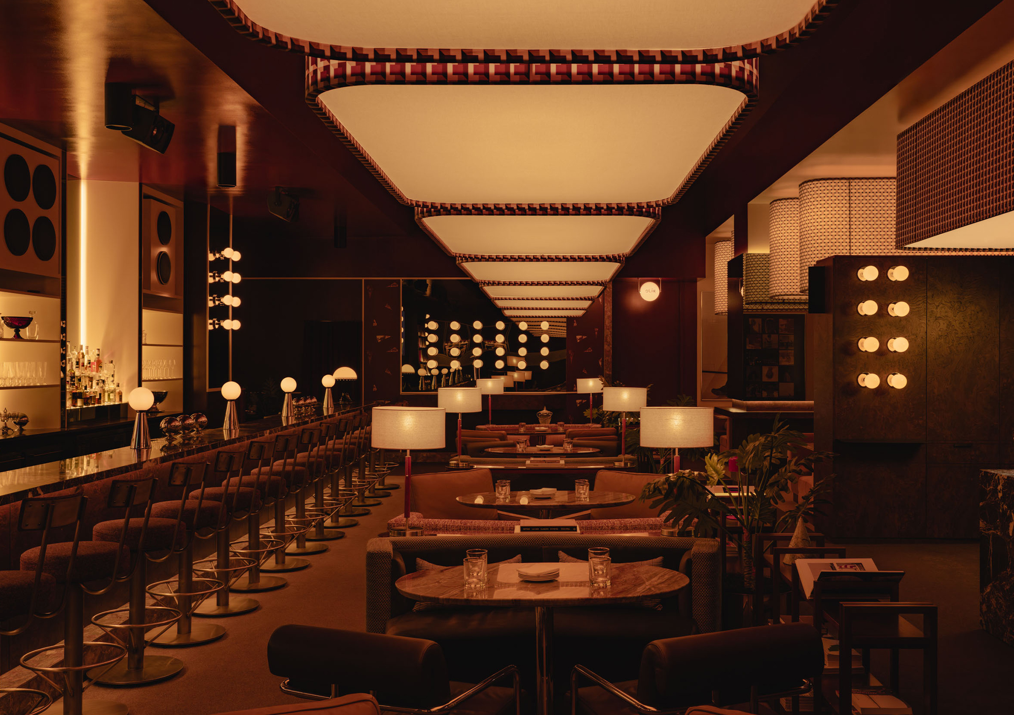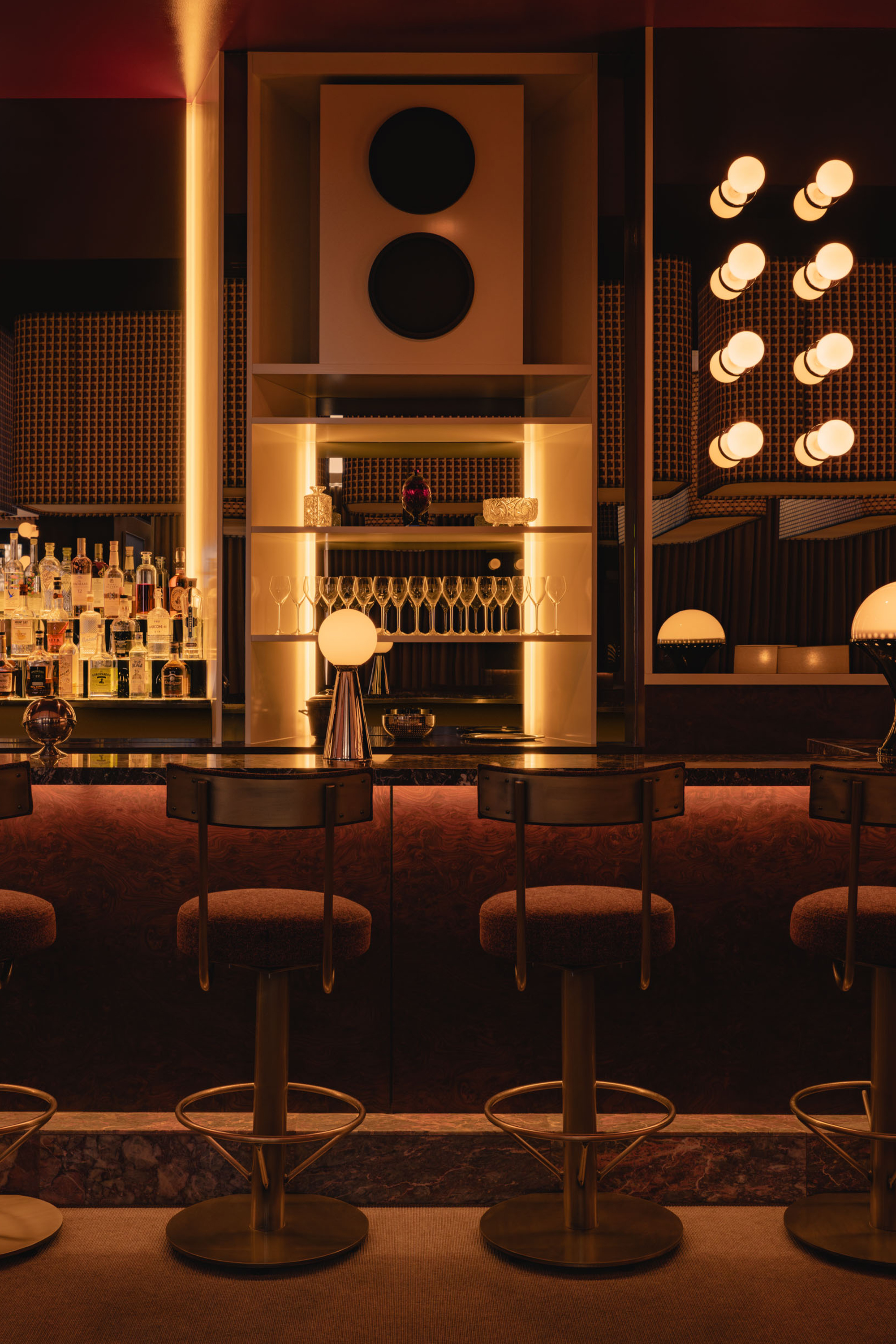 Mimi extends the sequence into the later hours with an environment structured around cinematic references and an up-tempo vibe. The palette combines deep browns, glossy reds, amber tones, Rosso Rubino marble, and chrome detailing while custom burnt orange velvet sofas, reminiscent of 1960s sunken lounges, and monolithic burled walnut panels line the space. The lighting program, anchored by a repetition of large capsule pendants, produces a consistent low glow across the space. Artwork nods to Italo disco and iconic cinema, while the L-Acoustics system fills the room with a curated soundtrack of vintage soul, jazz, deep disco, and sometimes features Chef Daniel stepping in for an impromptu set. Guests drift in late, sipping cocktails under the canopy of warm light, and settle into the rhythm of the room as night unfolds. The cocktail and snack menus extend into the night, allowing the space to operate as a lounge, informal performance setting, and after-hours bar within a single footprint.