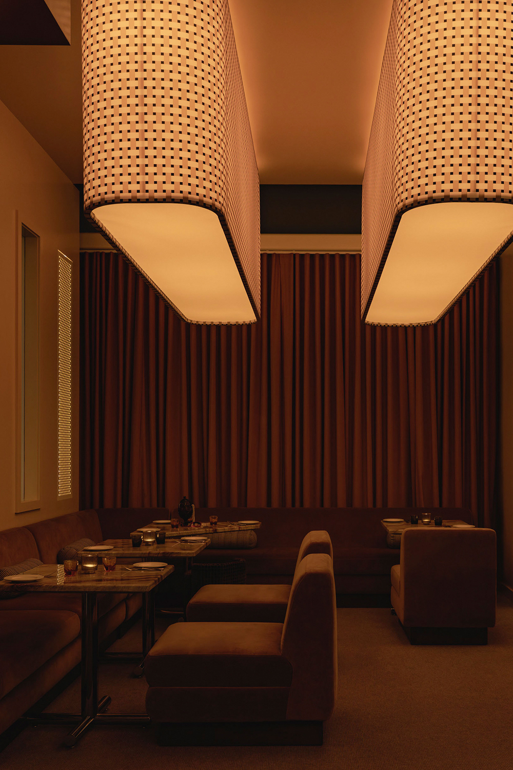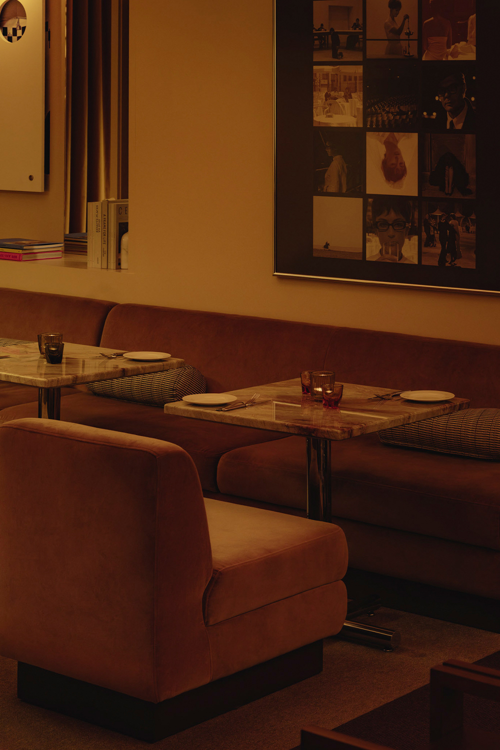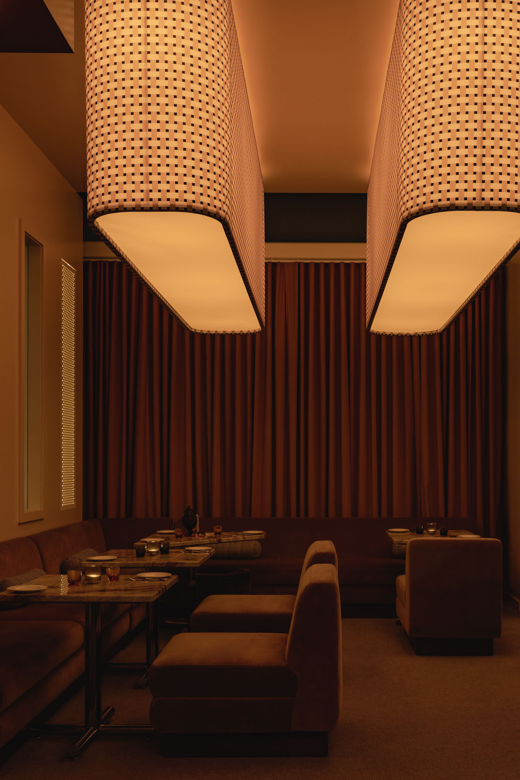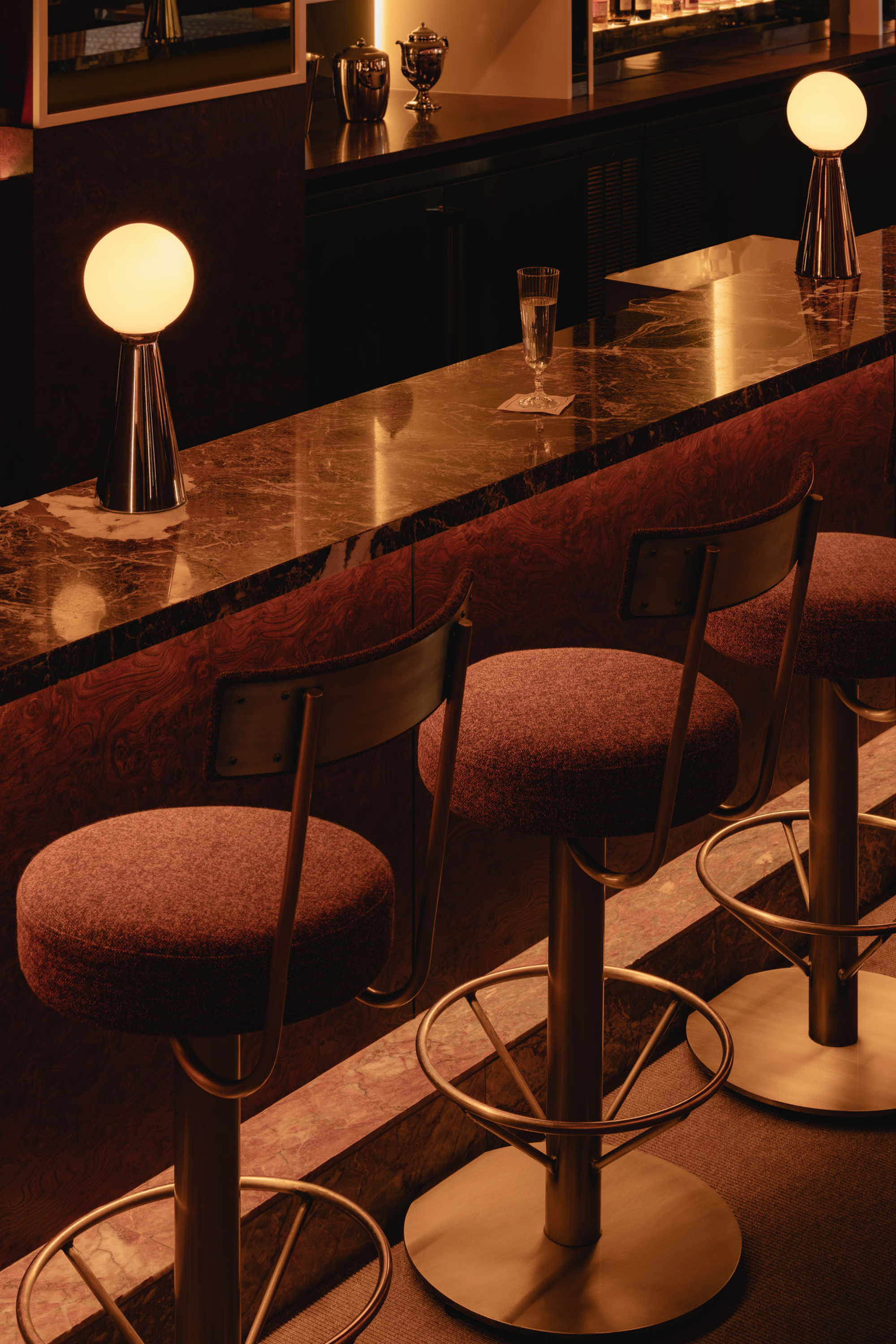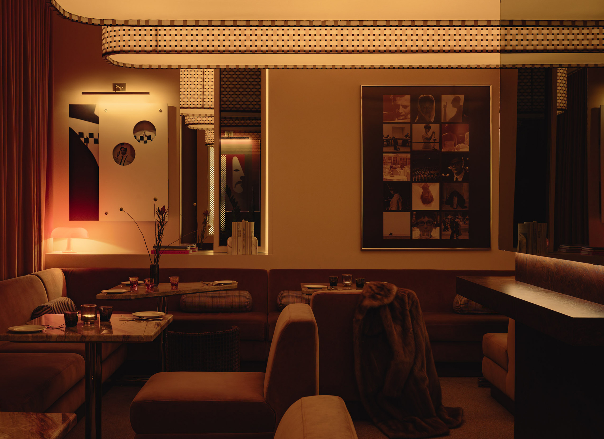 Mimi extends the sequence into the later hours with an environment structured around cinematic references and an up-tempo vibe. The palette combines deep browns, glossy reds, amber tones, Rosso Rubino marble, and chrome detailing while custom burnt orange velvet sofas, reminiscent of 1960s sunken lounges, and monolithic burled walnut panels line the space. The lighting program, anchored by a repetition of large capsule pendants, produces a consistent low glow across the space. Artwork nods to Italo disco and iconic cinema, while the L-Acoustics system fills the room with a curated soundtrack of vintage soul, jazz, deep disco, and sometimes features Chef Daniel stepping in for an impromptu set. Guests drift in late, sipping cocktails under the canopy of warm light, and settle into the rhythm of the room as night unfolds. The cocktail and snack menus extend into the night, allowing the space to operate as a lounge, informal performance setting, and after-hours bar within a single footprint.