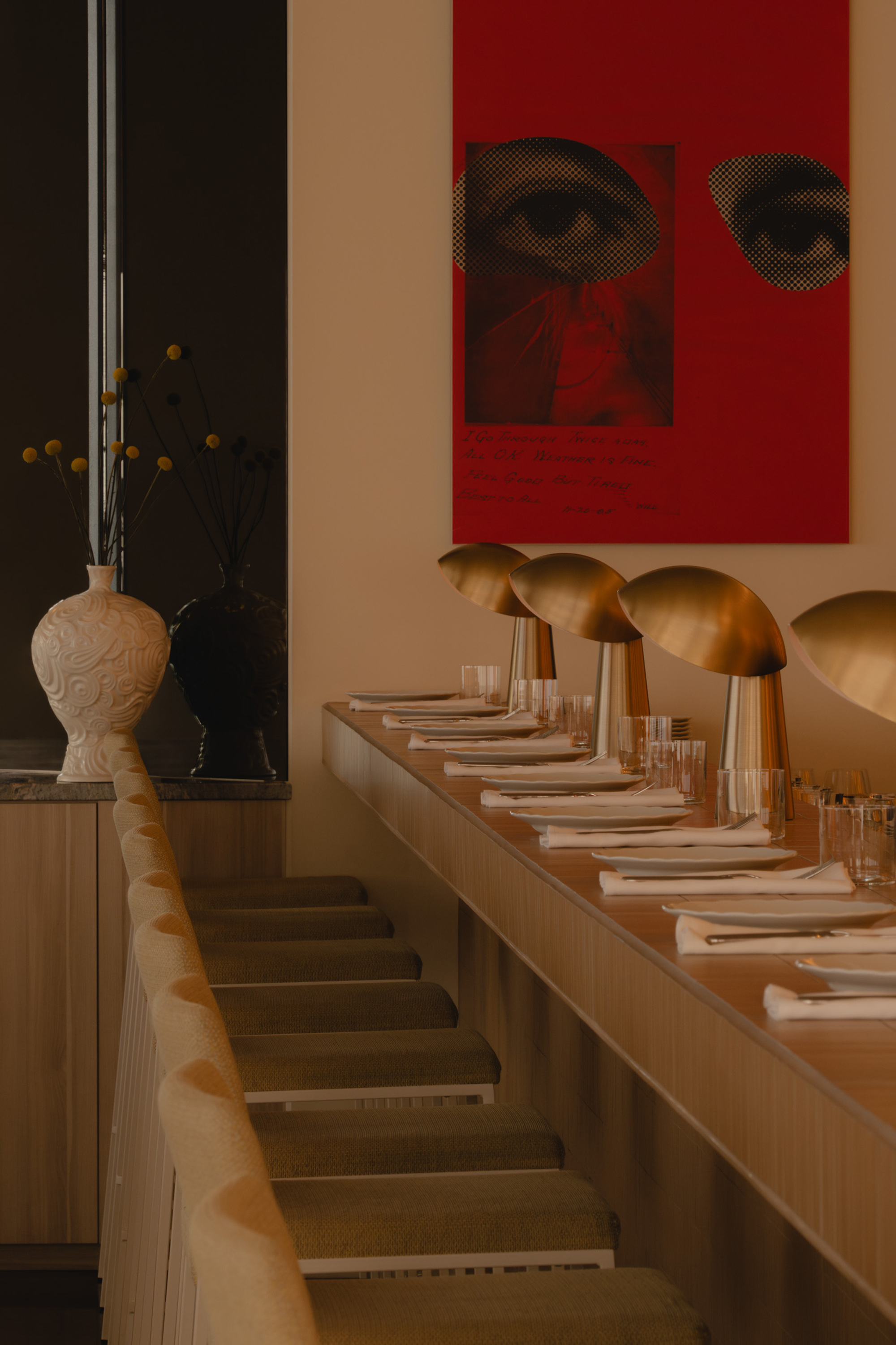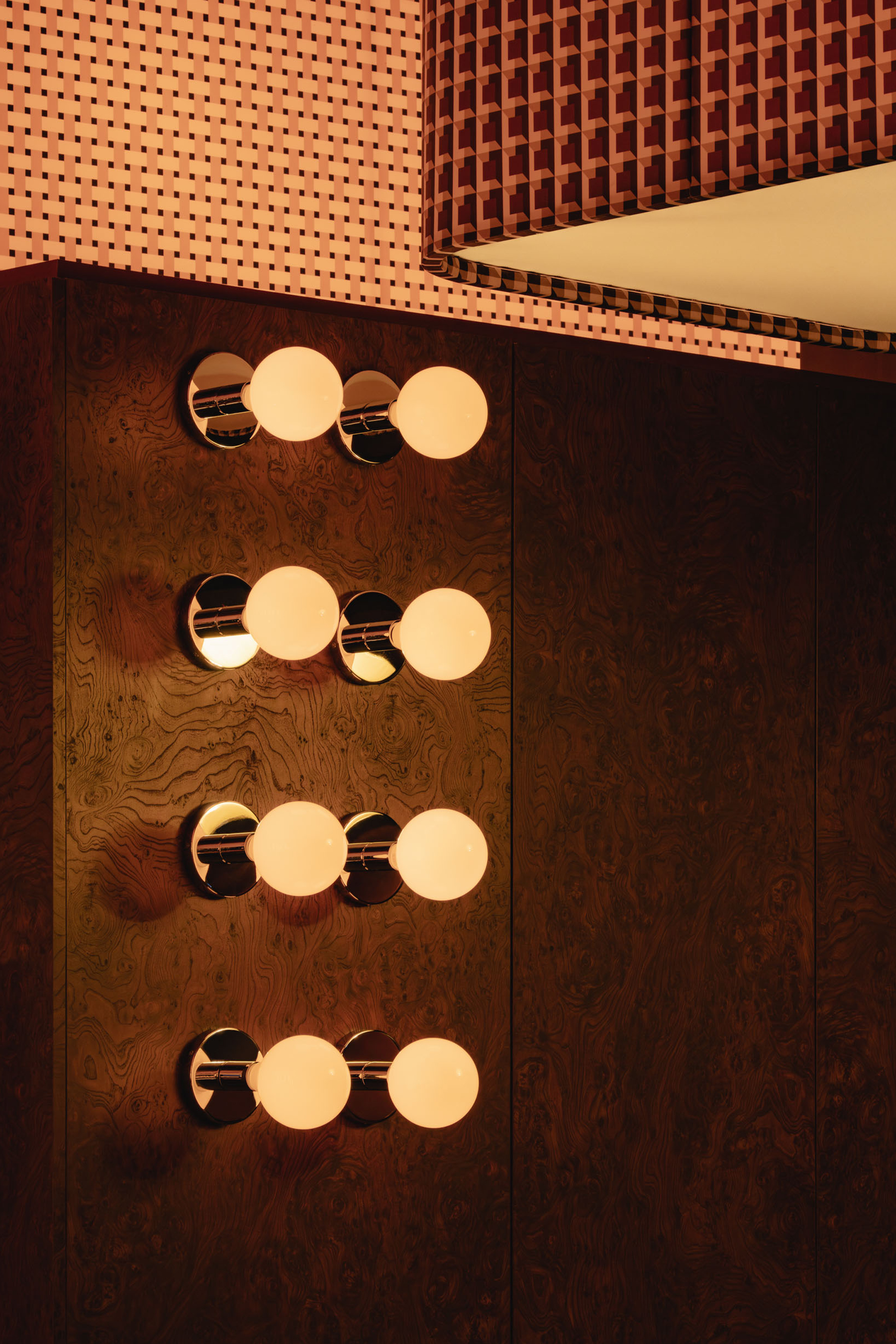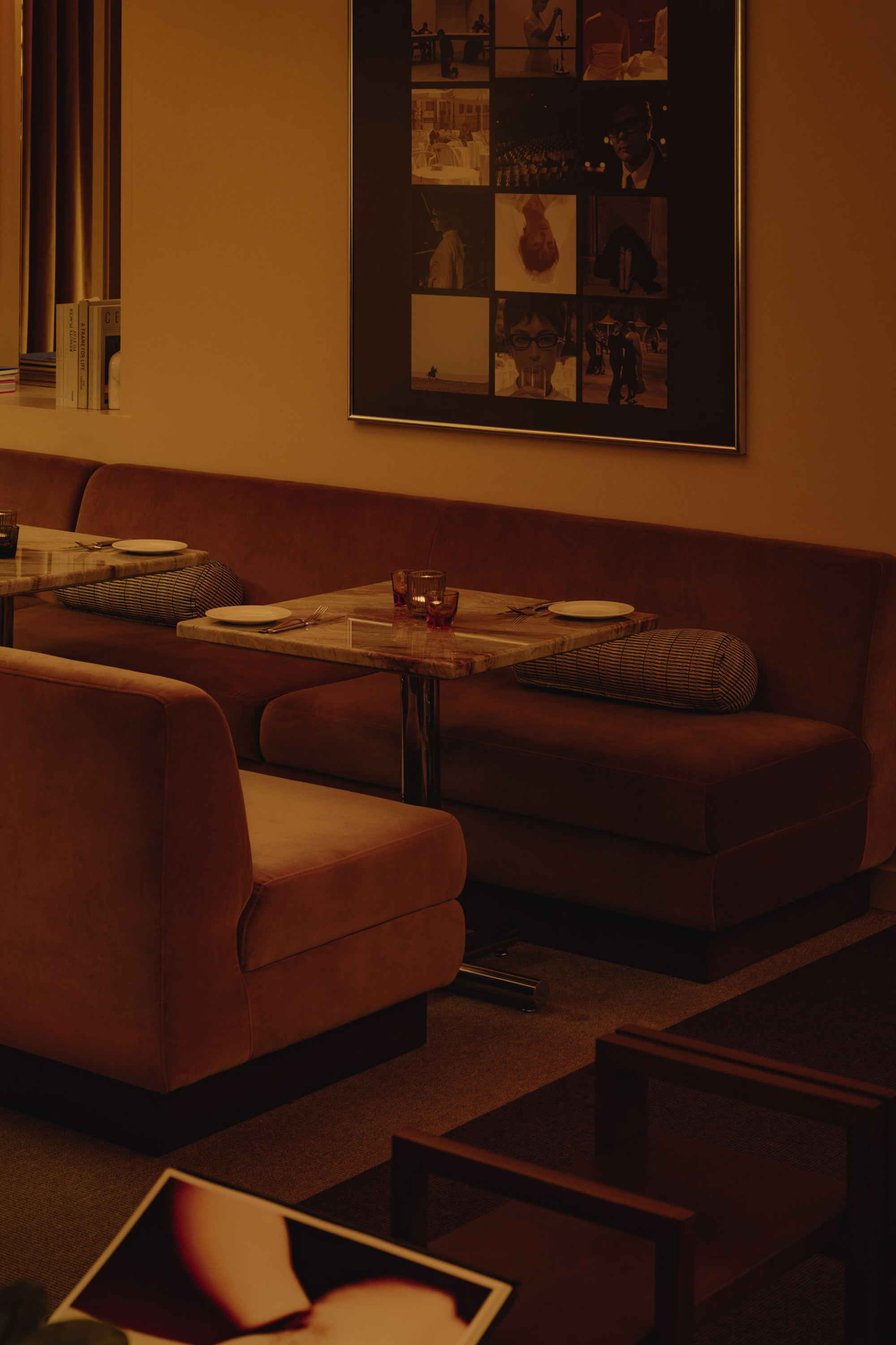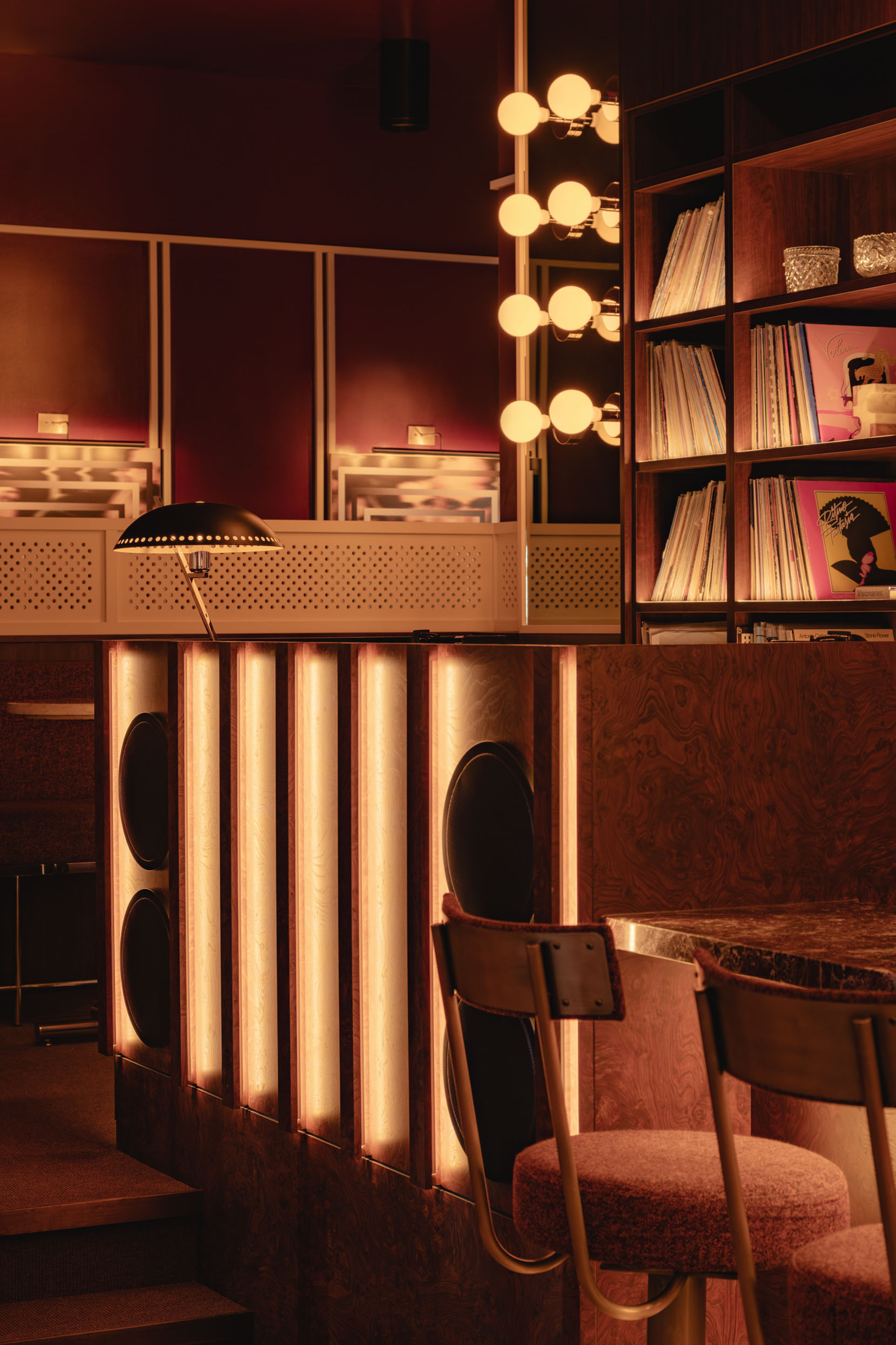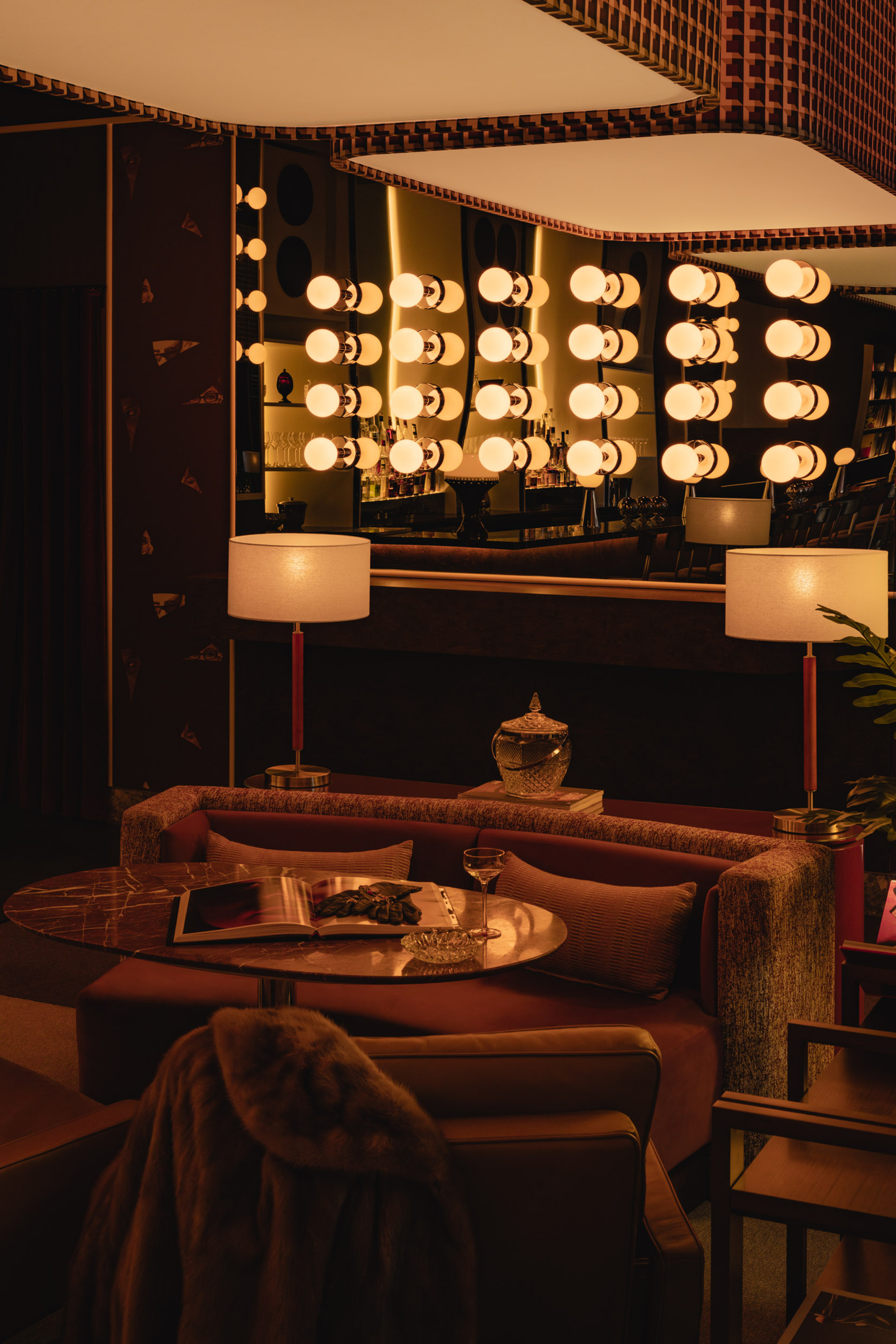 Mimi extends the sequence into the later hours with an environment structured around cinematic references and an up-tempo vibe. The palette combines deep browns, glossy reds, amber tones, Rosso Rubino marble, and chrome detailing while custom burnt orange velvet sofas, reminiscent of 1960s sunken lounges, and monolithic burled walnut panels line the space. The lighting program, anchored by a repetition of large capsule pendants, produces a consistent low glow across the space. Artwork nods to Italo disco and iconic cinema, while the L-Acoustics system fills the room with a curated soundtrack of vintage soul, jazz, deep disco, and sometimes features Chef Daniel stepping in for an impromptu set. Guests drift in late, sipping cocktails under the canopy of warm light, and settle into the rhythm of the room as night unfolds. The cocktail and snack menus extend into the night, allowing the space to operate as a lounge, informal performance setting, and after-hours bar within a single footprint.