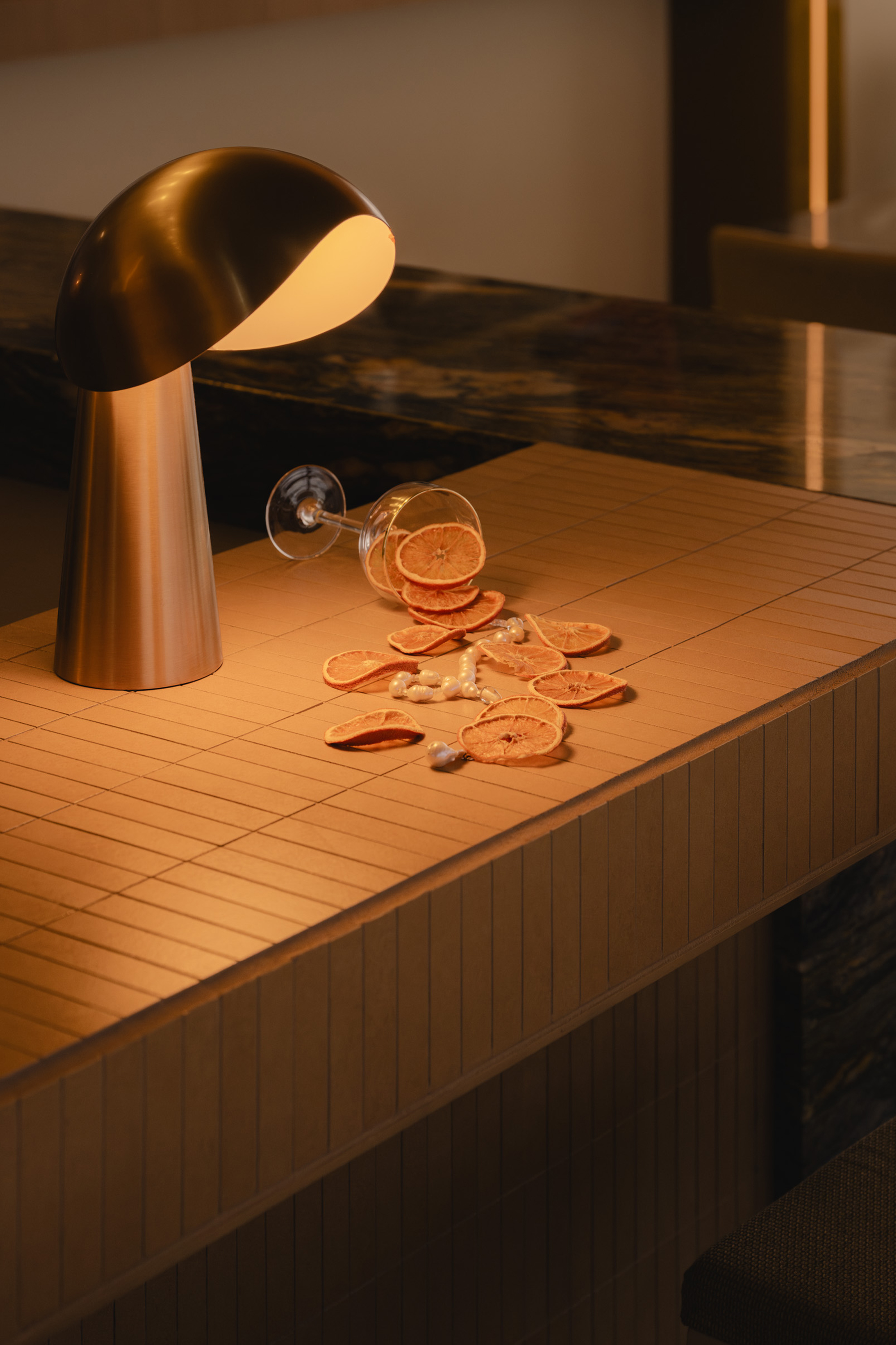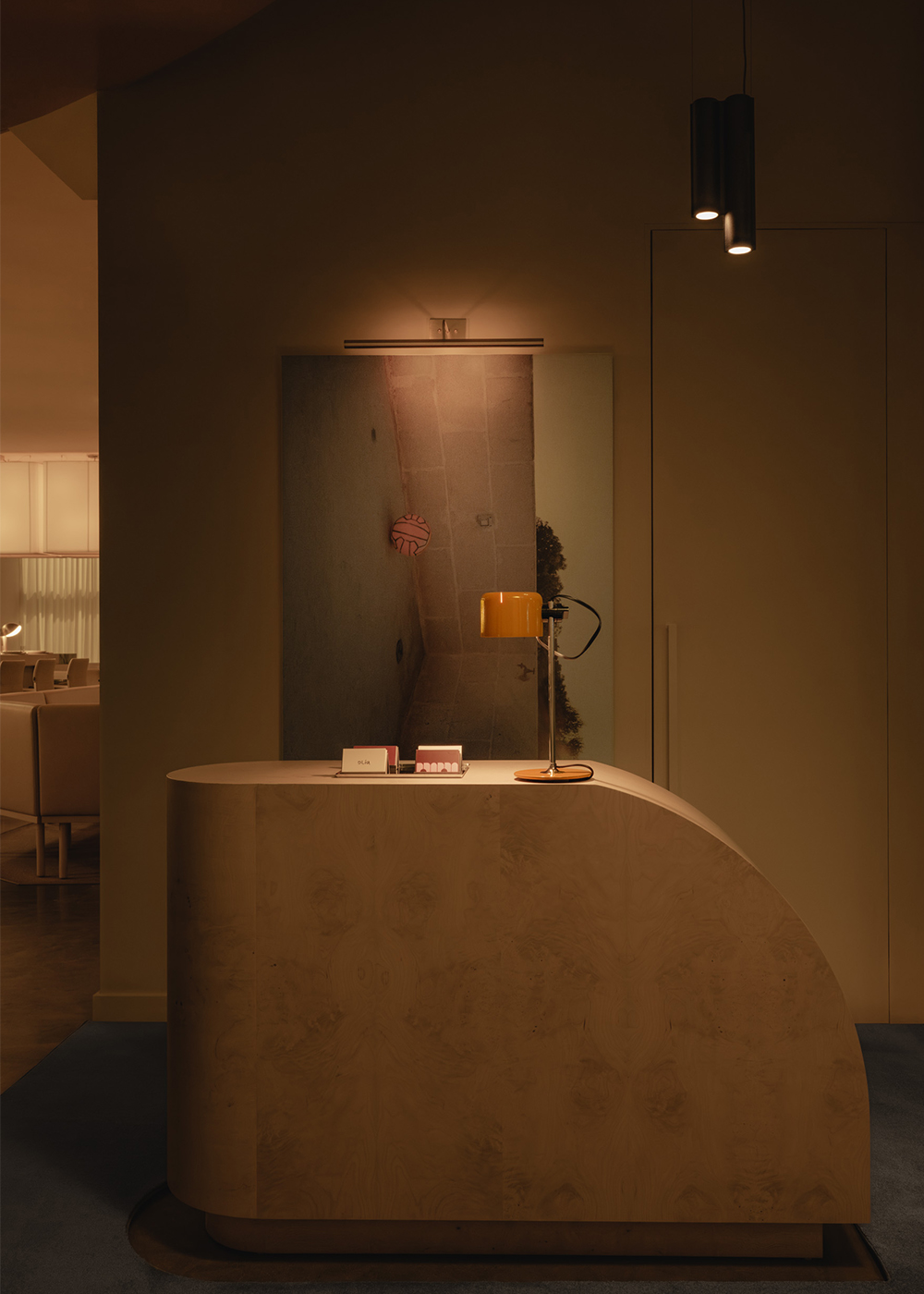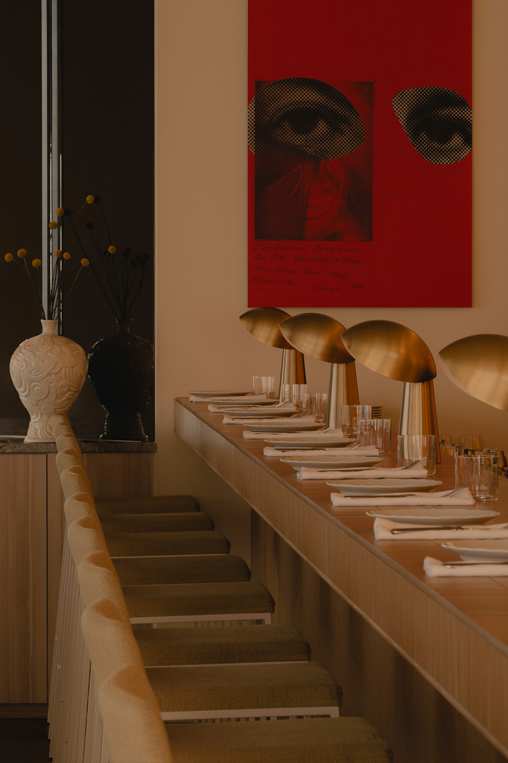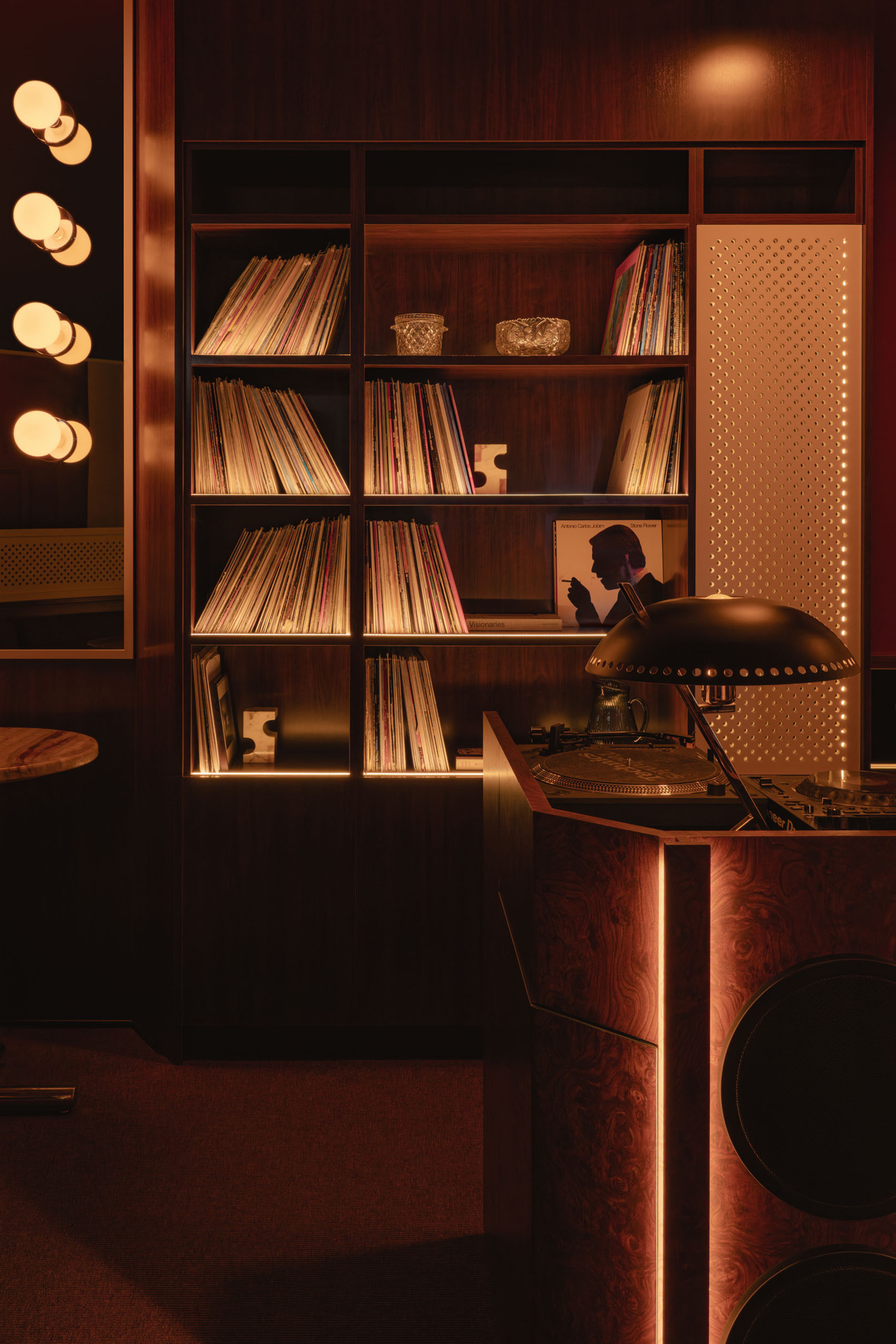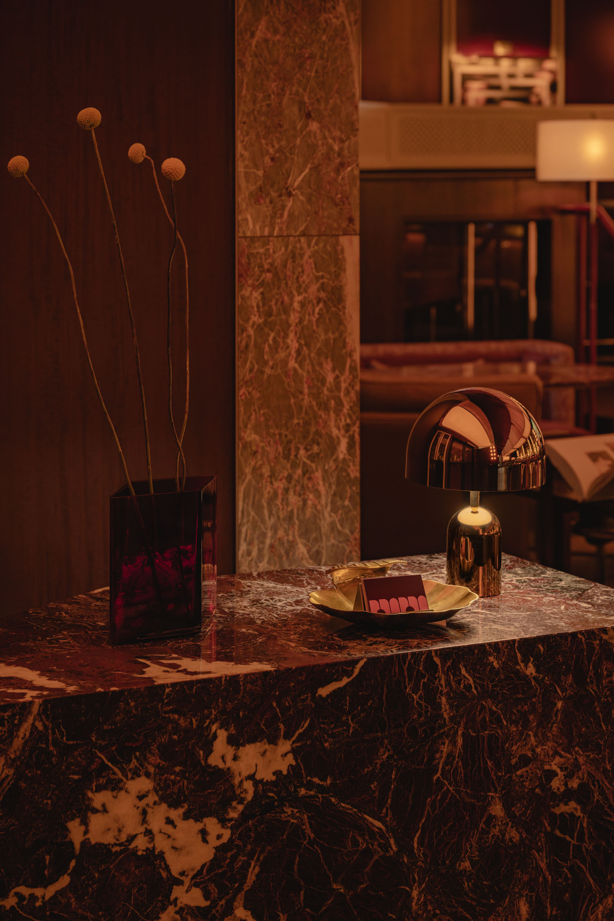 Mimi extends the sequence into the later hours with an environment structured around cinematic references and an up-tempo vibe. The palette combines deep browns, glossy reds, amber tones, Rosso Rubino marble, and chrome detailing while custom burnt orange velvet sofas, reminiscent of 1960s sunken lounges, and monolithic burled walnut panels line the space. The lighting program, anchored by a repetition of large capsule pendants, produces a consistent low glow across the space. Artwork nods to Italo disco and iconic cinema, while the L-Acoustics system fills the room with a curated soundtrack of vintage soul, jazz, deep disco, and sometimes features Chef Daniel stepping in for an impromptu set. Guests drift in late, sipping cocktails under the canopy of warm light, and settle into the rhythm of the room as night unfolds. The cocktail and snack menus extend into the night, allowing the space to operate as a lounge, informal performance setting, and after-hours bar within a single footprint.
