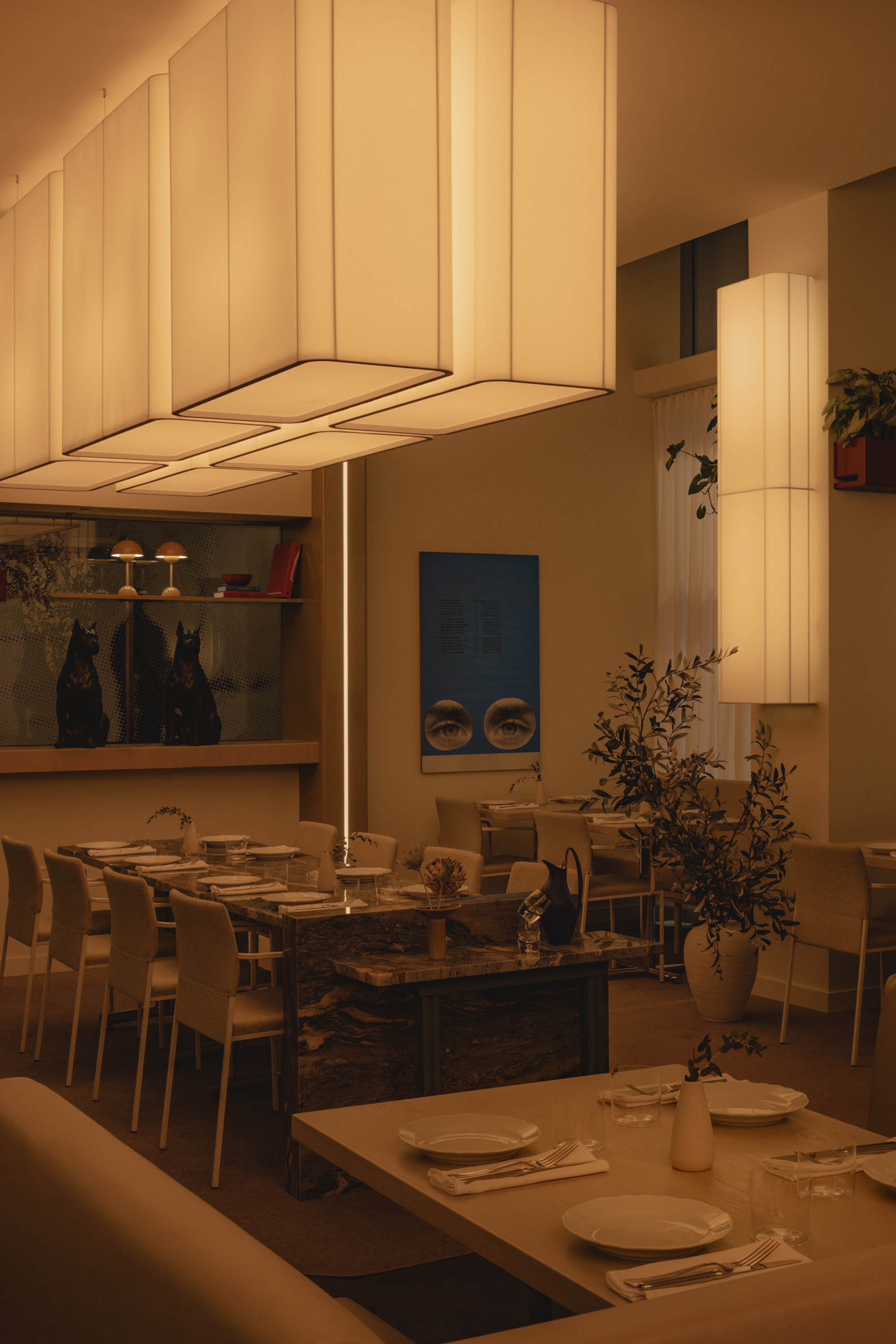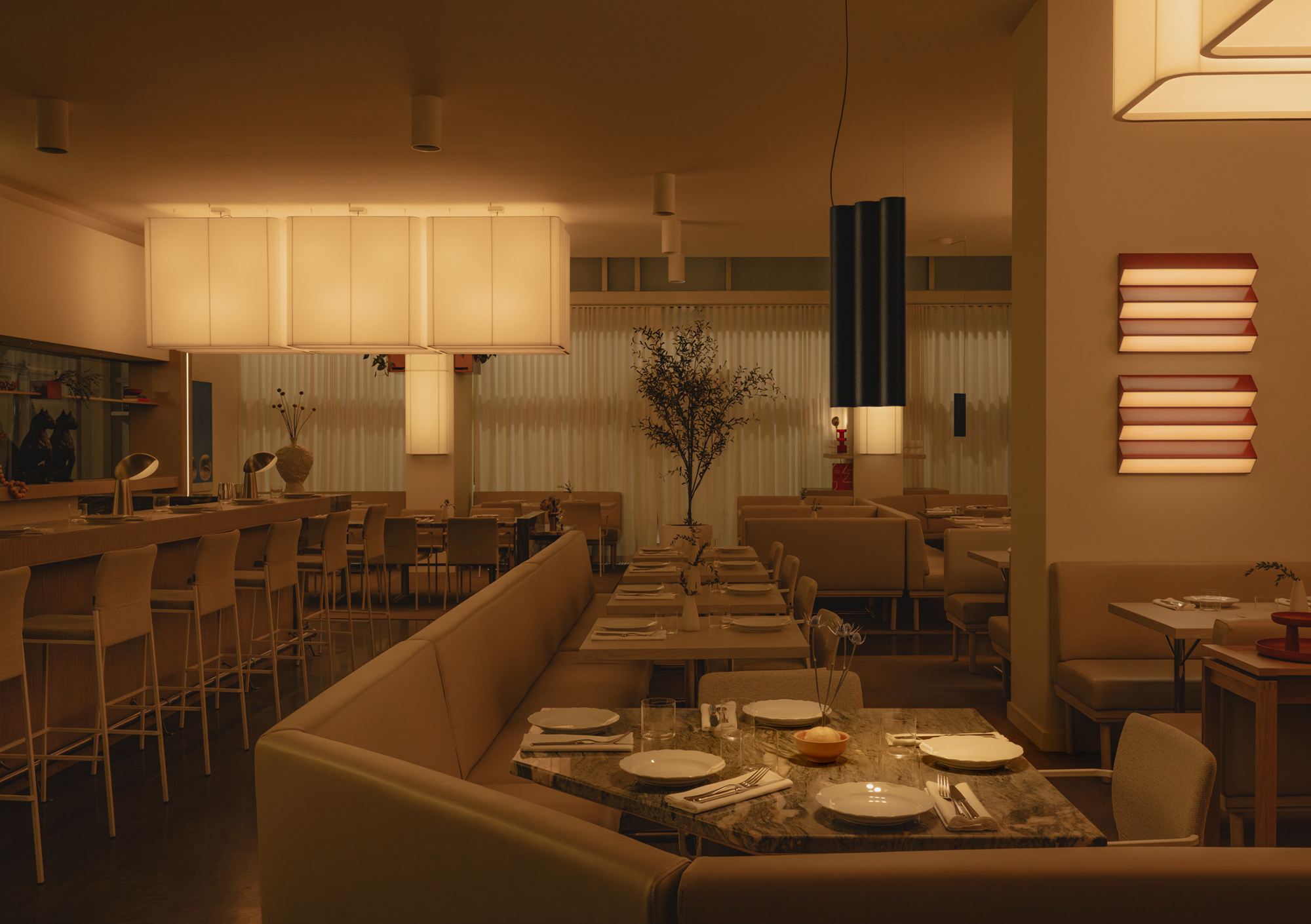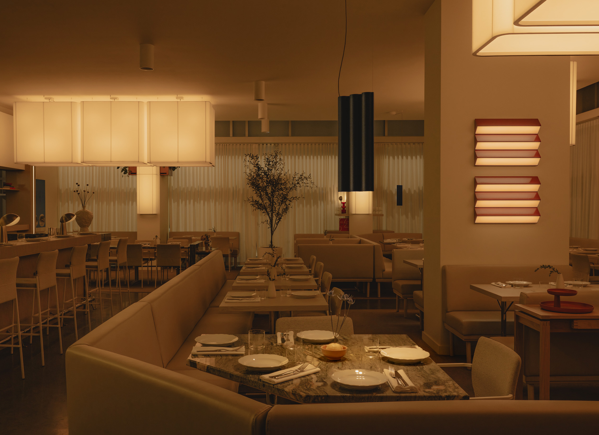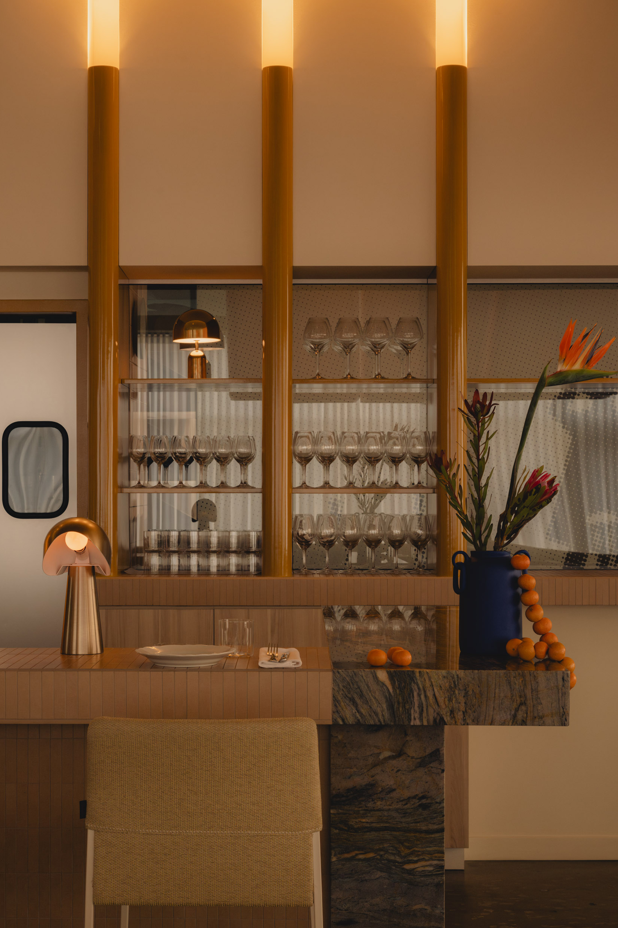 Olia introduces a slower tempo and warmer palette, supporting extended evenings and shared conversation over a simple, seasonal menu inspired by the rich culinary traditions of Italy. Designed as a place to linger, evoking the refined intimacy of a private members’ club, the space is composed of custom Portuguese walnut tables and supple ecru leather benches, polished creamy marble, and high-gloss tawny-toned lacquered cabinetry around a glowing backlit fluted glass bar. Anchored by diffusedoversized custom pendant lights, ambient light shifts, from daylight filtered through sheer drapery to a soft, buttery yellow ambient glow. As the room settles into dusk, light grazes across polished surfaces and quiet corners to subtly adjust the mood without interruption. Sculptural accent lighting and custom artwork add pops of colour, texture and rhythm, to contribute to the space’s layered composition and support its gradual transition from daytime vibrancy to evening calm.