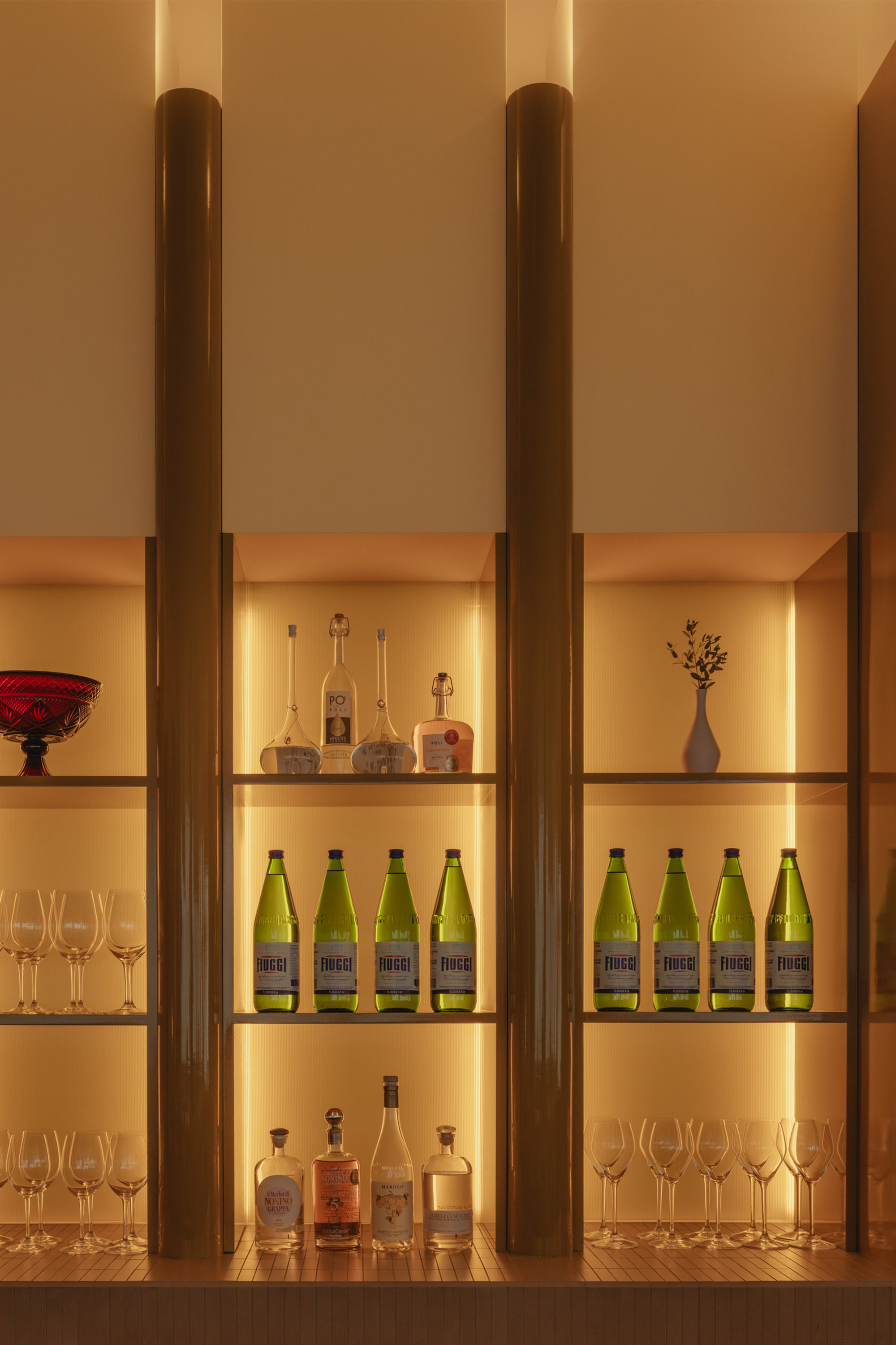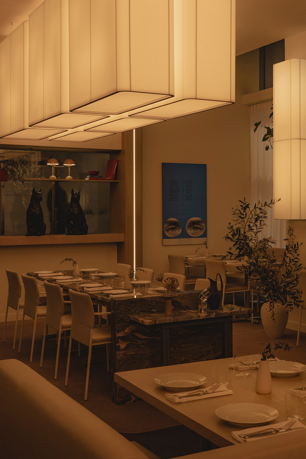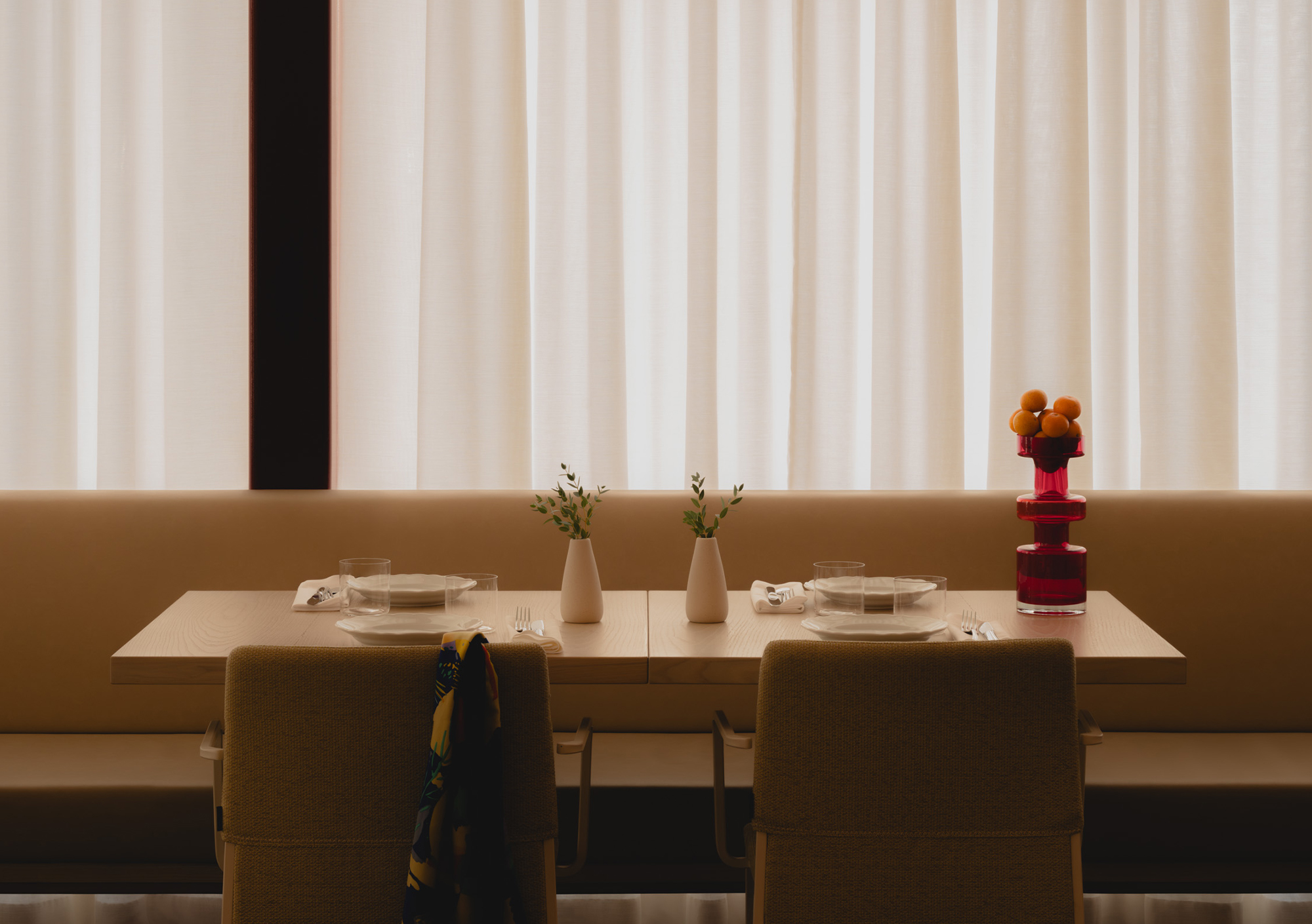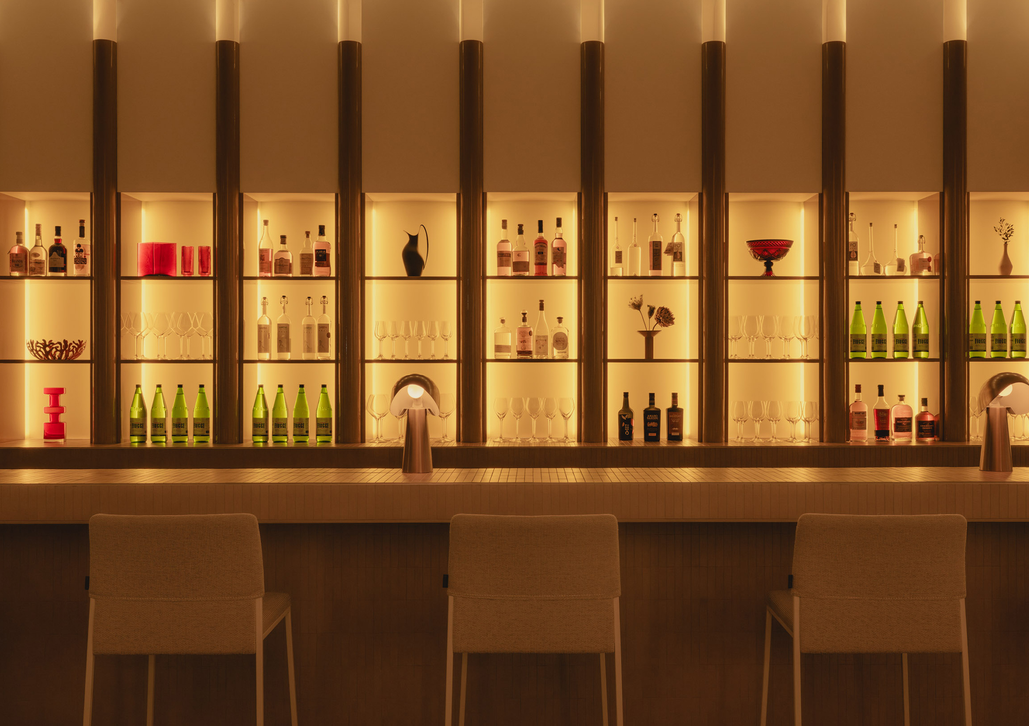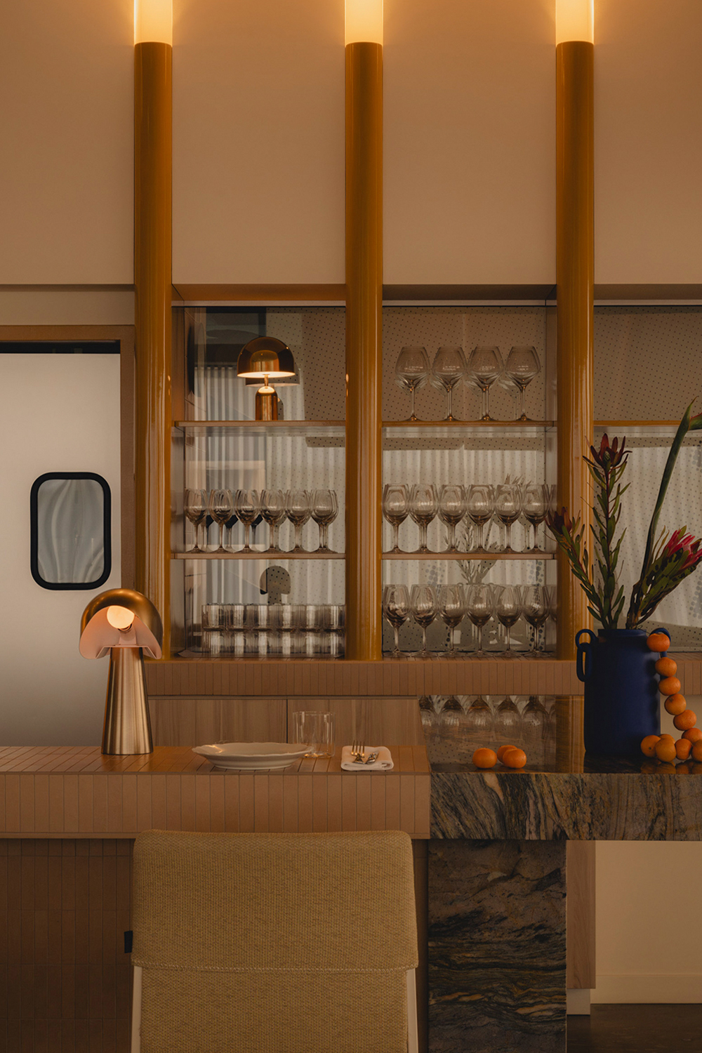Olia introduces a slower tempo and warmer palette, supporting extended evenings and shared conversation over a simple, seasonal menu inspired by the rich culinary traditions of Italy. Designed as a place to linger, evoking the refined intimacy of a private members’ club, the space is composed of custom Portuguese walnut tables and supple ecru leather benches, polished creamy marble, and high-gloss tawny-toned lacquered cabinetry around a glowing backlit fluted glass bar. Anchored by diffusedoversized custom pendant lights, ambient light shifts, from daylight filtered through sheer drapery to a soft, buttery yellow ambient glow. As the room settles into dusk, light grazes across polished surfaces and quiet corners to subtly adjust the mood without interruption. Sculptural accent lighting and custom artwork add pops of colour, texture and rhythm, to contribute to the space’s layered composition and support its gradual transition from daytime vibrancy to evening calm.