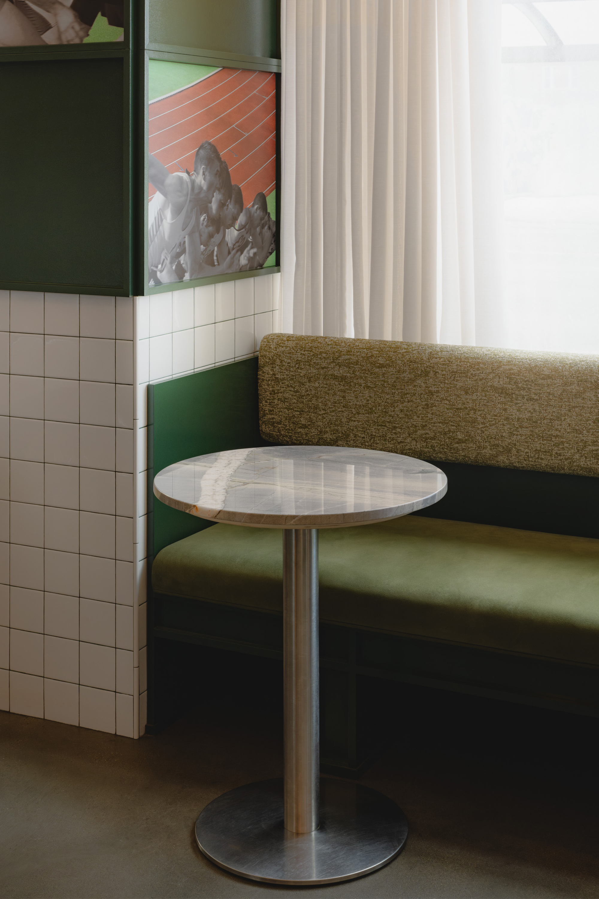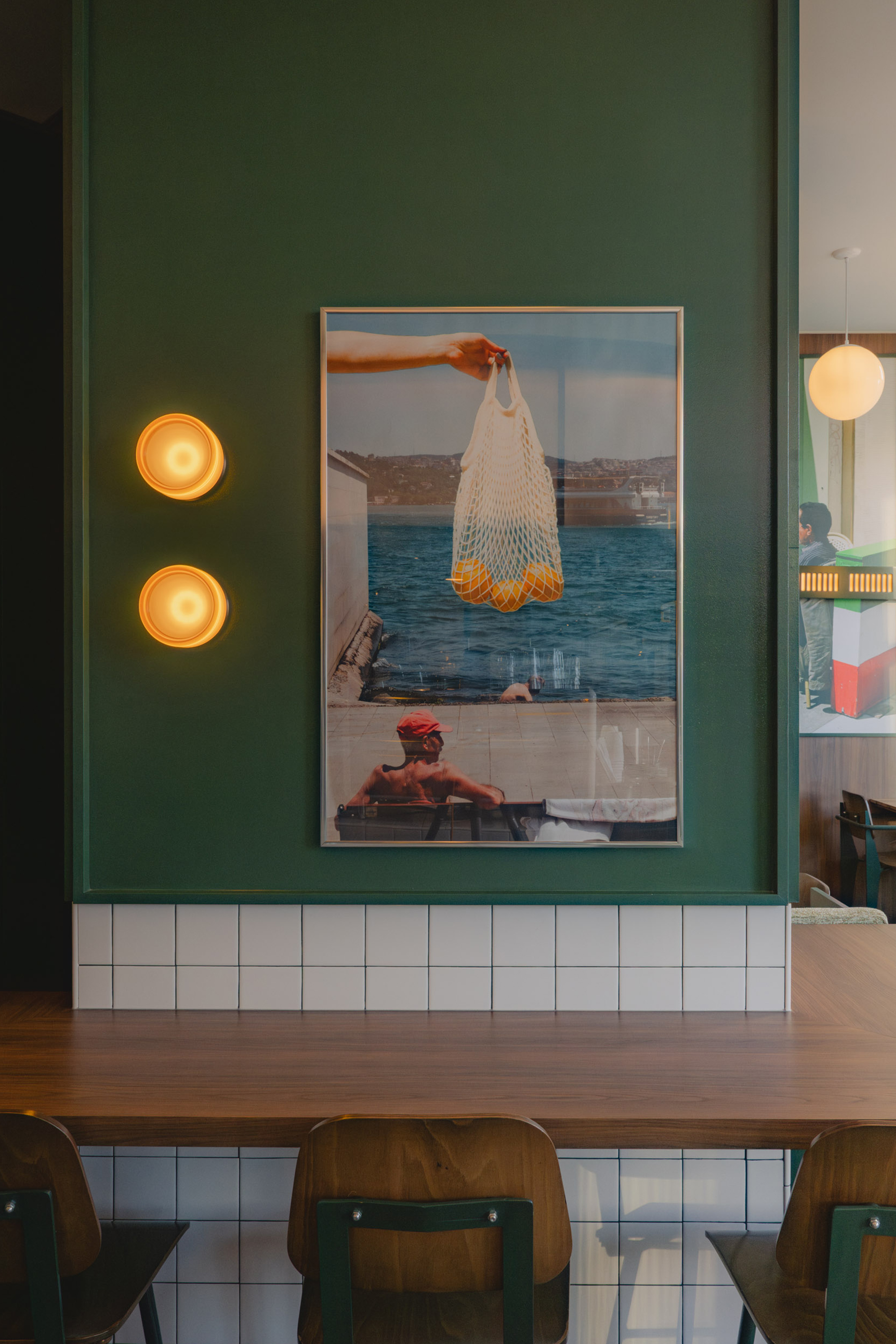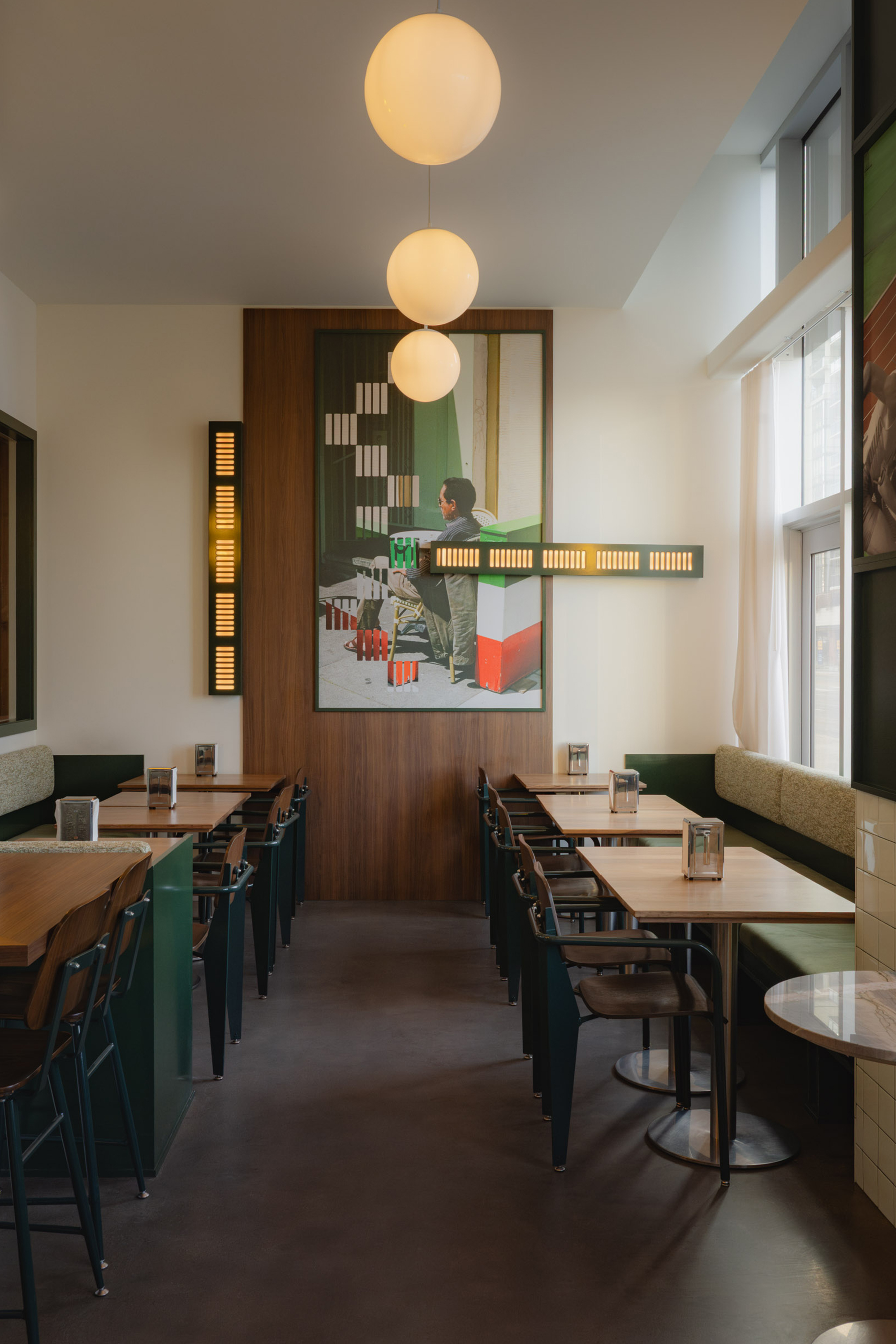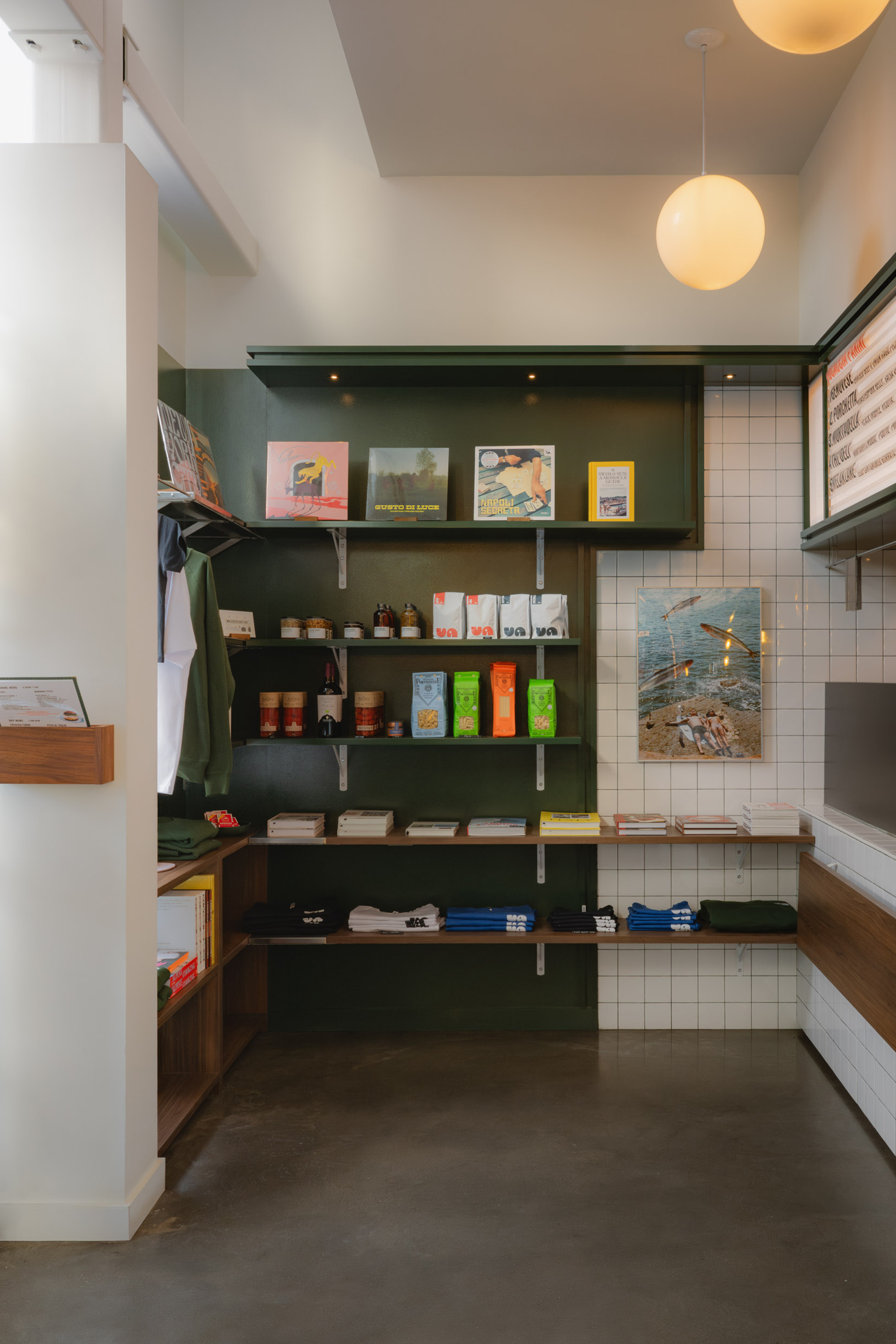 Va!, named for the Italian word “go,” draws from the tradition of Roman fornos and caffès. The design balances practical durability with visual familiarity: stainless steel surfaces, natural walnut, green-and-white ceramic tiles, and high-gloss painted finishes. The art programme, featuring custom in-house made collages, integrating Chef Daniel’s photography introduces a personal reference within the space. Curated shelving displays vinyl records, Italian pantry staples, and curated merchandise while the menu featuring familiar Italian flavors without formality and a distinct coLee program. The layout invites pause or pace, whether grabbing a slice after work, browsing records while a caffè is poured, or meeting a friend before the day begins.