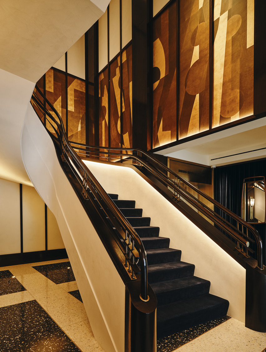 The design has the hallmarks of David Collins Studio design (glamour, texture, drama) but an added depth of soul comes from the inclusion of a 30ft mural by decorative artist Dean Barger. It greets you as you walk in, leads you up the stairs and into the main room. It’s a maItre d in artwork form. David Collins Studio brought a unique energy and tactility to the project.