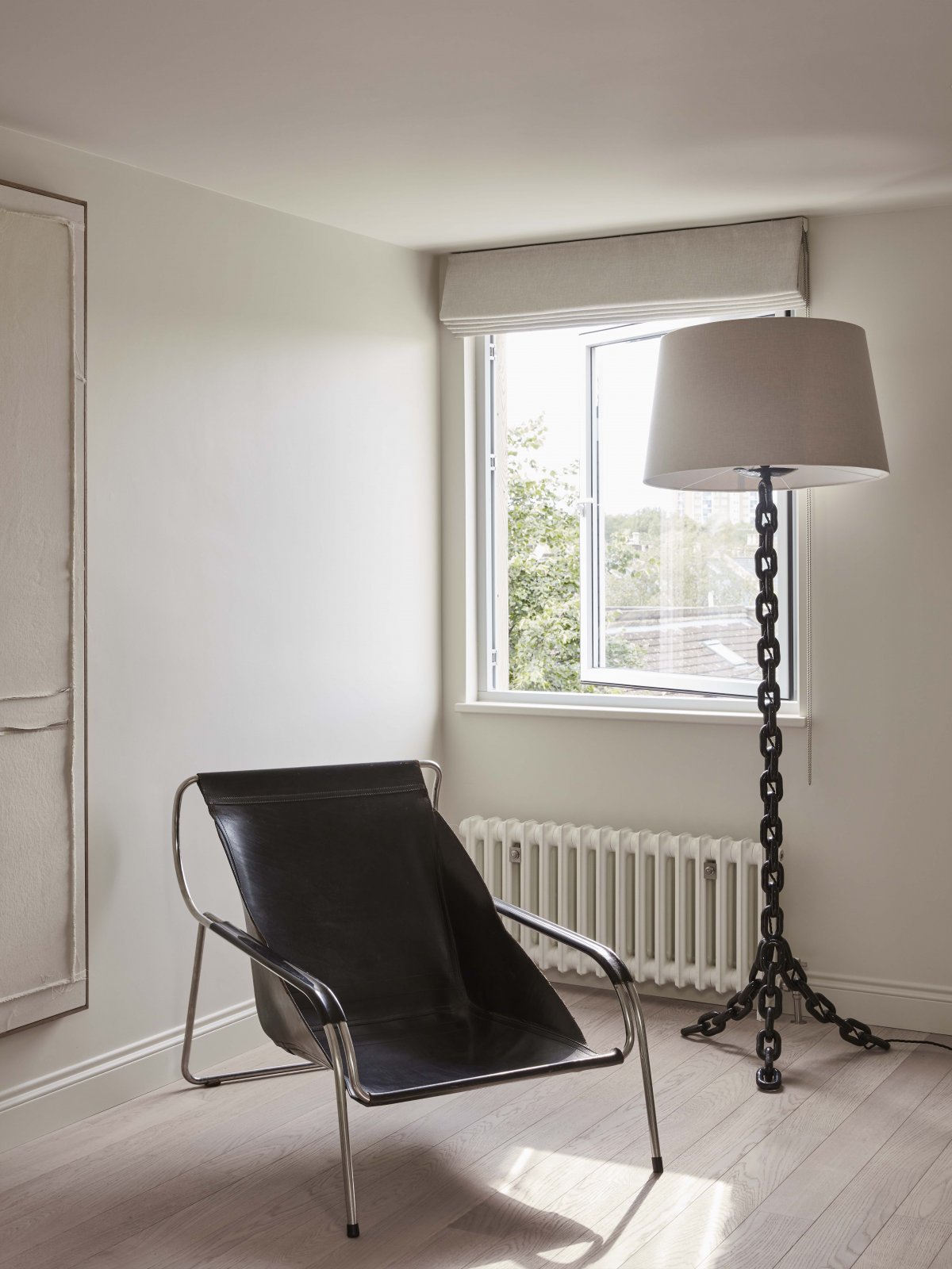 The Ground floor lounge and study is appropriated as a traditional Victorian house with careful consideration to materials and tonality. Walls are reserved in soft cream tones, with restored cornicing and new white oiled oak flooring throughout. Modern bathrooms floors are tiled in English limestone and paired with hand-finished tadelakt walls. The Upper floors are more contemporary with a loft extension awash with natural daylight and generous storage.
