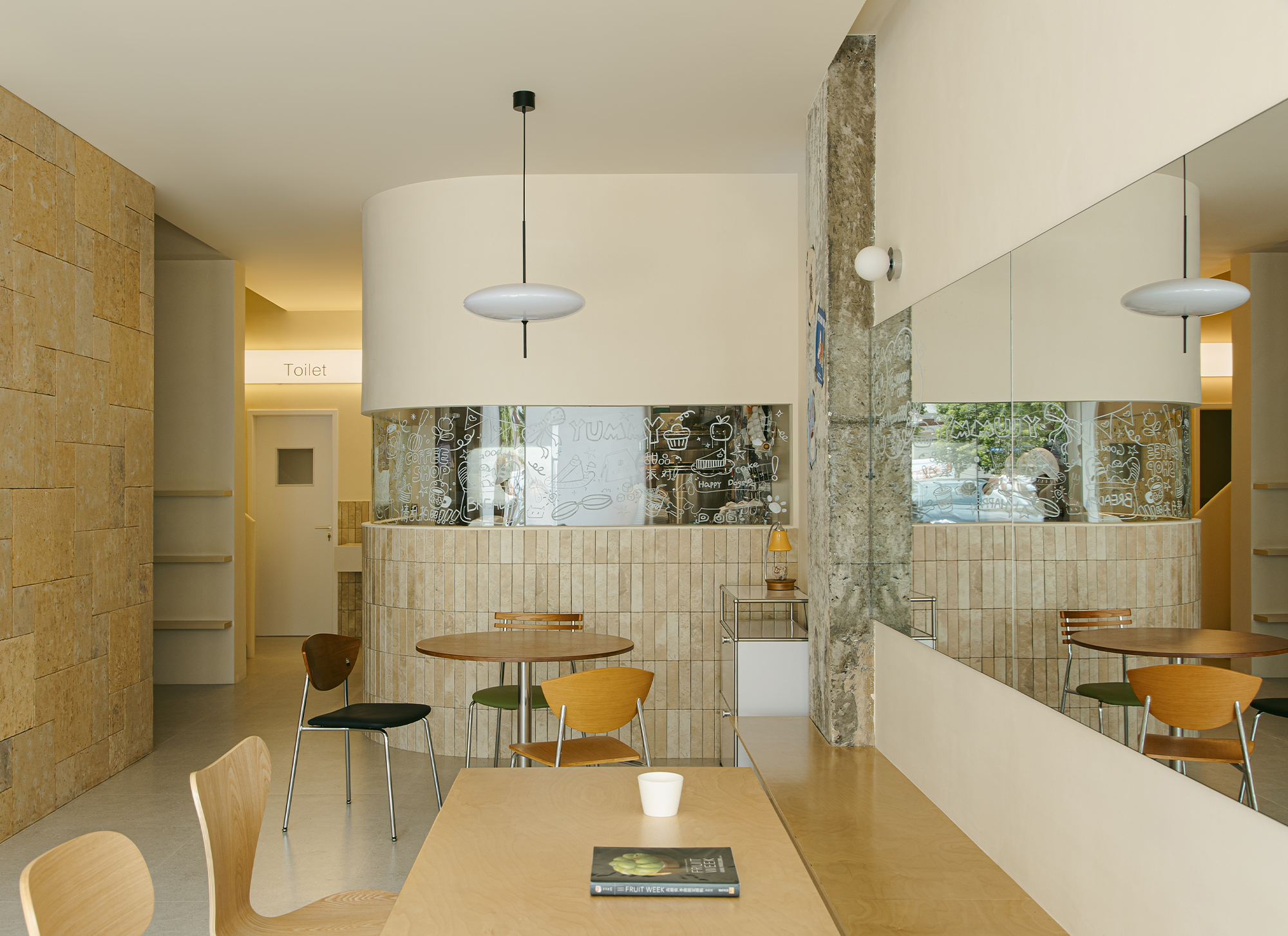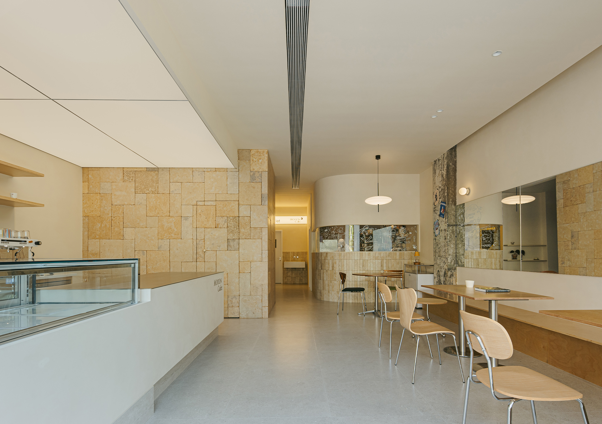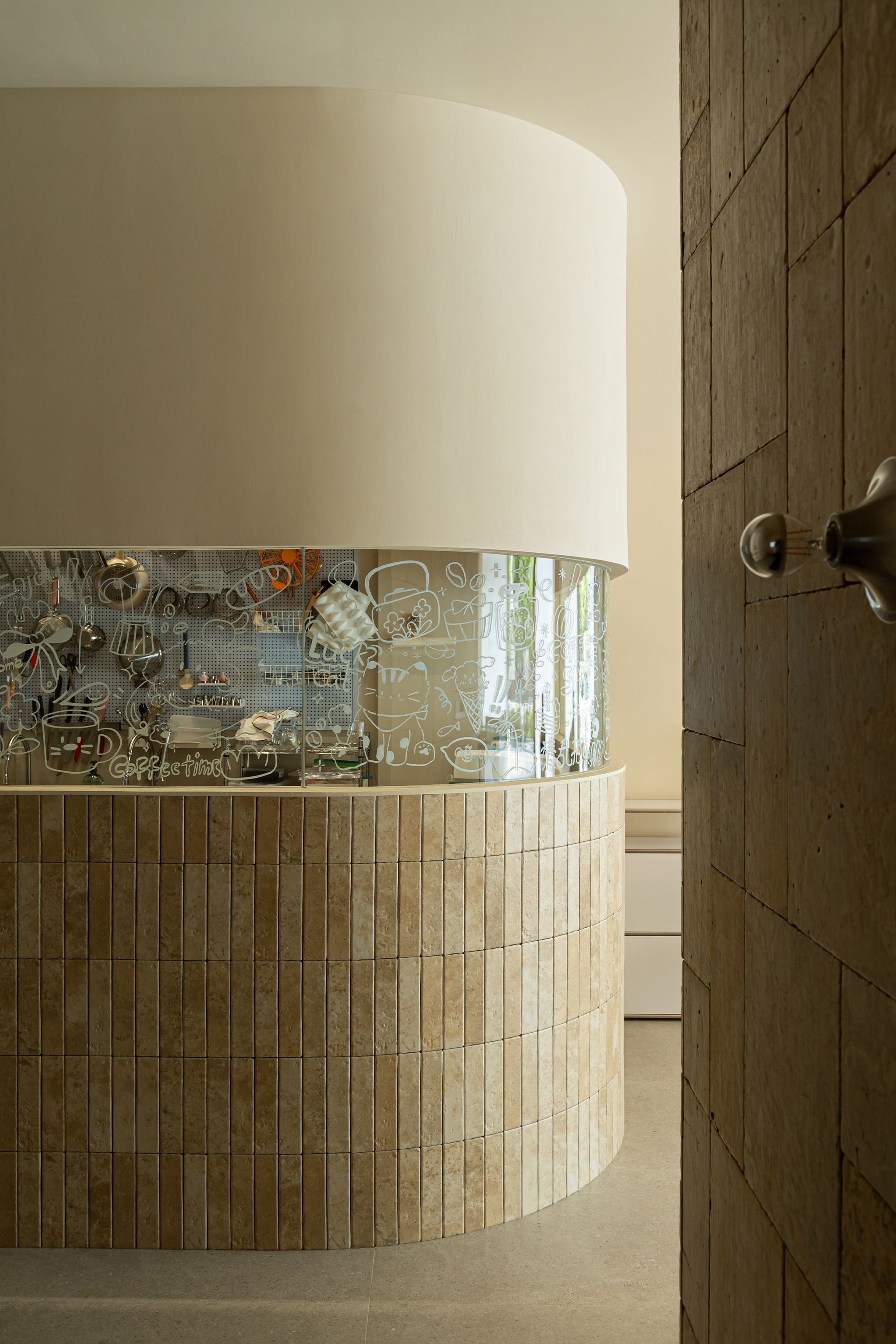 The semi-circular arc design of the dessert workshop breaks the stiffness of the square shape. The semi-circular shape resembles a macaron that has taken a bite. The splicing of different materials in the upper and lower sections not only distinguishes functional areas but also creates a visual rhythm.