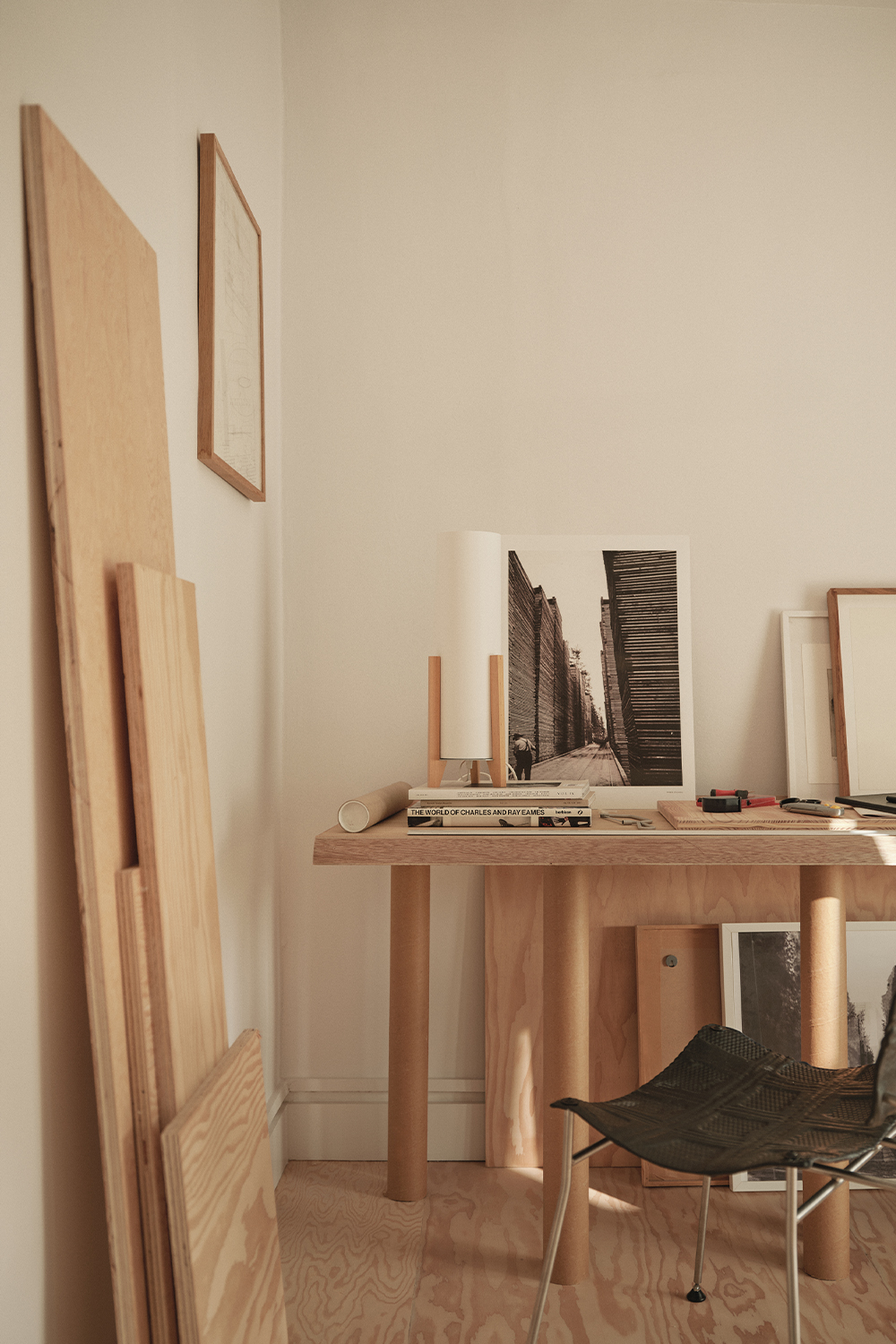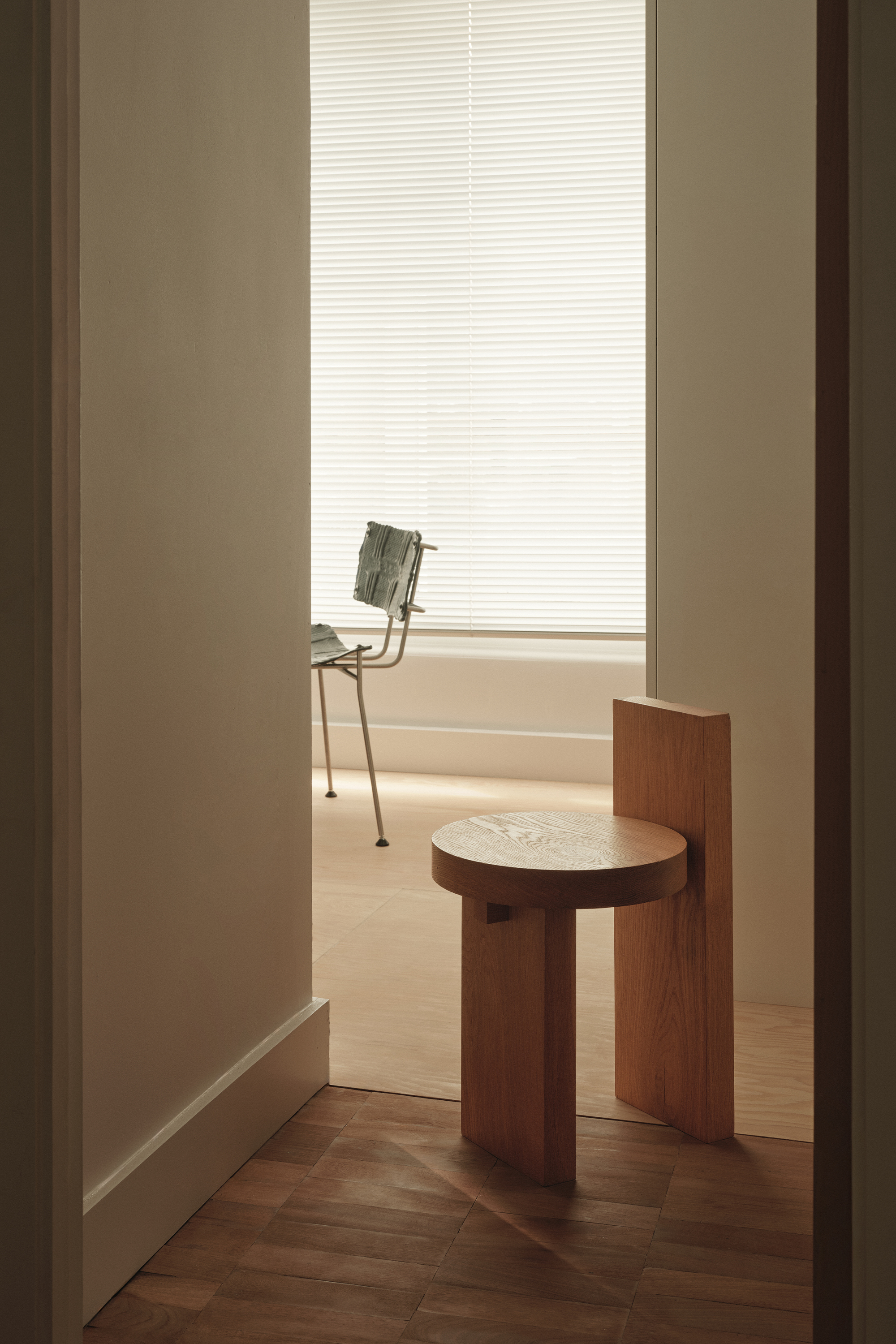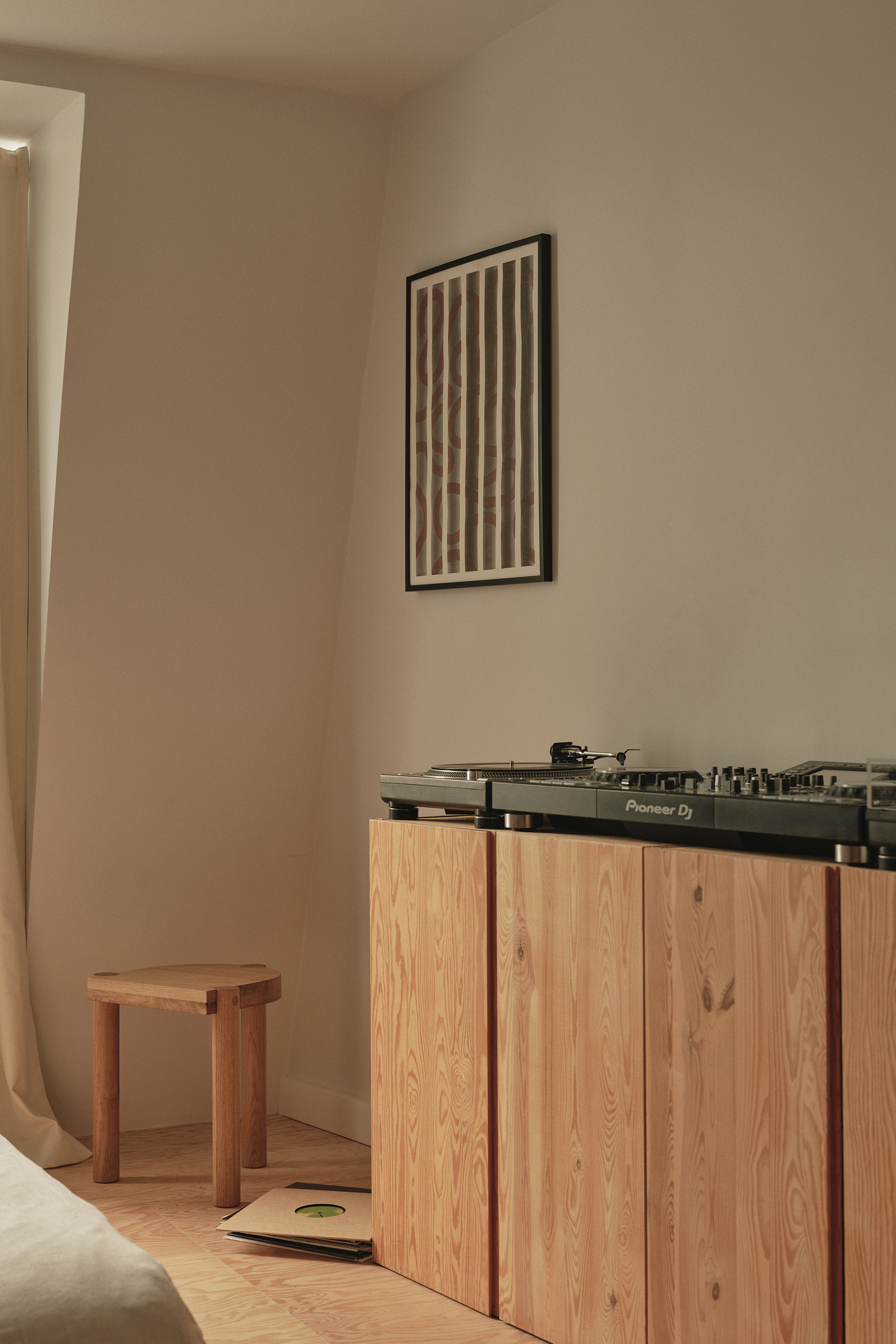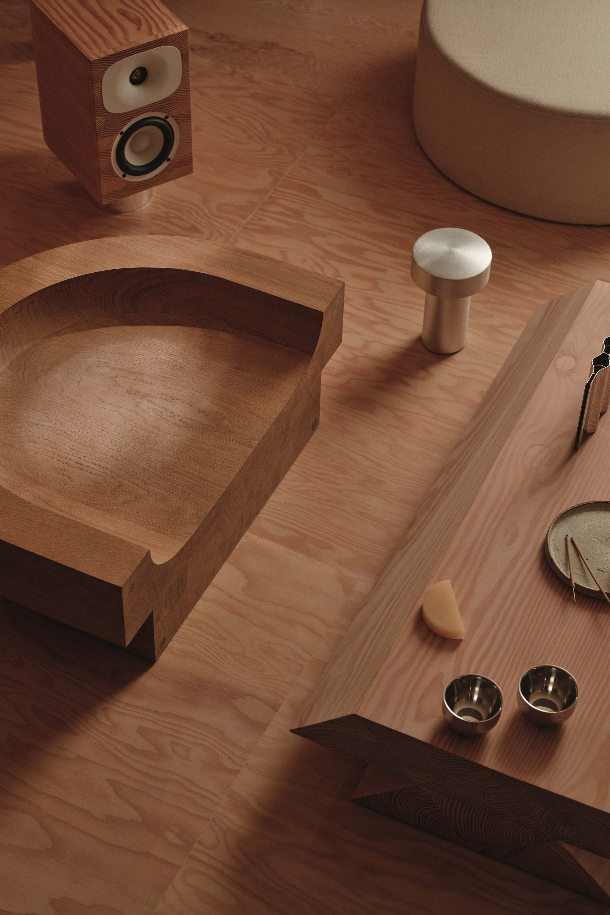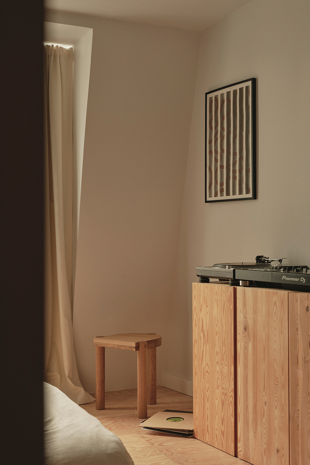The main bedroom opens up to the kitchen through a full height sliding door where borrowed light fills the space. A study connected from the corridor doubles as a place to make, often filled with other discarded materials that are soon to become more experiments. Lastly, the project offered the chance to make new objects and items that are part of Benni’s interest in furniture and music. A stacked coffee table acts as centre-piece and is part of a new collection the studio is developing, while a one-of-a-kind speaker (also in douglas fir) designed with Friendly Pressure and Our Department are a key addition that completes the home... for now.