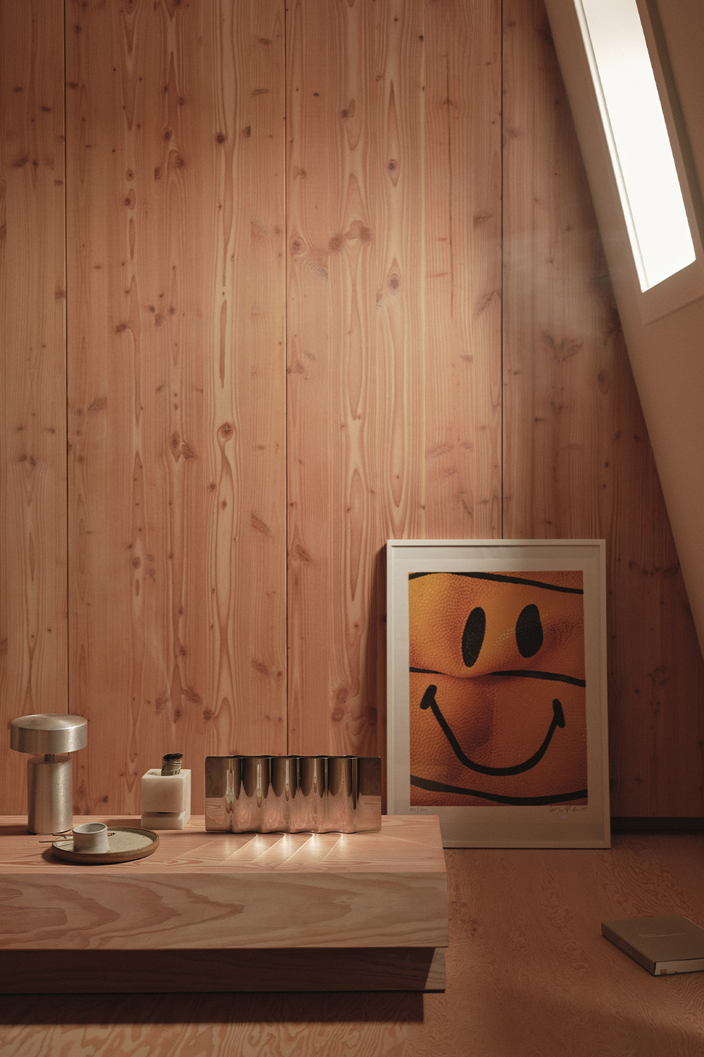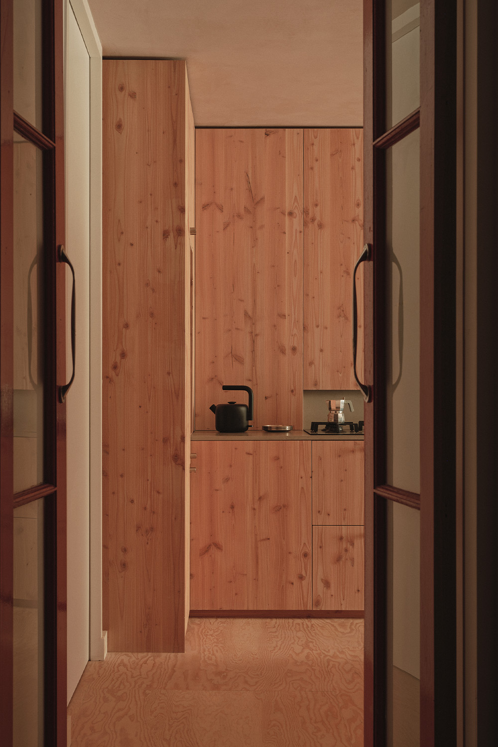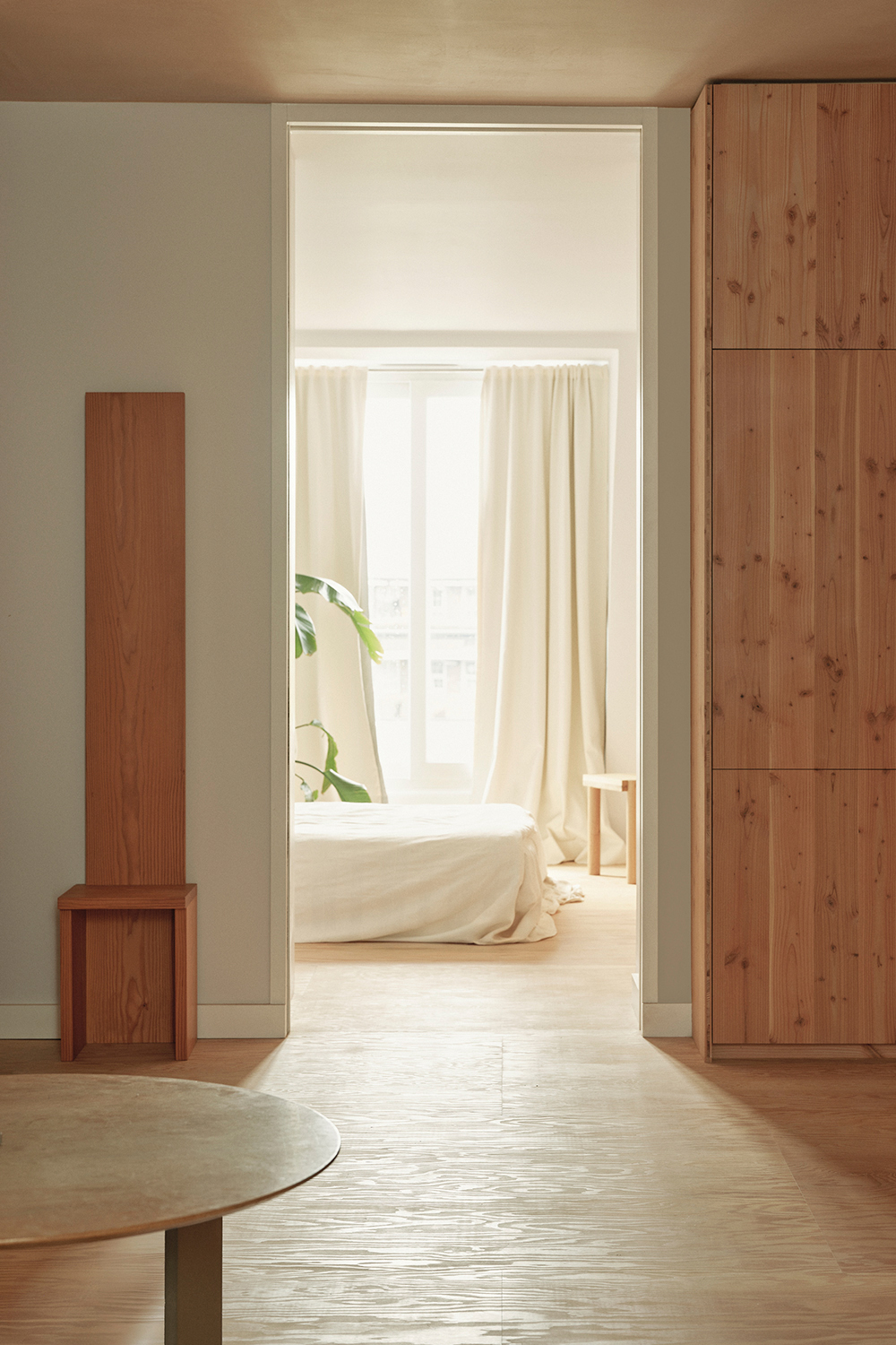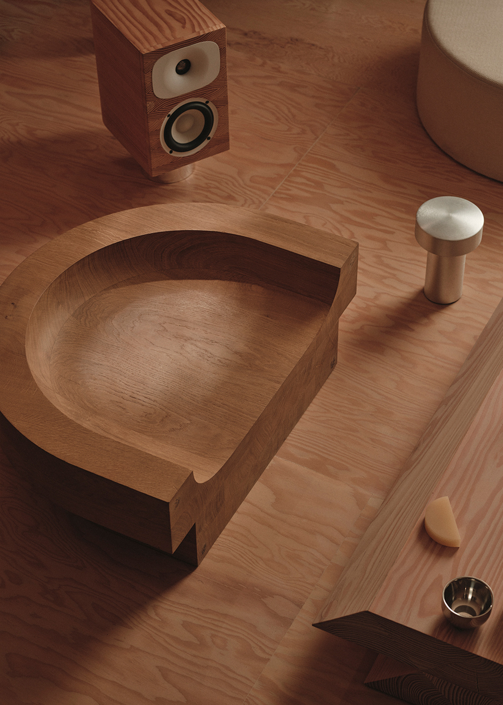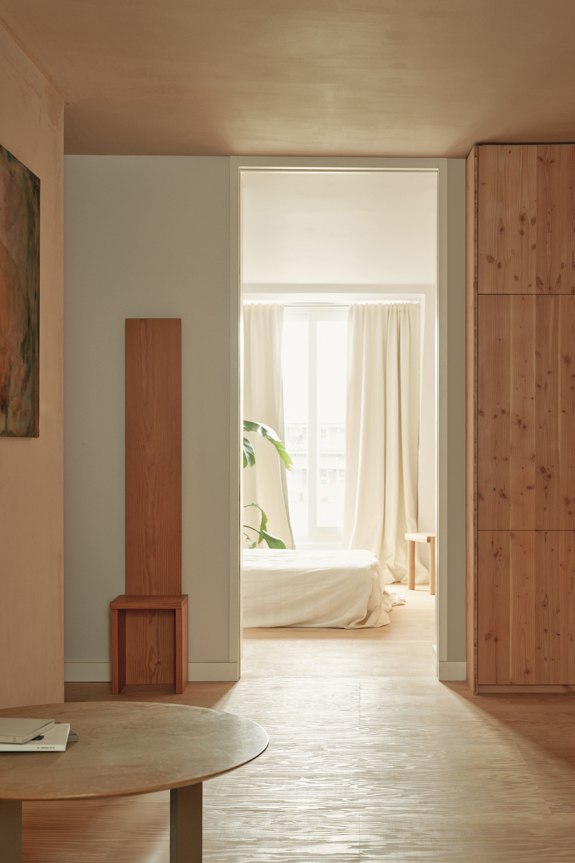 The main bedroom opens up to the kitchen through a full height sliding door where borrowed light fills the space. A study connected from the corridor doubles as a place to make, often filled with other discarded materials that are soon to become more experiments. Lastly, the project offered the chance to make new objects and items that are part of Benni’s interest in furniture and music. A stacked coffee table acts as centre-piece and is part of a new collection the studio is developing, while a one-of-a-kind speaker (also in douglas fir) designed with Friendly Pressure and Our Department are a key addition that completes the home... for now.