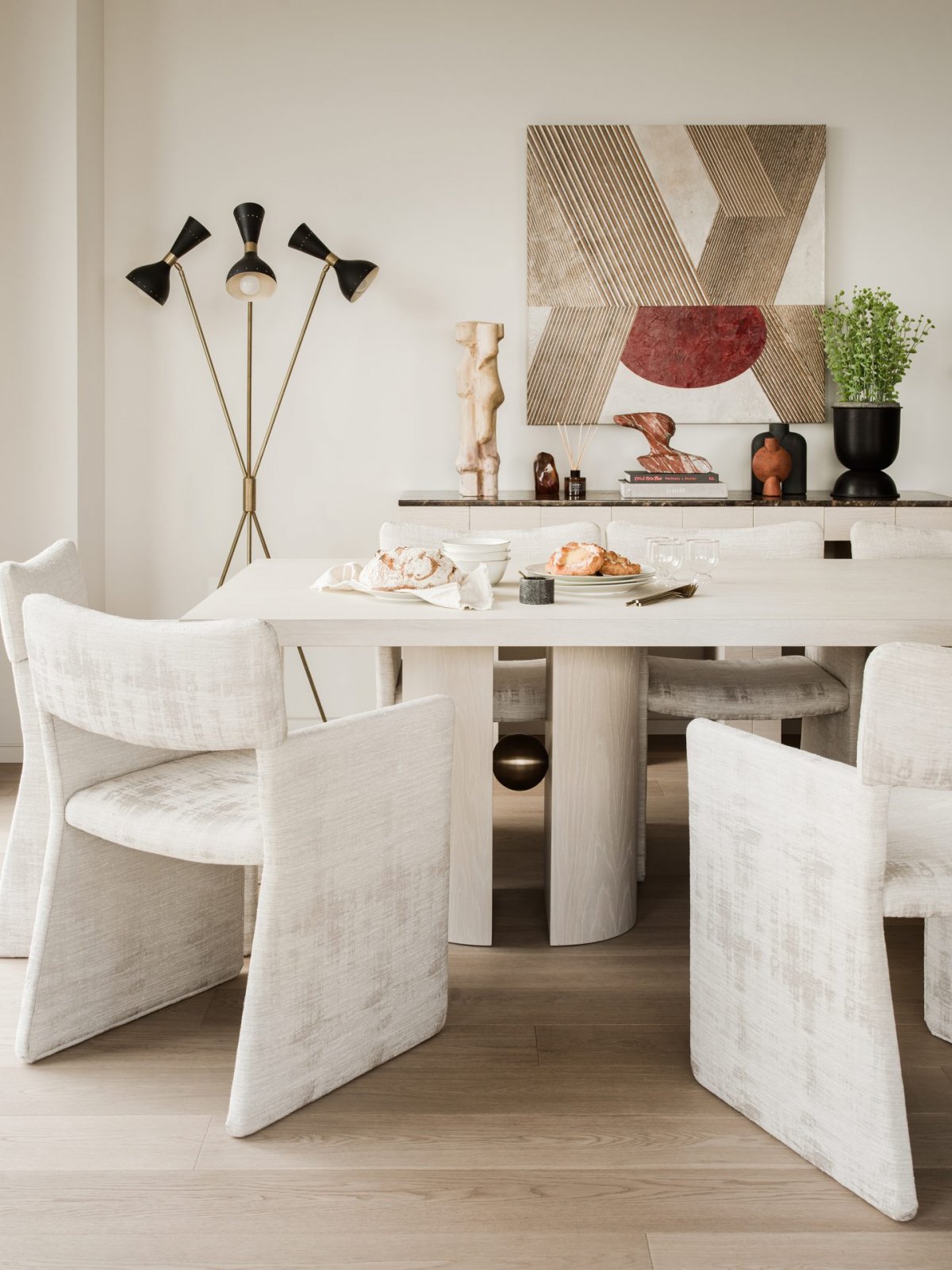 The living room has also been kitted out with a pair of curved cream sofas and a hand-knotted, Himalayan wool and bamboo silk rug; other pieces include a marble and oak console table by a Portuguese maker, and bespoke blonde timber dining table.The colour palette involves burnt oranges and ochres, gold and dark teal, combined with natural textures, velvet and leather.