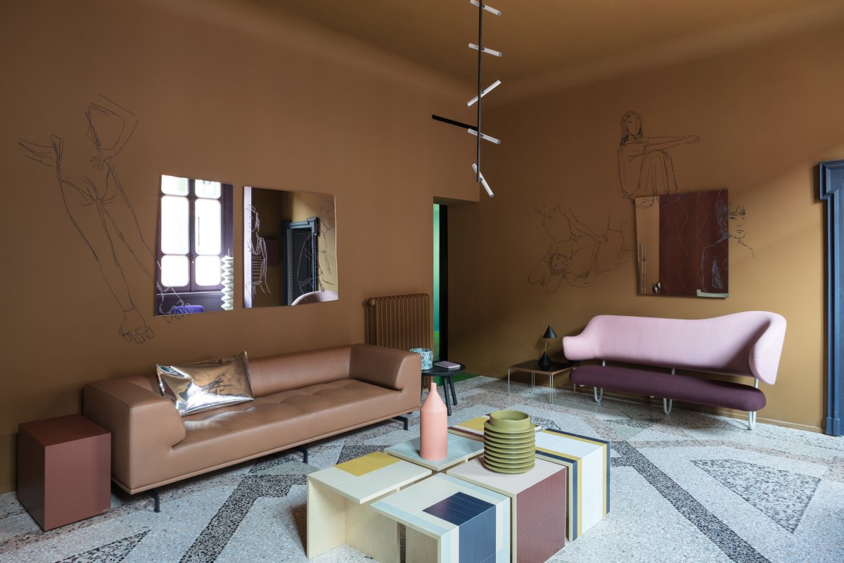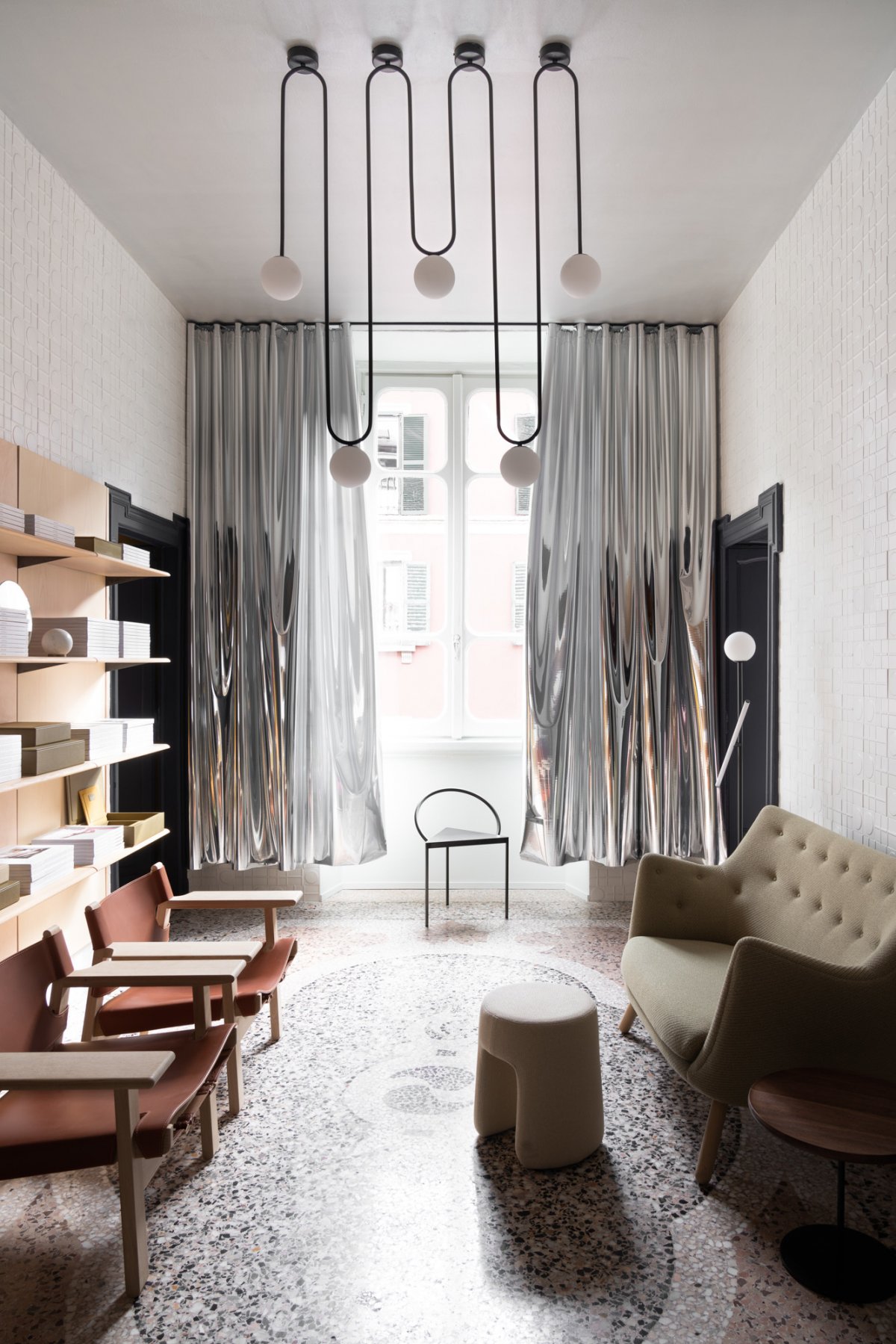 Designed by Elisa Ossino Studio, the interior features a carefully curated medley of objects from a range of Italian and Nordic design houses, exhibiting furniture, lighting, ceramics and art dedicated to the concept of the mirror.