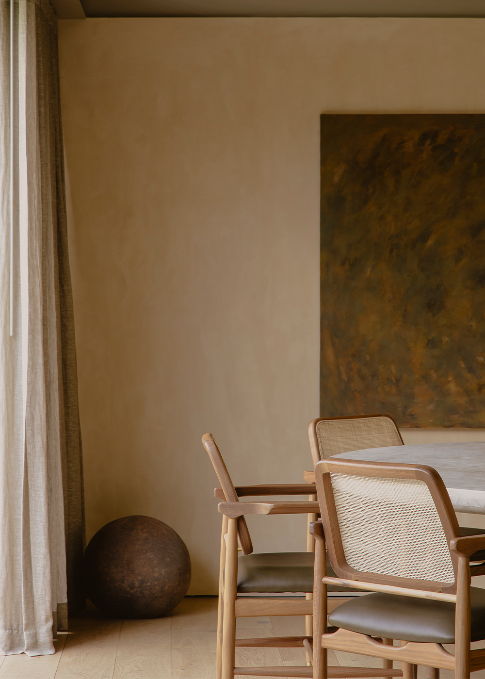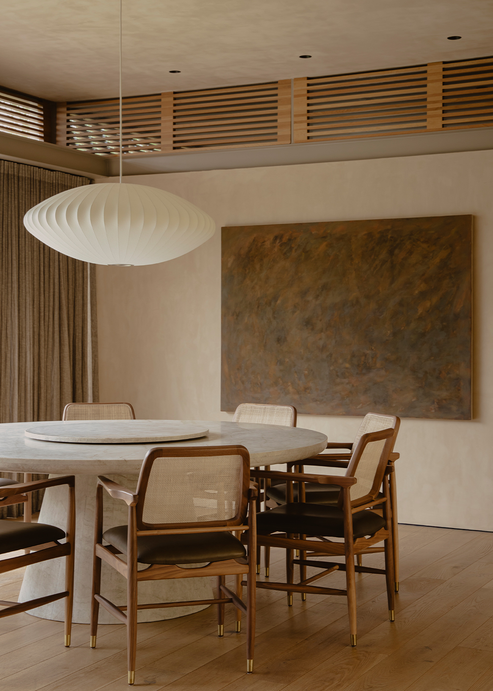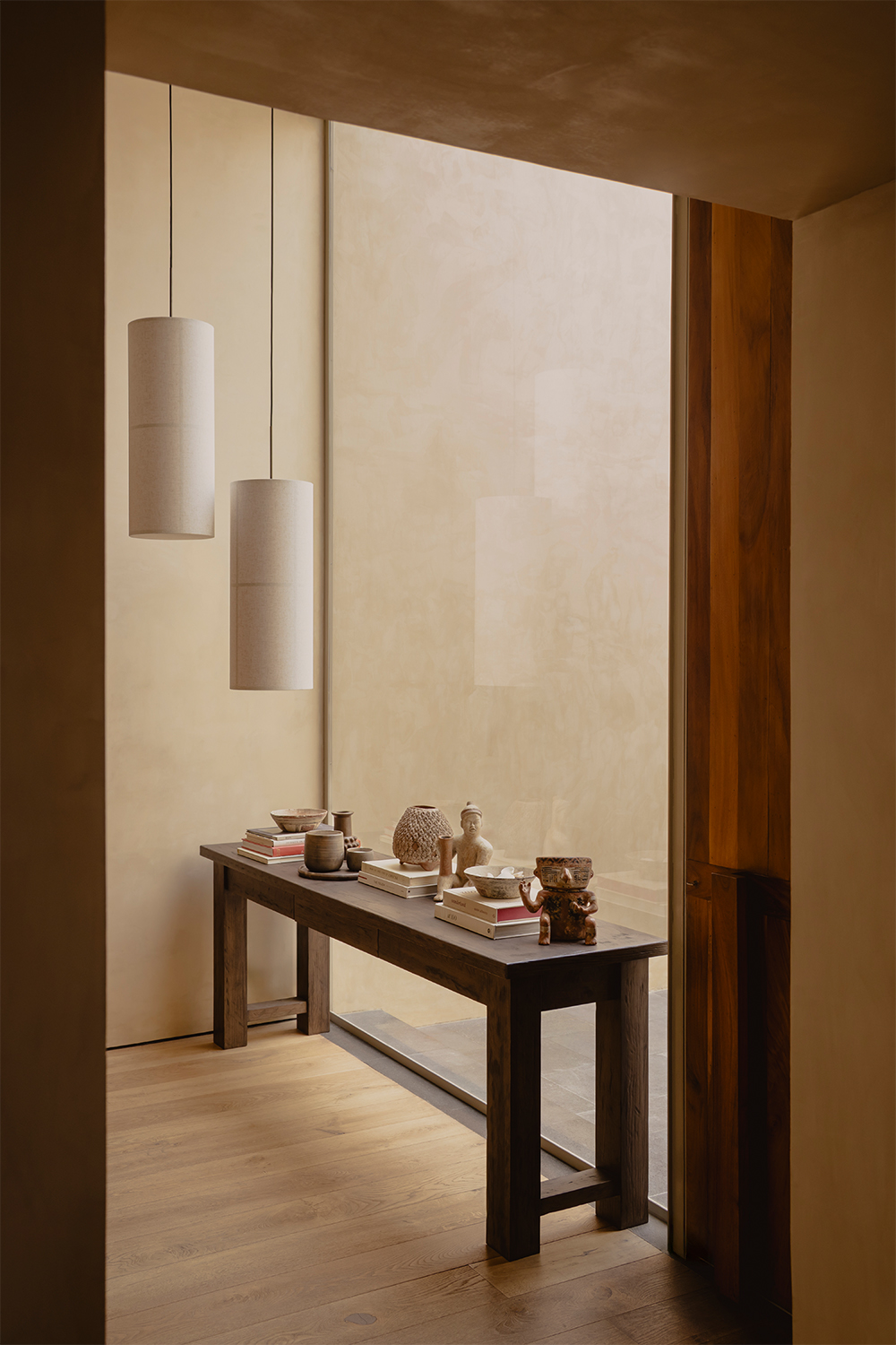 On the entrance level, the family room and master bedroom face the views of the ravine, while on the upper floor, two additional bedrooms with floor-to-ceiling windows frame the landscape and extend the connection with the natural environment. But the meaning of Casa Cañada is also accentuated in its materiality. Linen, solid wood, marble, quartzite and natural fibres were used in their purest form, capturing the changing light of the day and accentuating the warmth of the home. The textures, earth tones and honest surfaces invite you to take off your shoes and feel the living material under your feet.