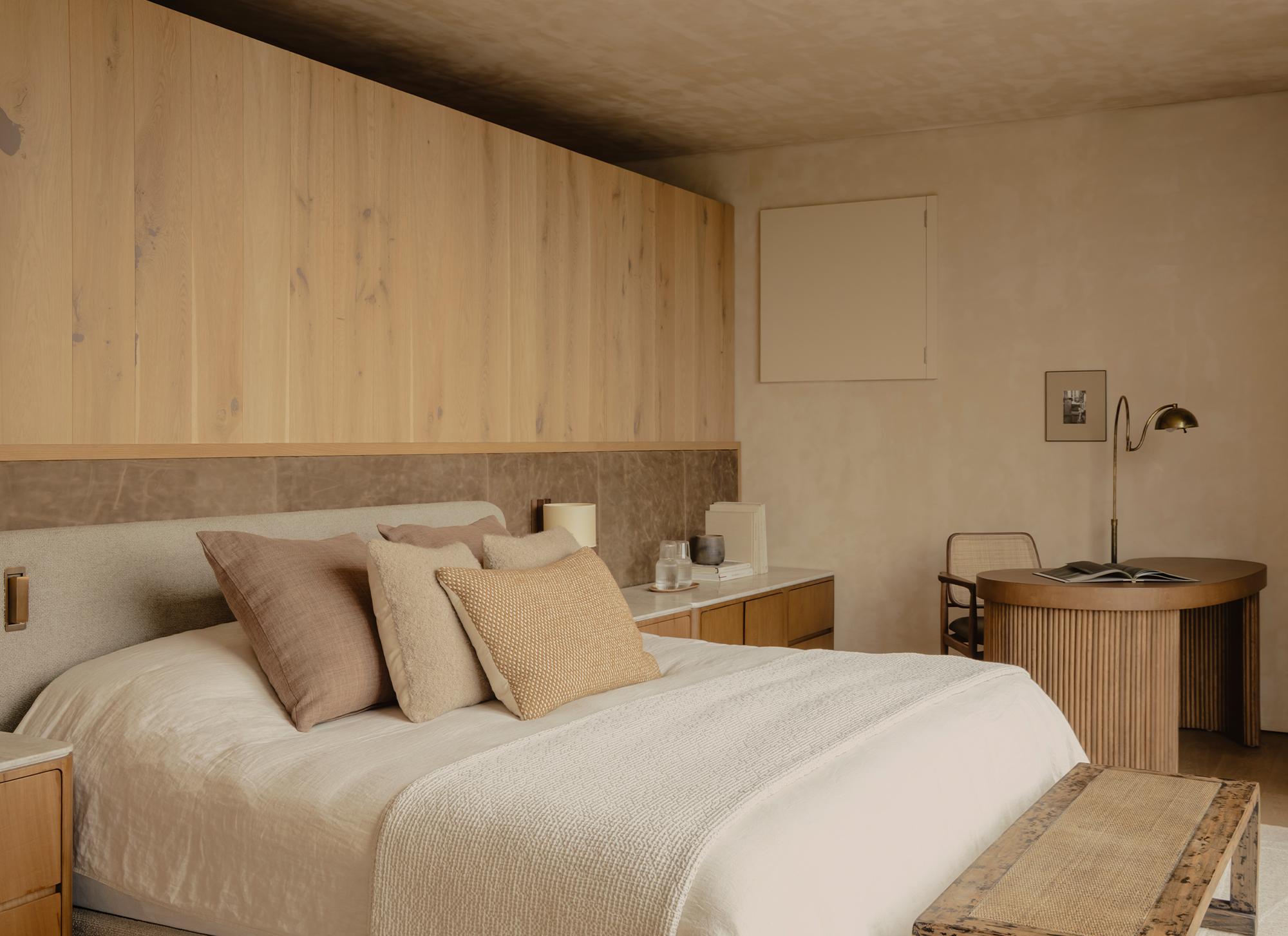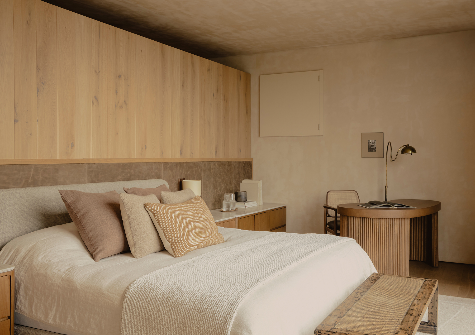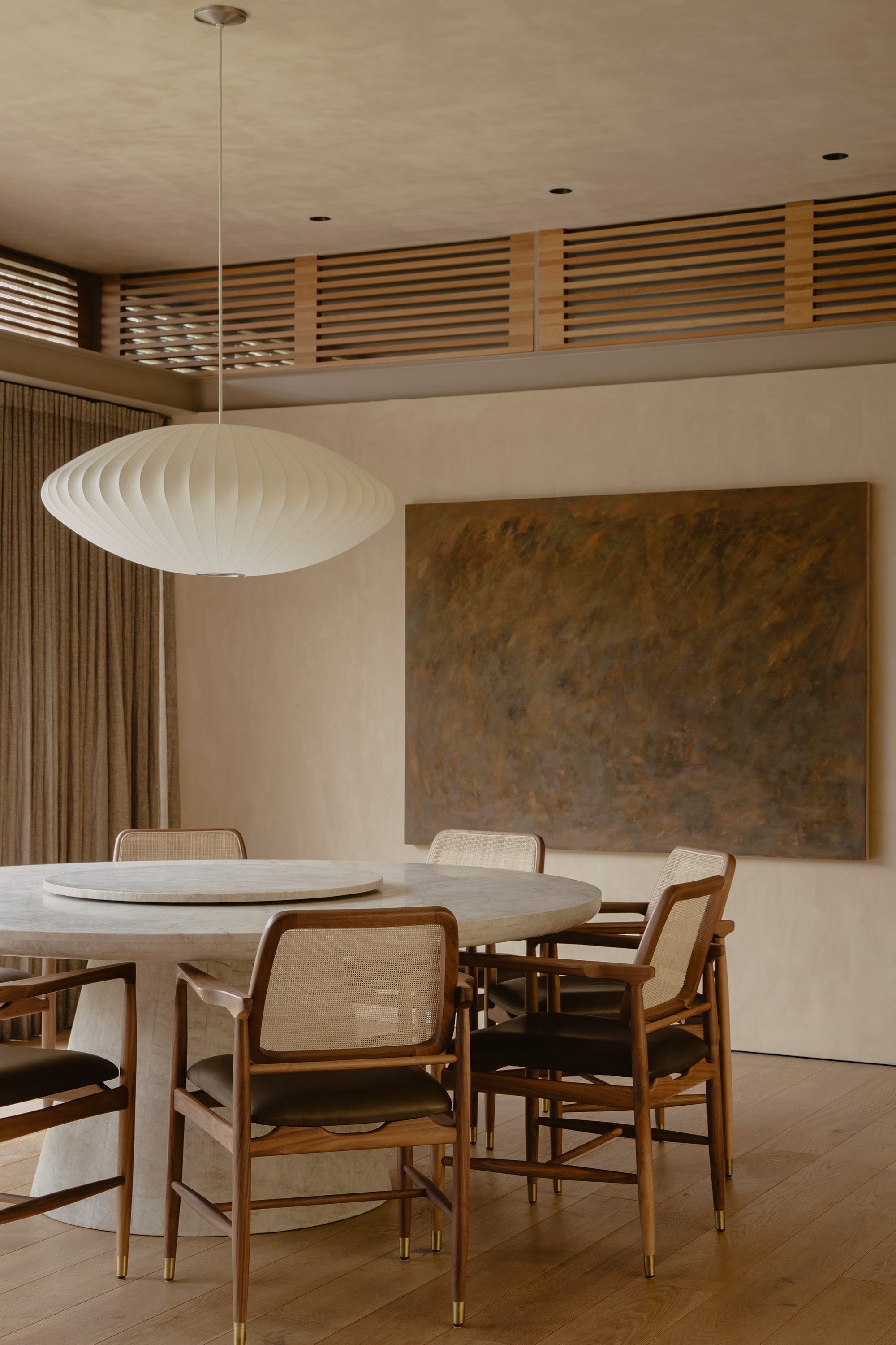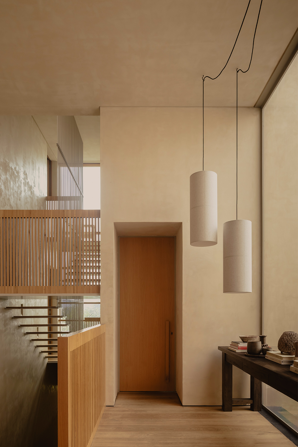 On the entrance level, the family room and master bedroom face the views of the ravine, while on the upper floor, two additional bedrooms with floor-to-ceiling windows frame the landscape and extend the connection with the natural environment. But the meaning of Casa Cañada is also accentuated in its materiality. Linen, solid wood, marble, quartzite and natural fibres were used in their purest form, capturing the changing light of the day and accentuating the warmth of the home. The textures, earth tones and honest surfaces invite you to take off your shoes and feel the living material under your feet.