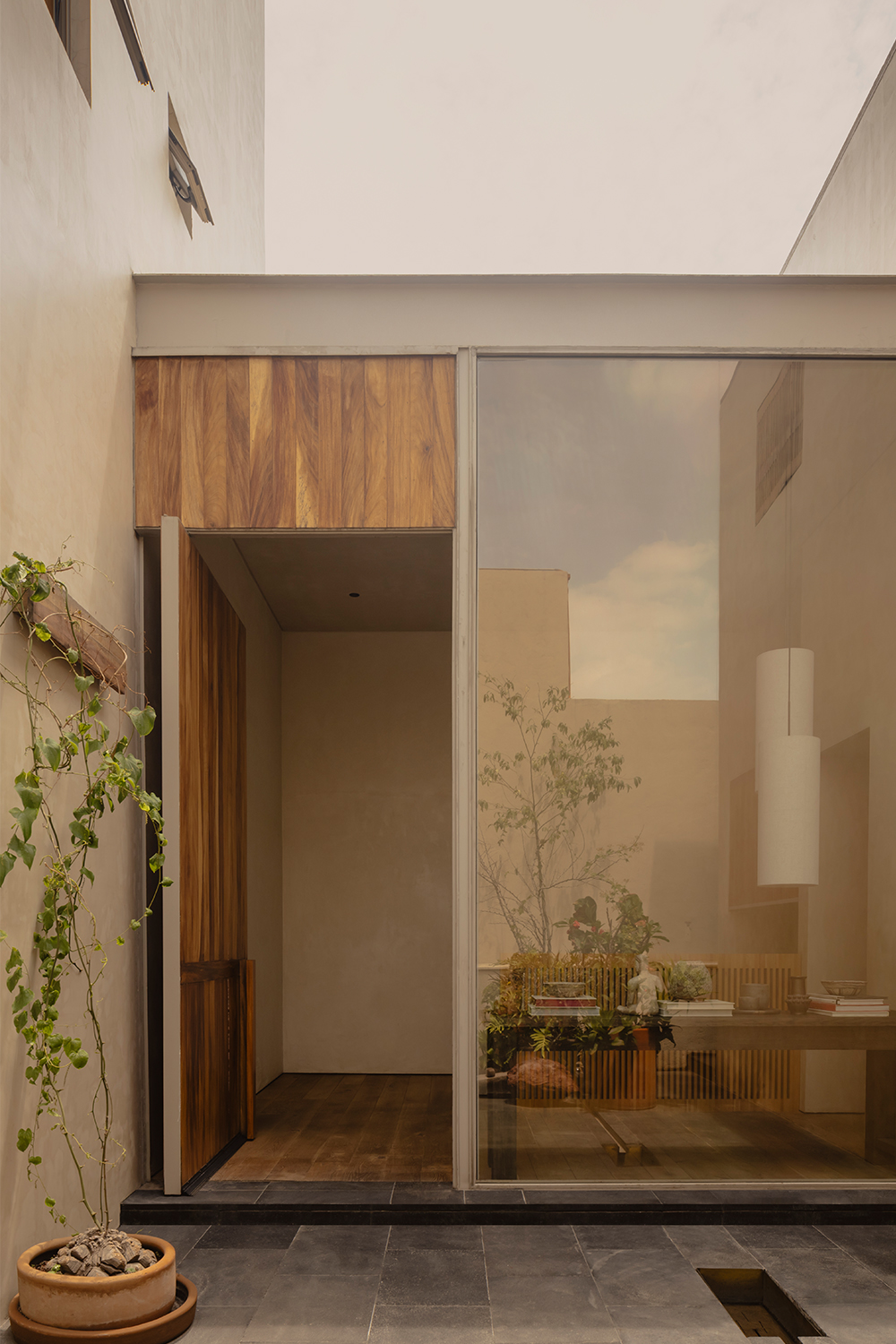 Casa Cañada is organised around a central courtyard that leads to the stairs, making vertical circulation the protagonist of the main entrance. On the ground floor, the living room, dining room and kitchen open completely onto a small garden that acts as a natural extension of the interior. This gesture consolidates the intention of the project, integrating the exterior and interior in a harmonious way and allowing vegetation and light to filter gently into each space.